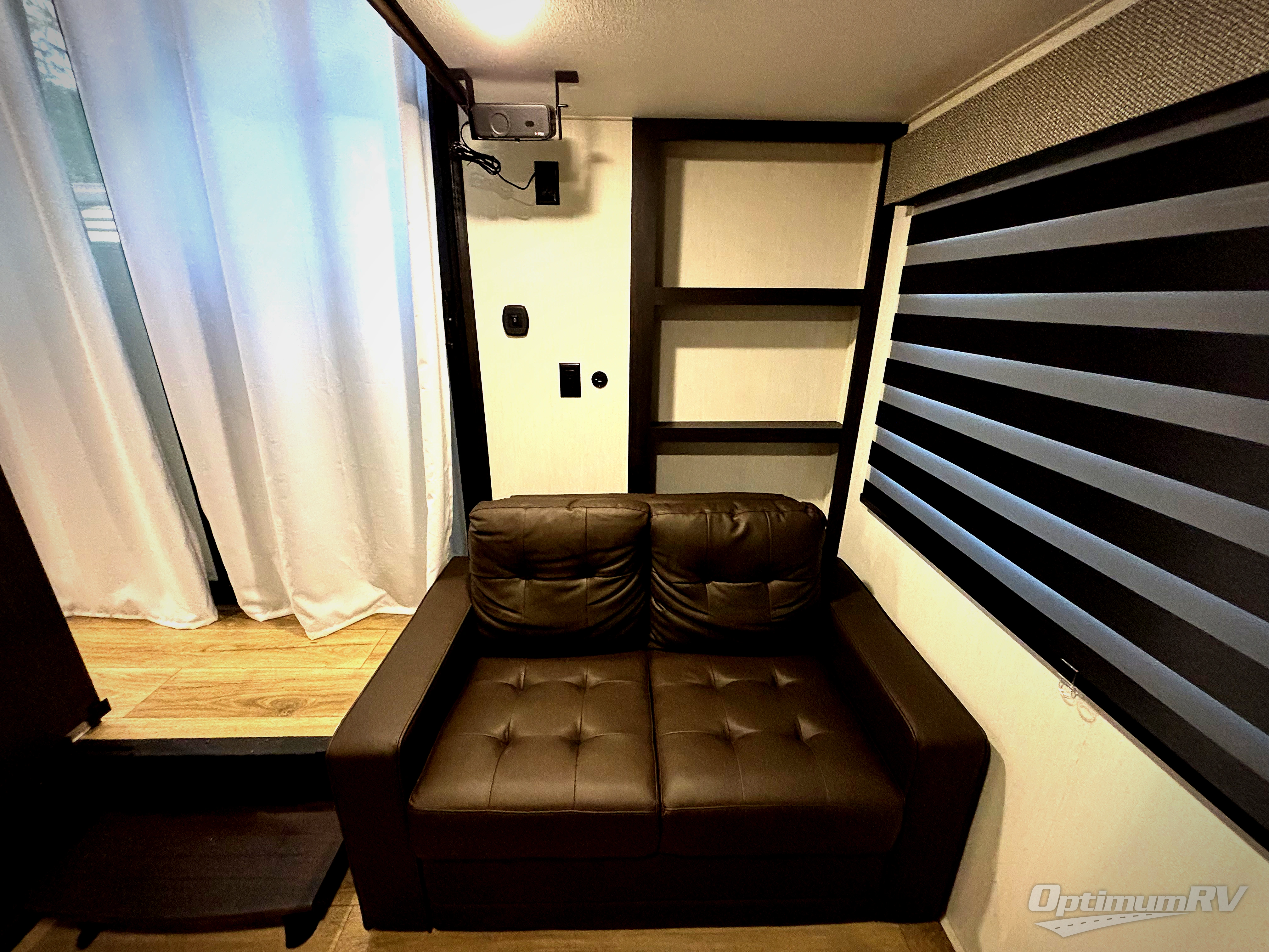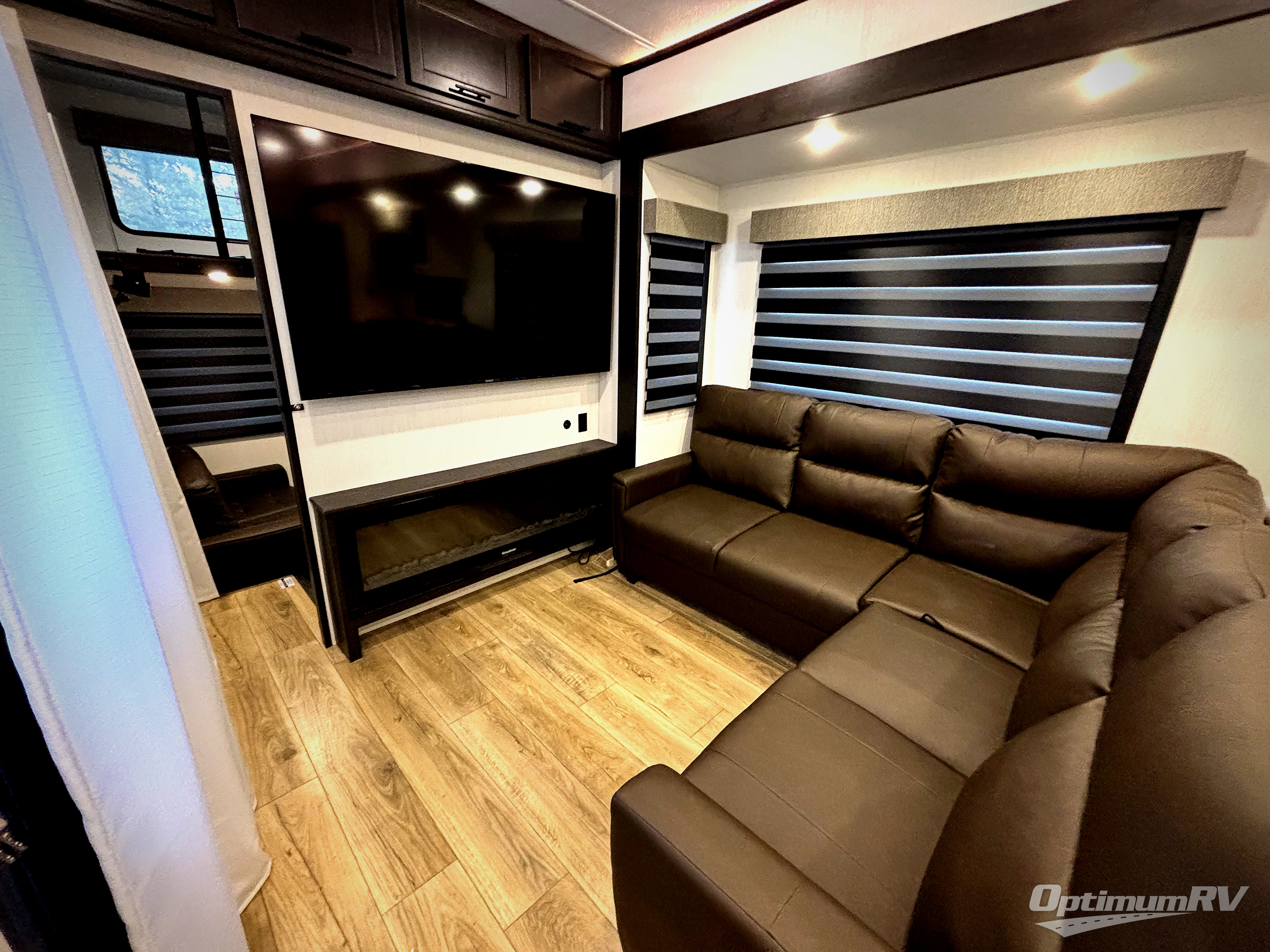 This is the perfect fifth wheel if you enjoy camping with friends and family! You'll have the front private bedroom with a camper king bed slide all to yourselves, while your guests take the rear den. There is a tri-fold sofa here, along with a wardrobe with a desk, additional shelves plus a loft above this room for even more sleeping or storage space! The main living room features an L-shaped sectional sofa, a fireplace and an entertainment center. And the patio deck with a 12' awning is right off of this room so you can visit with friends indoors or outdoors! There is generous counter space in the full kitchen, along with a pull-out storage drawer and a versatile dinette/desk. There are many more stand-out features found in this fifth wheel, including washer and dryer prep in the front bedroom, a 70" projector screen in the rear den, a second power awning, and the list goes on!
