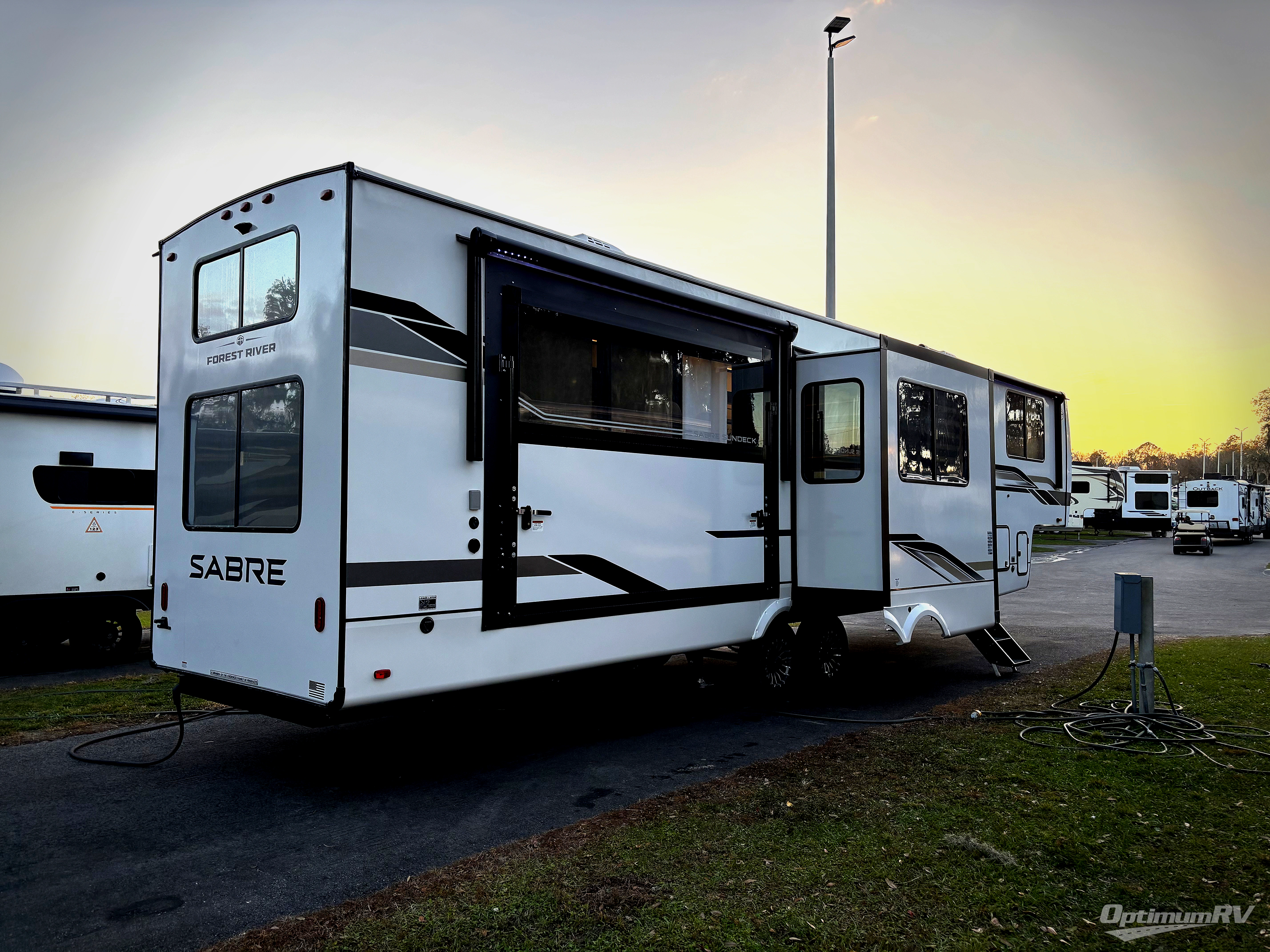 You will experience luxurious camping trips at an affordable price with any one of these Forest River Sabre fifth wheels! These models are durable and ready to travel anytime of the year thanks to features like the high-gloss gel-coat front cap with LED lighting, the PVC roof membrane, and the forced air underbelly with enclosed gate valves. The electric auto-leveling system makes setting up easy and safe, and the adjustable power awning with LED lighting will create an inviting outdoor living space. Each model includes a universal docking station which includes a black tank flush and an outside shower, and adjustable stable steps for you to enter and exit the unit safely. Inside, you will love the design of the ambient accent lighting in the living area, the real wood lumbercore cabinetry, and the linoleum flooring!