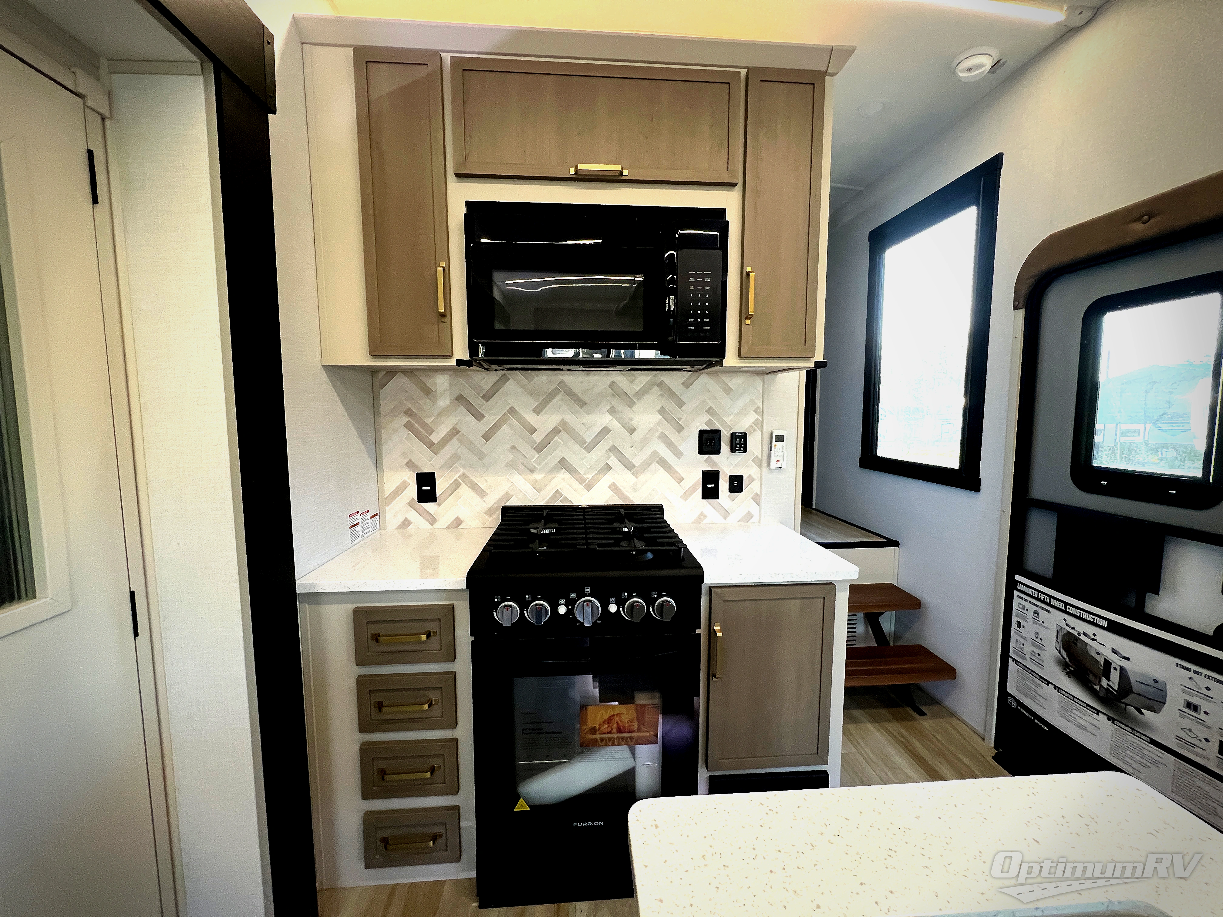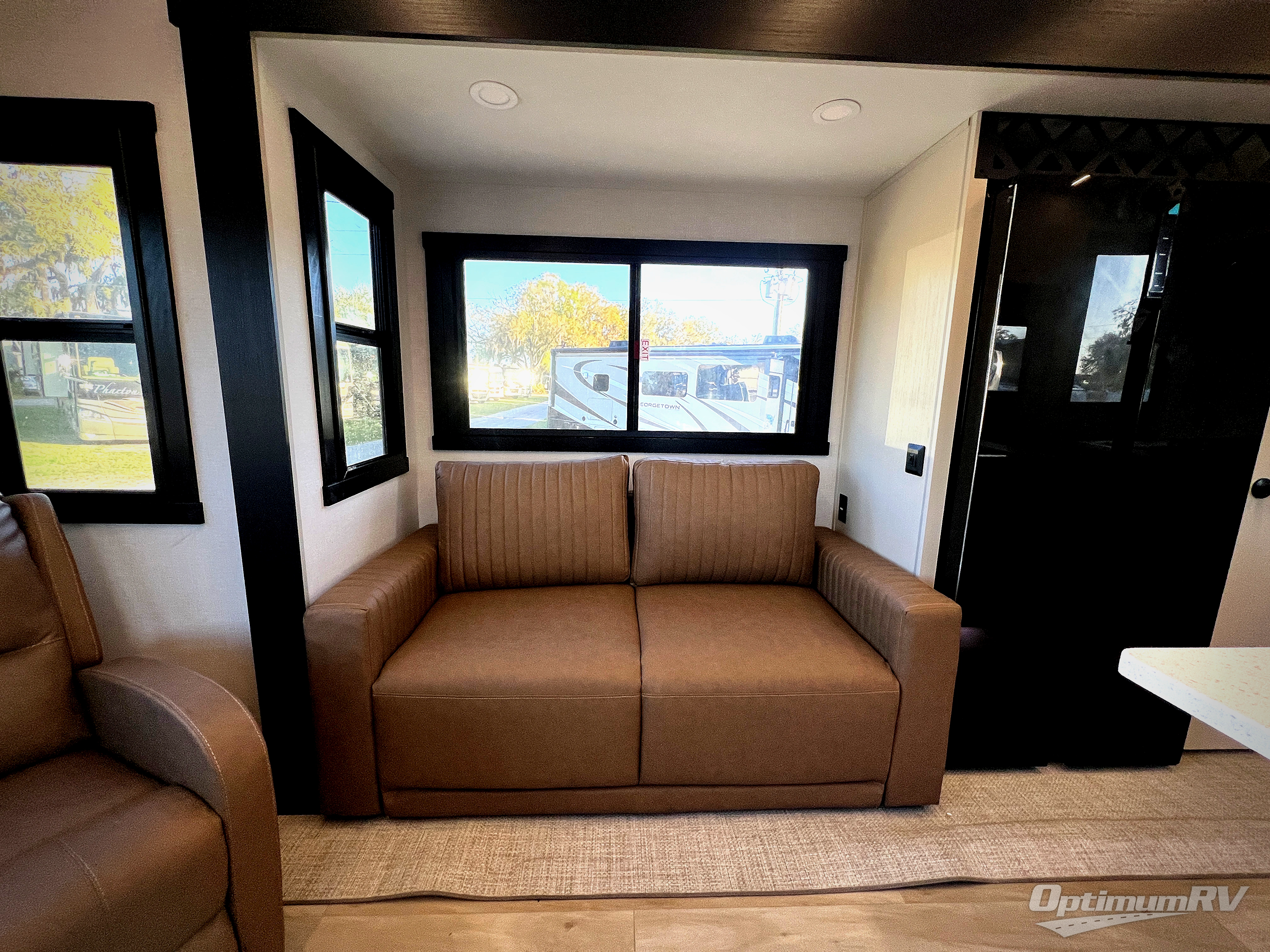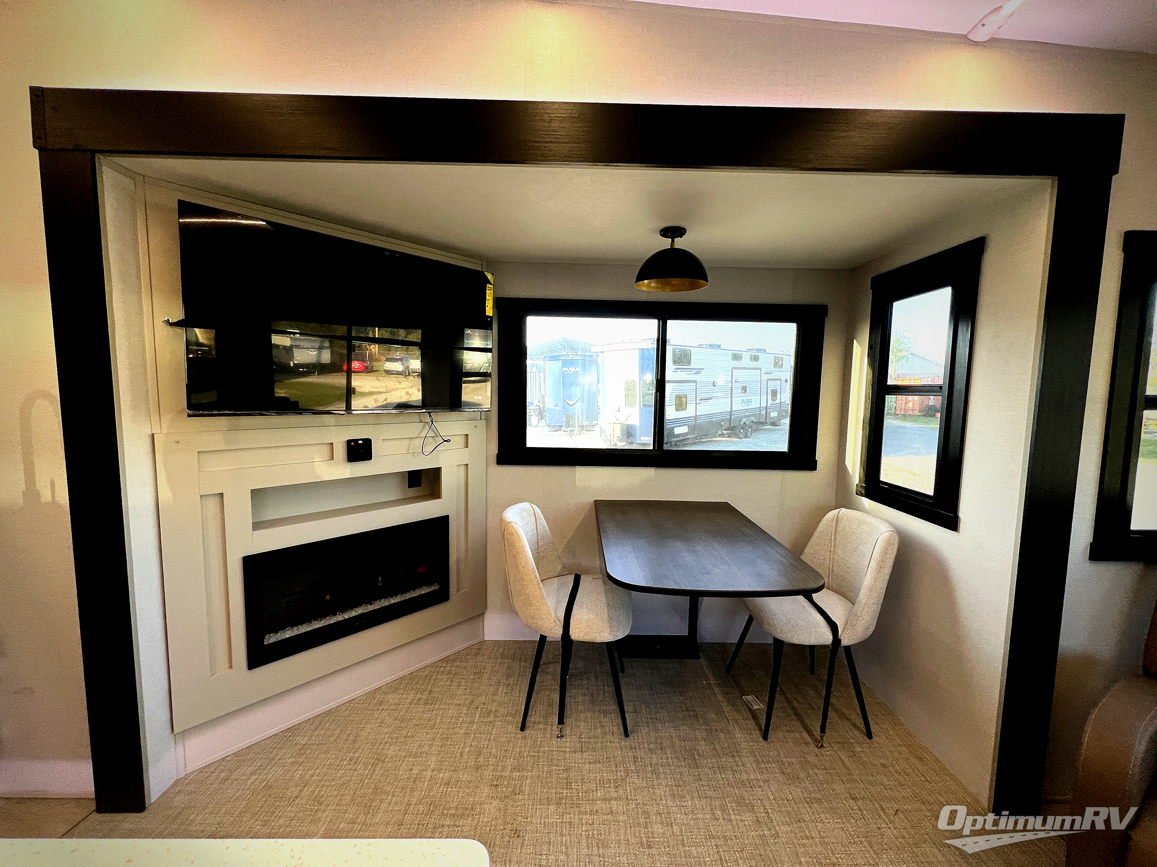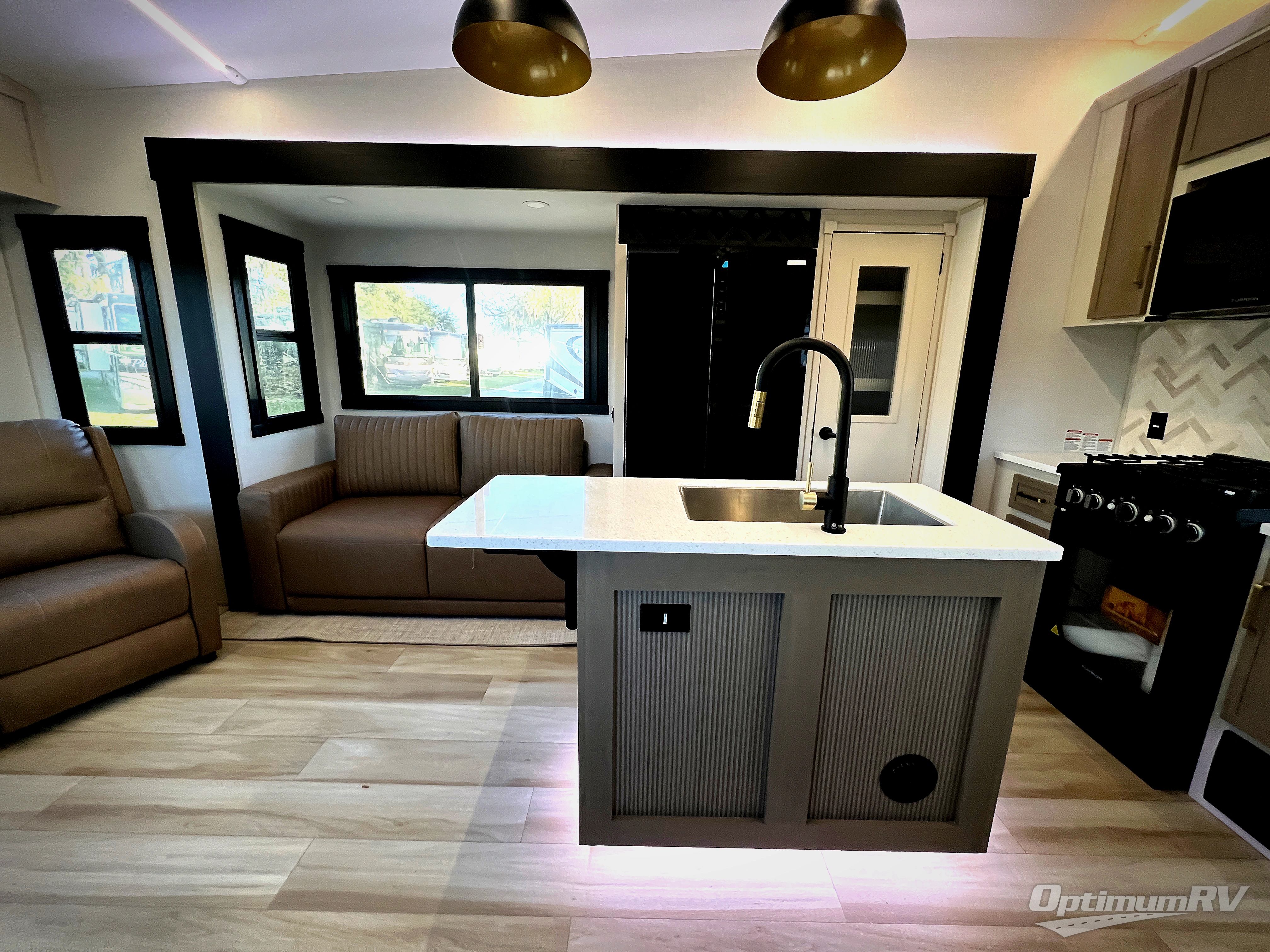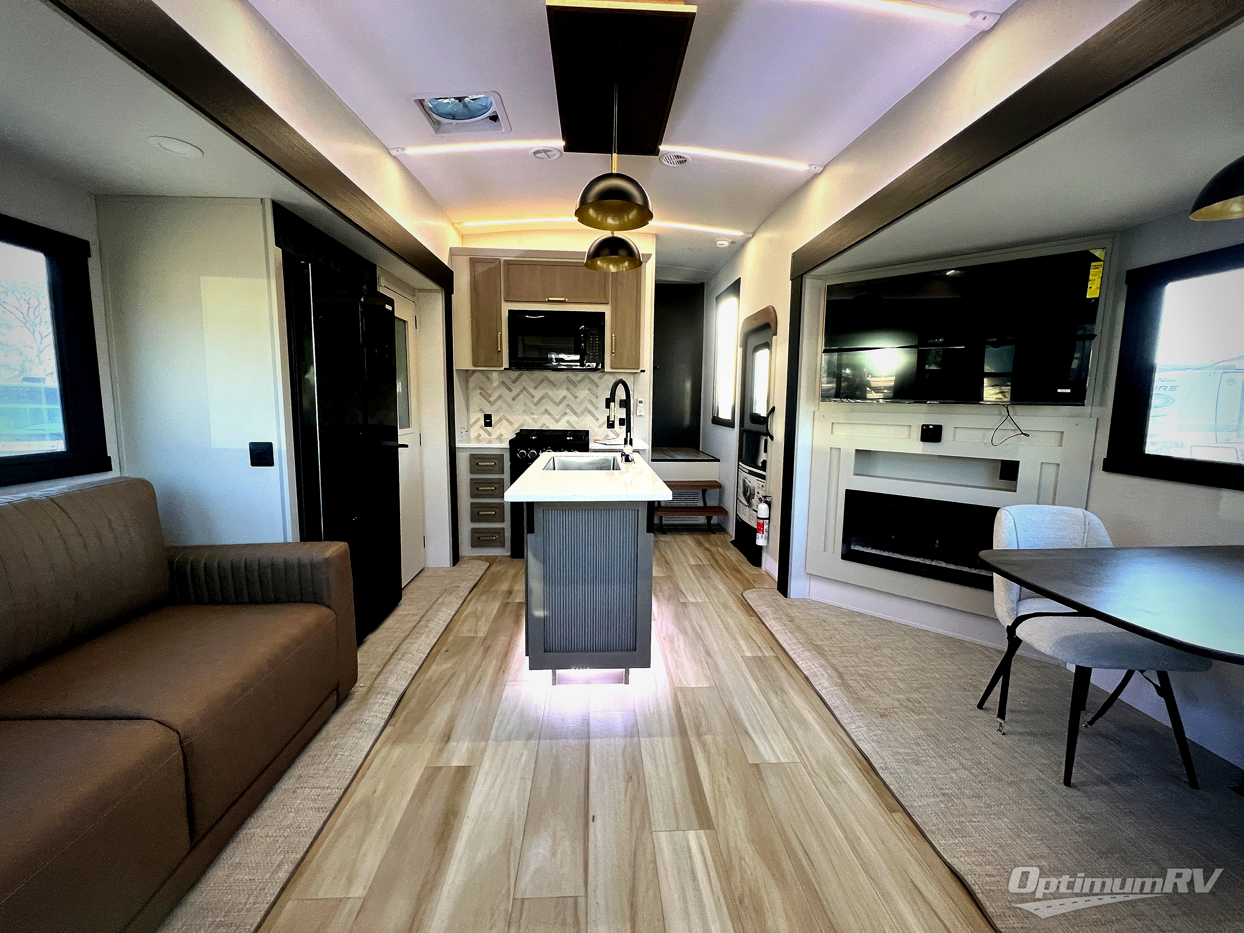 Enjoy the sunshine with panoramic windows throughout this fifth wheel! The rear living area is perfect for relaxing in at night on one of the two chairs or the tri-fold sofa. There is also a table with four chairs, a 50" LED TV, and a fireplace to make this area feel more like home. The kitchen has an island with a large sink to make clean up easier and a pantry big enough to store everyone's favorite snacks. The full bathroom has a residential walk-in shower with a skylight above for natural lighting as you get ready. When you're ready to hit the sack, head to the front private bedroom and enjoy a good night's rest on the custom king bed!