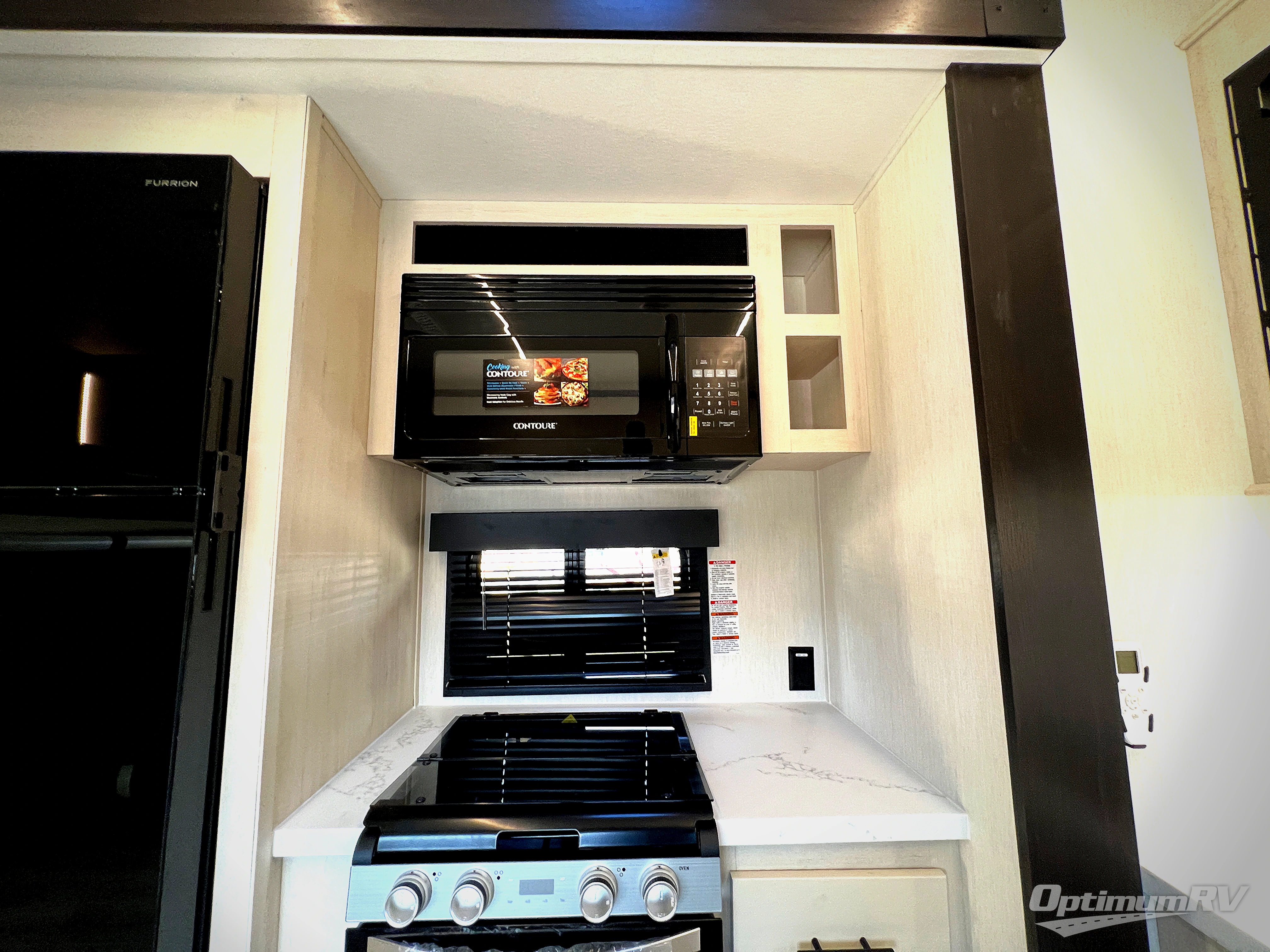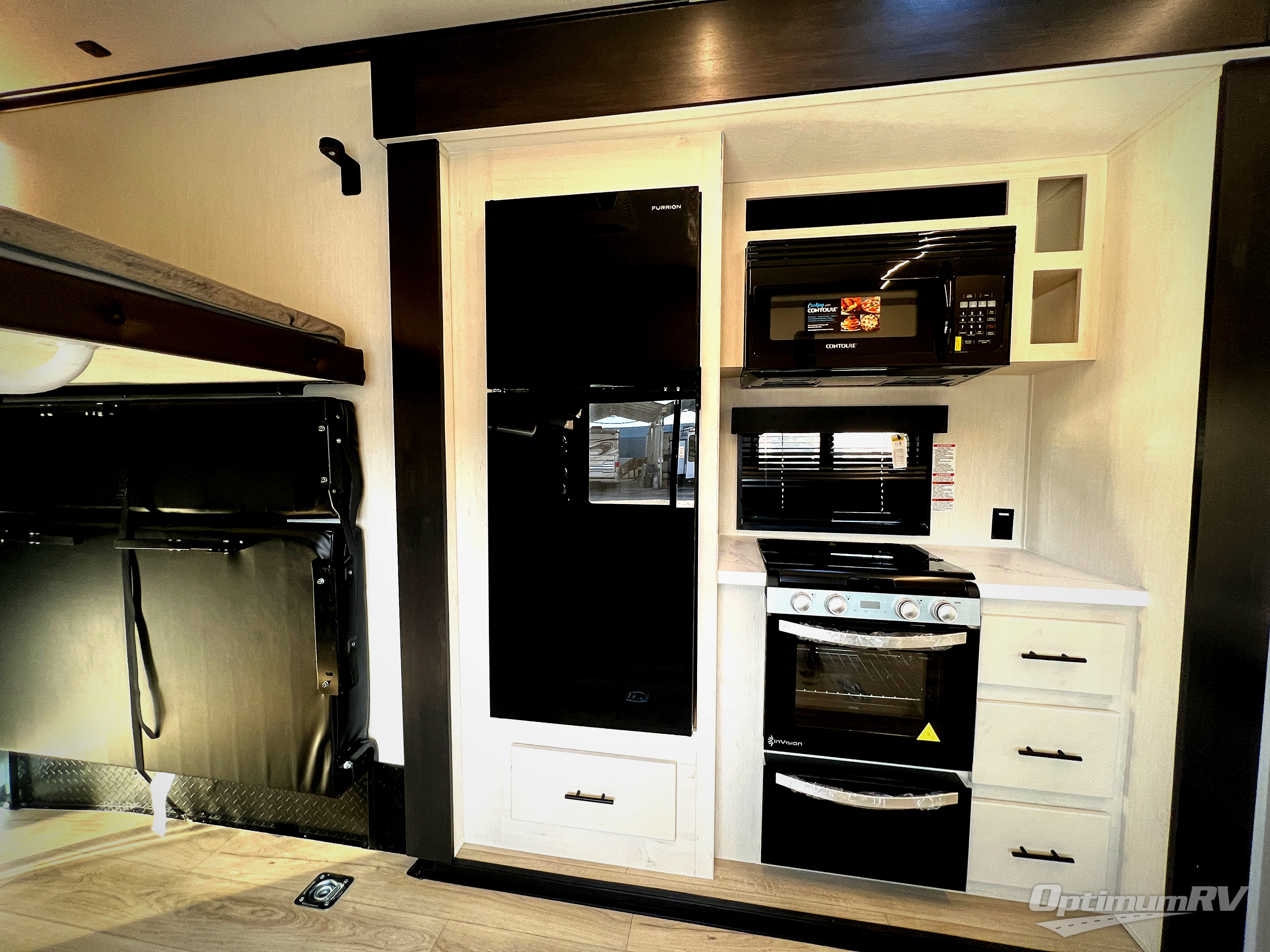 This double slide out toy hauler is ready for adventure when you are! Once your toys are unloaded using the ramp door, you can set up the flip-up sofas or set up the drop-down queen bed for guests to sleep on. You'll enjoy the front private bedroom all to yourselves that includes a king bed slide and a large dresser to keep your things organized. A three-burner range and 30" microwave will let you make meals each day, and the 10.7 cu. ft. 12V refrigerator will keep your food stored away.