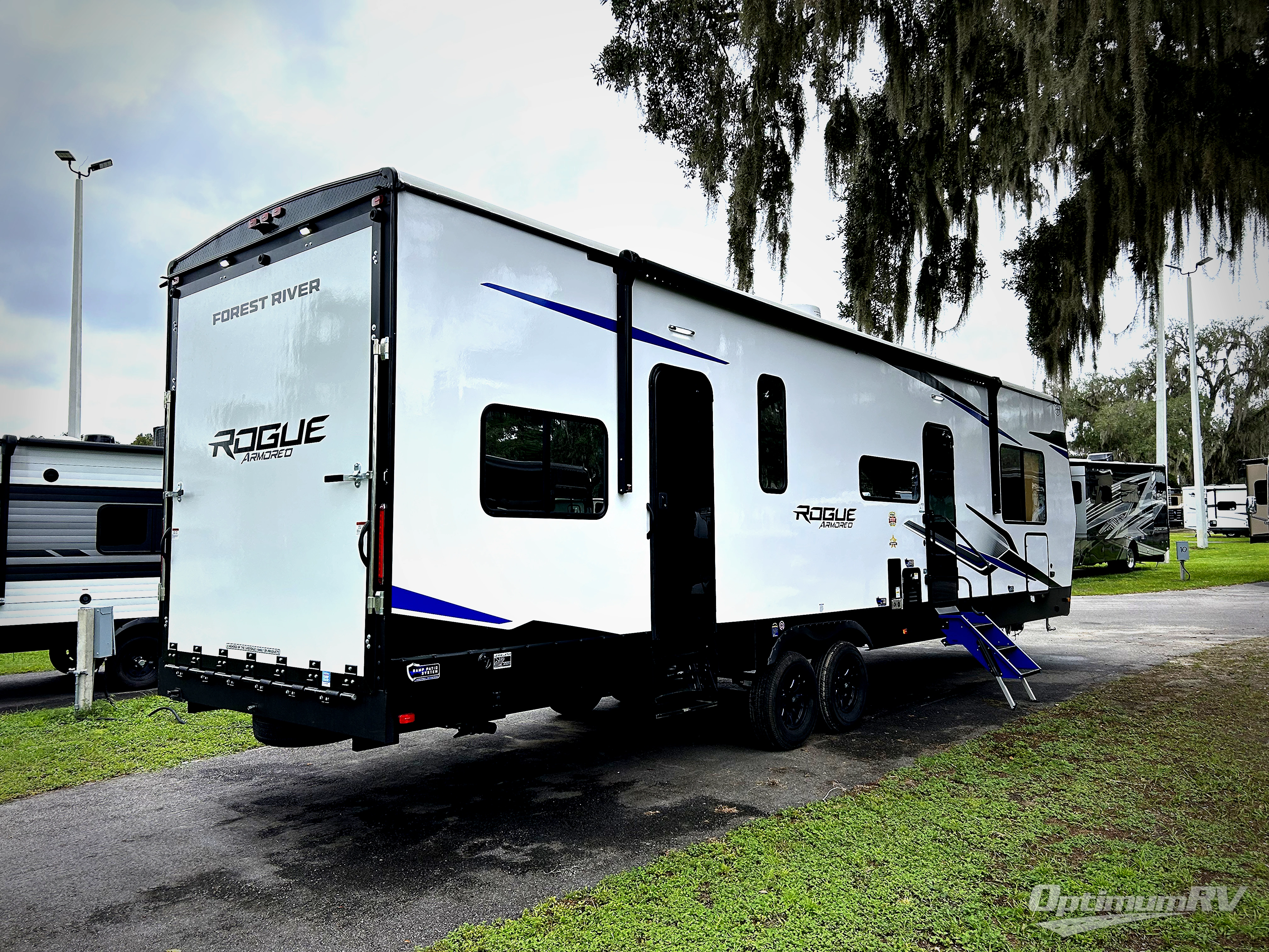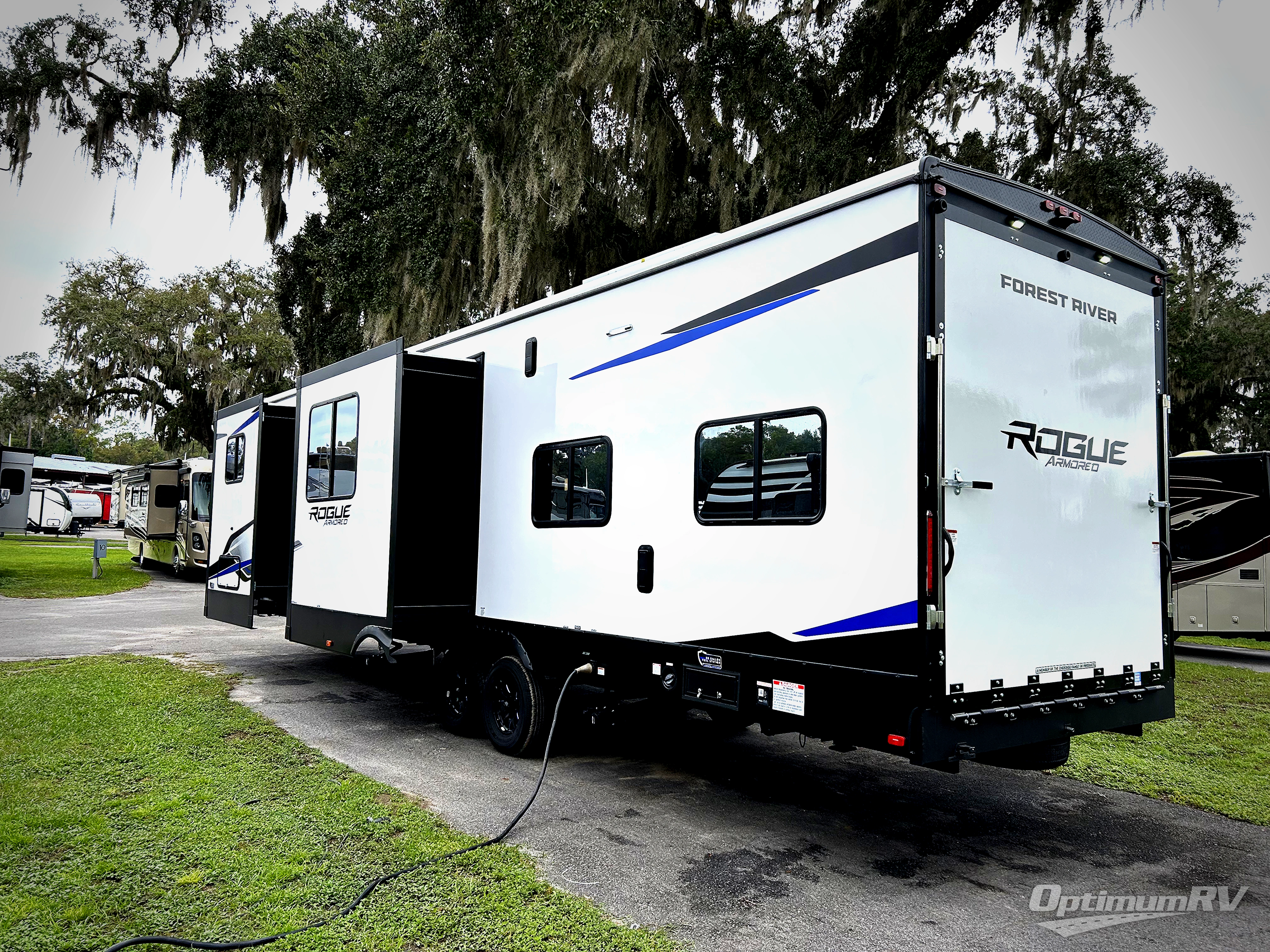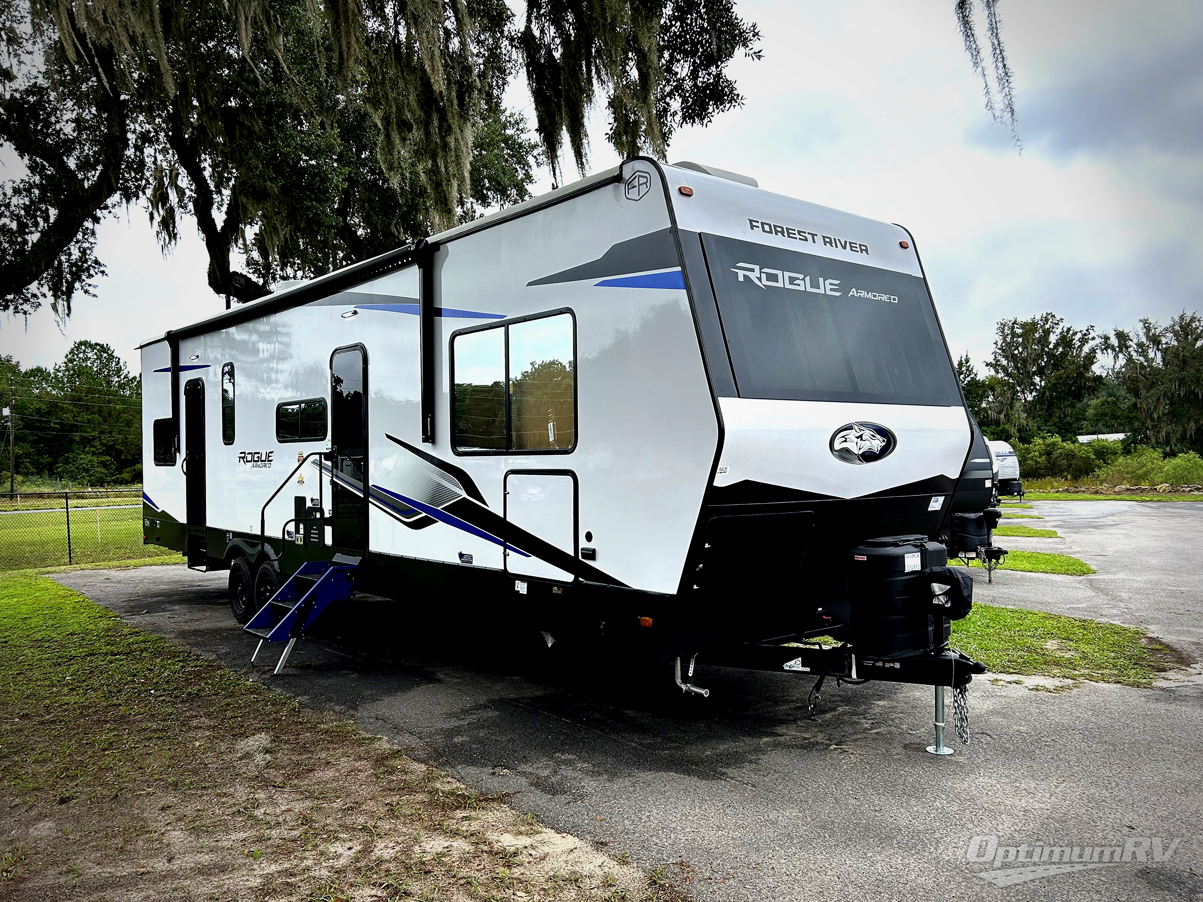 Every one of these Forest River Vengeance Rogue Armored travel trailer toy haulers come with the features you want most at an affordable price tag! The DuraPoxy gas/oil resistant floor has 5,000 lb. tie downs to ensure your toys will arrive safely without damaging the flooring, plus the 3,000 lb. rated ramp door makes it easy to load them. A 15,000 BTU A/C will keep you cool even on the hottest summer days, and there are heated enclosed holding tanks with 12V heat pads on every tank for added protection. Each model includes a fuel station with a digital readout, a ramp door patio system, a tire pressure monitoring system, and many more stand-out features. Inside, you'll find zebra shades in the living room, multiple USB charging stations, a multi-functional kitchen sink, glass shower doors, and many more comforts!