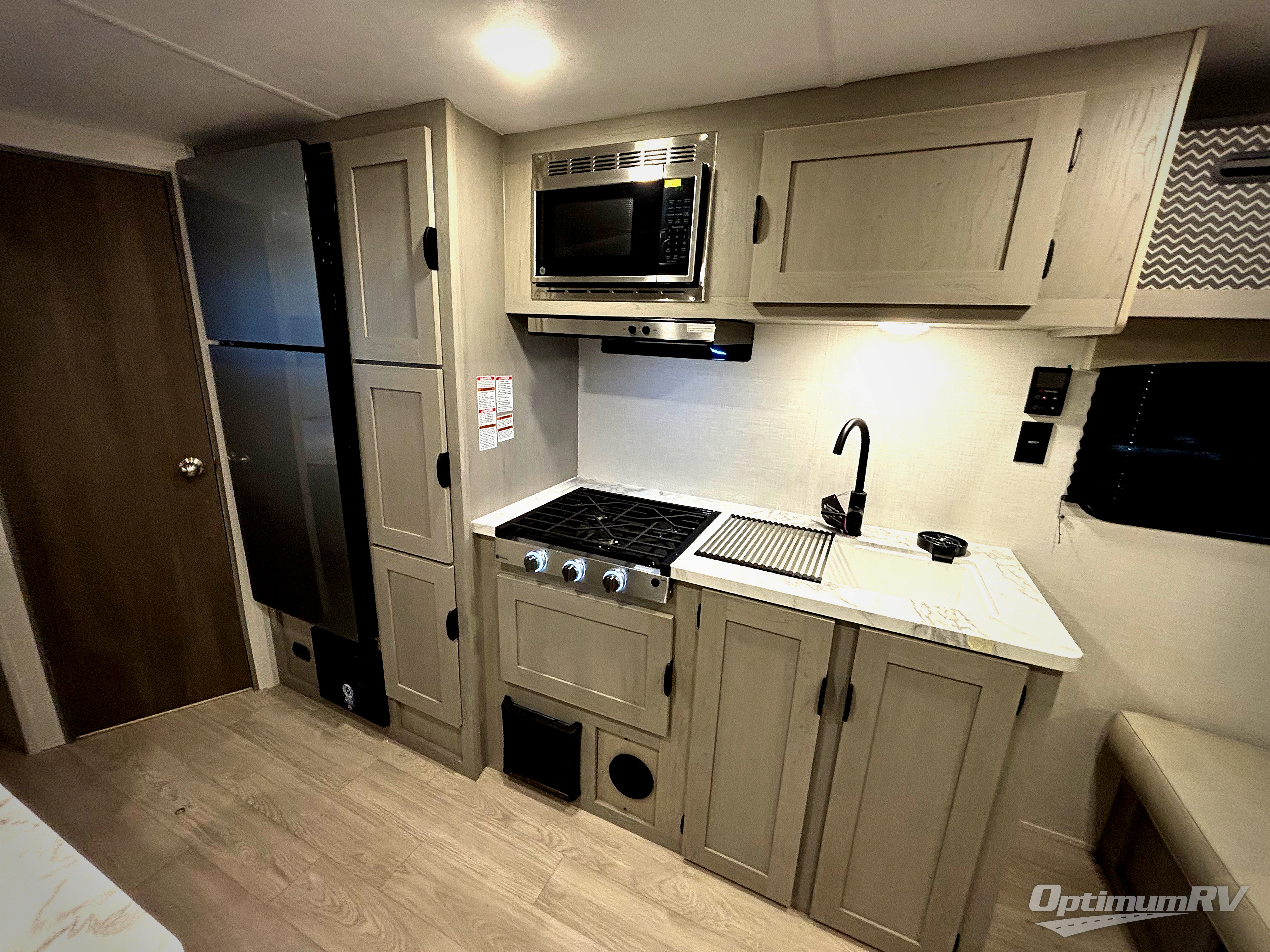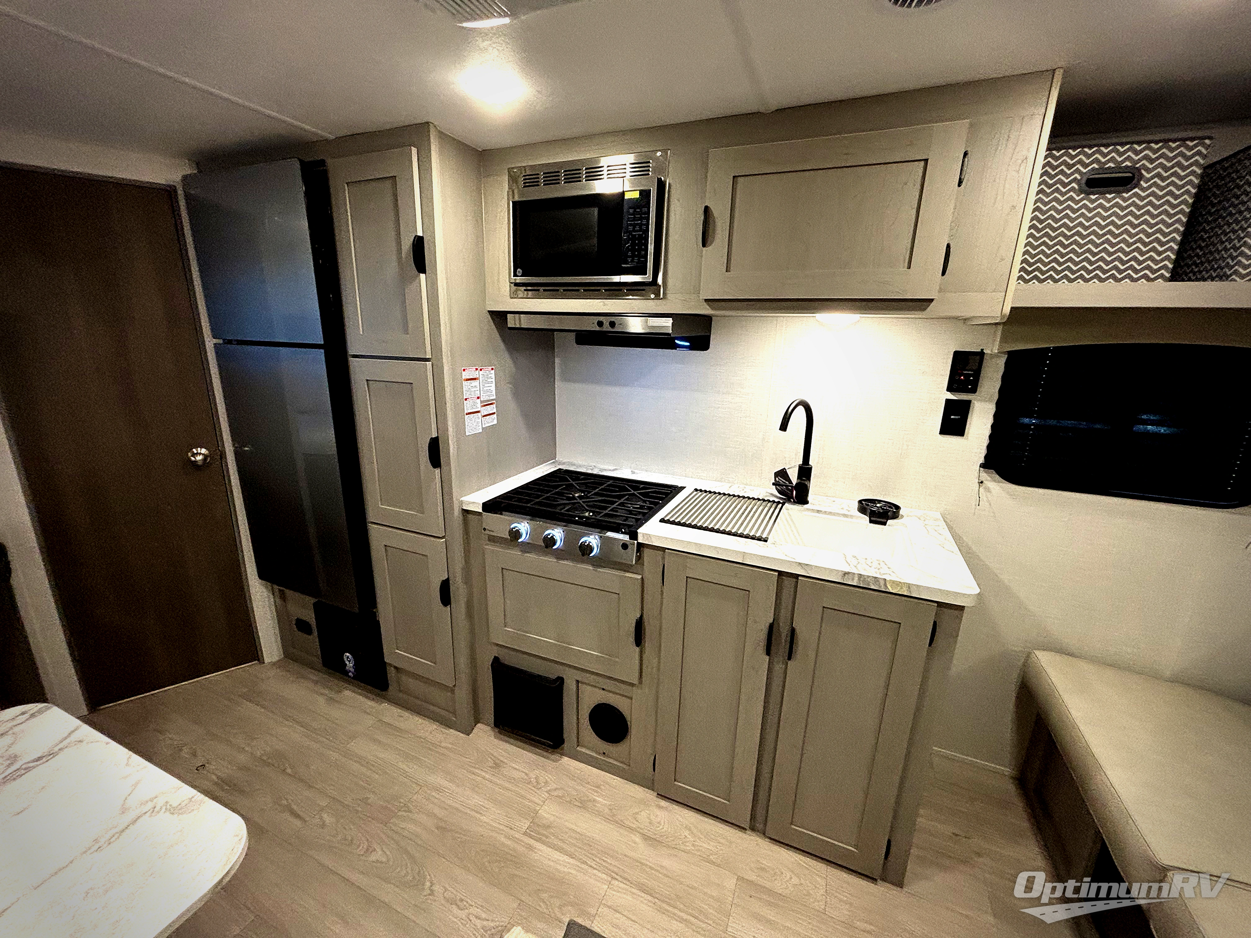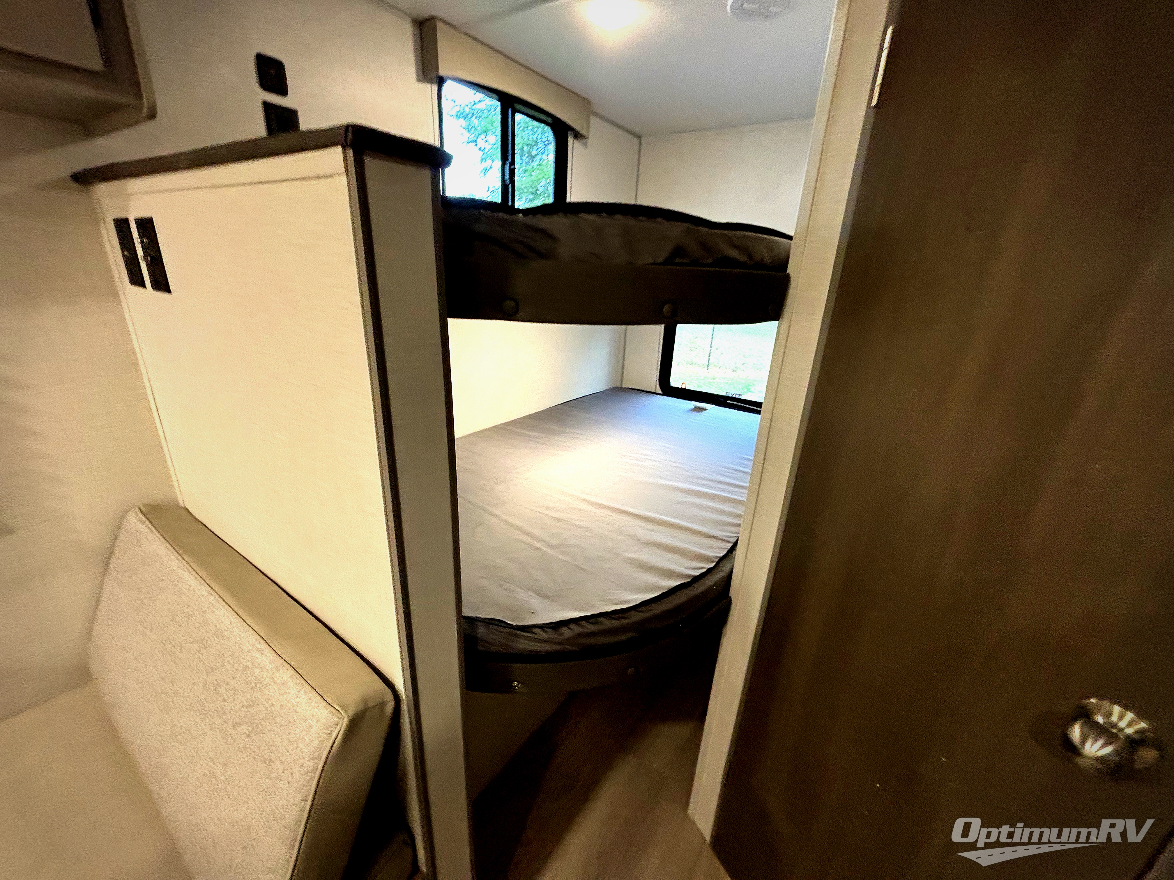 Bring the whole family with you in this travel trailer! The kiddos can sleep on the rear corner set of double-size bunks. The opposite rear corner features a full bath including a 24" x 36" shower, linen cabinet, toilet, and vanity. In the main living space, you will find plenty of seating with a booth dinette and jackknife sofa which can also transform into an extra sleeping space if needed. Everyone's bellies will stay full with the induction cooktop, 10 cu. ft. 12-volt refrigerator, and microwave which you can use to pop a bag of popcorn for movie night. You will enjoy the front bedroom for a bit of privacy including a queen bed and large overhead shelf for your things. On the outside, a large front pass-through for lawn chairs and camp gear. There is more storage beneath the bunks in back and a nice 15' awning to provide protection from the elements when outdoors.