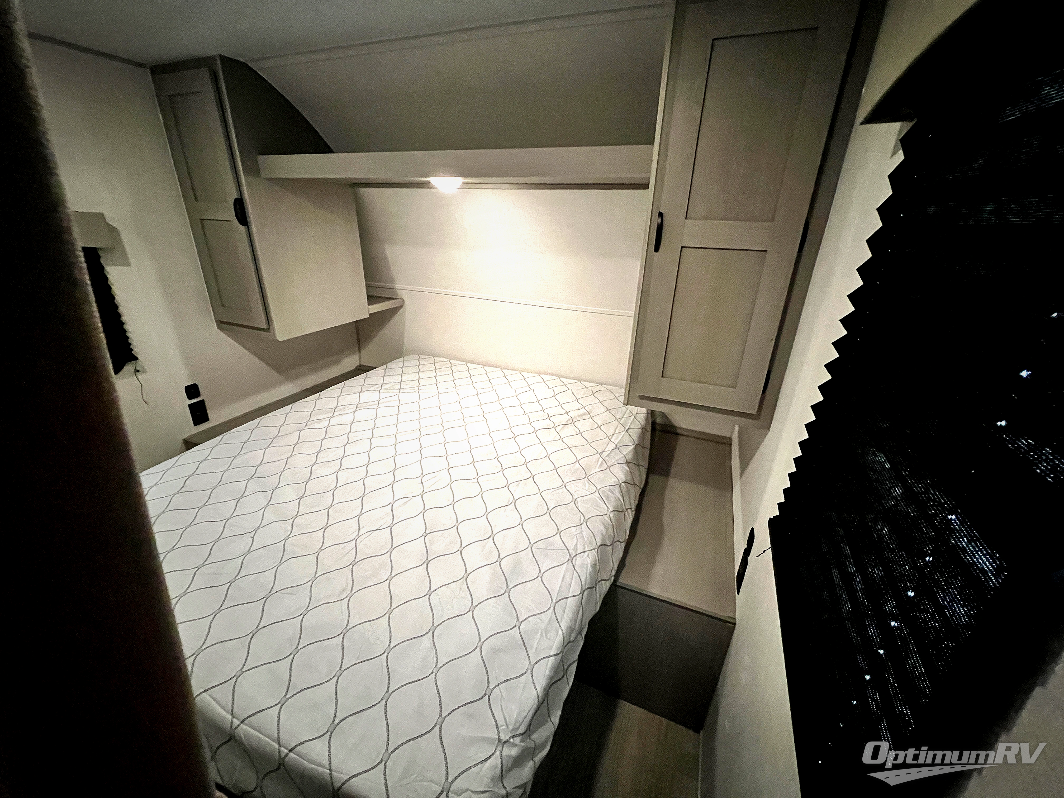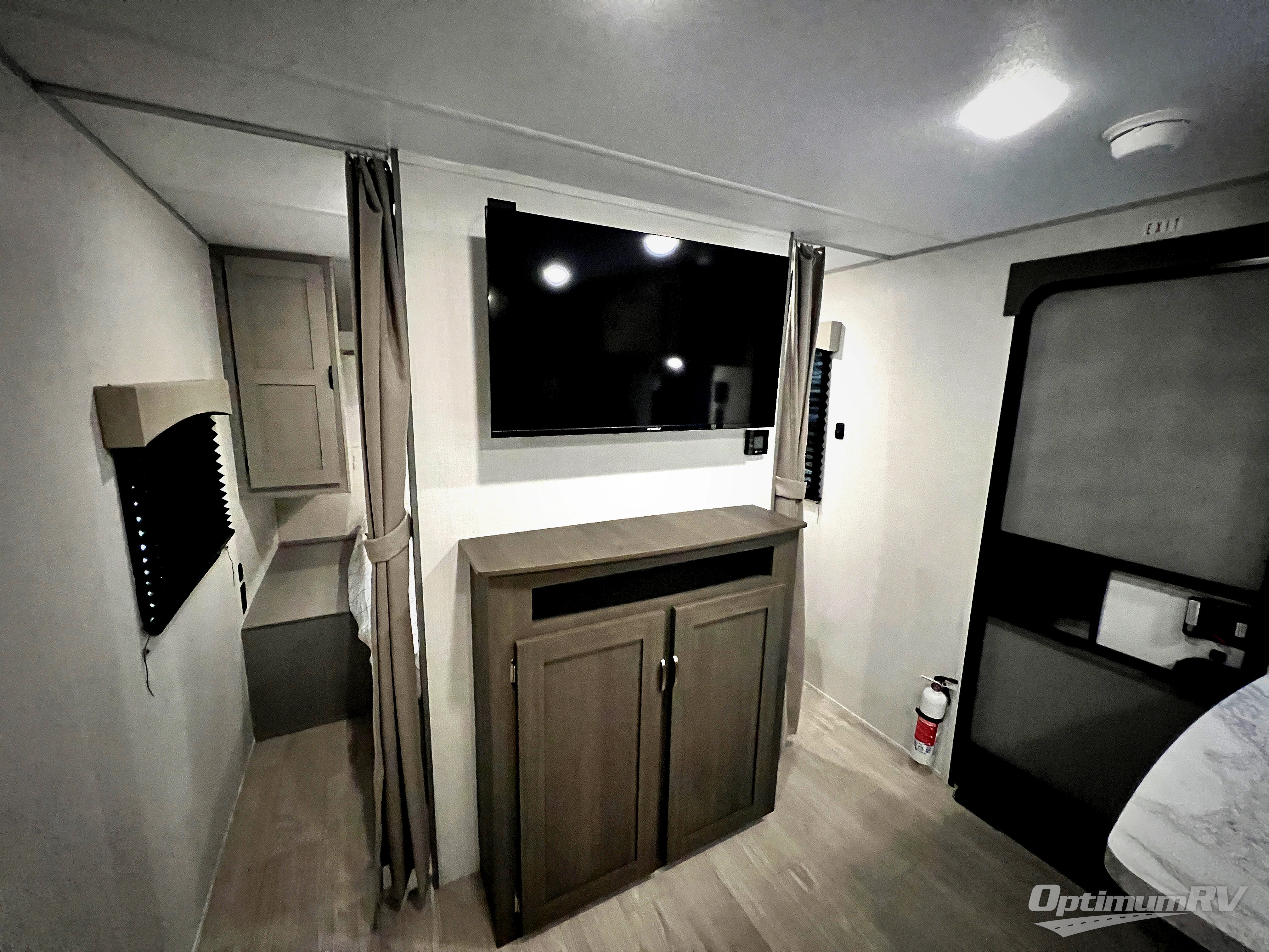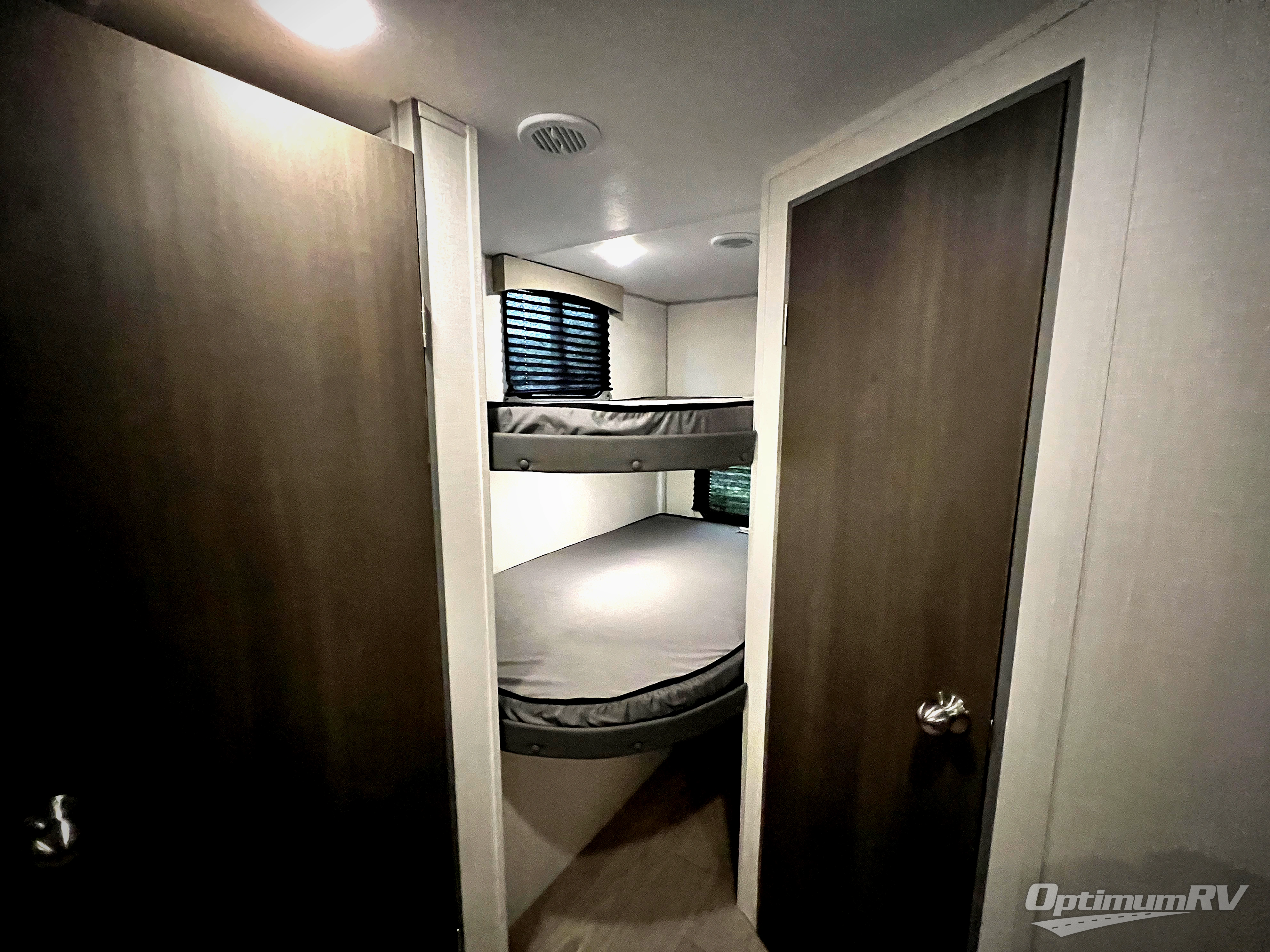 Pack your bags and head to the campground in this spacious travel trailer for the whole gang! The owners will love having their own space in the front private bedroom, complete with an RV queen bed and dual wardrobes and shelves. There are double-size bunks in the rear corner, with the full bath in the other rear corner for easy nighttime use. Everyone can meet in the combined living area and kitchen while the cook makes breakfast. There is a sofa and dinette within the large slide out and an entertainment center with an optional fireplace if you want to make this space more cozy. This unit also includes a large pantry with washer and dryer prep, giving you the option to add these appliances, and an optional camp kitchen can be added for the cook who loves being outdoors!