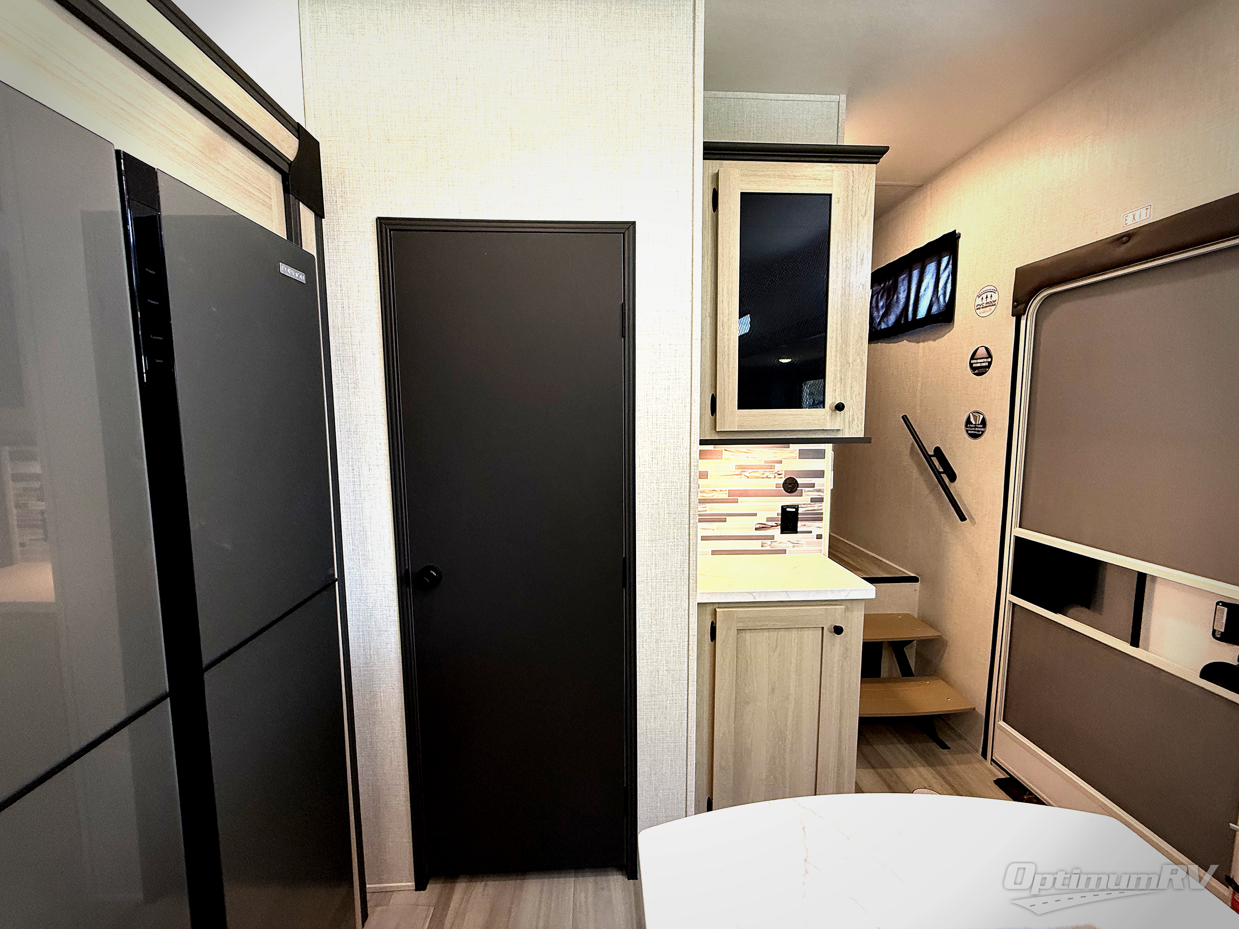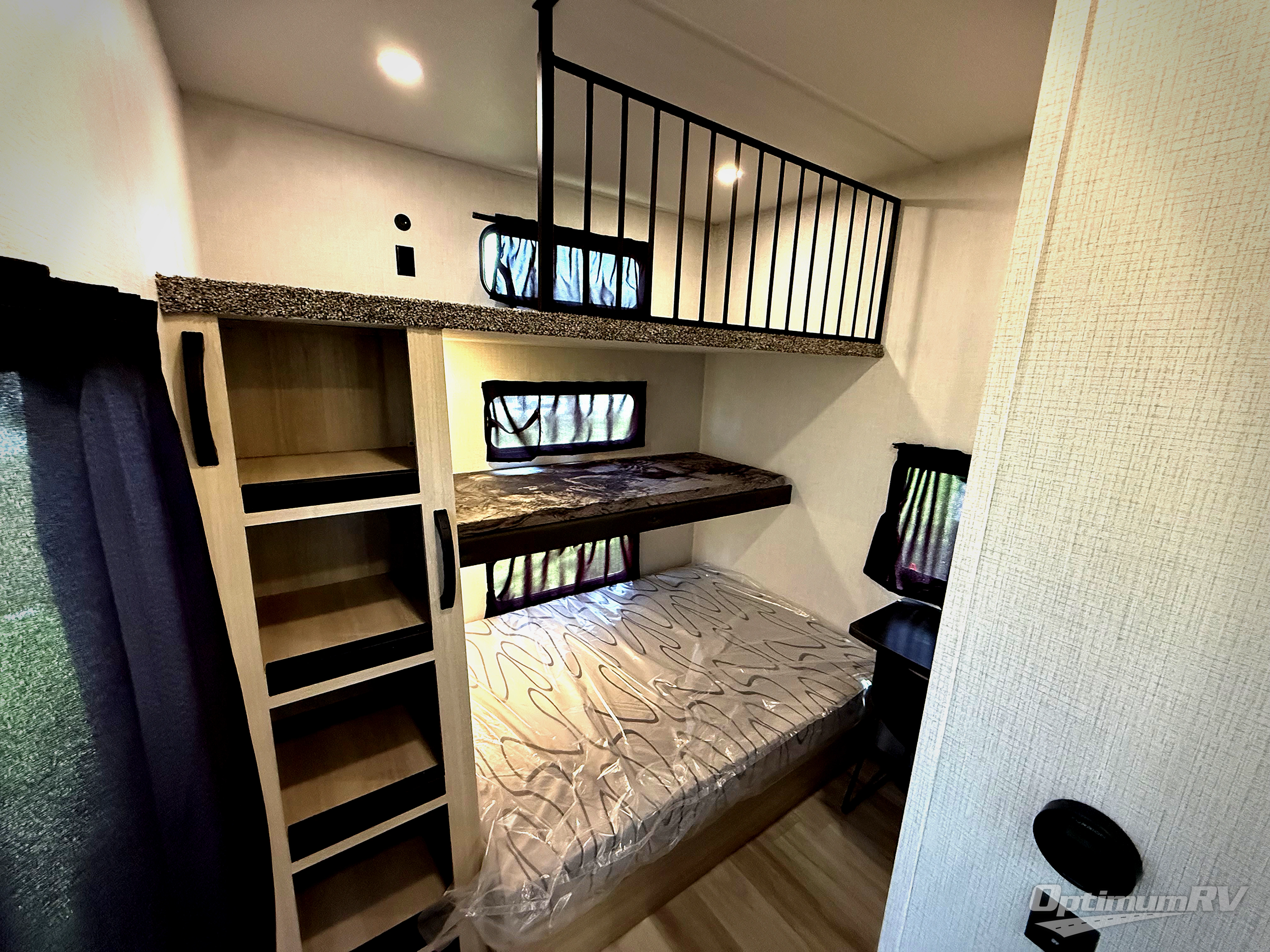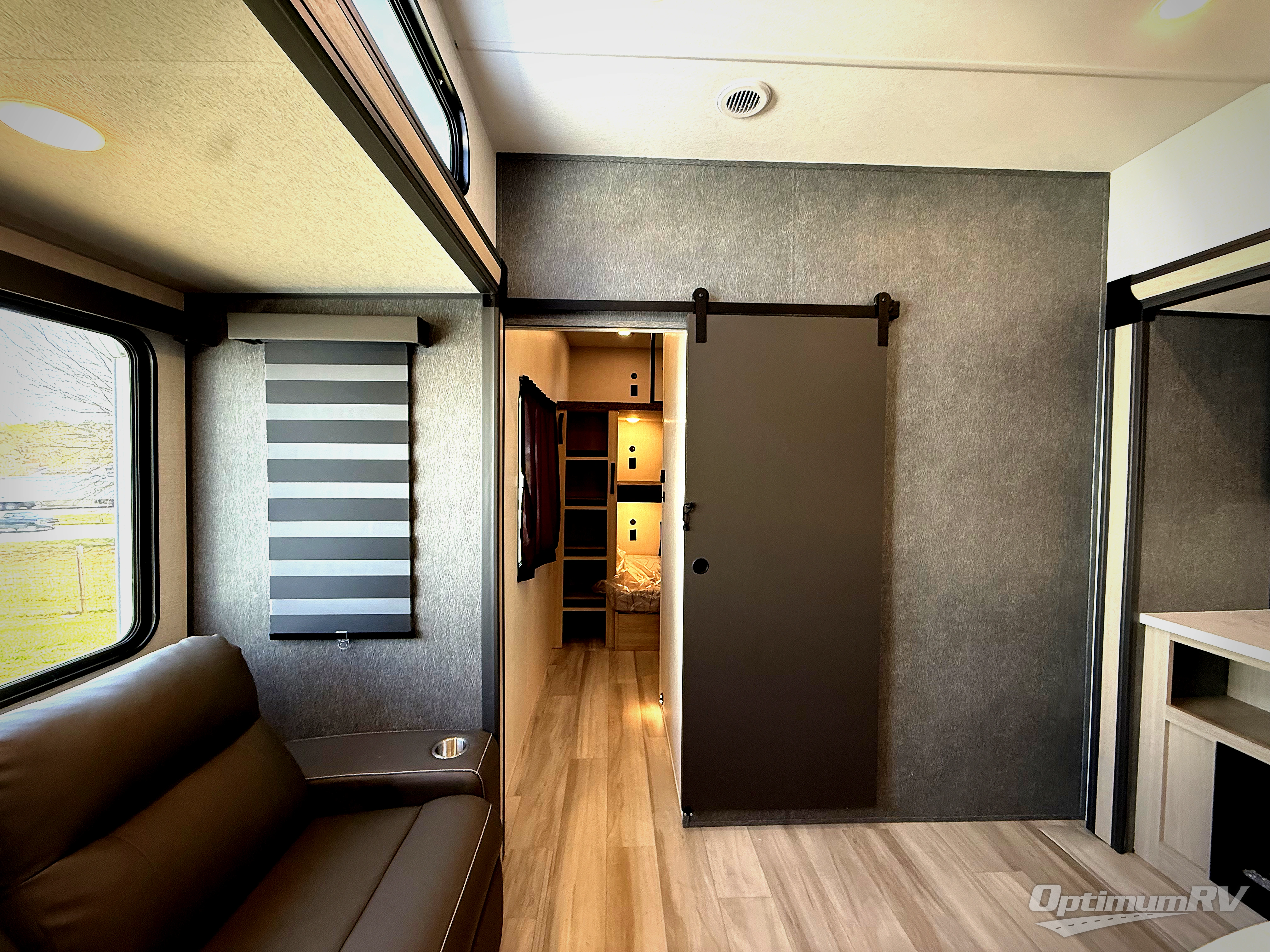 This thoughtfully designed fifth wheel that effortlessly balances privacy, functionality, and social comfort. At the rear we have a bunk house featuring a spacious 54x74-inch bed, accompanied by an upper bunk and a loft, perfect for kids, guests, or a private reading nook. A desk offers a dedicated workspace, while the full bathroom ensures comfort without sacrificing convenience. Moving forward, you'll find dual opposing slides that open up to create a large living area featuring a super sofa, ideal for gathering, dining, or catching up on entertainment. Here, a kitchen island provides a chef-centric workspace and the chairs around the island give a place to dine, along with two pantries to keep everything in reach. Toward the front, a serene queen-size bedroom awaits, offering a luxurious retreat with a large walk-in closet and dresser providing abundant storage for clothes and essentials.