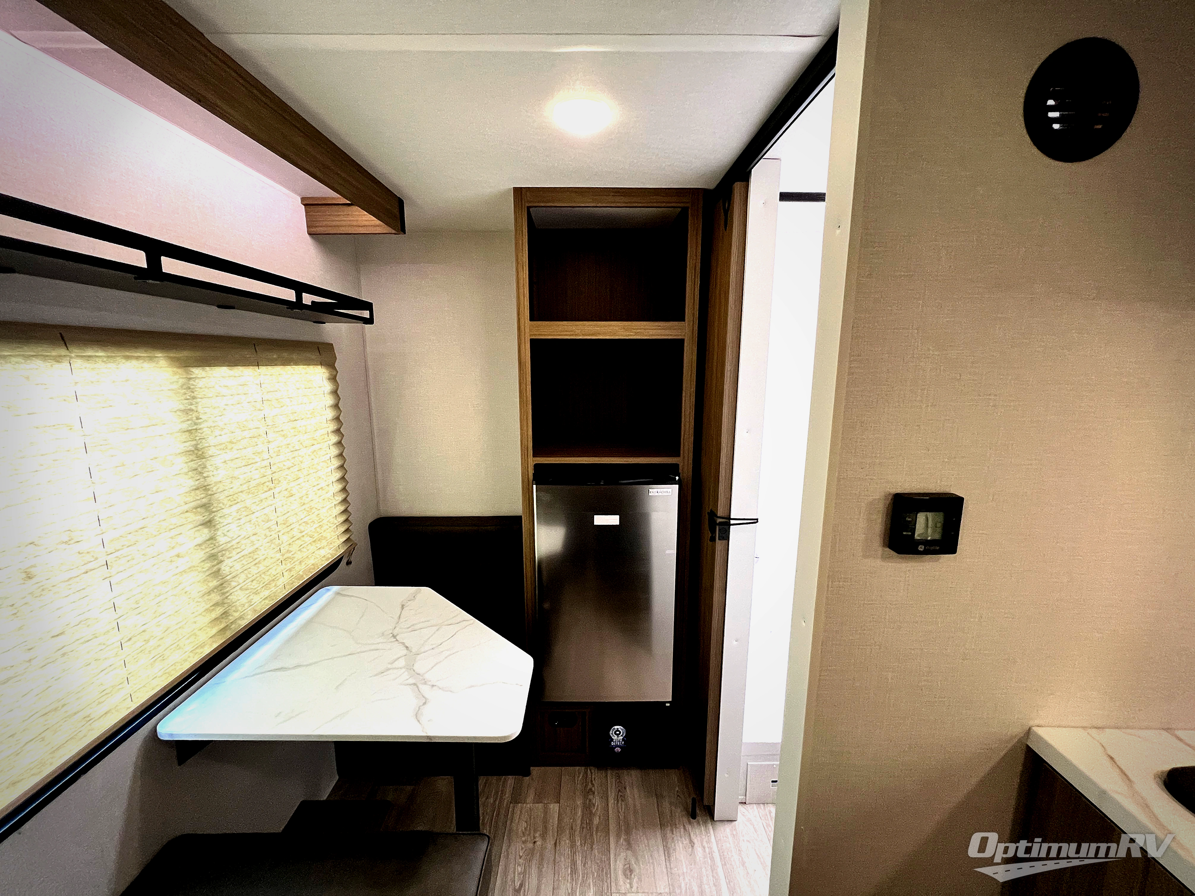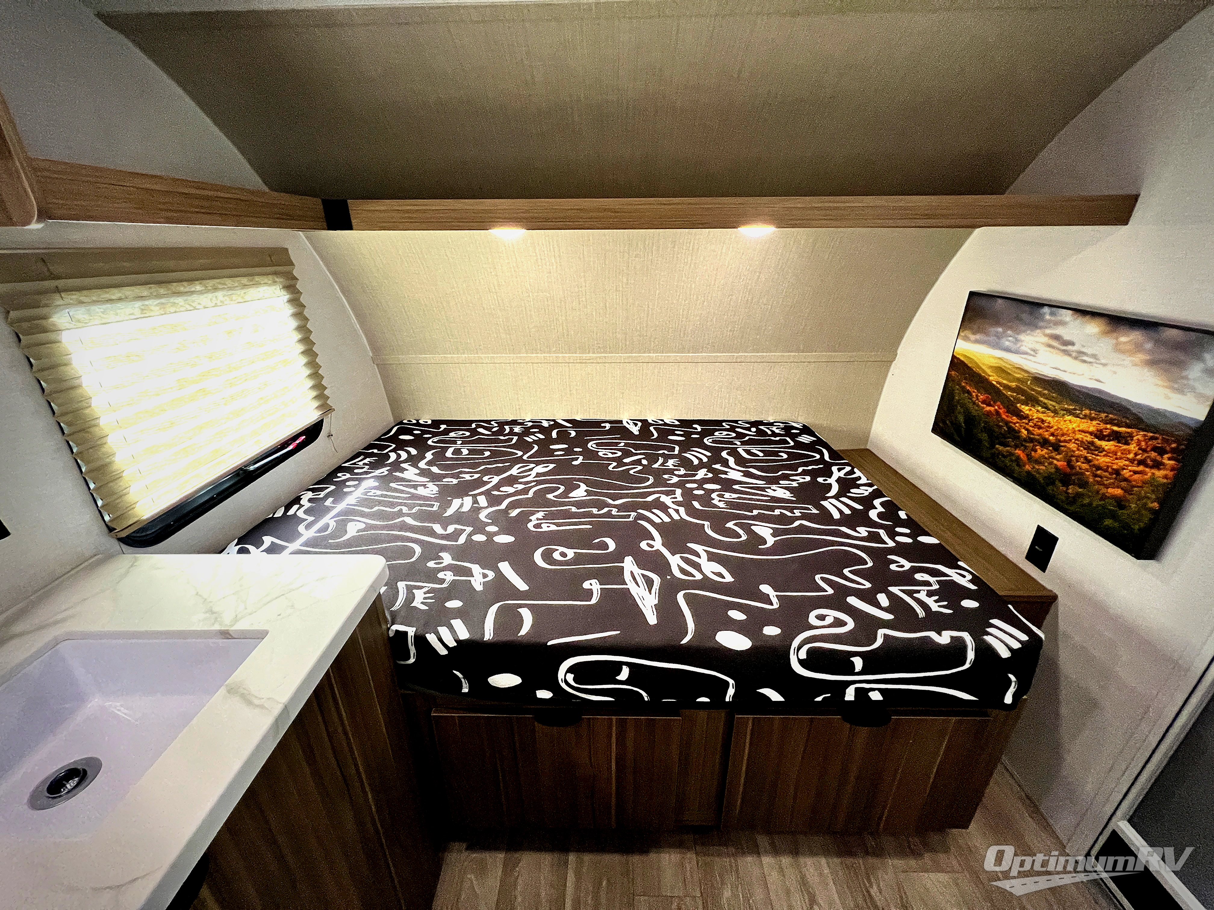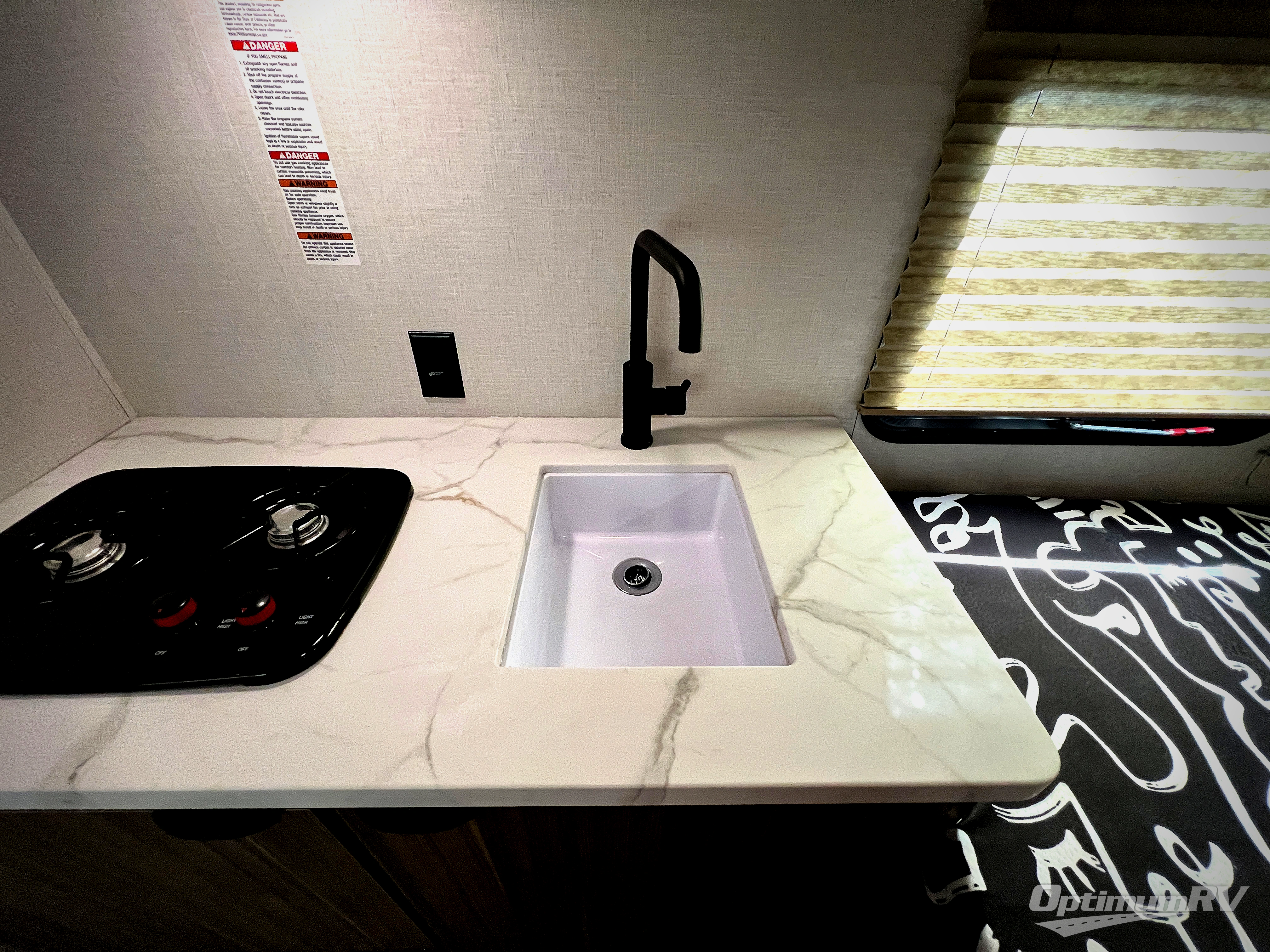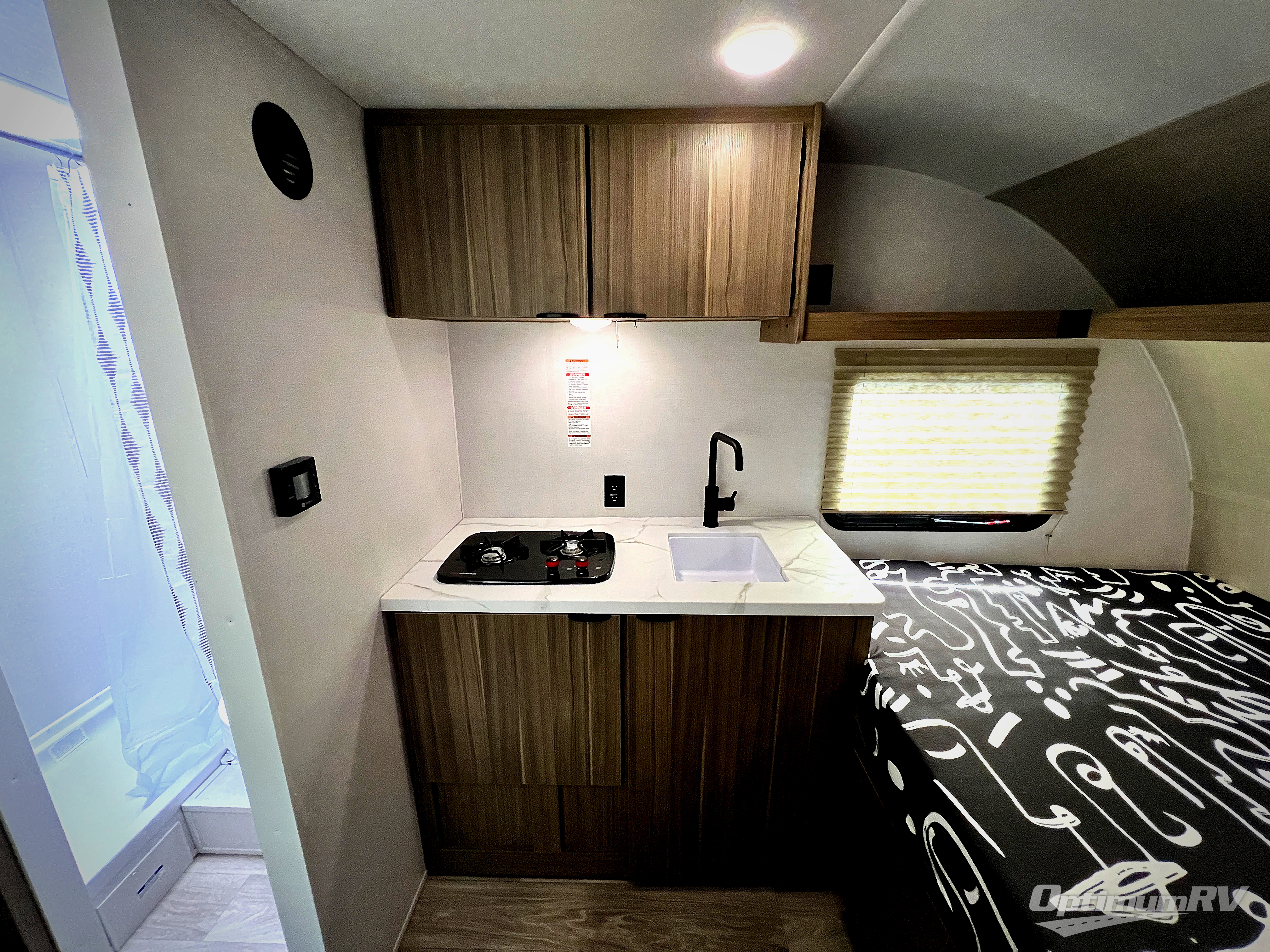 This lightweight travel trailer has everything you need to enjoy camping trips! There is a front east to west custom king bed with storage at the foot of the bed and overhead for your valuables. A private bath includes a toilet and walk-in shower so you can easily get ready each day, and you can prepare your meals on the two-burner cooktop when you get hungry. The booth dinette will provide dining space, along with sleeping space for one to two little ones. Don't let this trailer get away!