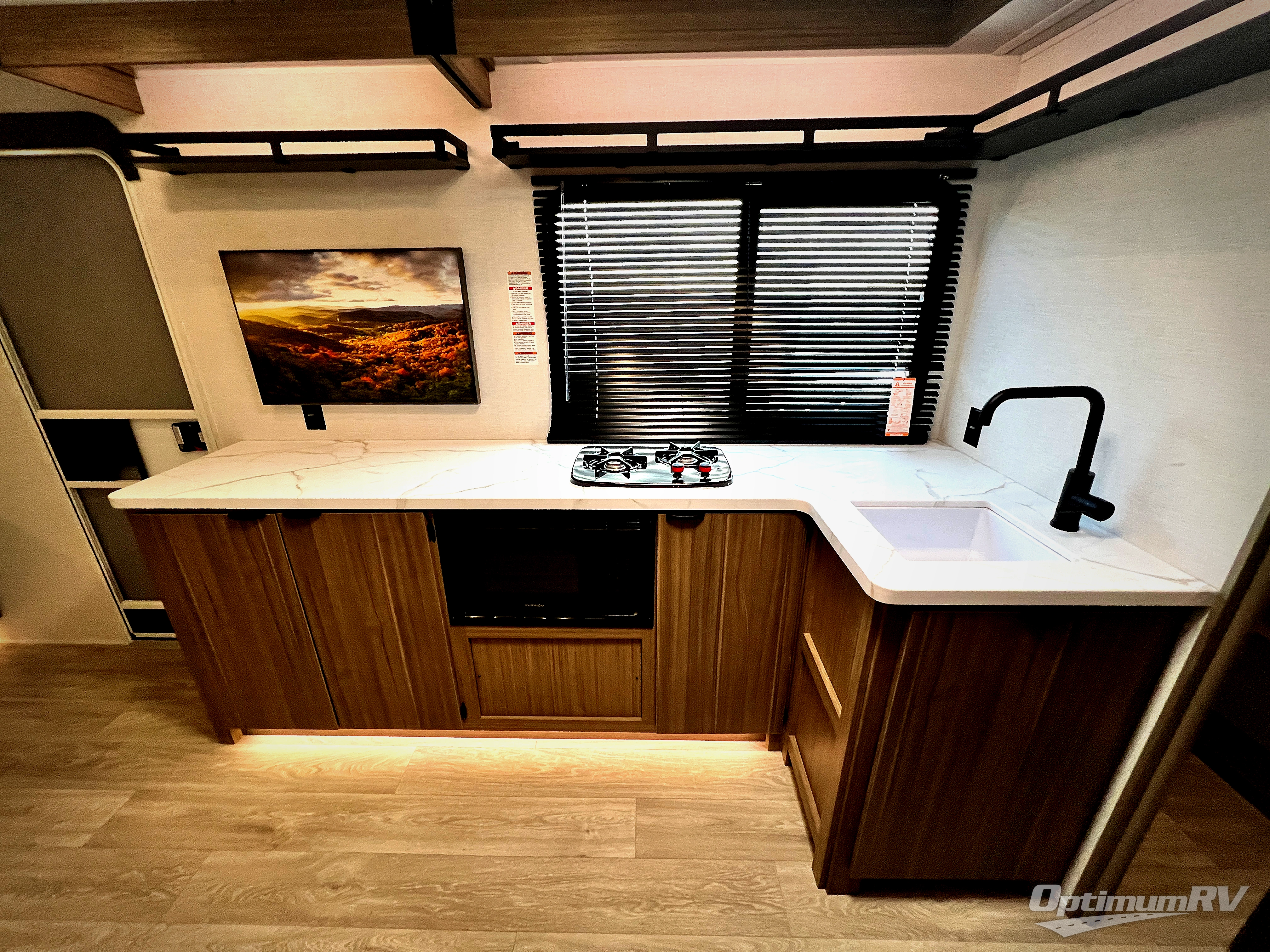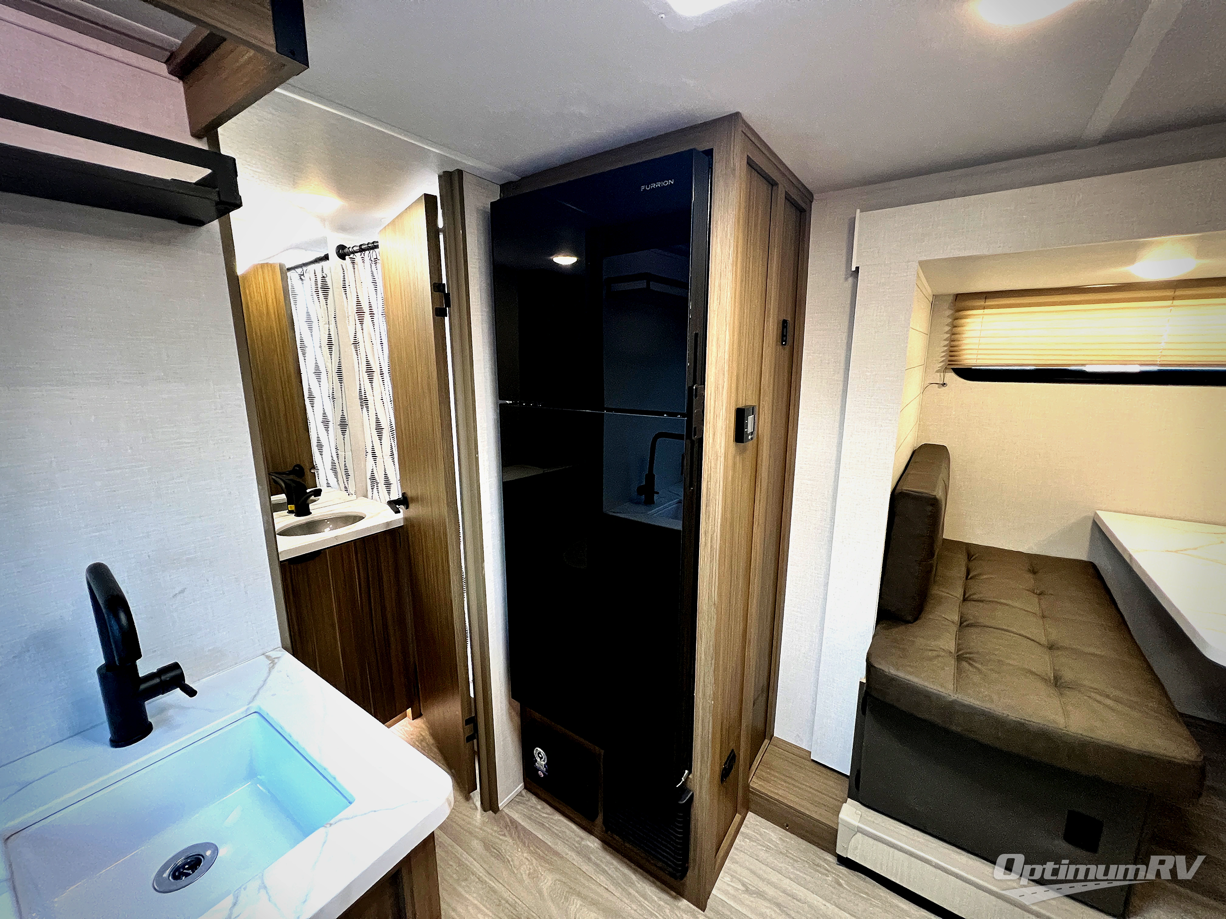 It will be so easy to enjoy time spent in this travel trailer for three. The front queen bed provides a great night's rest, and there is an overhead cabinet to keep your things organized. A two-burner cooktop in the kitchen will let you make meals for your crew, and a refrigerator keeps leftovers fresh. You can dine at the booth dinette within the slide out or take your plate outdoors to sit under the 12' power awning. And a full rear bath with a shower, toilet, and large vanity counter lets you stay clean each day!