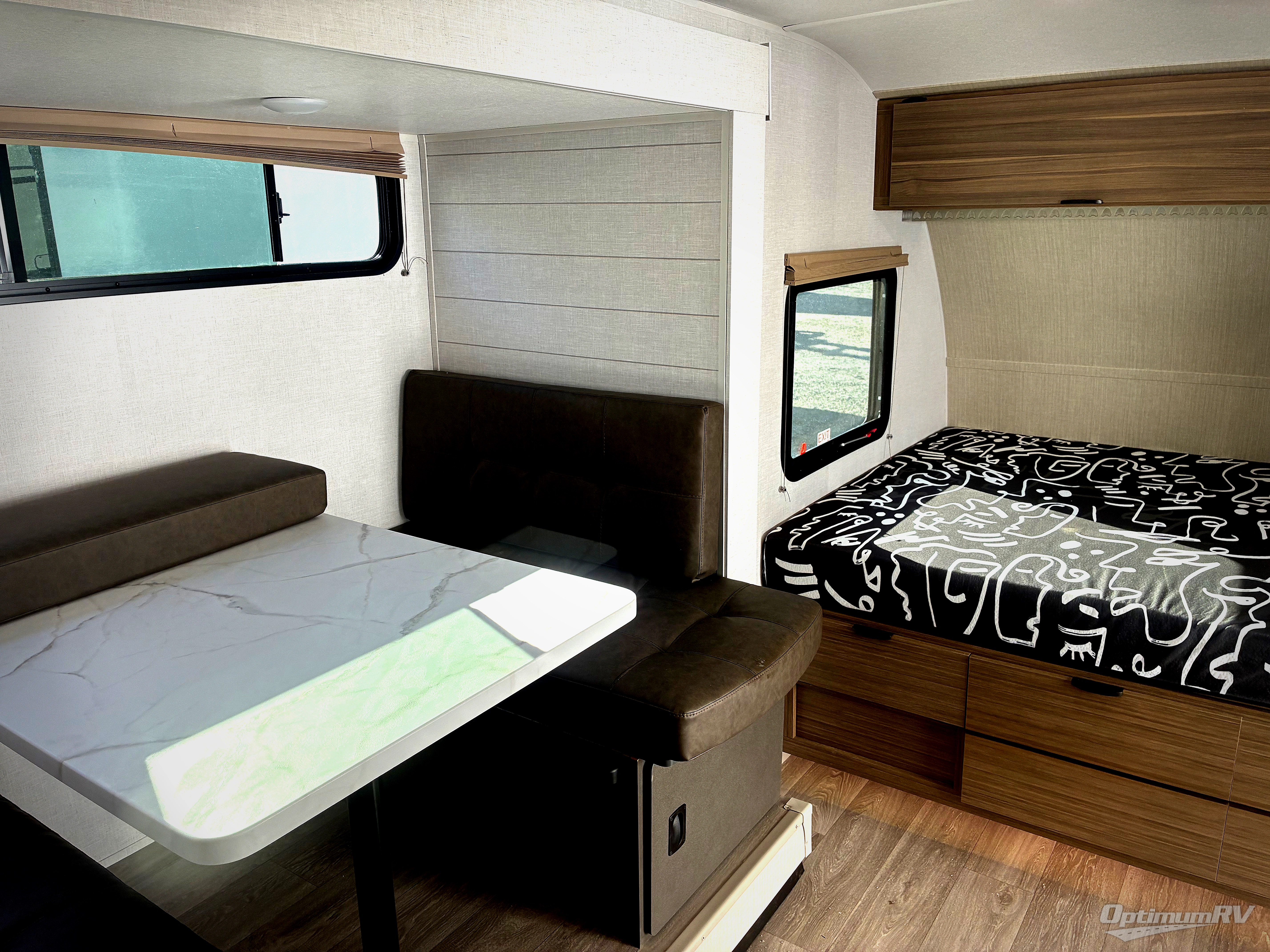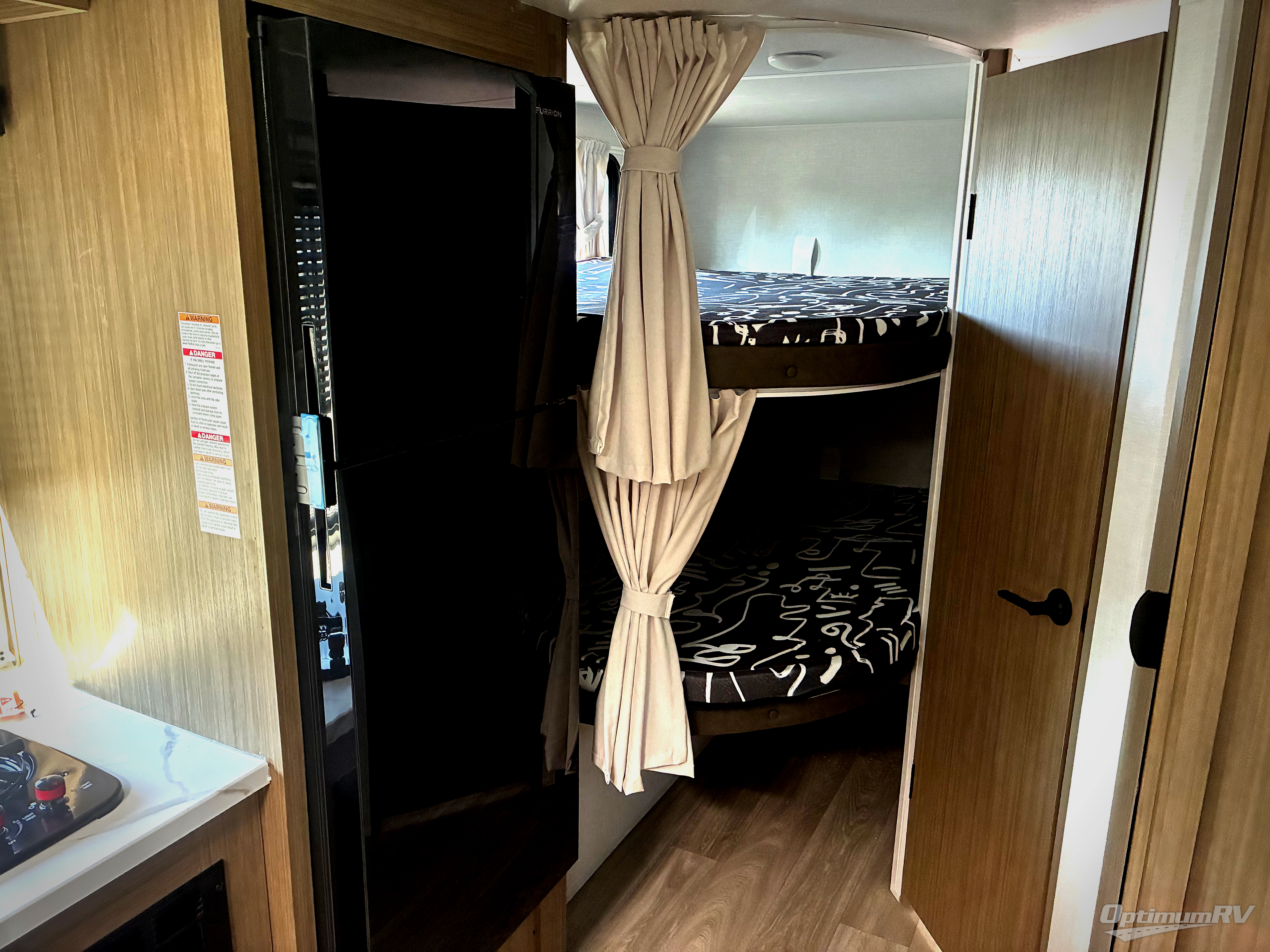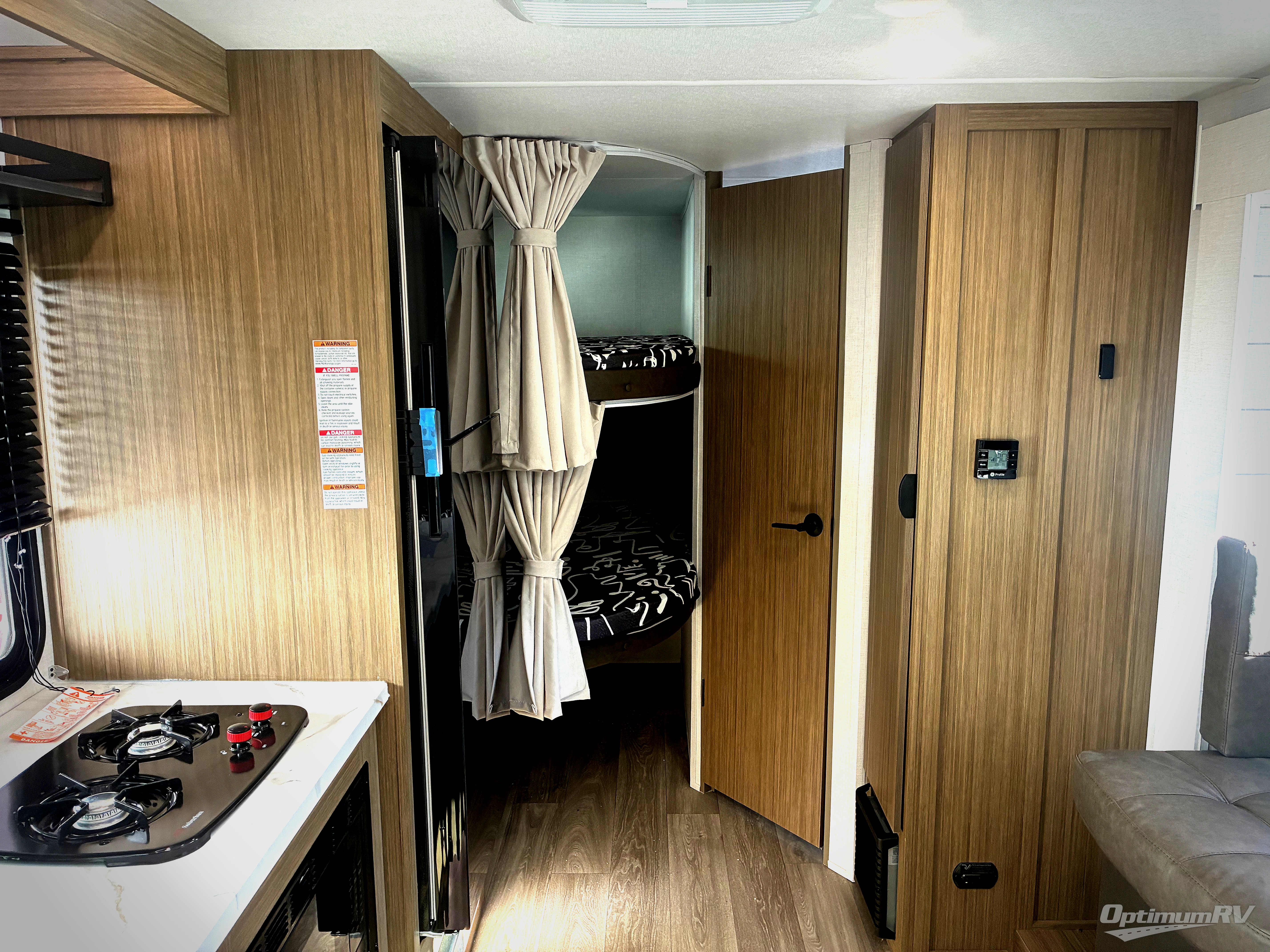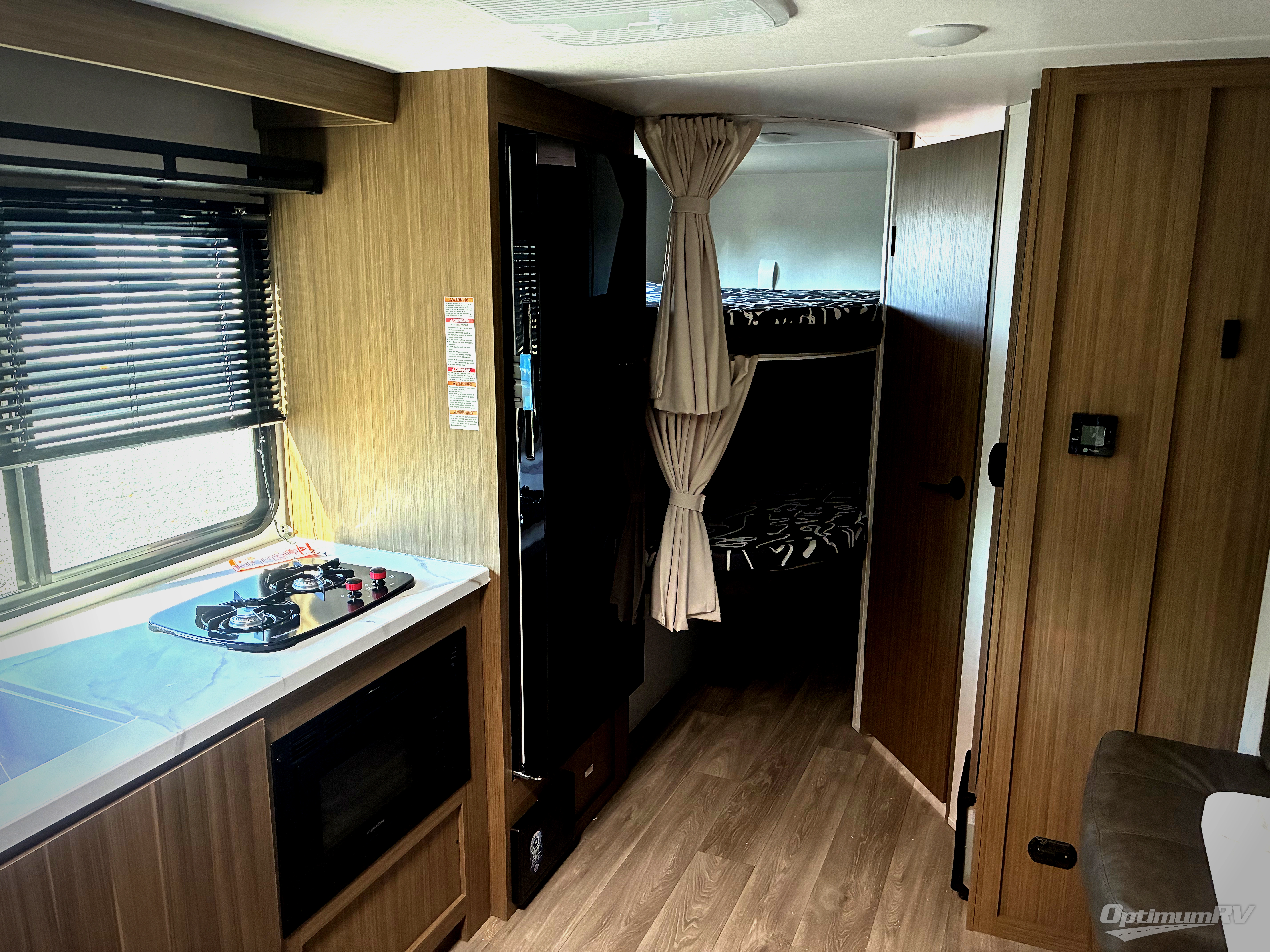 It will be so easy to enjoy time spent in this travel trailer for seven. The front queen bed provides a great night's rest, and there is an overhead cabinet to keep your things organized. Your guests or little ones can claim the double-size bunks for themselves, and there is a full bath adjacent to the bunks for easy nighttime use. A two-burner cooktop in the kitchen will let you make meals for your crew, and a refrigerator keeps leftovers fresh. You can dine at the booth dinette within the slide out or take your plate outdoors to sit under the 15' power awning.