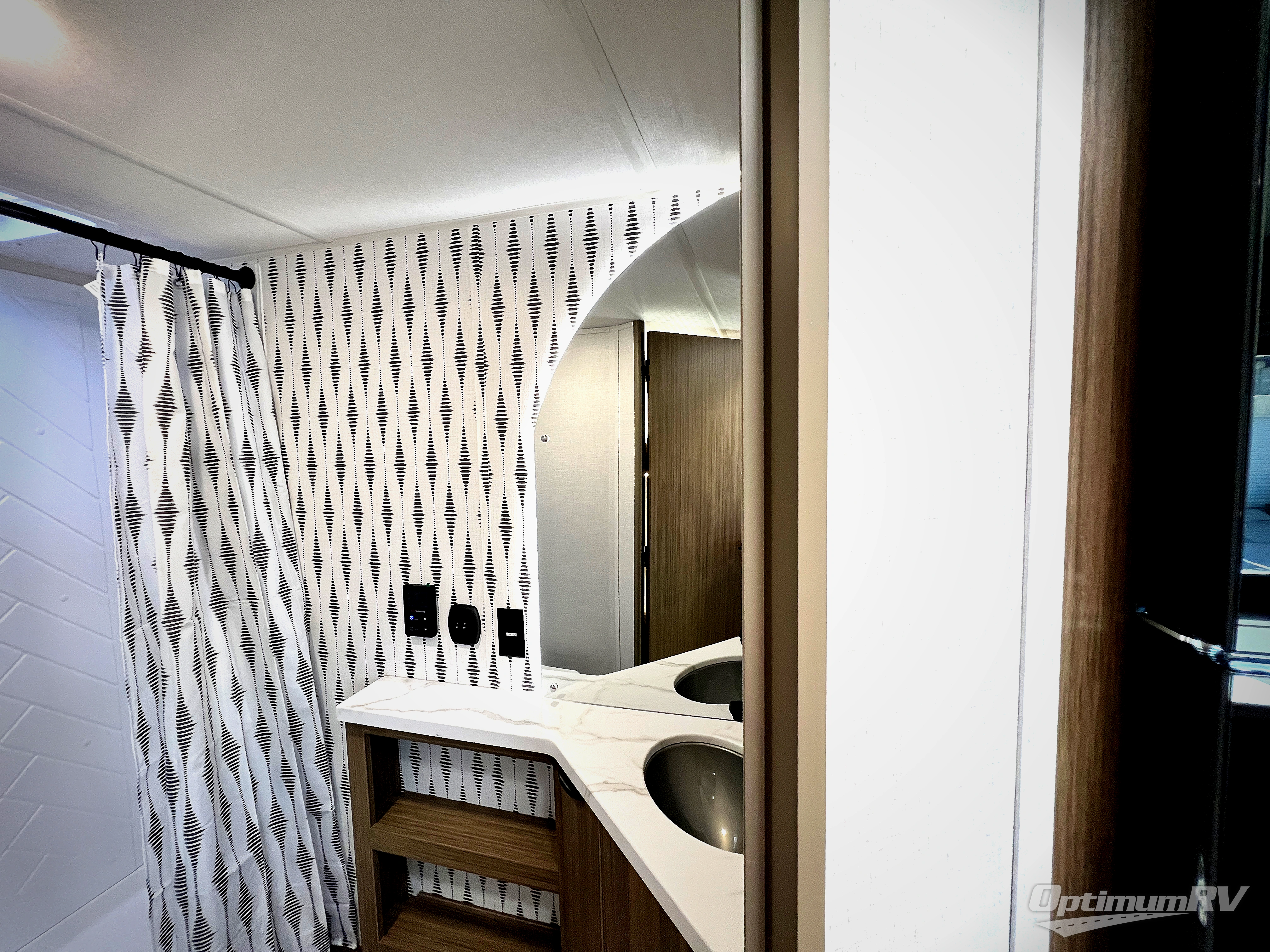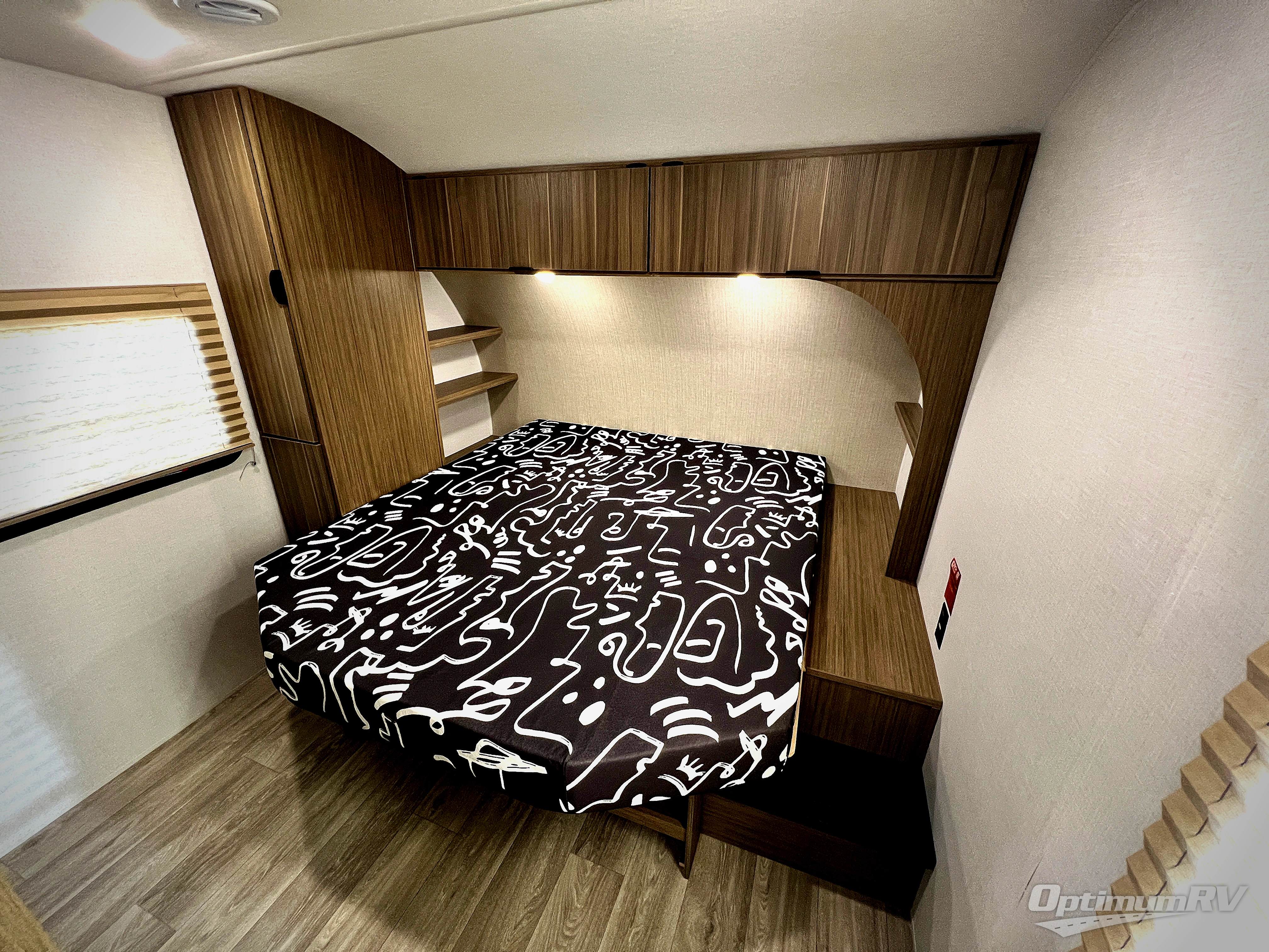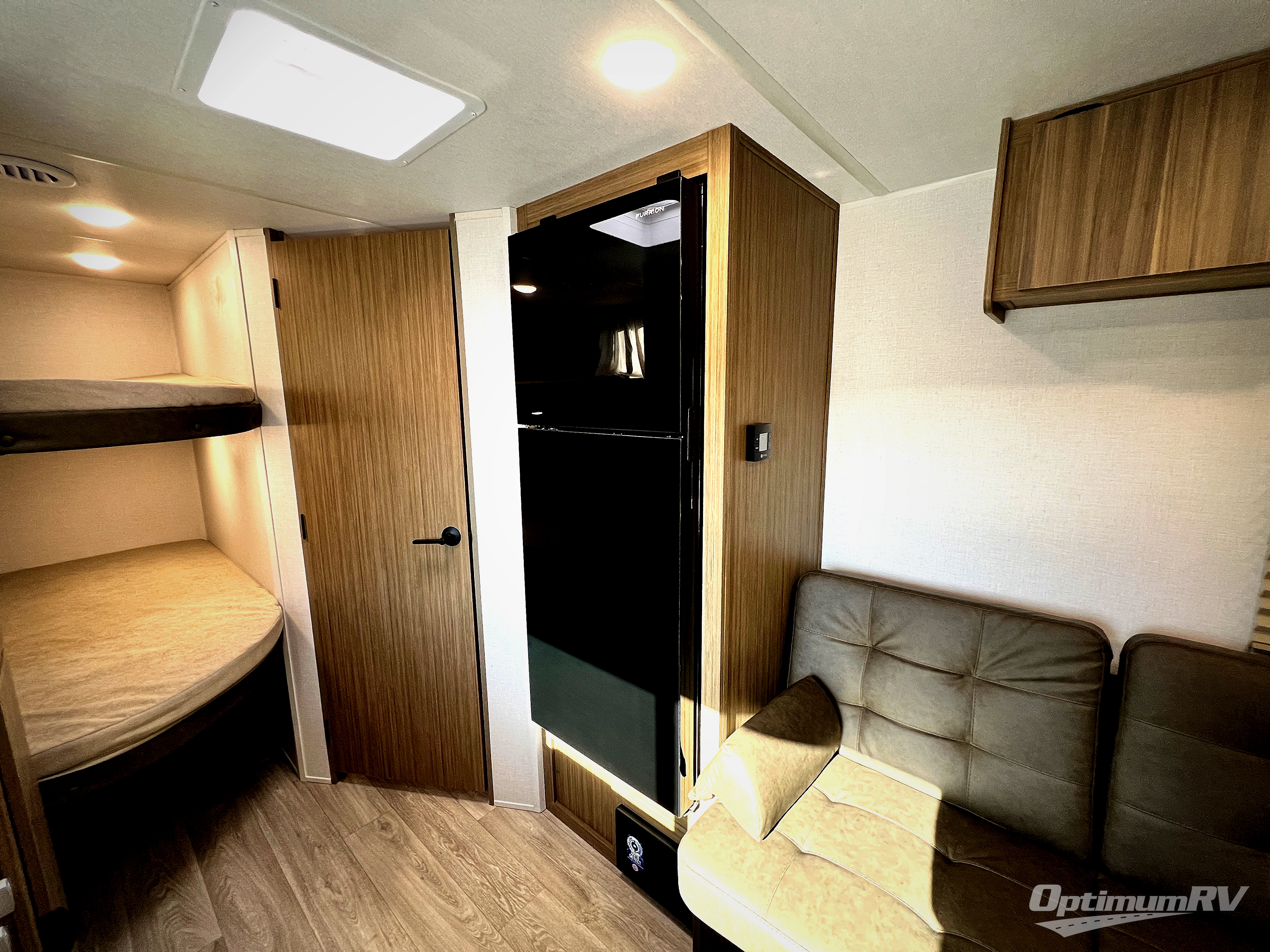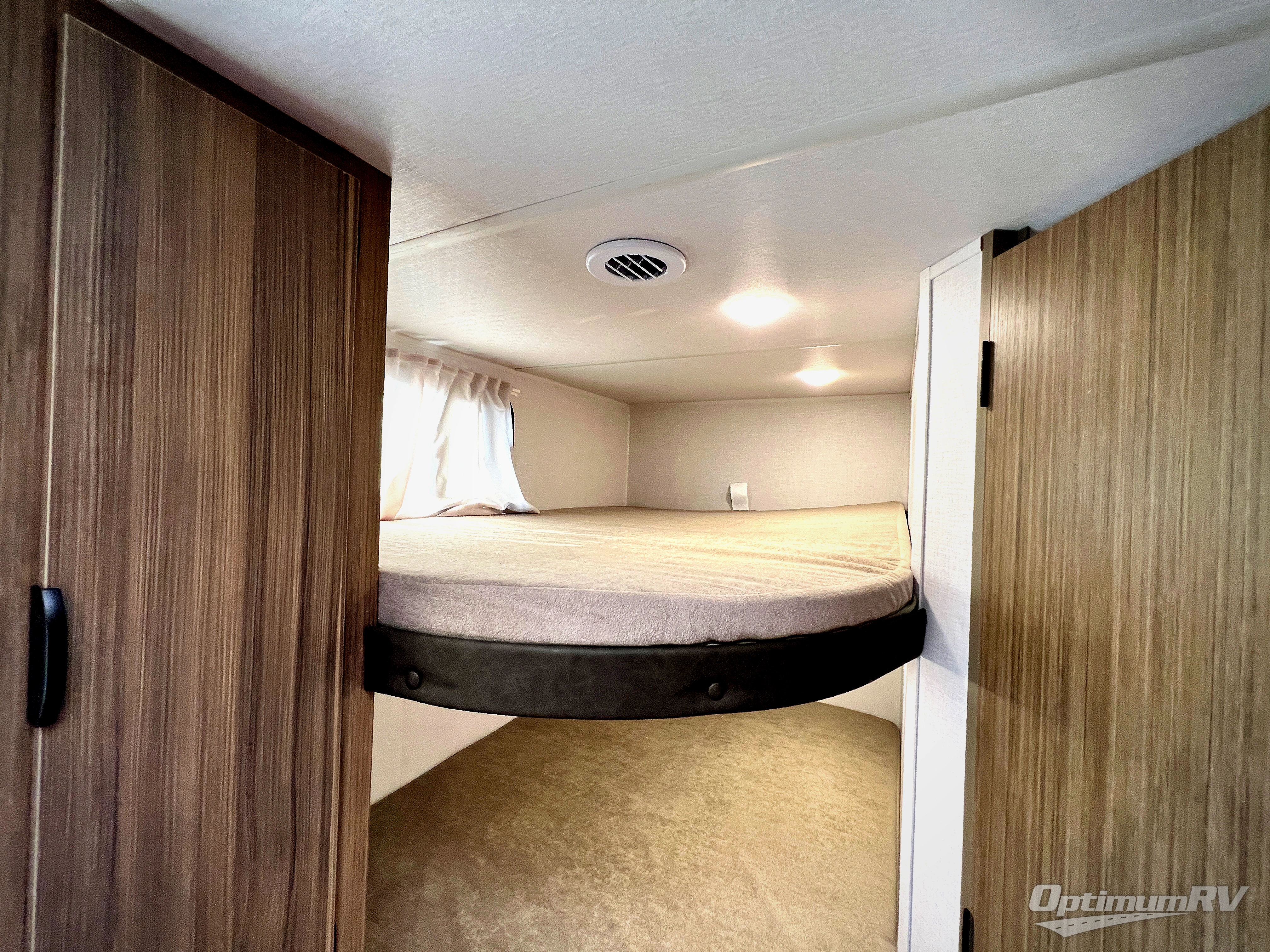 Camping is made easy in this travel trailer with more sleeping space and lots of comforts! The kids or your guests will enjoy the double-size bunks in the back, along with the full bath close by for easy nighttime use. You'll have the front private bedroom with a king bed all to yourselves, and there are dual bedroom wardrobes to keep your space neat and clean. Everyone can meet in the combined kitchen and living room to relax on the super U-lounge with a removable table while the chef of your group makes breakfast on the two-burner cooktop. There is also a microwave oven for quick meals, plus a pantry and large under counter refrigerator for food storage!