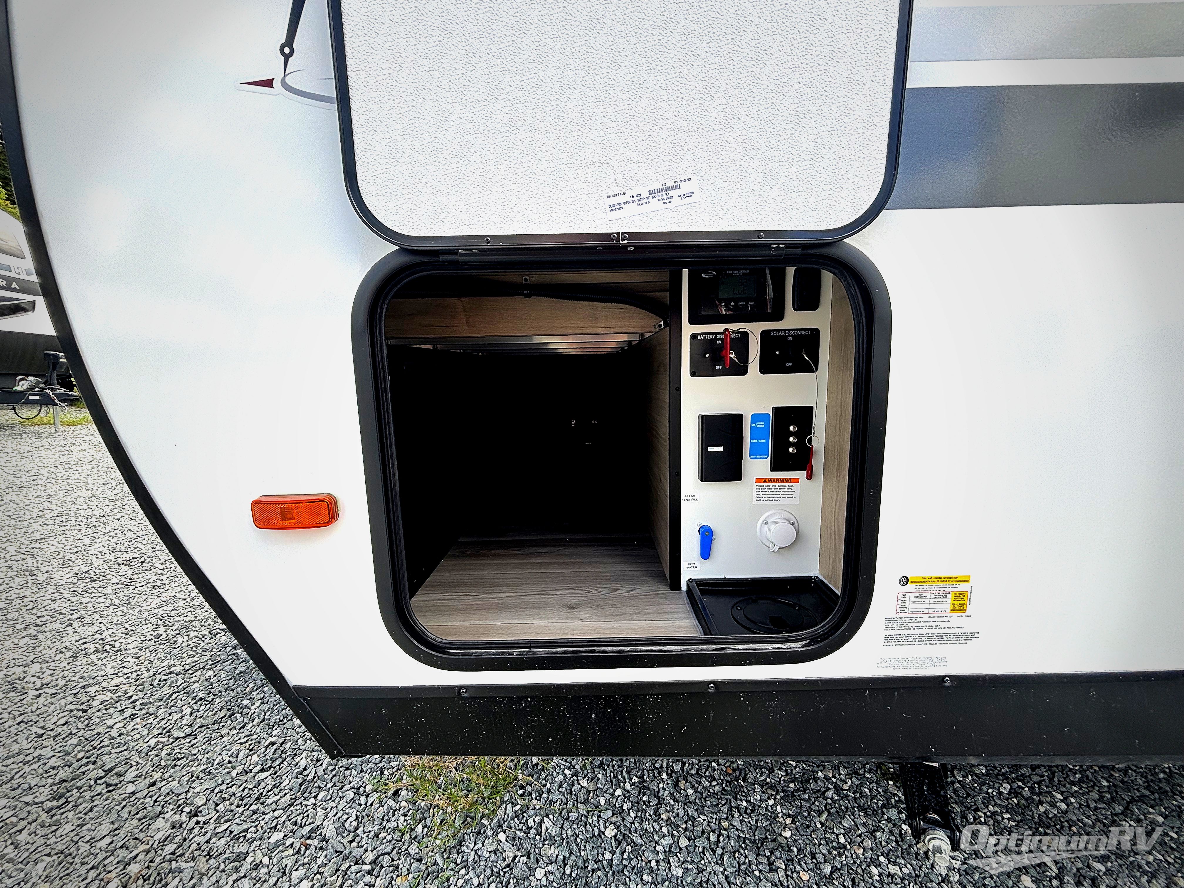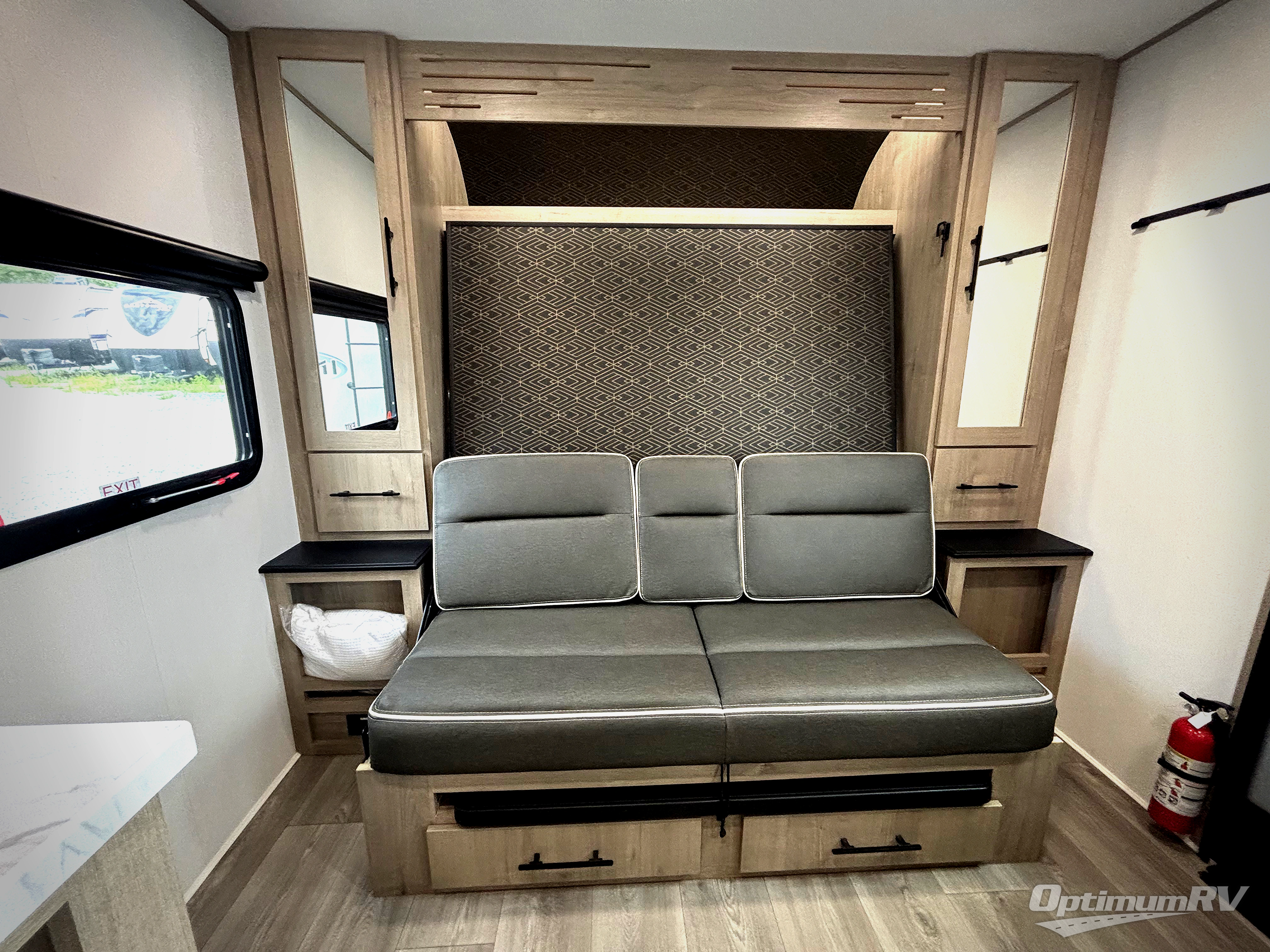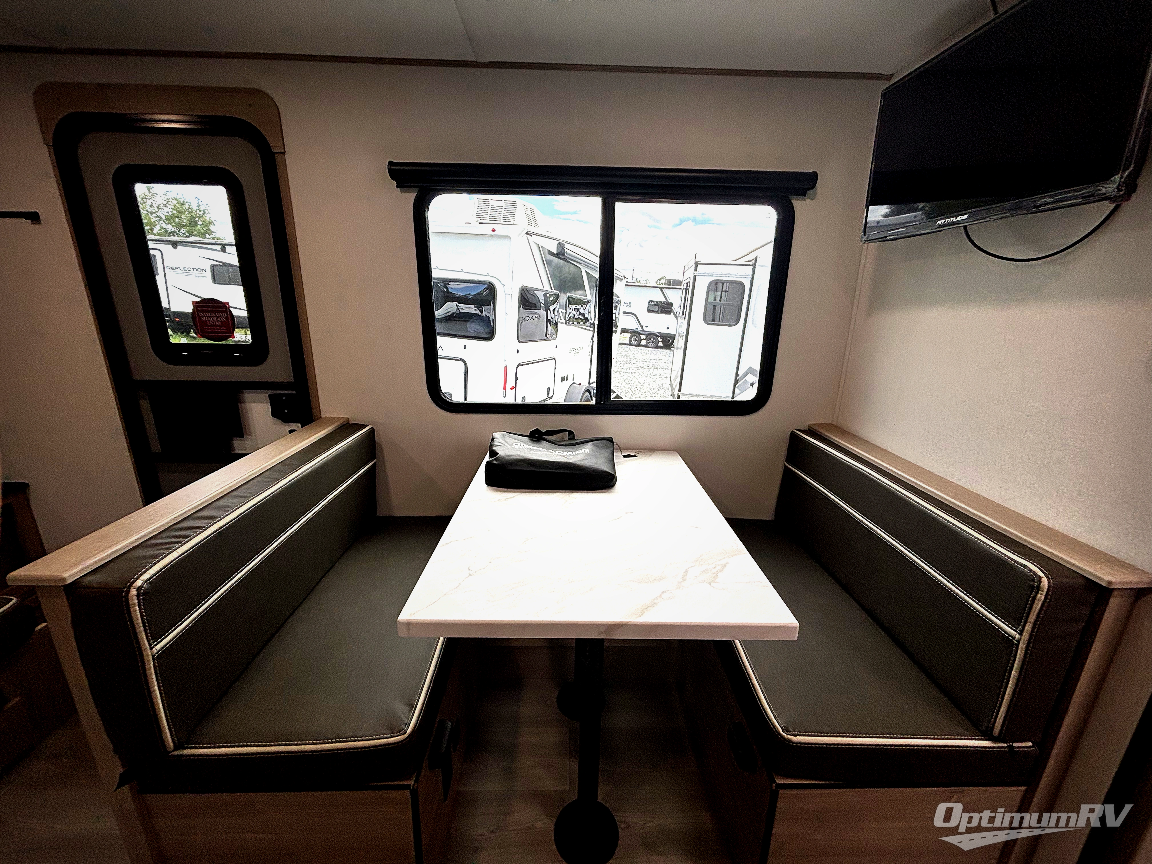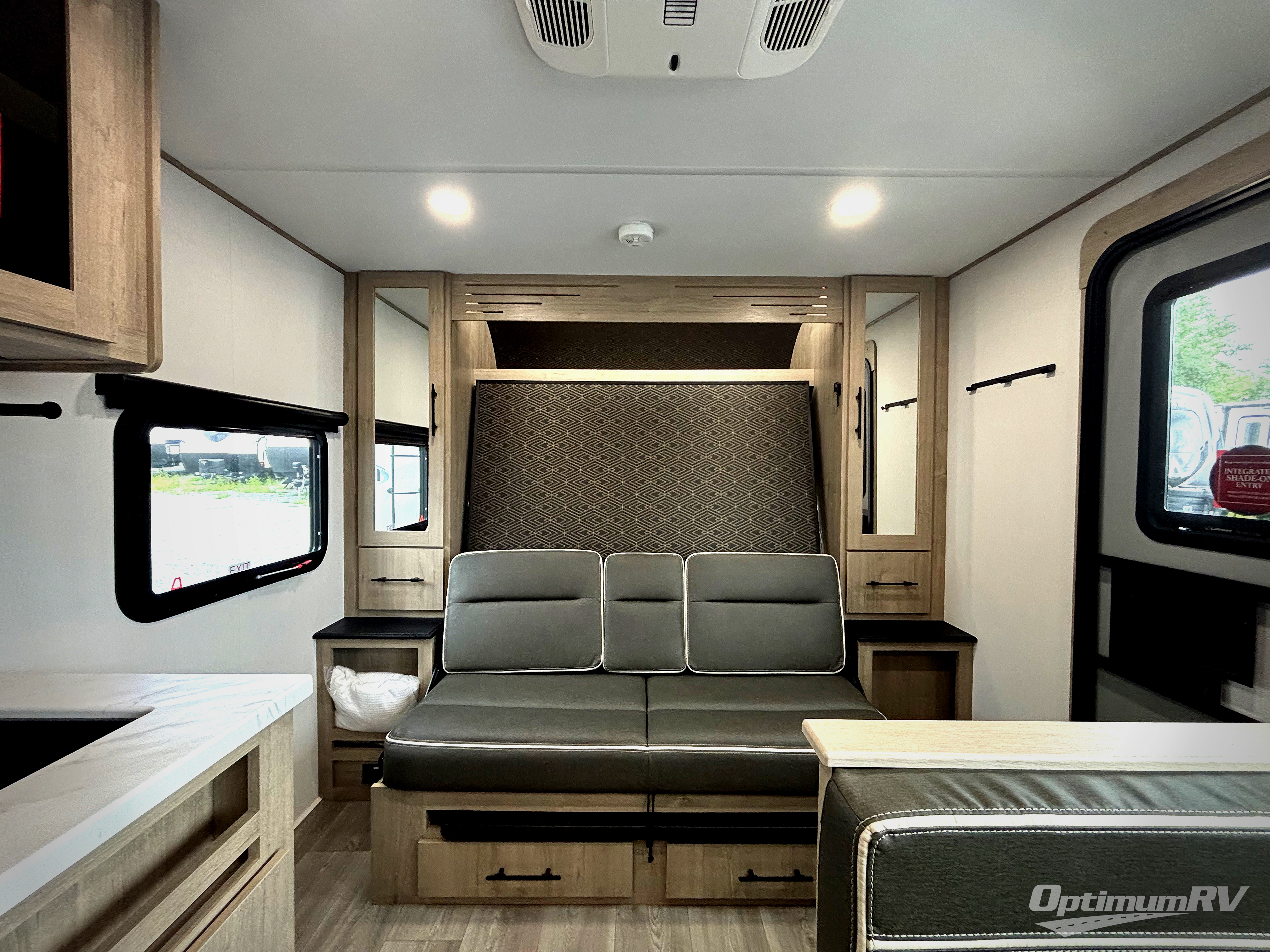 Start looking for your favorite campground to take this travel trailer to! After a fun day at the beach, you can rinse the sand out of your hair with the walk-in shower with a skylight in the full rear bathroom. Depending on what time you enter the unit will determine whether you see the Murphy bed or sofa with drawers underneath and wardrobes on either side of it. The booth dinette is not only great for enjoying meals prepared with the two burner cooktop or outside griddle, but also for transforming into an extra sleeping space!