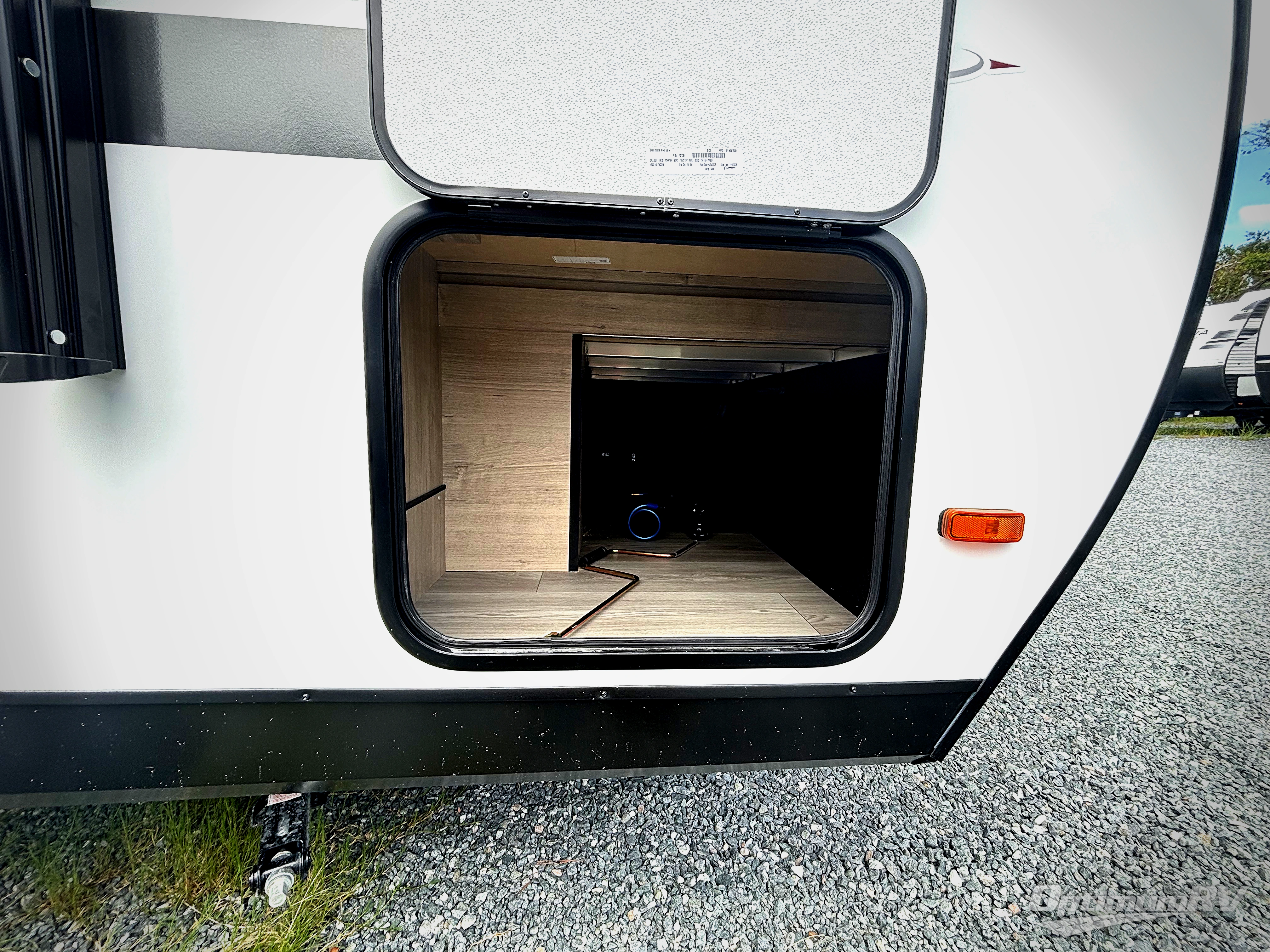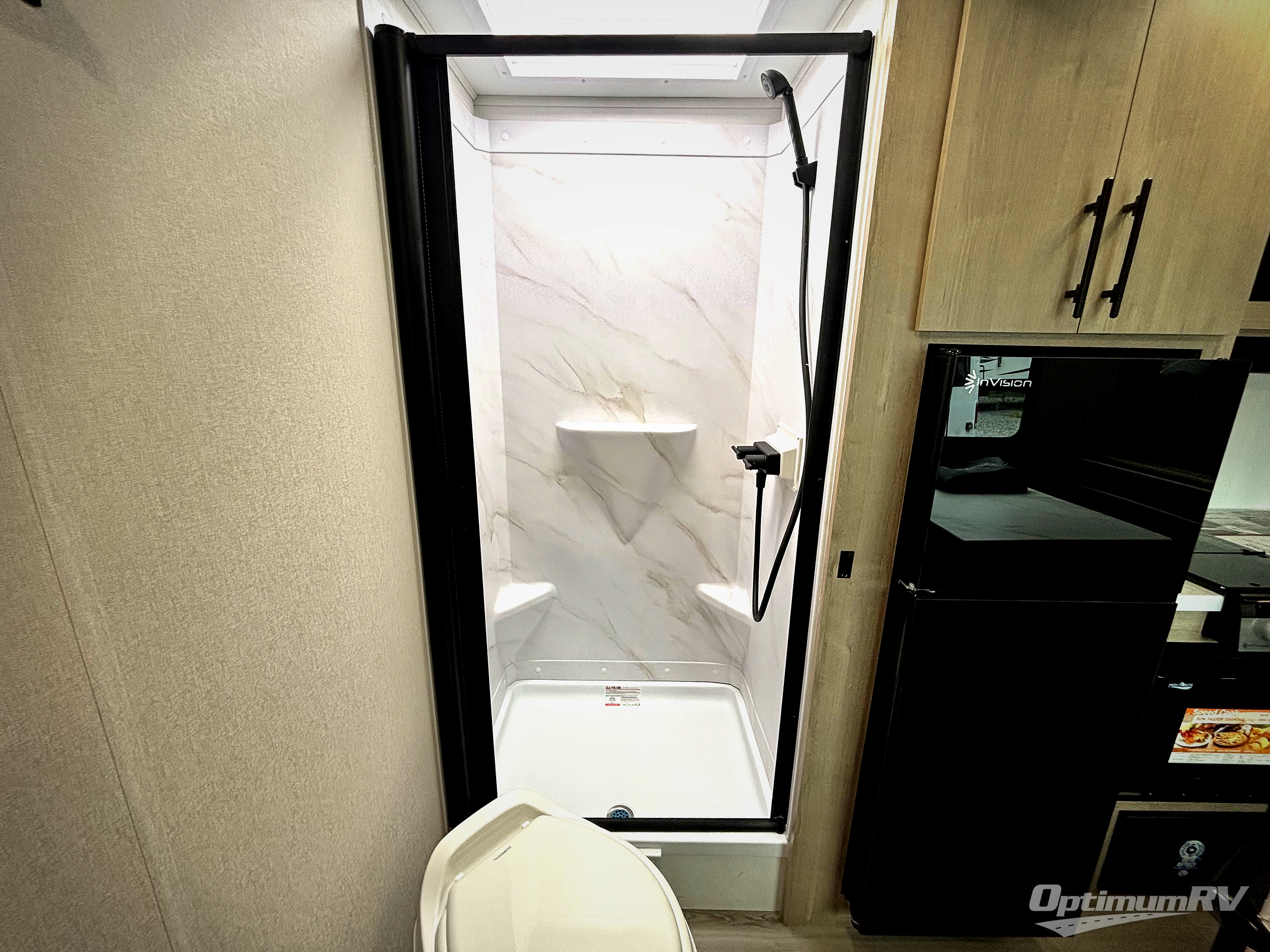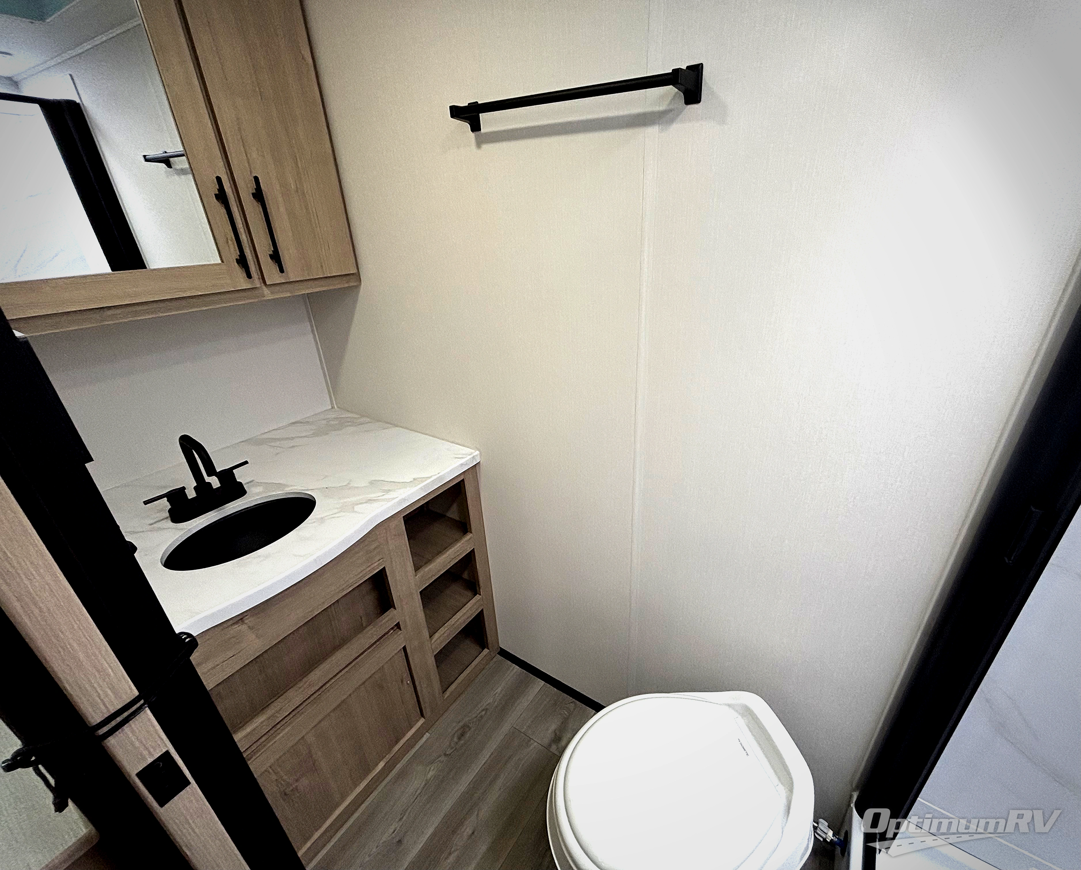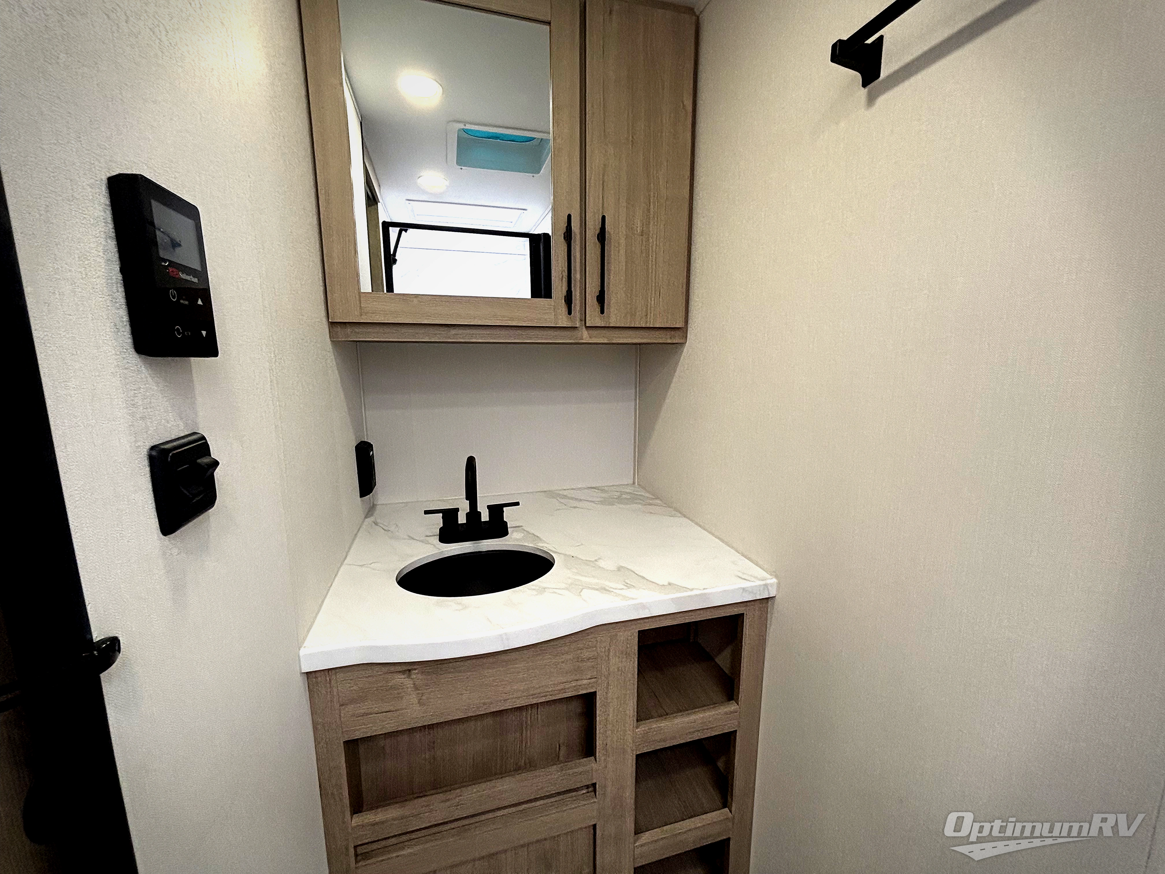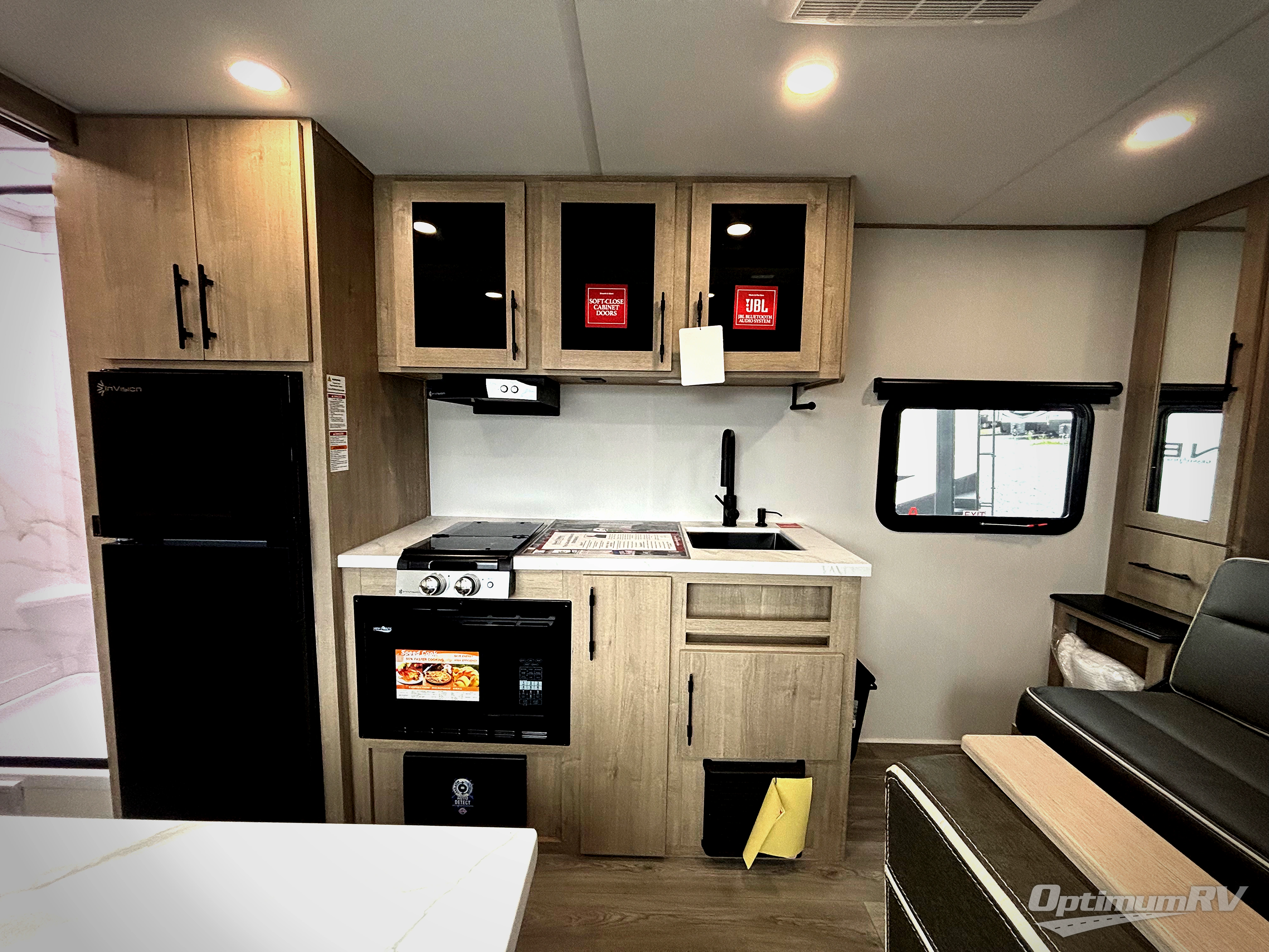 Start looking for your favorite campground to take this travel trailer to! After a fun day at the beach, you can rinse the sand out of your hair with the walk-in shower with a skylight in the full rear bathroom. Depending on what time you enter the unit will determine whether you see the Murphy bed or sofa with drawers underneath and wardrobes on either side of it. The booth dinette is not only great for enjoying meals prepared with the two burner cooktop or outside griddle, but also for transforming into an extra sleeping space!
