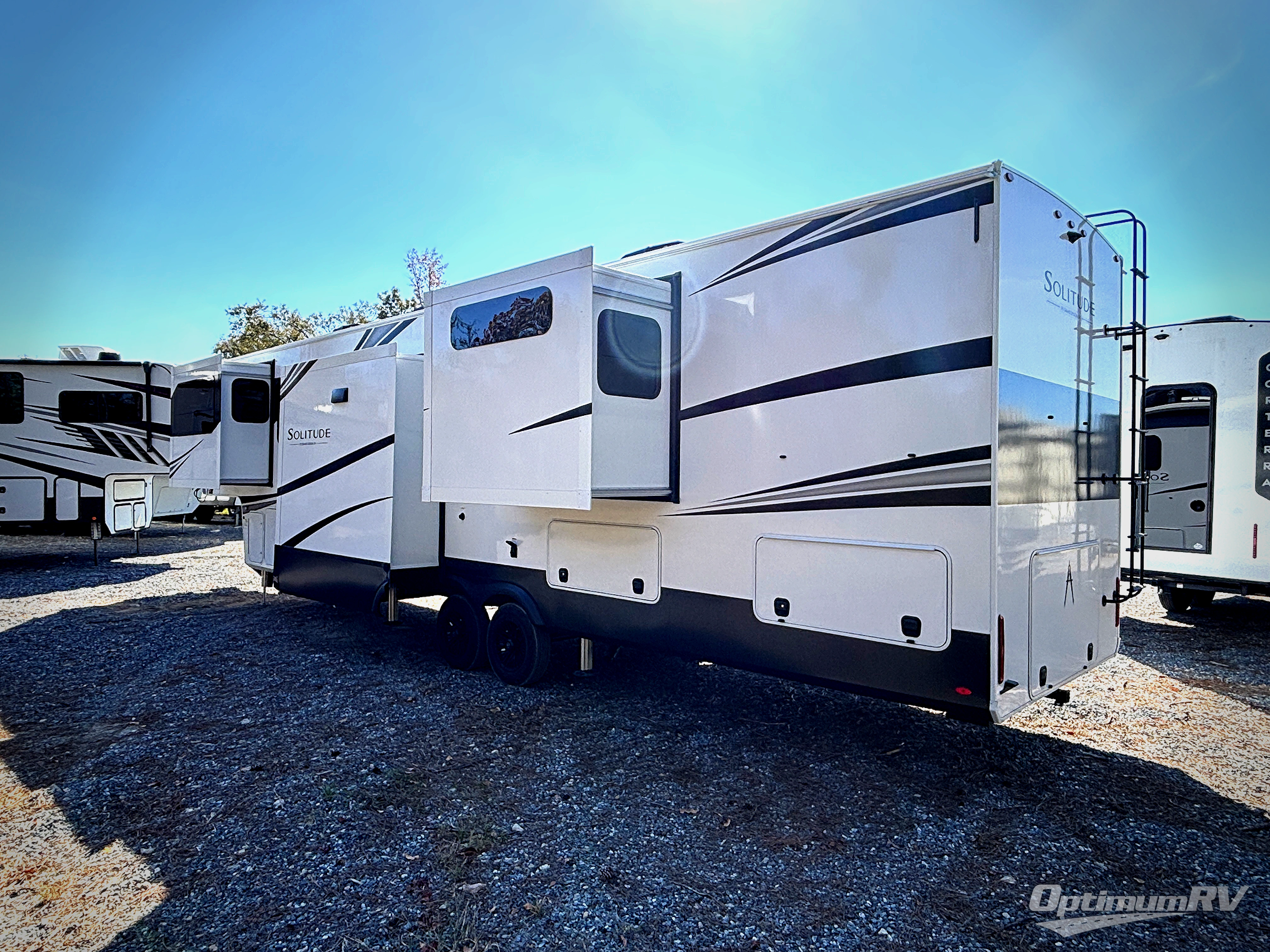 Each Solitude fifth wheel by Grand Design features a 101" wide-body construction, heavy duty 8,000 lb. axles, frameless tinted windows, and high-gloss gel coat sidewalls. You can camp year around thanks to the Weather-Tek Package that includes a 35K BTU high-capacity furnace, an all-in-one enclosed and heated utility center, and a fully enclosed underbelly with heated tanks and storage. Inside, you'll love the premium roller shades, hardwood cabinet doors, solid surface countertops, plus residential finishes throughout to make you truly feel at home. Each model also includes a MORryde CRE3000 suspension system, self adjusting brakes, and a MORryde pin box that will provide smooth towing from home to campground. Affordable luxury is possible with the Solitude fifth wheels; choose yours today!