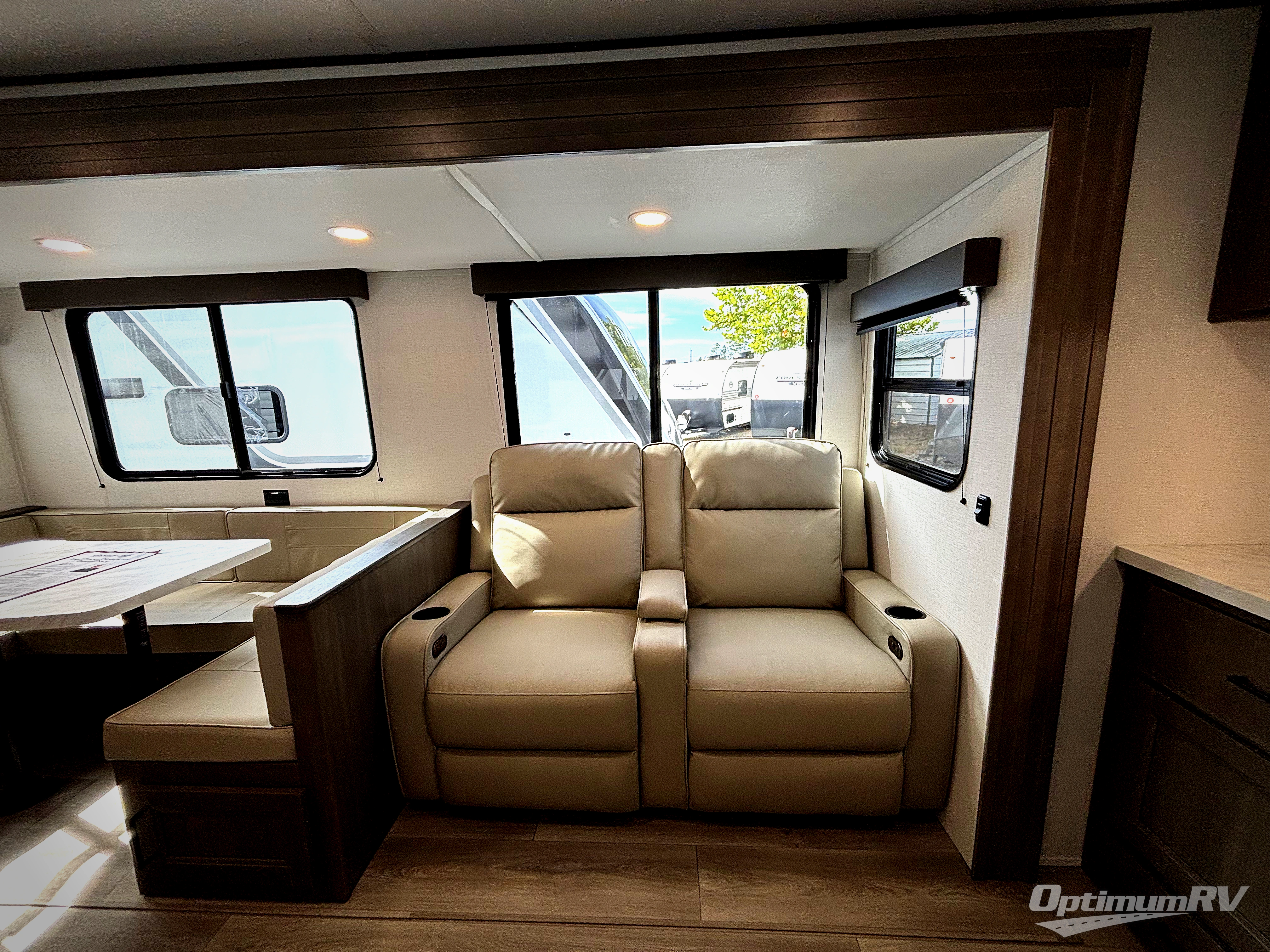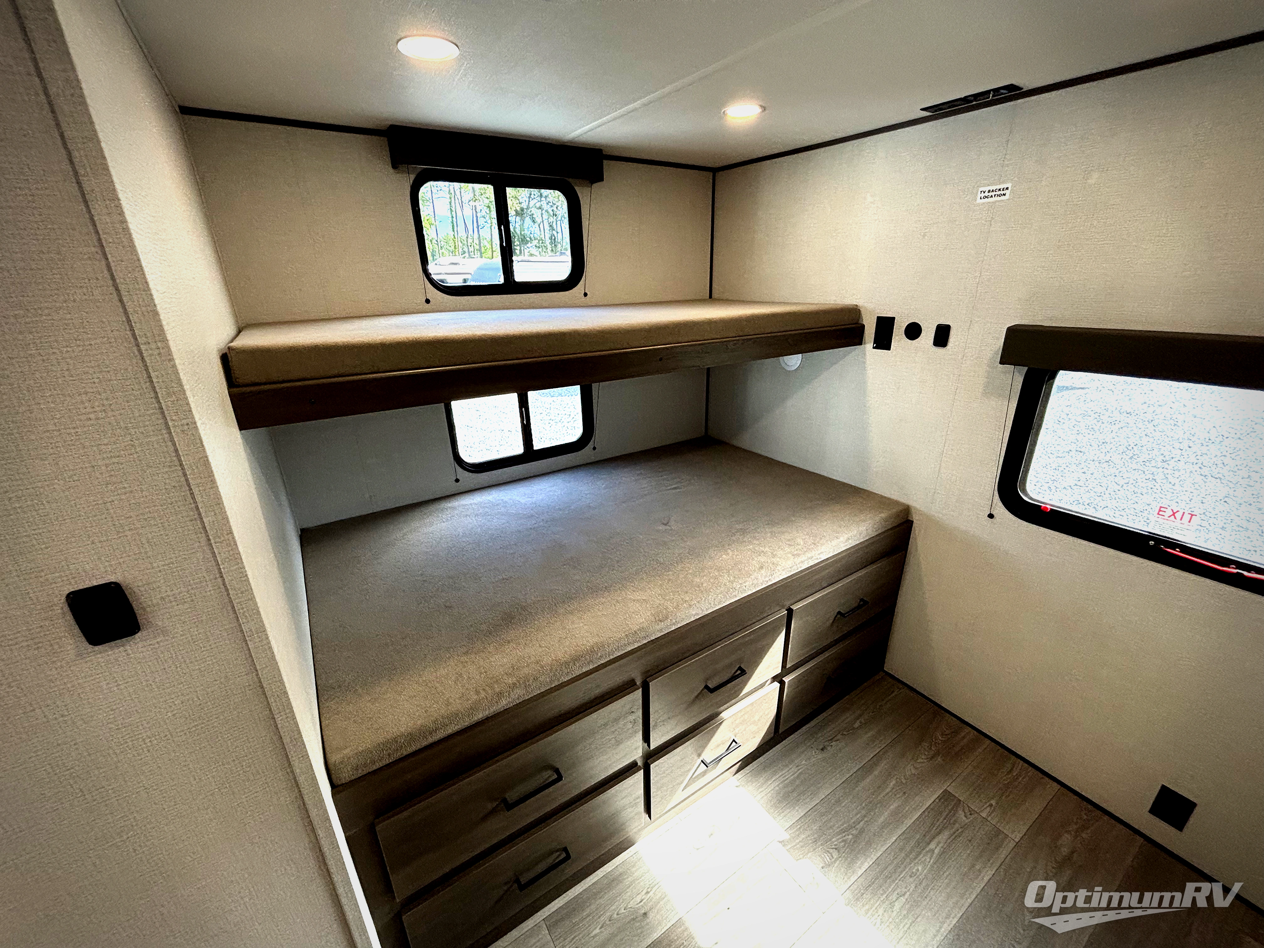 If you're looking for a travel trailer that can house your whole gang, this unit is the one! The rear private bunkhouse can sleep up to five since there is a sleeper sofa and three bunks, plus there are storage drawers for your guests' things. A front private bedroom will be perfect for the owners with a queen bed, storage space, and a convenient laundry chute! Whether you cook outside on the exterior griddle or inside on the three burner range, you'll be able to make your best meals. There is also a 12V French door refrigerator with a glass front and bottom freezer and a convection microwave/combo air fryer for easy meals! A U-shaped dinette and 60" sleeper sofa within the living room slide provides even more seating and sleeping space, or you can choose the optional theater seat in place of the sofa if you're not needing the extra sleeping space!
