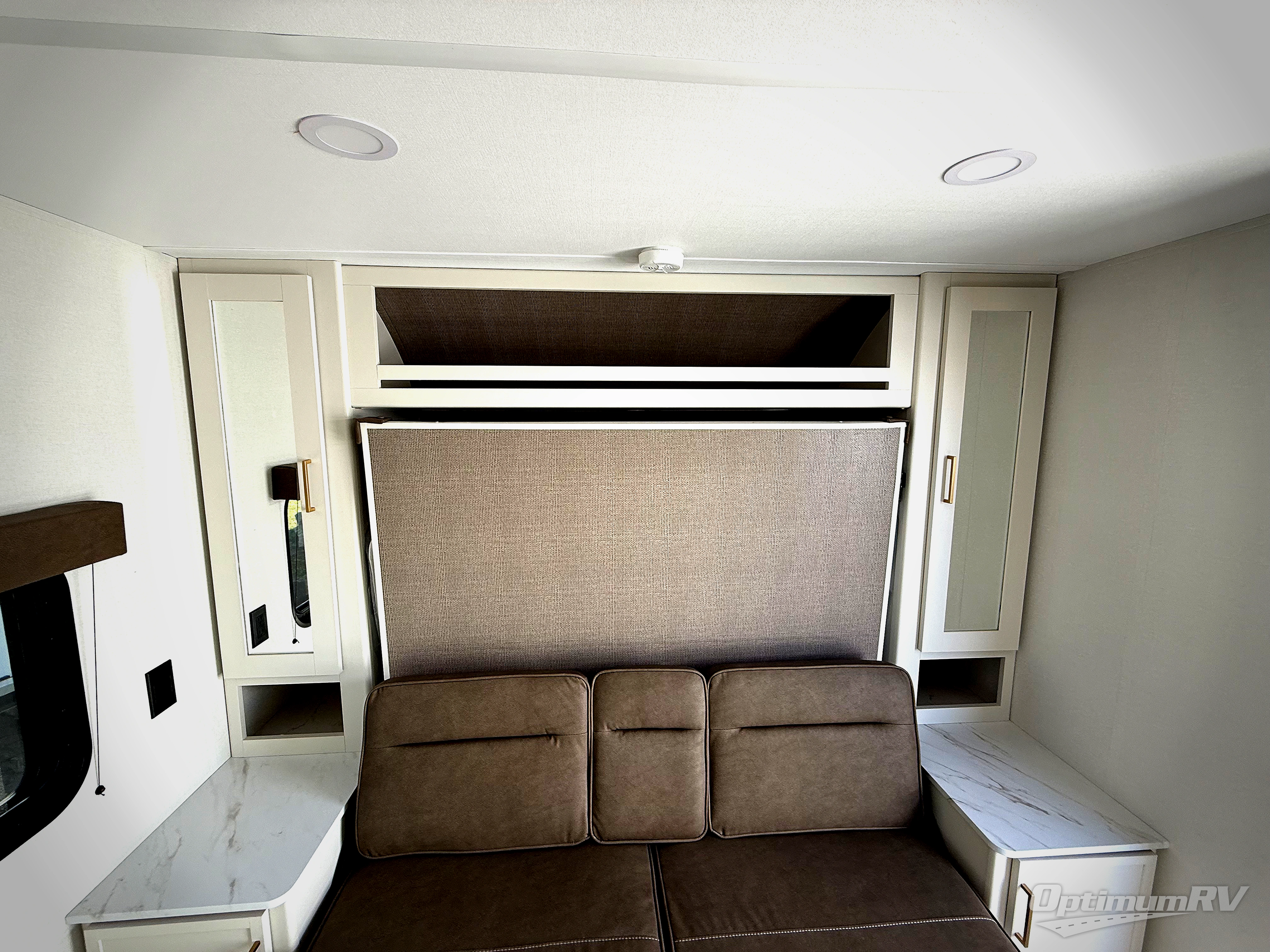 This is the perfect couple's trailer with versatile seating and sleeping space! You'll find a queen-size Murphy bed up front with storage space beside and above plus a full rear bath for added privacy. Once you've made lunch in the full kitchen, you can dine at the booth dinette or take your plate outdoors to sit under the 10' power awning. You'll also find pass-thru storage outside that will be perfect for fishing poles, lawn chairs, tools and more!