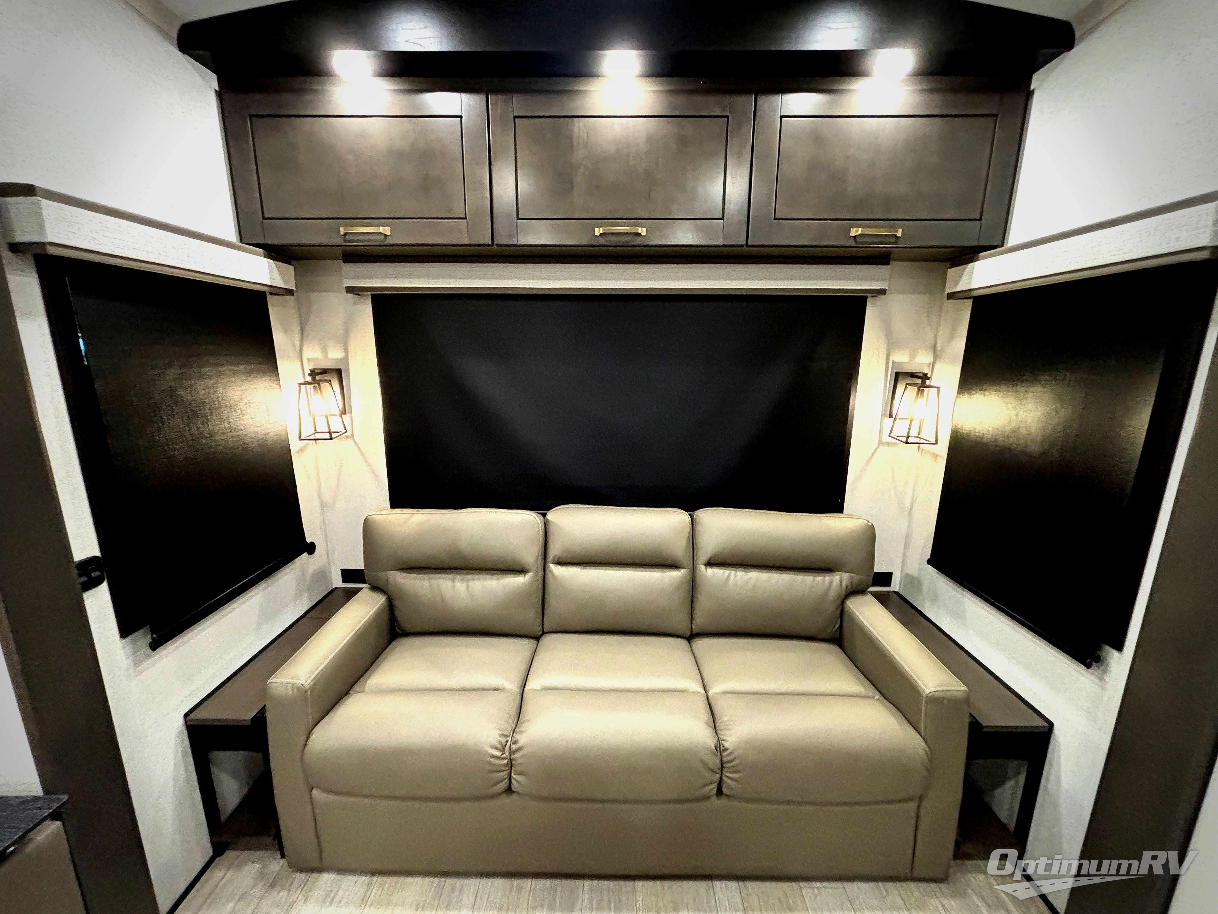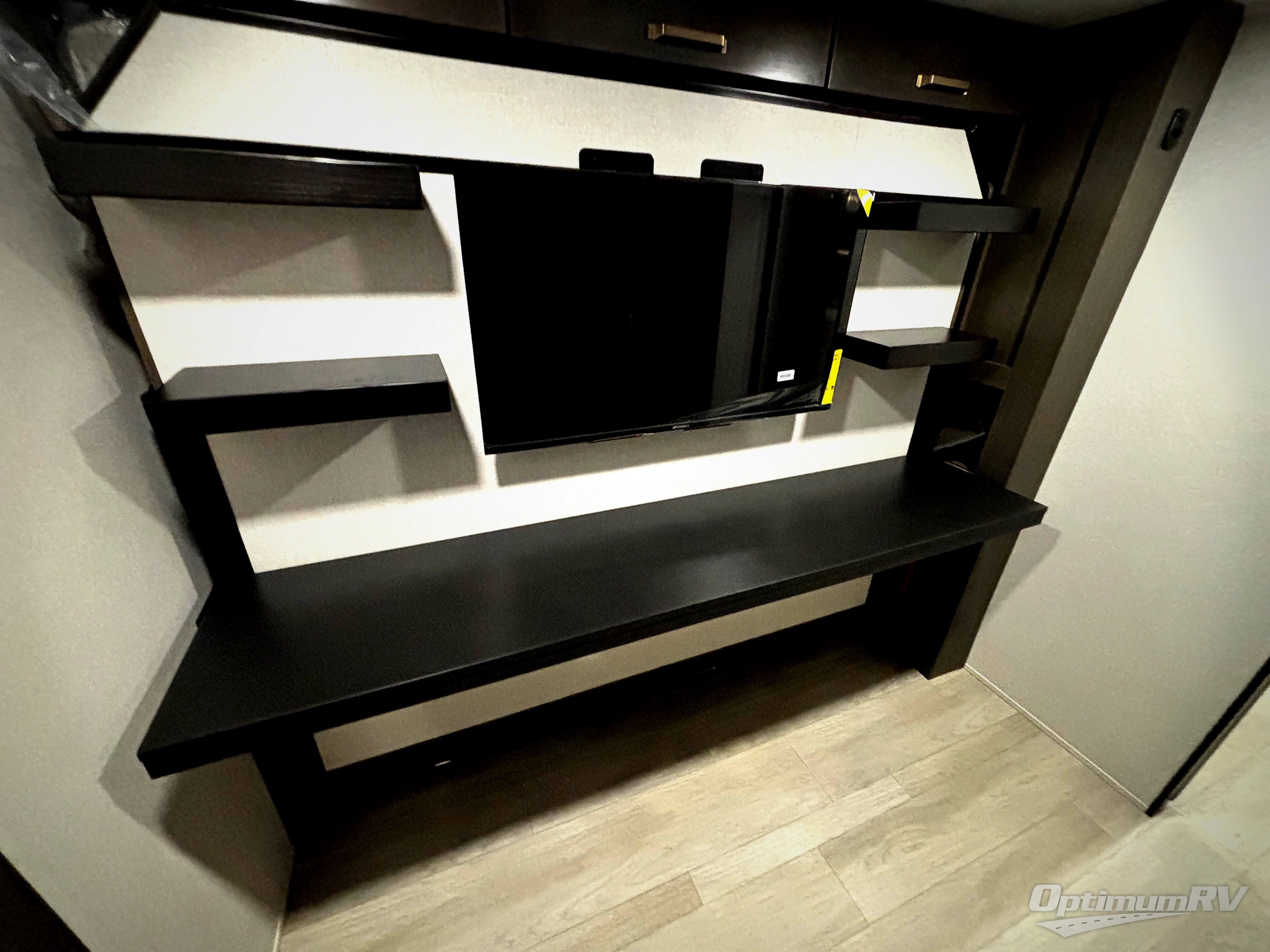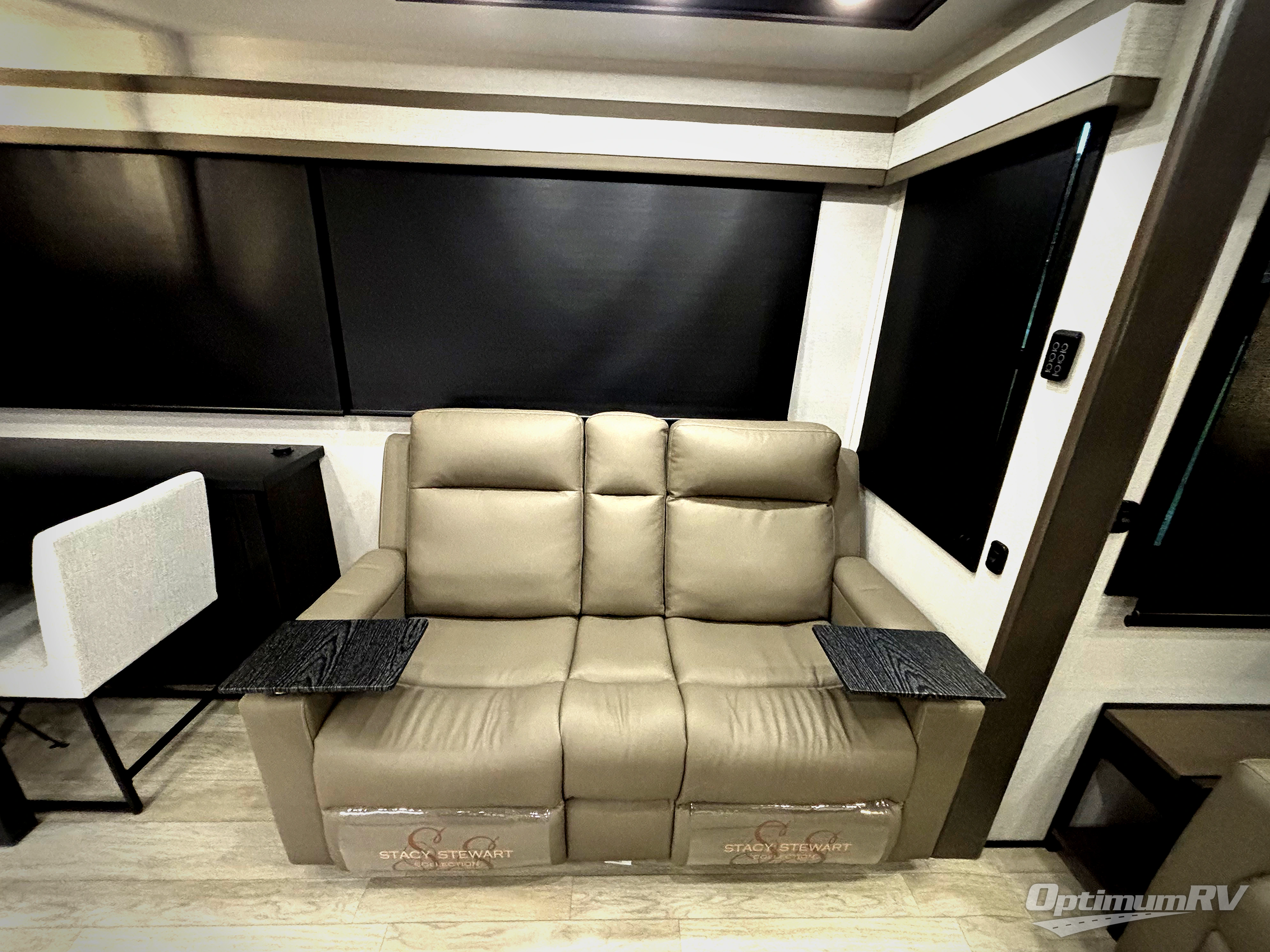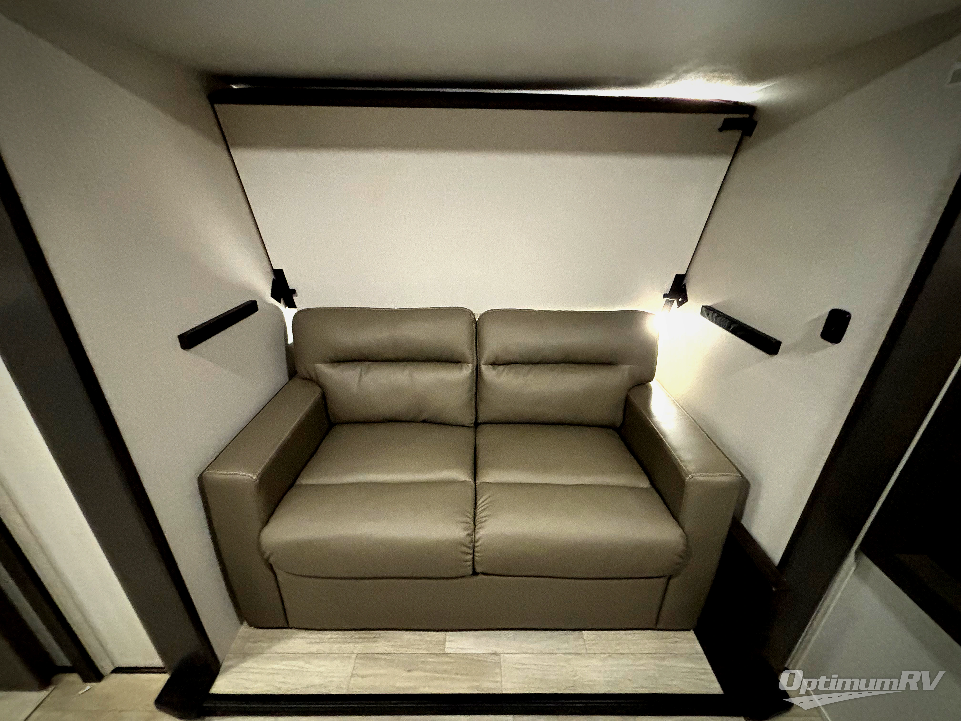 At the front of the unit, the private bedroom offers a retreat with a spacious 72" x 80" king bed, a wardrobe with drawers and a built-in hamper, and a dresser with a TV above, providing ample storage for clothing and essentials. Down the hall, the full bathroom features a 36" x 48" shower with a comfortable seat for added accessibility and relaxation. At the center of the unit, the versatile den serves perfectly as both an office and an additional sleeping area. It includes a 60" tri-fold sofa with a flip-up bunk above, a removable table for work or leisure, and across the room, a 60" x 74" Murphy bed complemented by a desk, shelves, and even a loft above, ideal for accommodating guests or creating a productive workspace on the road. Toward the rear, the open concept living area expands with dual opposing slides for a spacious and inviting atmosphere. One slide features the fully equipped kitchen with a hidden pantry, shelving for dry goods, a convection microwave with a built-in air fryer, a 21-cu. ft. refrigerator, and a 24" range. At the center, the kitchen island includes a sink and a pull-out cutting board, making meal prep both easy and enjoyable. Opposite the kitchen, you’ll find a theater seat and a roll-top dining table perfect for lounging or dining, while at the very back, a 78" sofa provides extra seating or converts into additional sleeping space when needed.