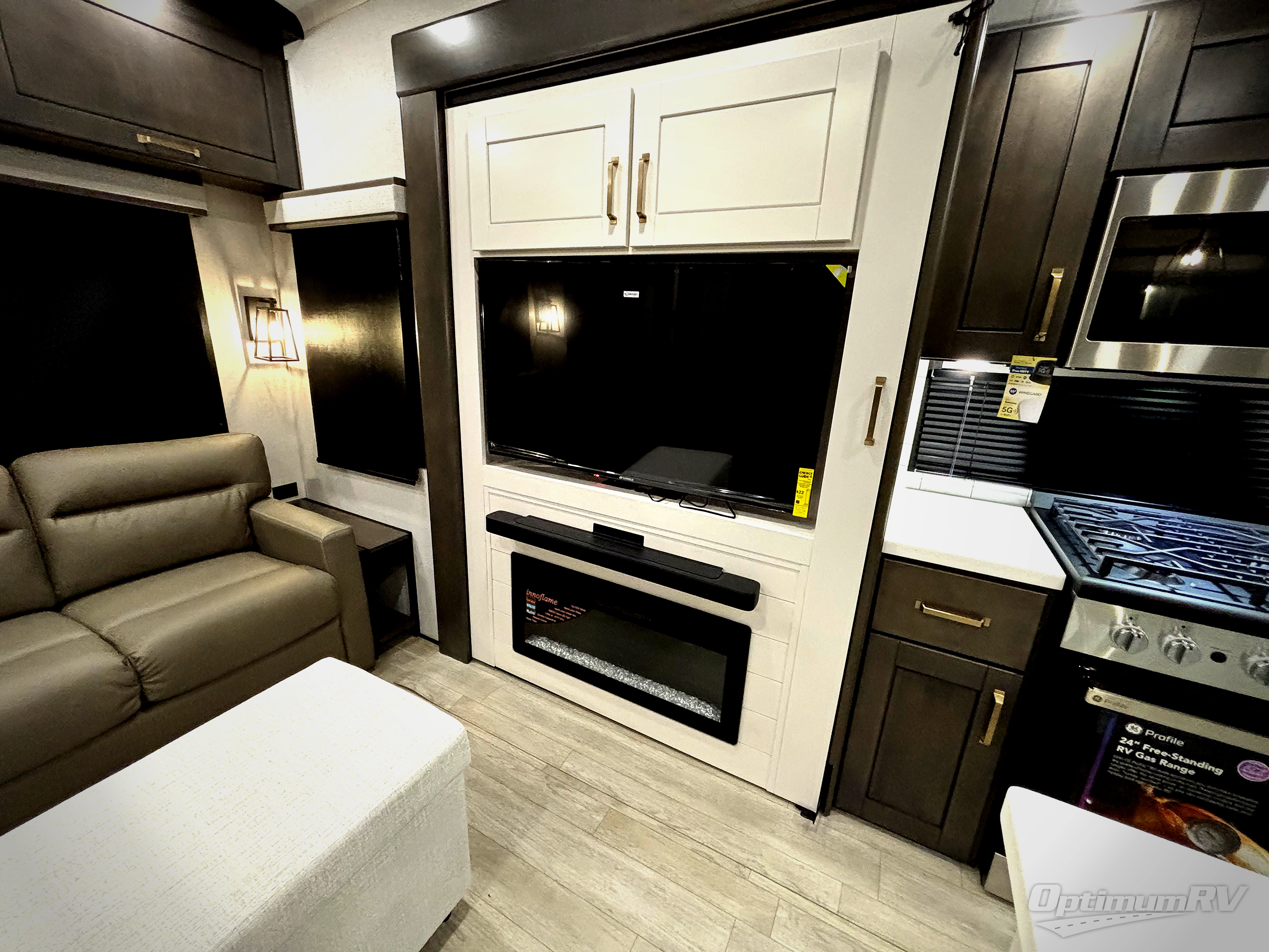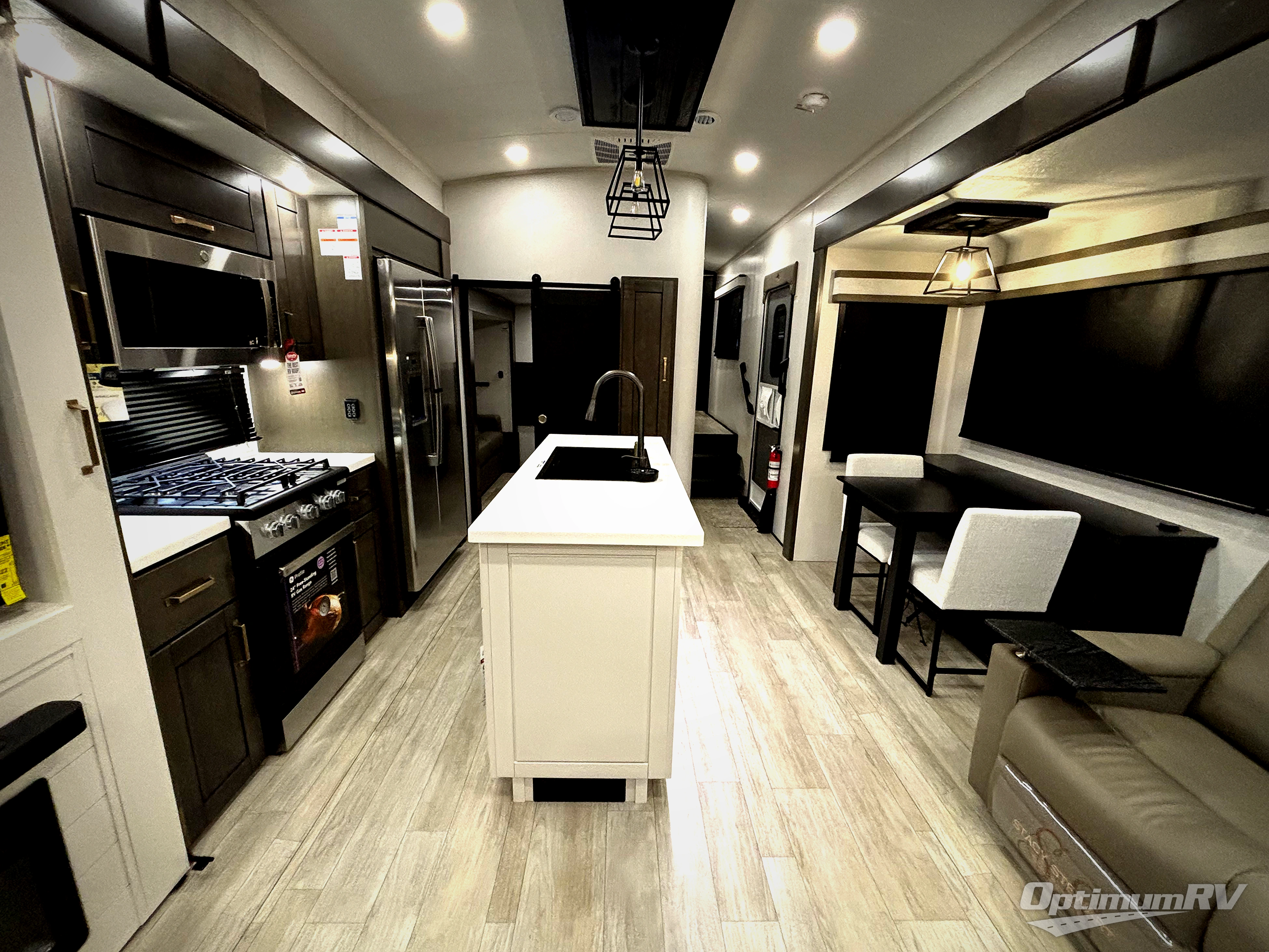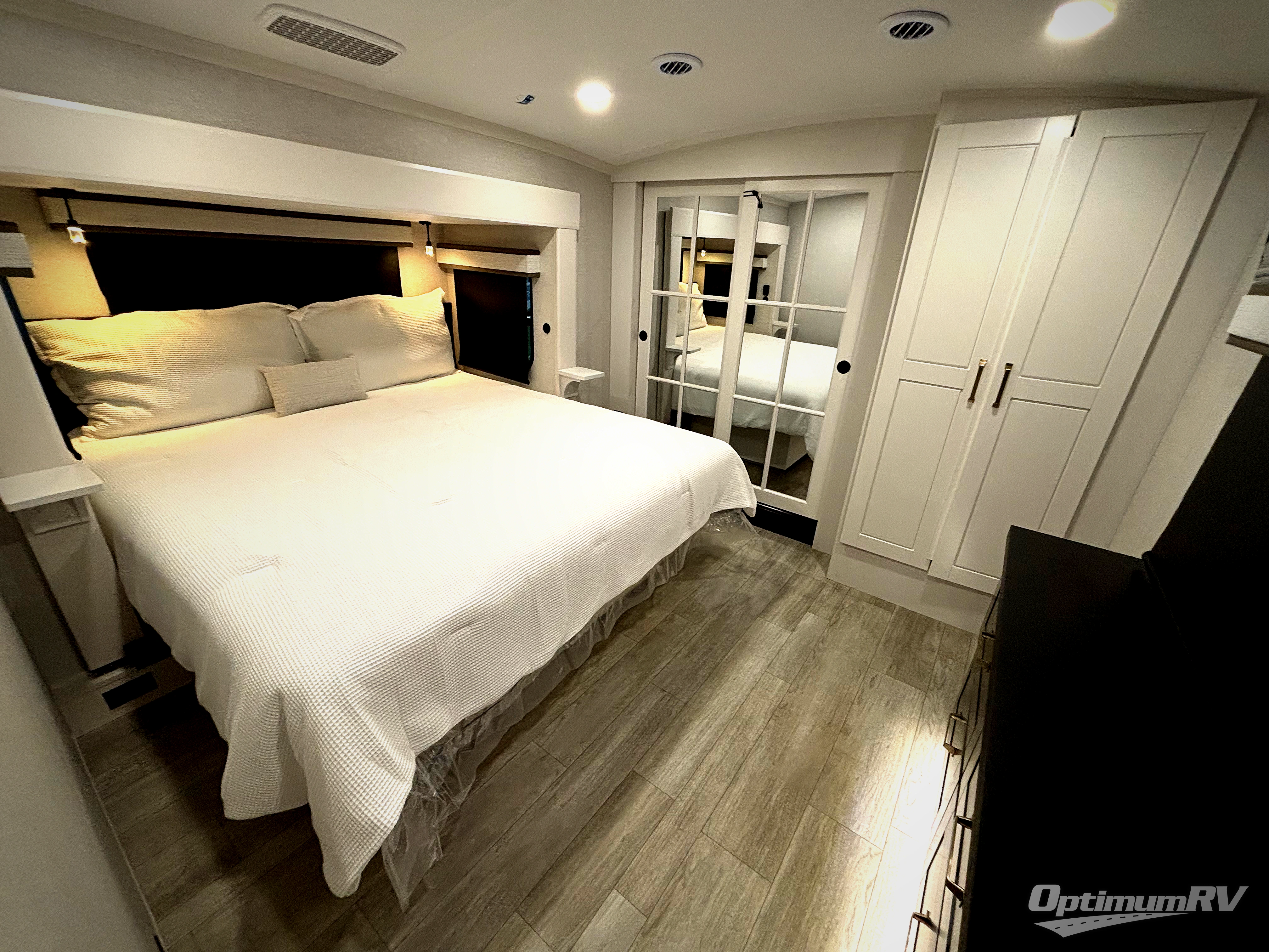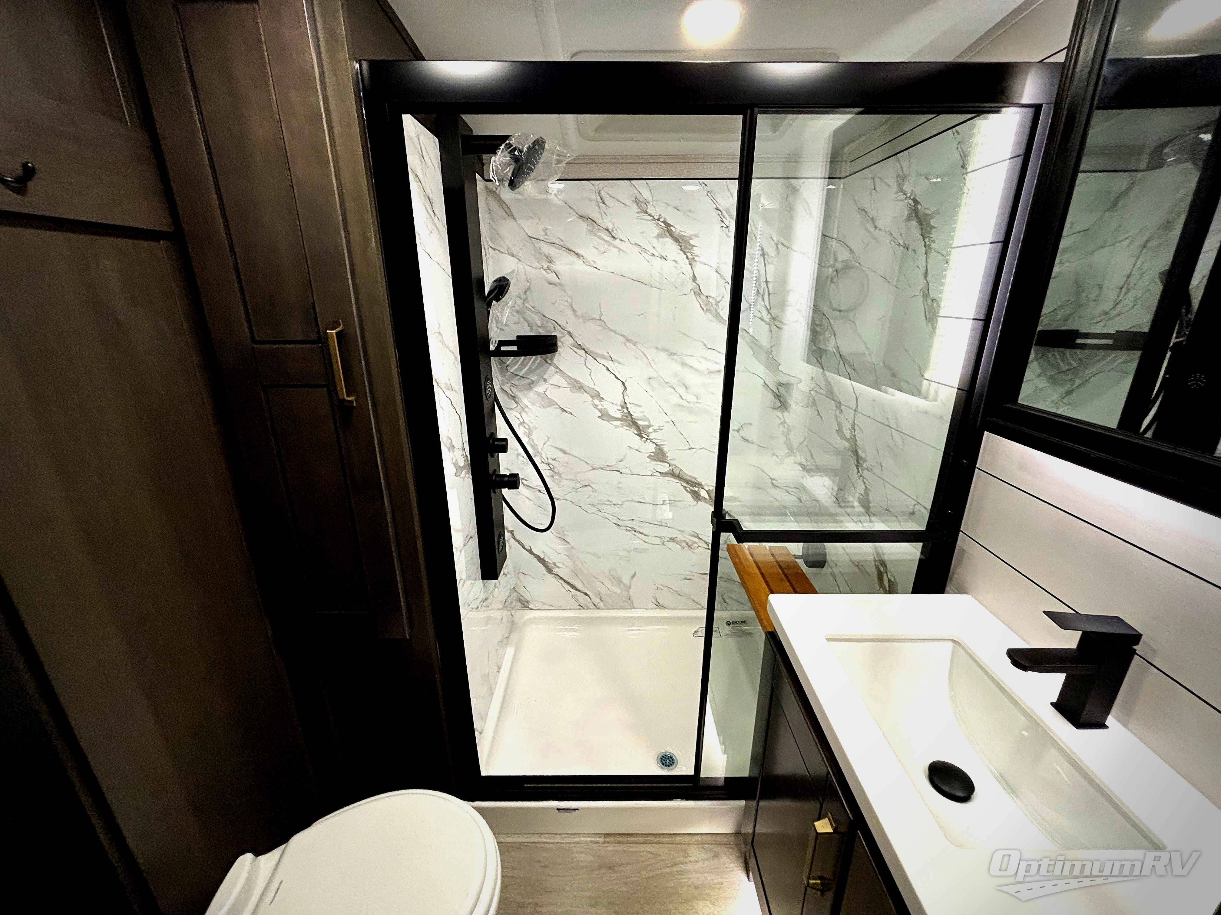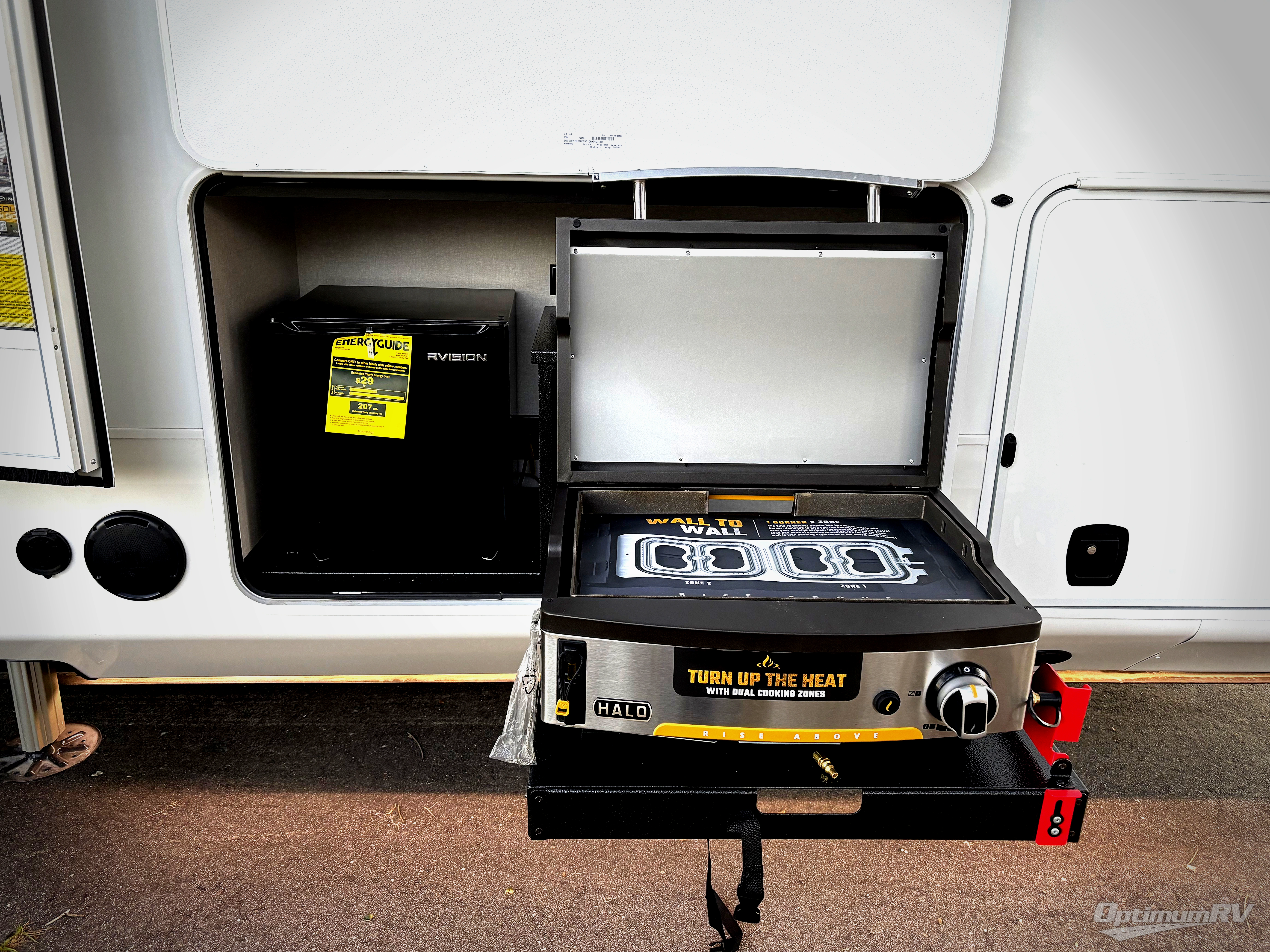 At the front of the unit, the private bedroom offers a retreat with a spacious 72" x 80" king bed, a wardrobe with drawers and a built-in hamper, and a dresser with a TV above, providing ample storage for clothing and essentials. Down the hall, the full bathroom features a 36" x 48" shower with a comfortable seat for added accessibility and relaxation. At the center of the unit, the versatile den serves perfectly as both an office and an additional sleeping area. It includes a 60" tri-fold sofa with a flip-up bunk above, a removable table for work or leisure, and across the room, a 60" x 74" Murphy bed complemented by a desk, shelves, and even a loft above, ideal for accommodating guests or creating a productive workspace on the road. Toward the rear, the open concept living area expands with dual opposing slides for a spacious and inviting atmosphere. One slide features the fully equipped kitchen with a hidden pantry, shelving for dry goods, a convection microwave with a built-in air fryer, a 21-cu. ft. refrigerator, and a 24" range. At the center, the kitchen island includes a sink and a pull-out cutting board, making meal prep both easy and enjoyable. Opposite the kitchen, you’ll find a theater seat and a roll-top dining table perfect for lounging or dining, while at the very back, a 78" sofa provides extra seating or converts into additional sleeping space when needed.
