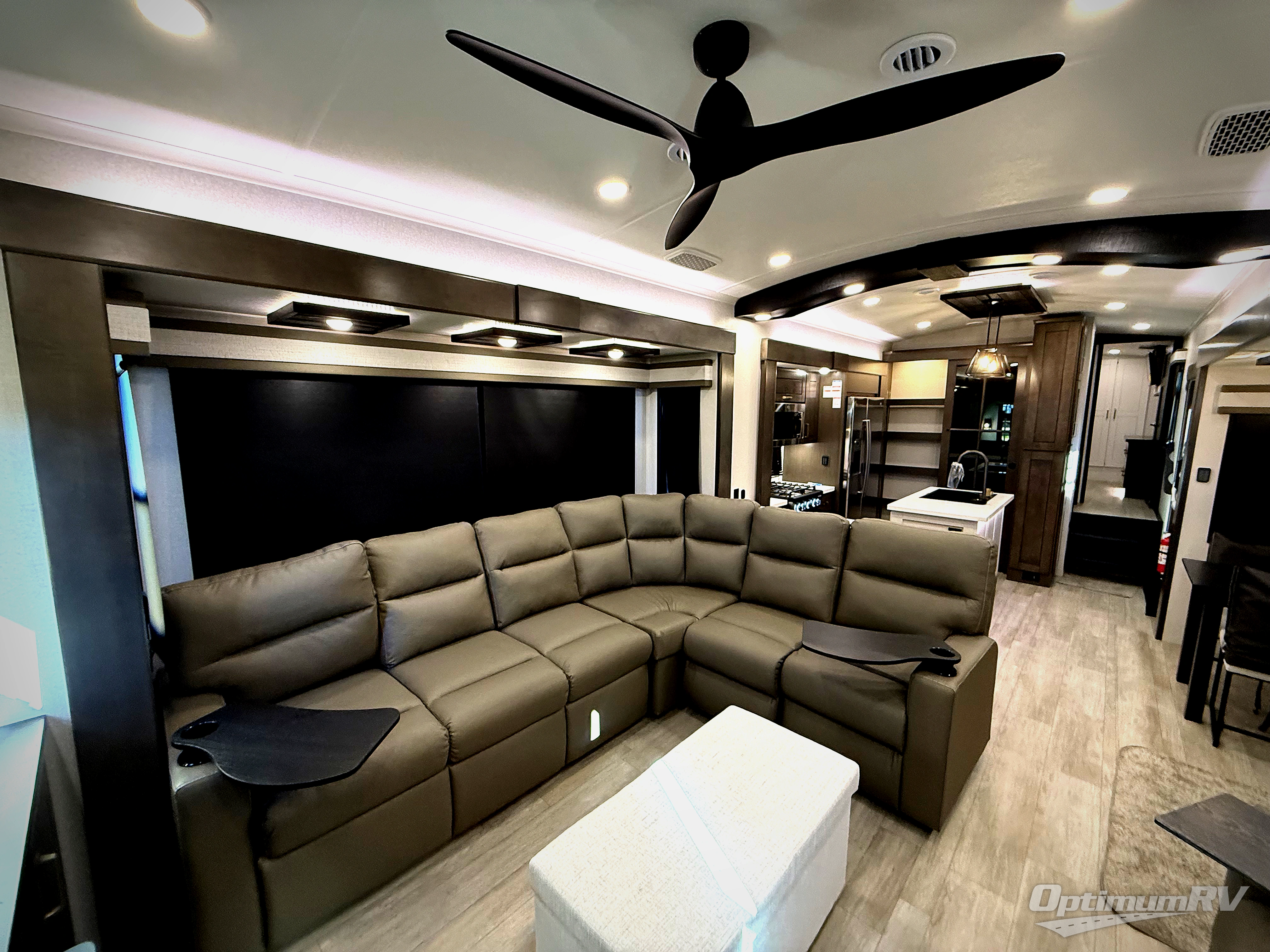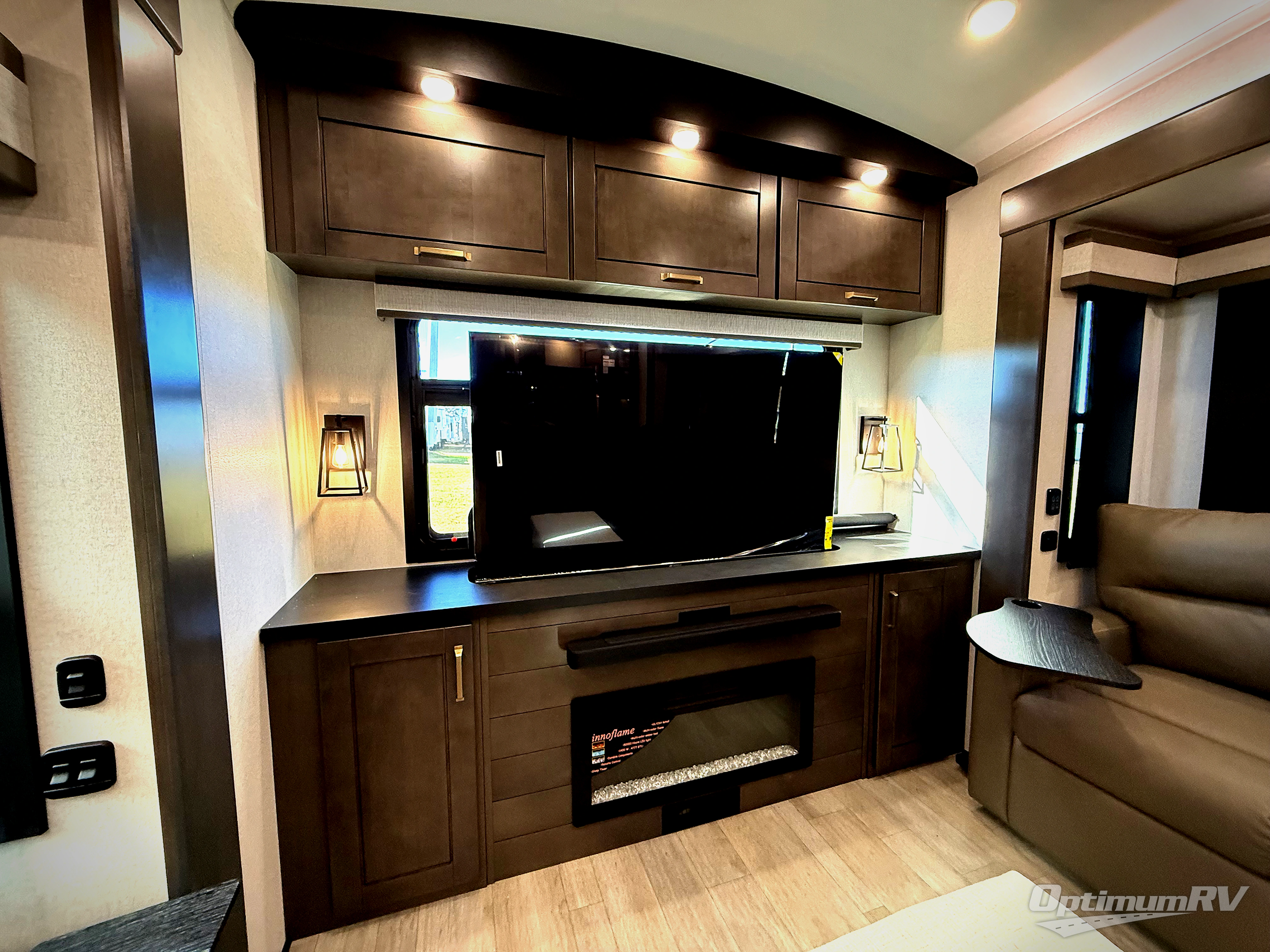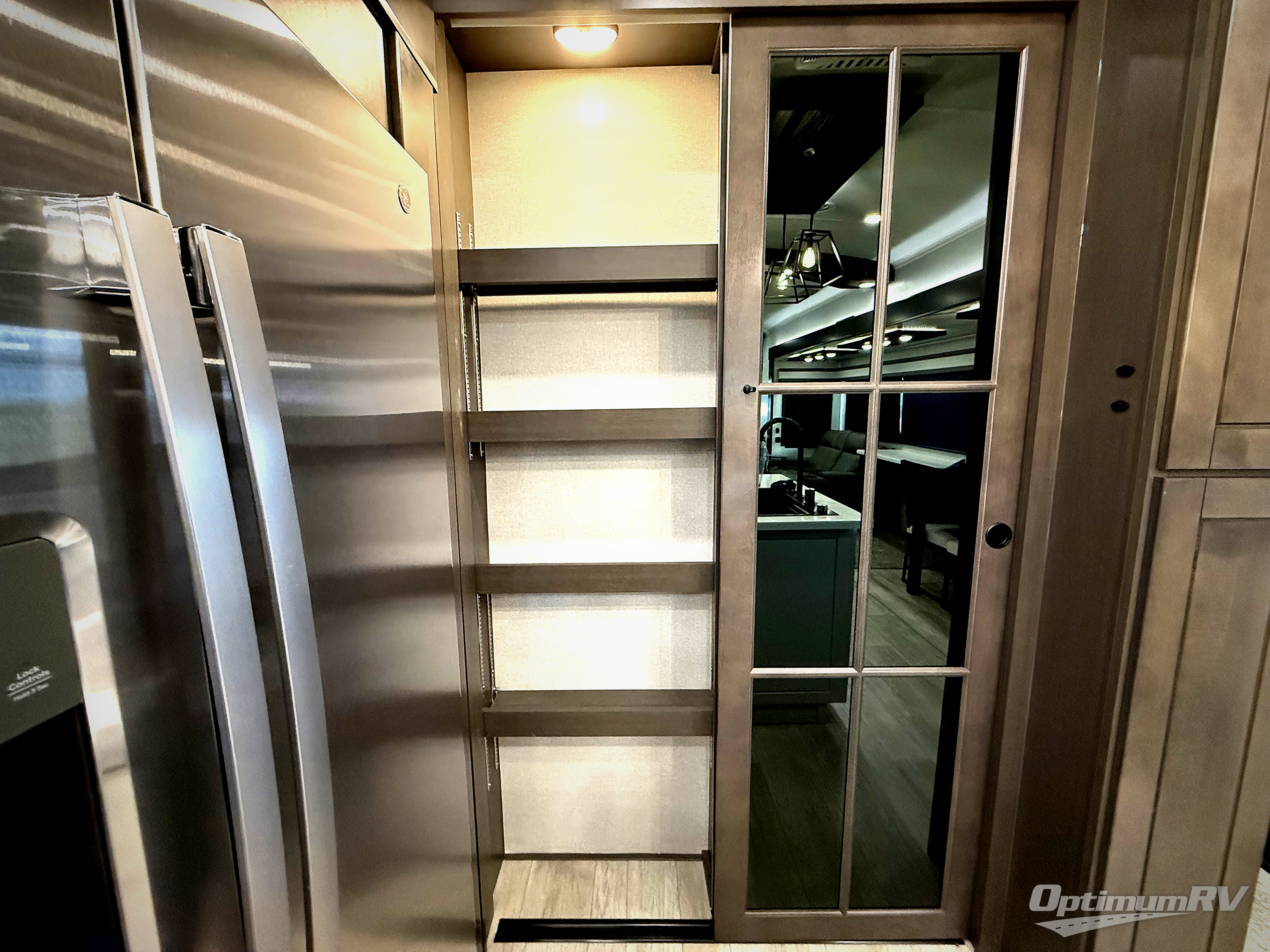 At the front of this 38RE layout, you’ll find a private bedroom featuring a spacious 72" x 80" king bed slide-out, creating a comfortable retreat to rest and recharge. The room also includes a wardrobe and dresser with a TV above, providing ample storage for clothing and essentials. Moving down the hall, the full bathroom offers both comfort and convenience with its 36" x 48" shower complete with a built-in seat for accessibility, plus linen shelves for added storage. At the heart of the unit, the kitchen is thoughtfully designed with everything needed to cook in comfort, including a pantry, a pull-out cutting board in the island, and a 21-cu. ft. refrigerator. Meal preparation is a breeze with the 24" range or the convection microwave featuring a built-in air fryer. Across from the kitchen, the large slide-out hosts a roll-out table perfect for dining or game nights, as well as a desk/coffee bar and cozy theater seating. At the rear, the entertainment center stands out with a TV lift and fireplace, while the L-shaped lounge and additional theater seat create the ultimate space to relax and enjoy movie nights in style.