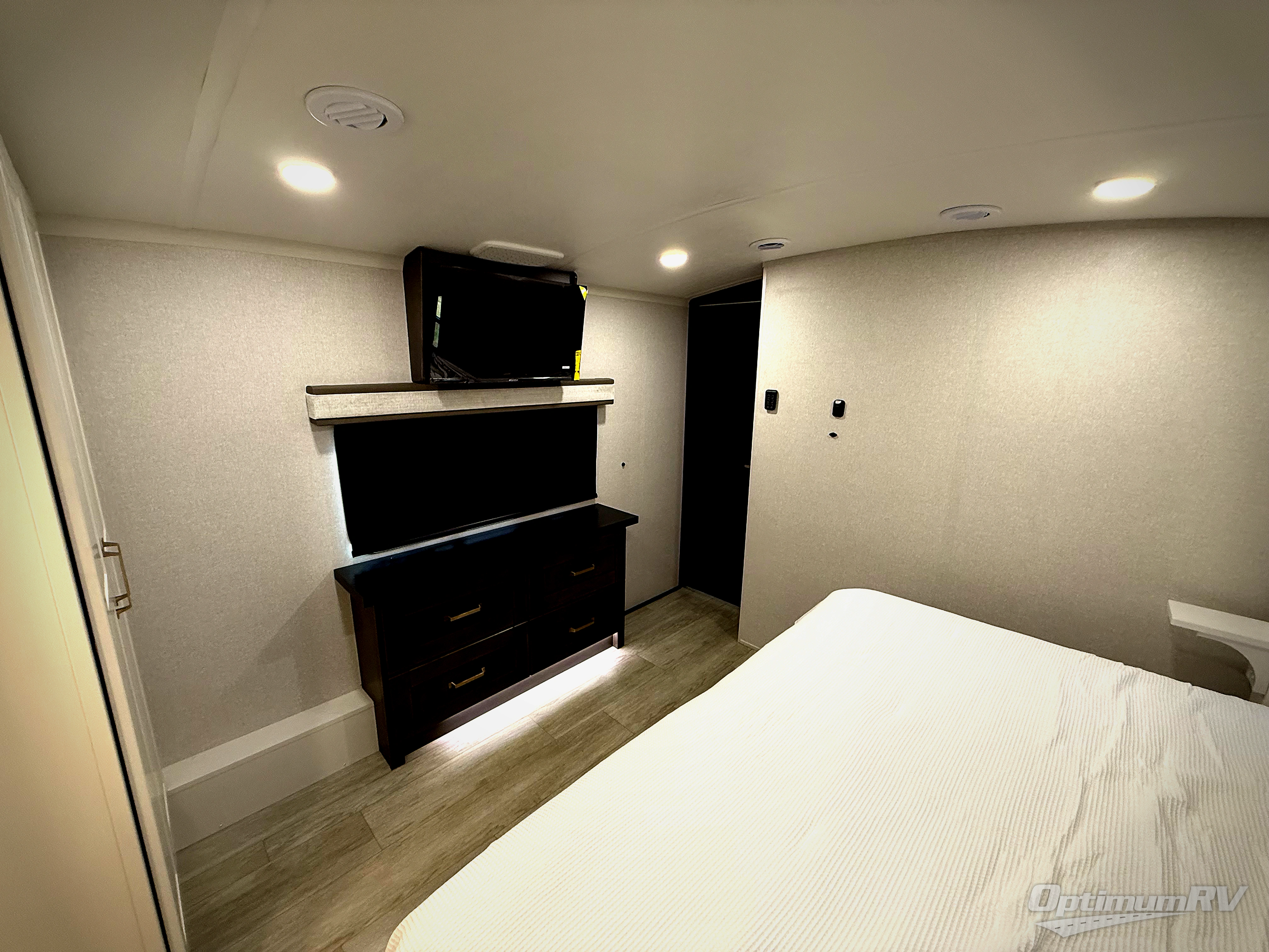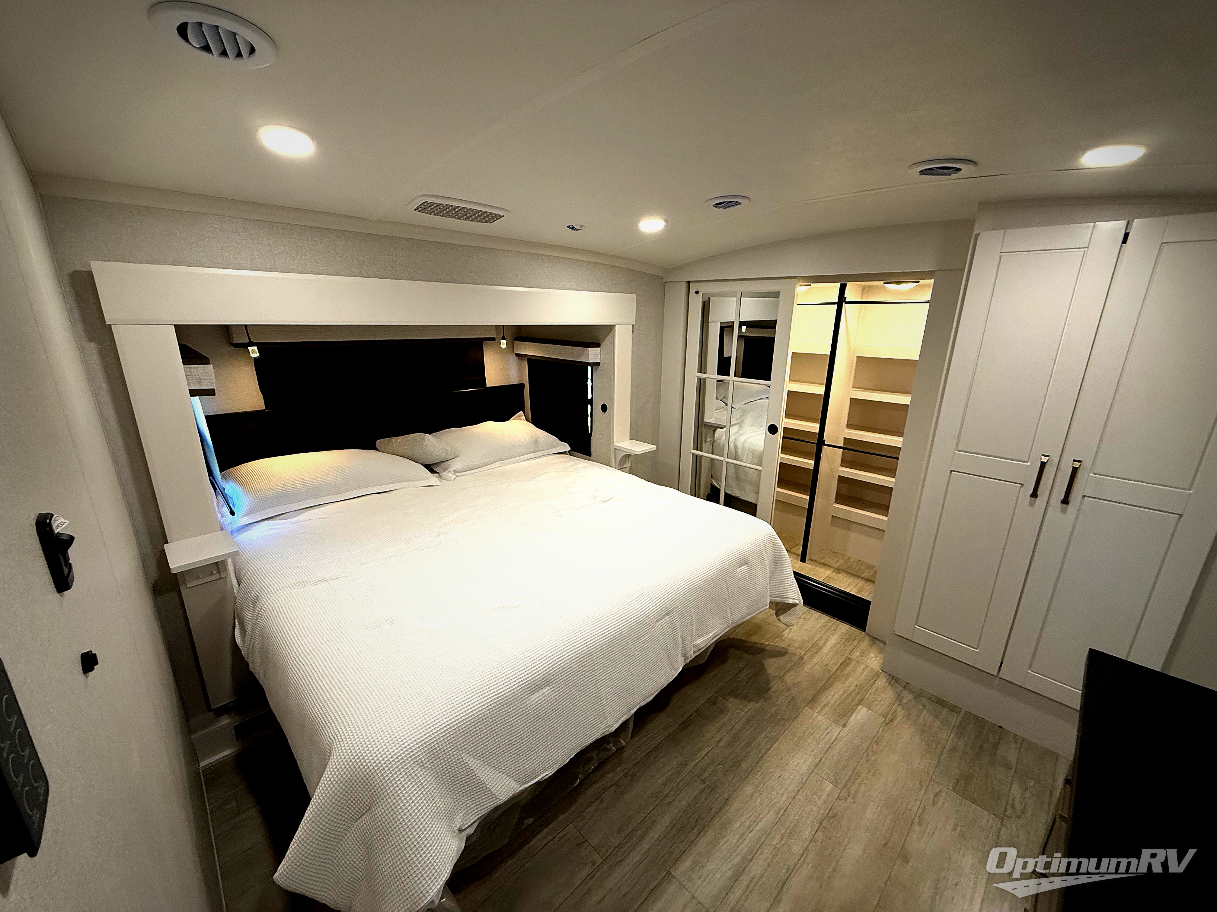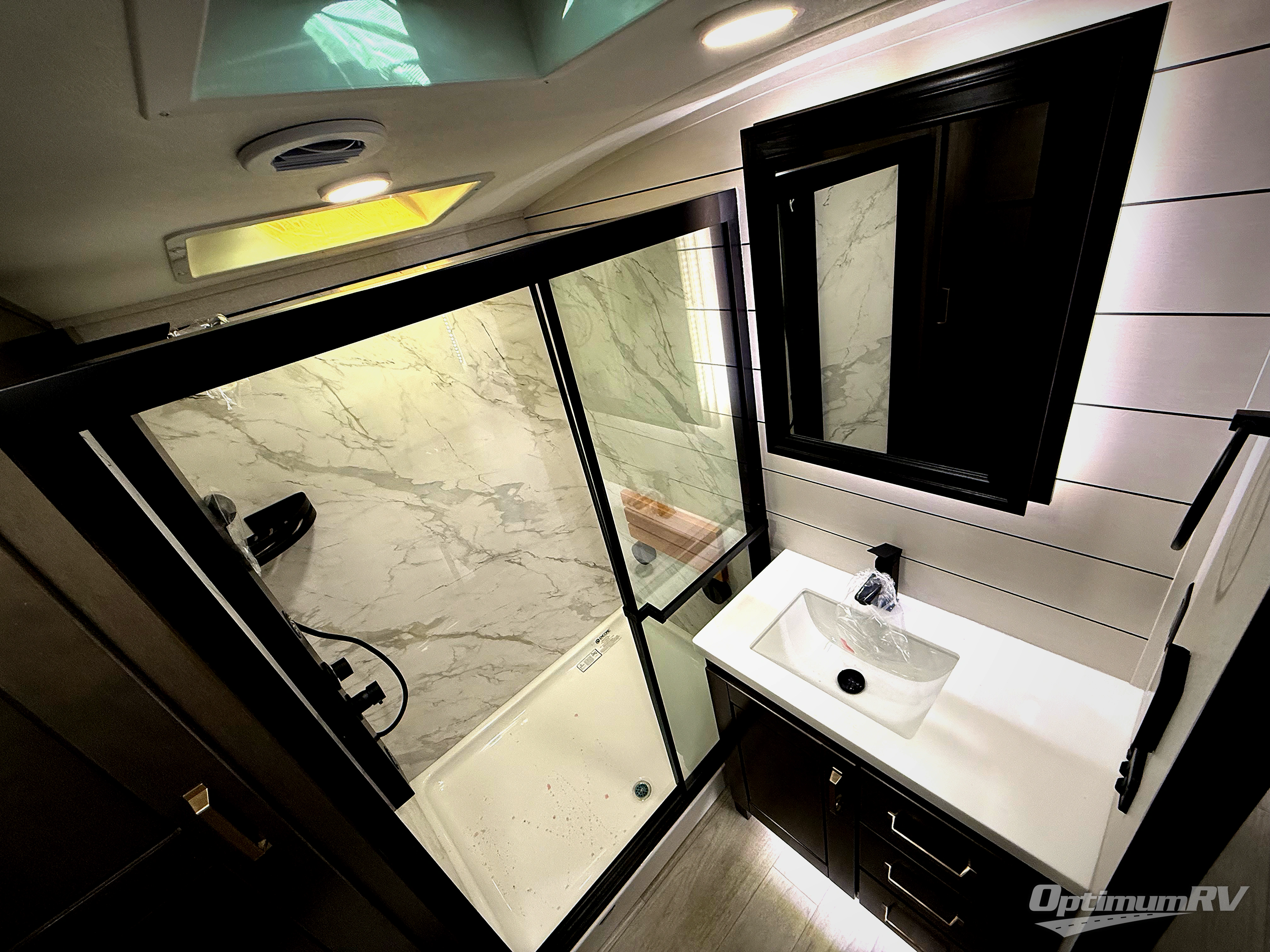 At the front of this 38RE layout, you’ll find a private bedroom featuring a spacious 72" x 80" king bed slide-out, creating a comfortable retreat to rest and recharge. The room also includes a wardrobe and dresser with a TV above, providing ample storage for clothing and essentials. Moving down the hall, the full bathroom offers both comfort and convenience with its 36" x 48" shower complete with a built-in seat for accessibility, plus linen shelves for added storage. At the heart of the unit, the kitchen is thoughtfully designed with everything needed to cook in comfort, including a pantry, a pull-out cutting board in the island, and a 21-cu. ft. refrigerator. Meal preparation is a breeze with the 24" range or the convection microwave featuring a built-in air fryer. Across from the kitchen, the large slide-out hosts a roll-out table perfect for dining or game nights, as well as a desk/coffee bar and cozy theater seating. At the rear, the entertainment center stands out with a TV lift and fireplace, while the L-shaped lounge and additional theater seat create the ultimate space to relax and enjoy movie nights in style.