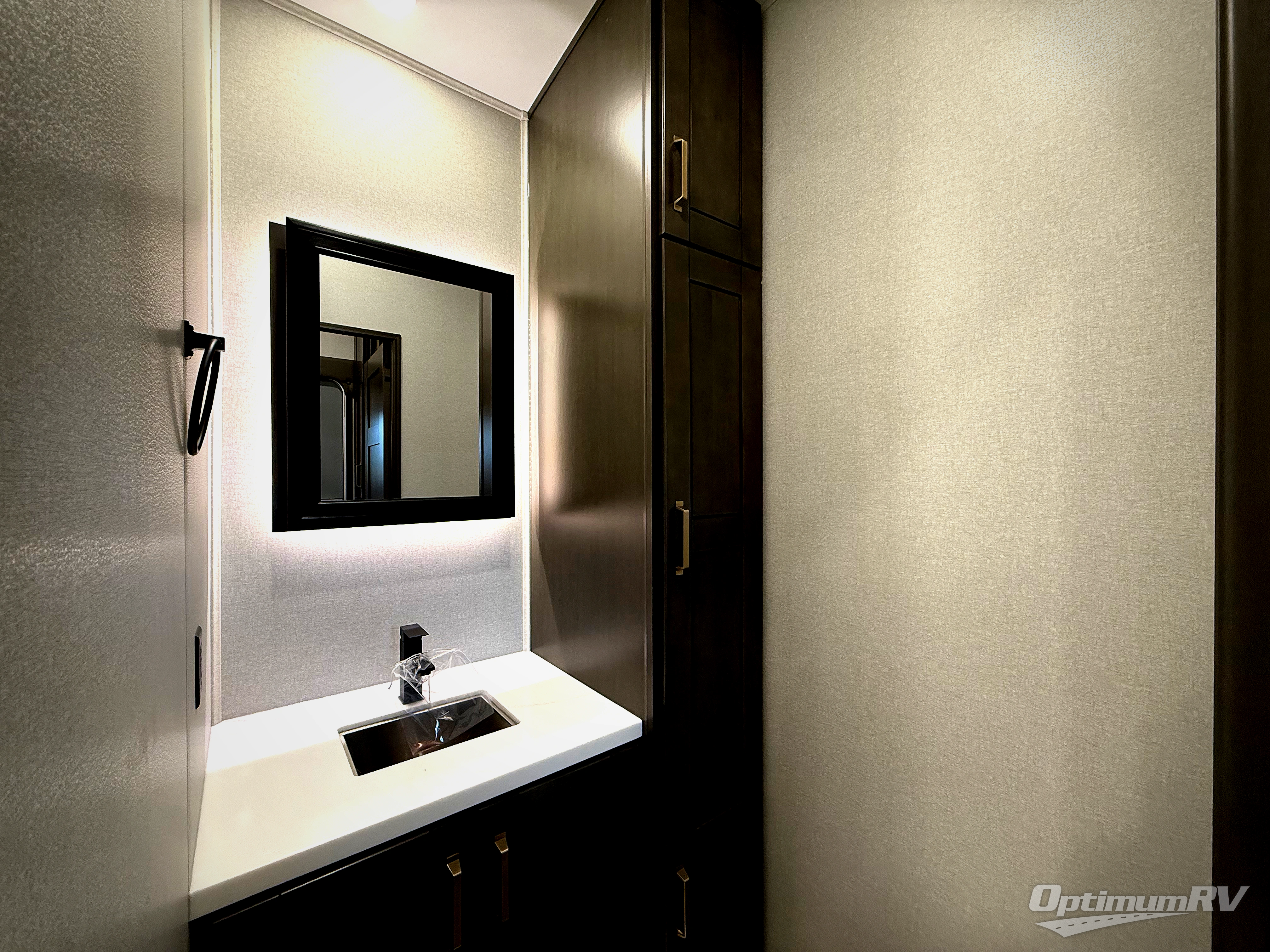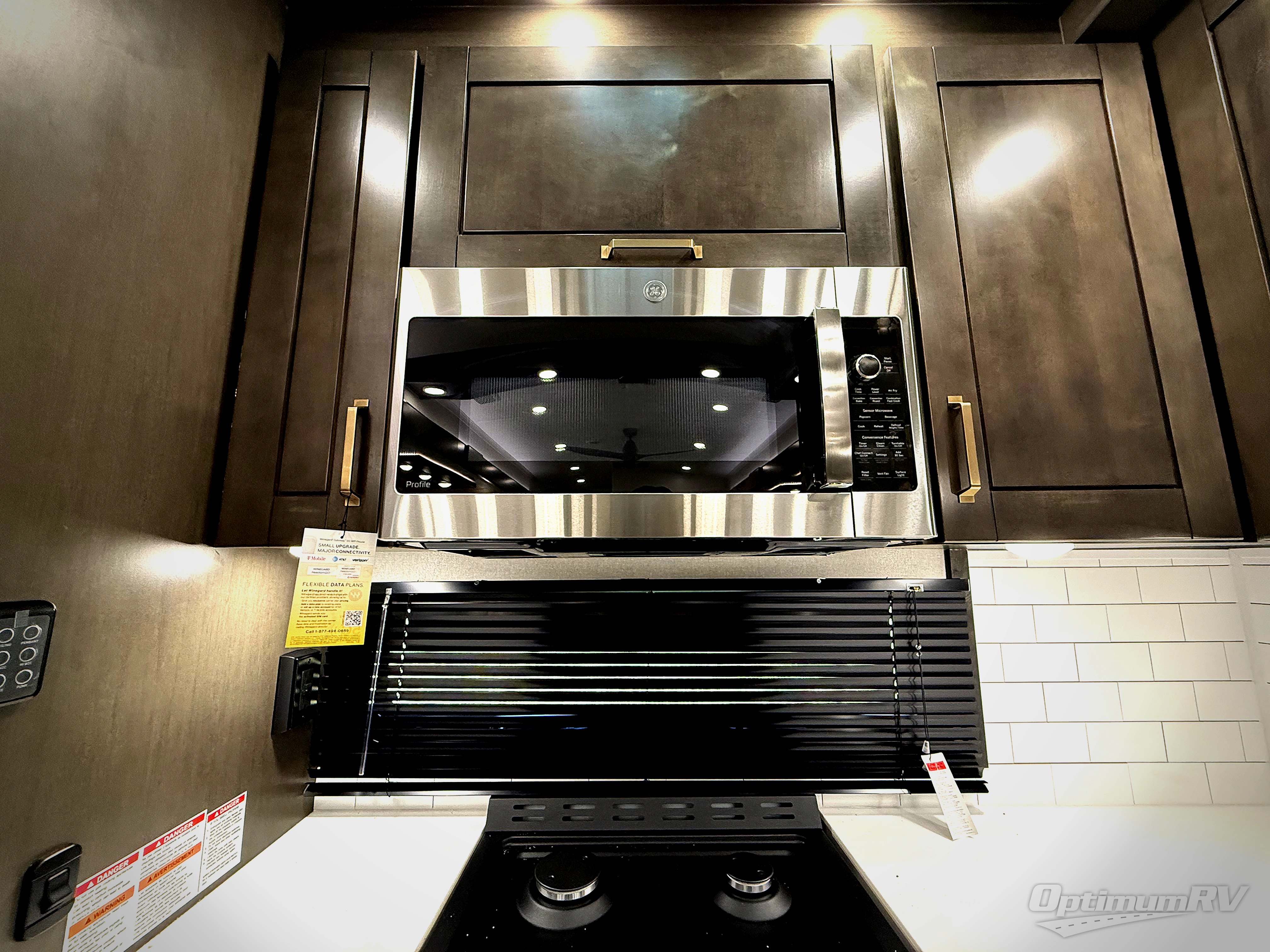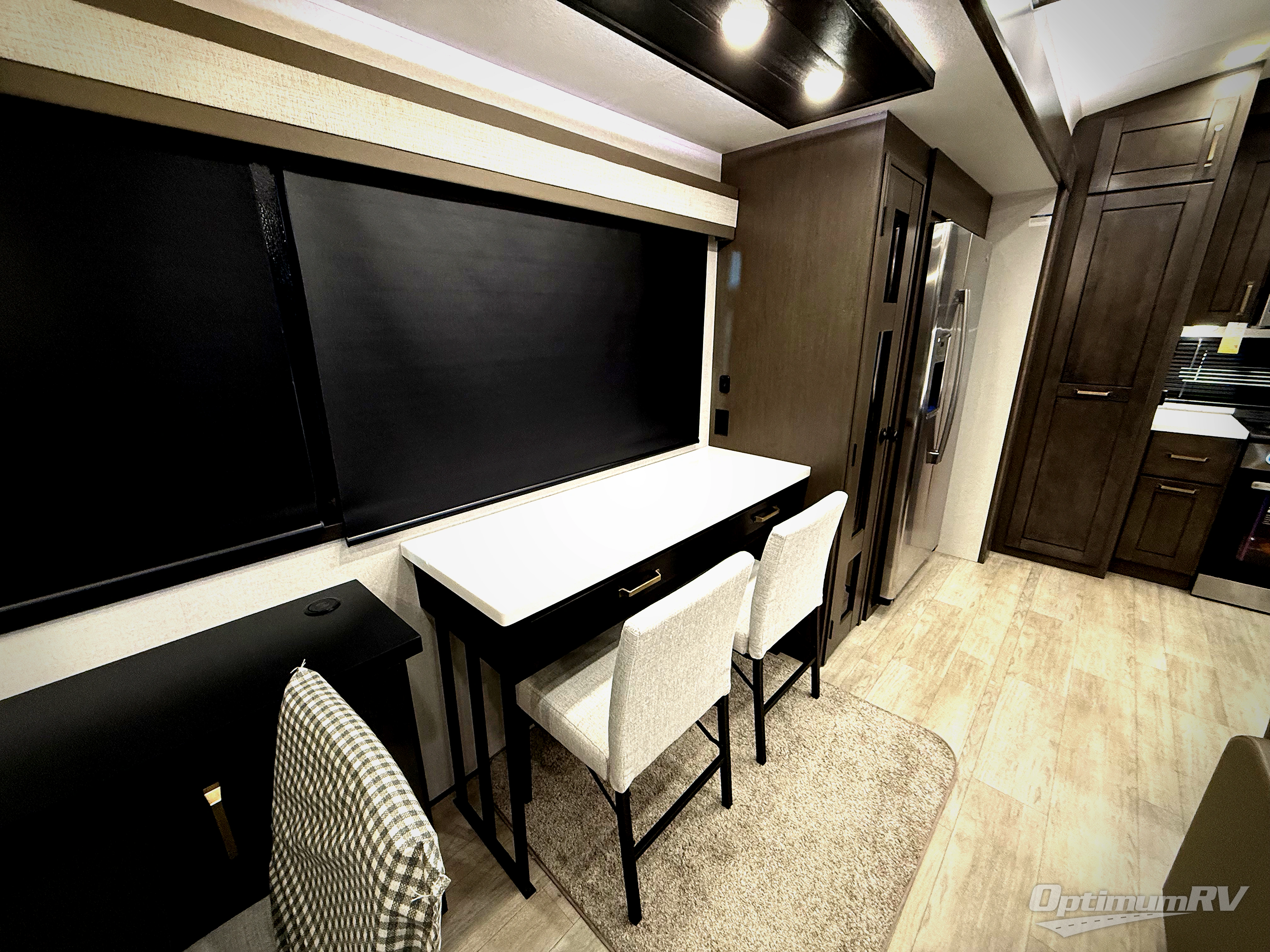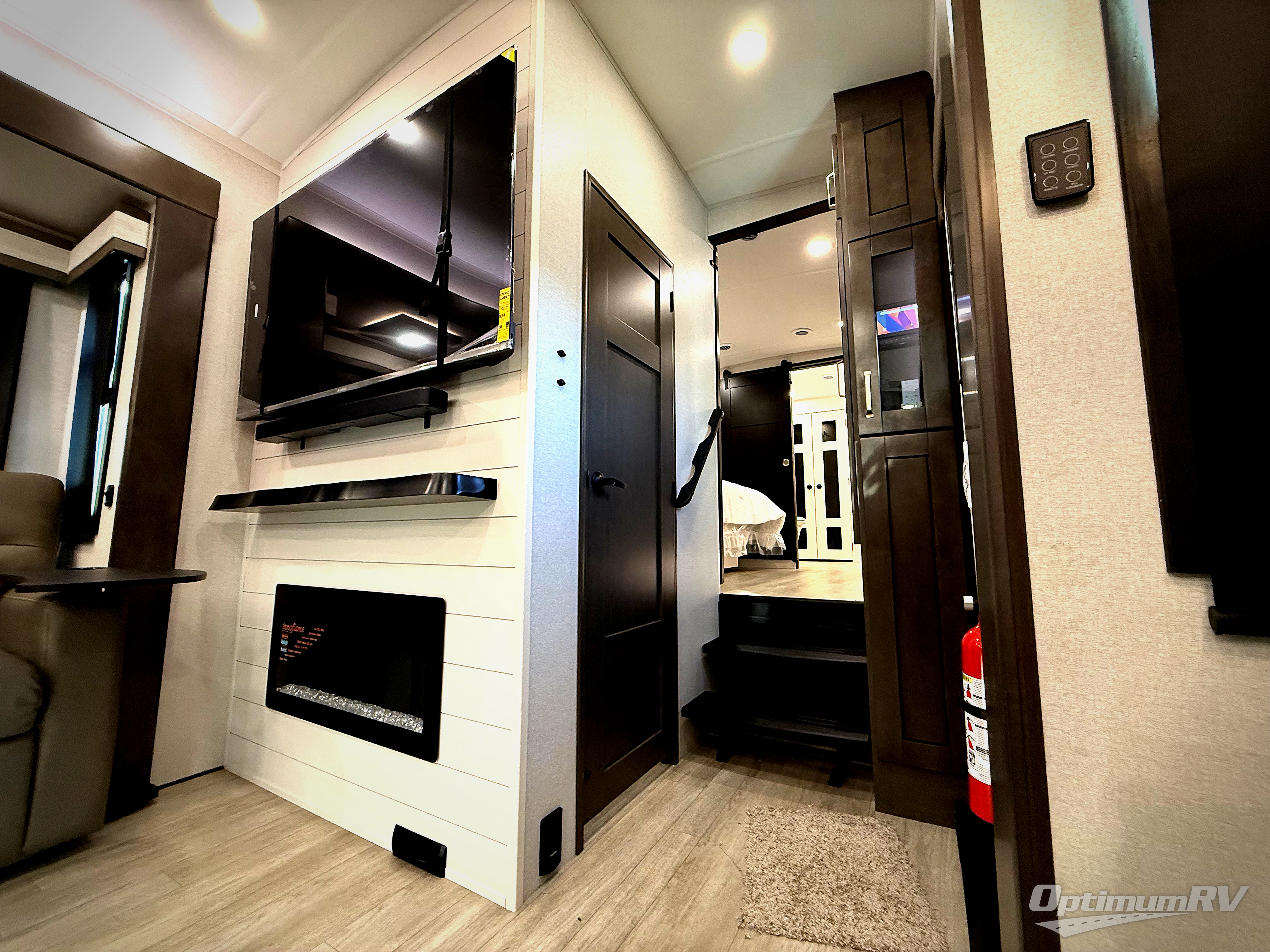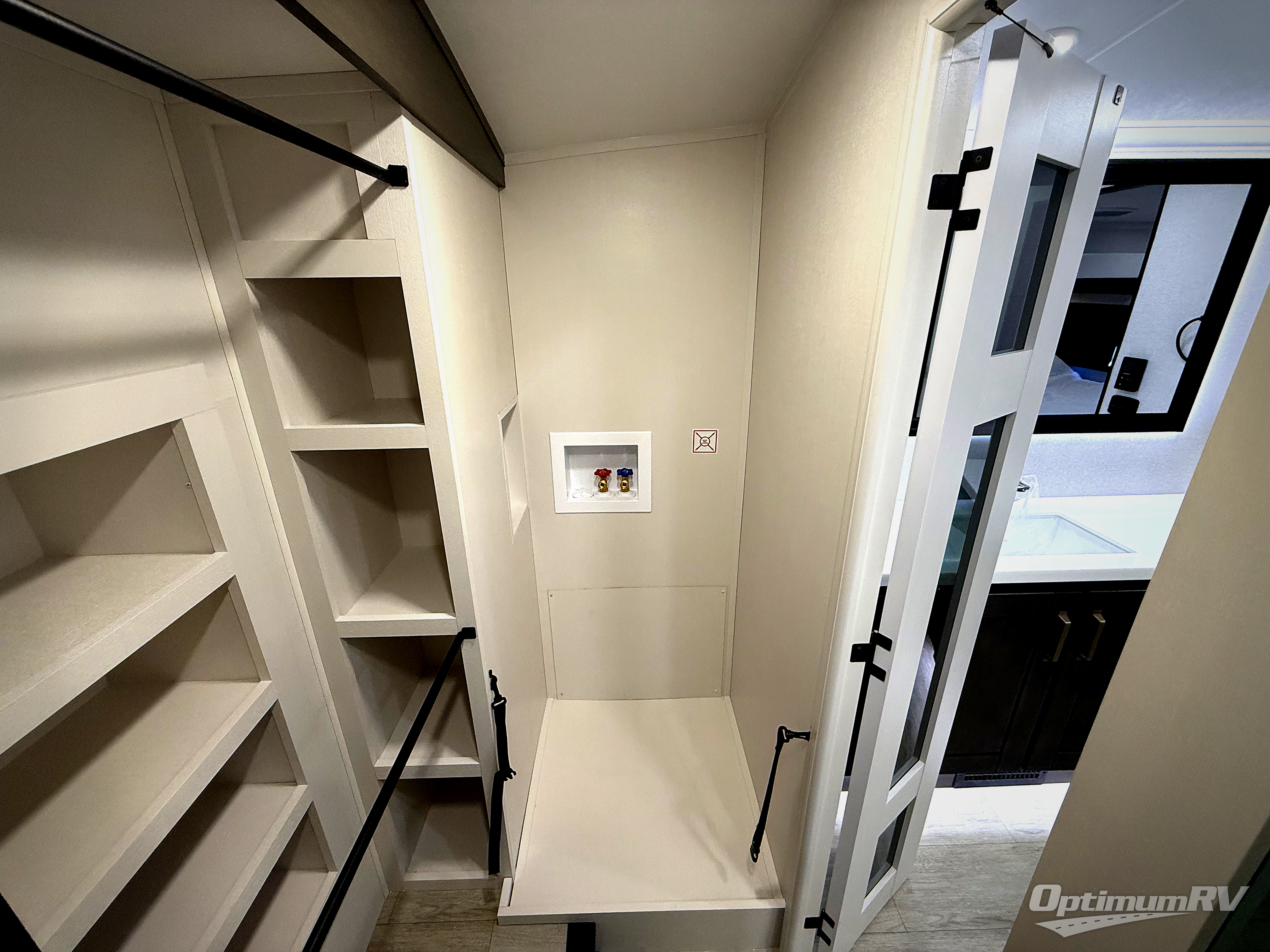Starting from the back, this impressive 39RK features a rear kitchen designed in a convenient U-shape for easy accessibility and efficient meal prep. The kitchen is fully equipped with plenty of overhead cabinets, a convection microwave with an air fryer, a 24" range, and a pull-out pantry, perfect for the chef on the trip to cook in comfort. Across the kitchen, the large slide-out houses a 21-cu. ft. refrigerator and a second pantry with shelves, providing even more space to store groceries, snacks, and coffee essentials. The nearby desk/coffee bar and roll-out table create an inviting area to enjoy meals or unwind with a cup of coffee. The living area offers a spacious 100" L-shaped sofa and a theater seat facing the TV and fireplace, making it an ideal spot for relaxing or hosting movie nights. Moving forward, you’ll find a convenient half bathroom with linen shelves for added storage and accessibility. At the front, the private bedroom features a 72" x 80" king bed in a slide-out with a dresser across for ample storage. Finally, the full bathroom at the very front includes a 30" x 61" shower with a seat for comfort, a large sink, and a walk-in closet that provides generous space for all your clothing and gear.