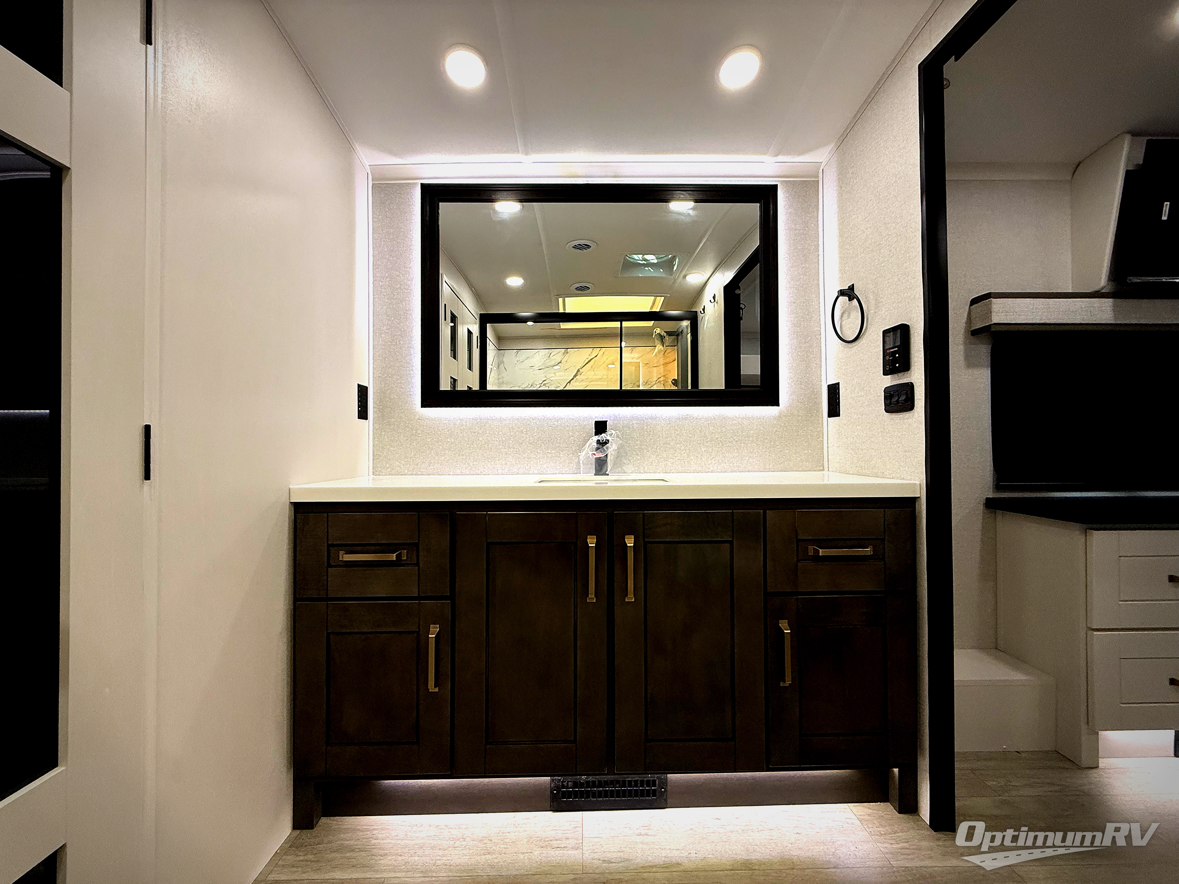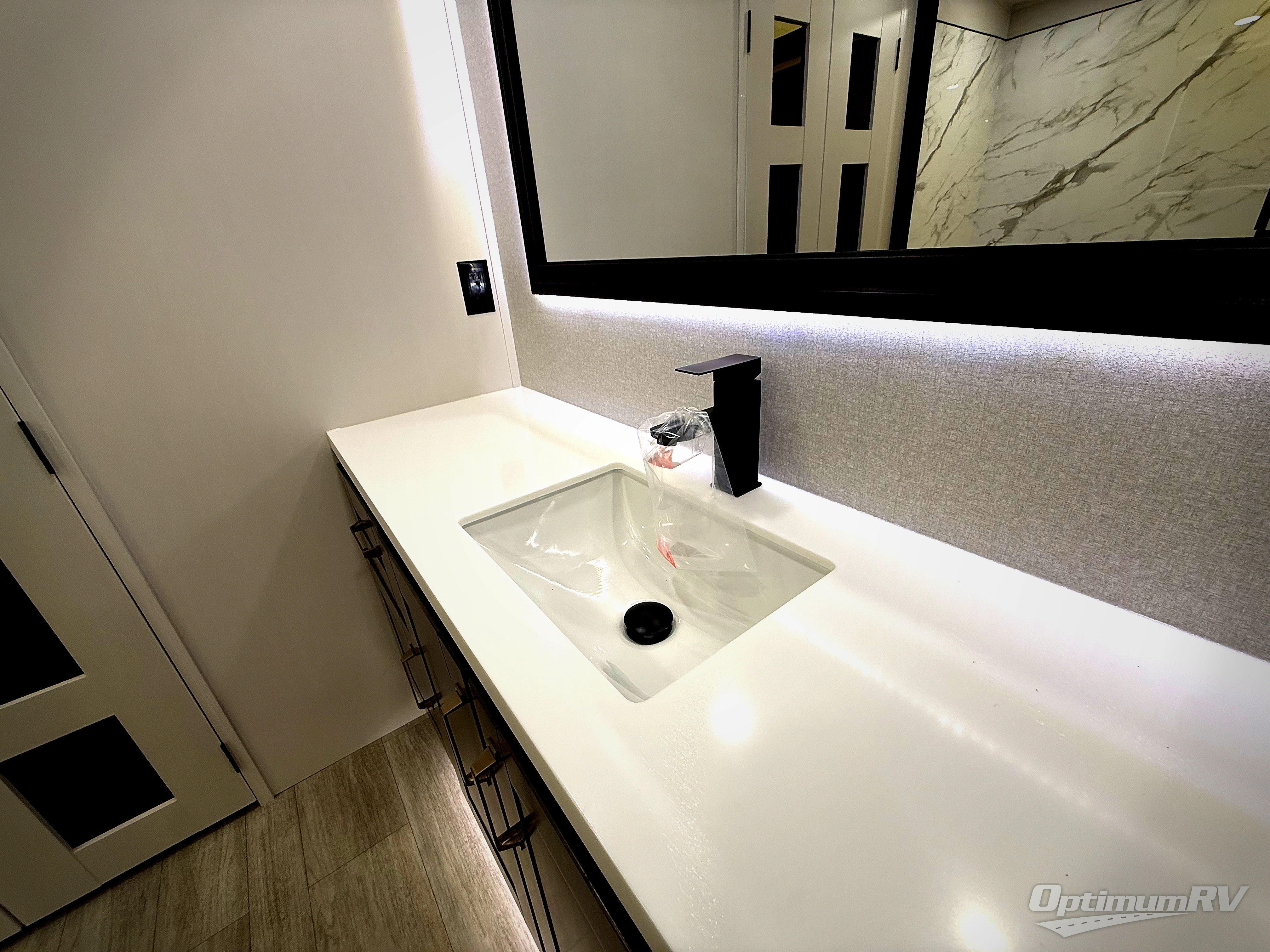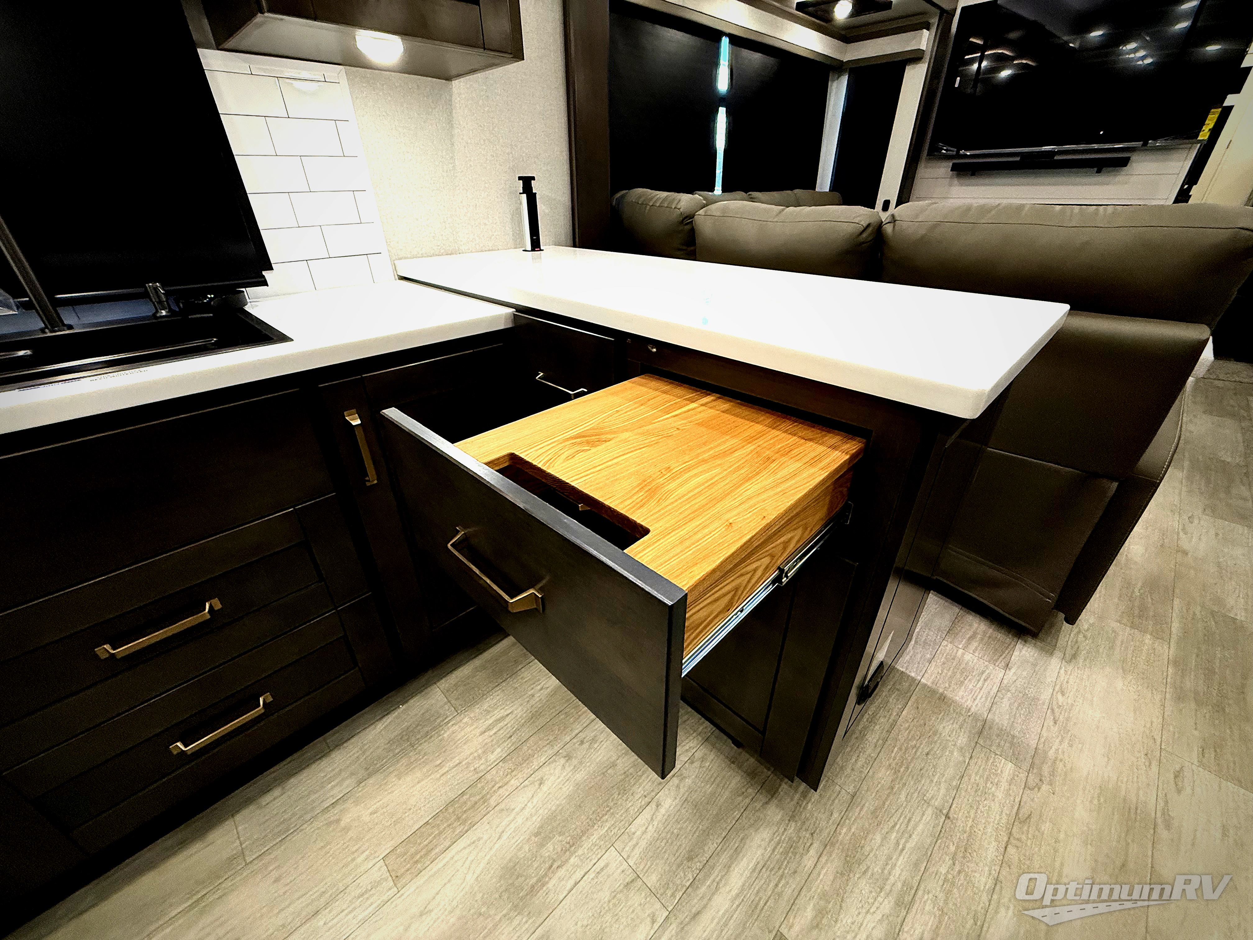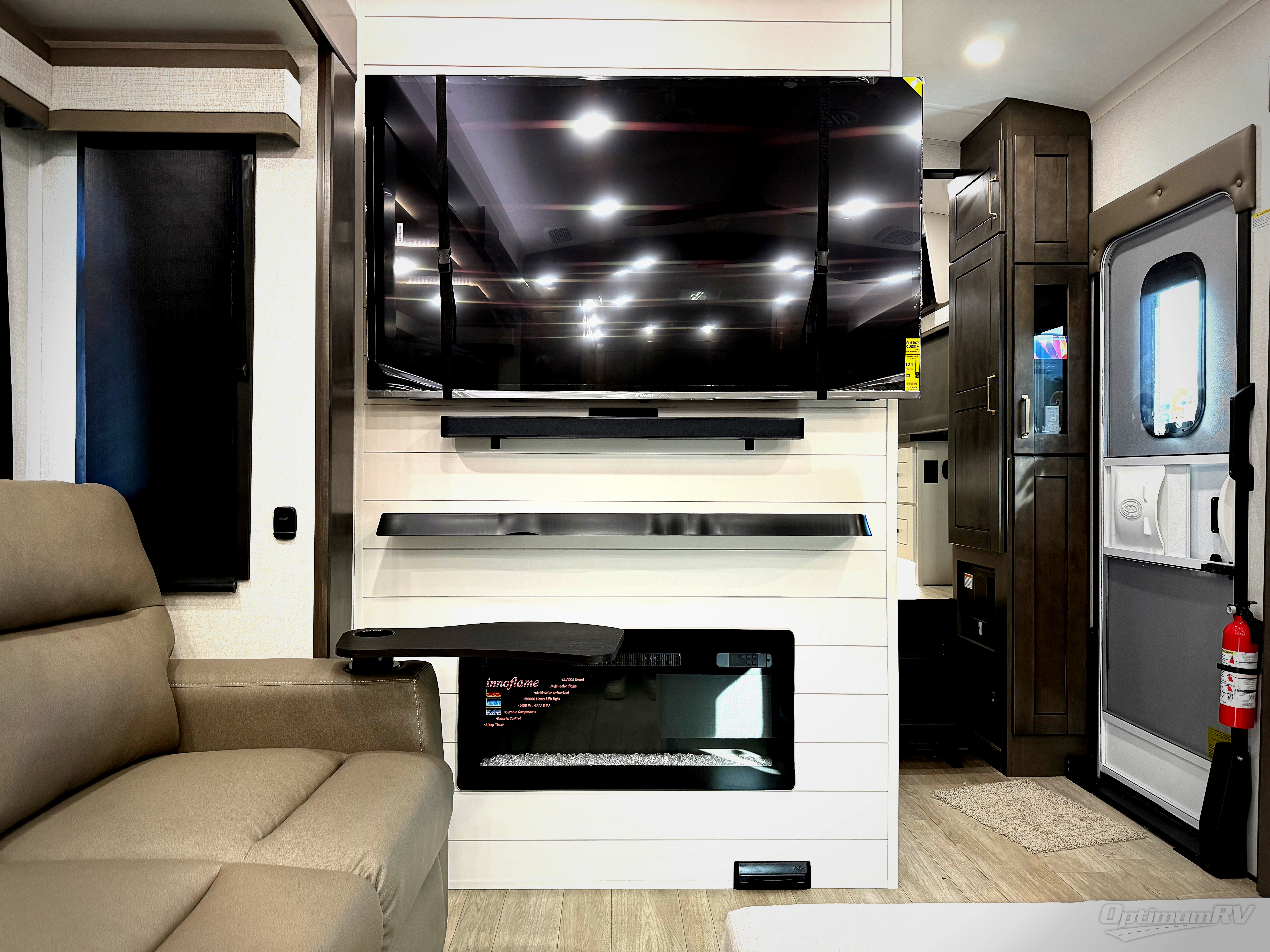 Starting from the back, this impressive 39RK features a rear kitchen designed in a convenient U-shape for easy accessibility and efficient meal prep. The kitchen is fully equipped with plenty of overhead cabinets, a convection microwave with an air fryer, a 24" range, and a pull-out pantry, perfect for the chef on the trip to cook in comfort. Across the kitchen, the large slide-out houses a 21-cu. ft. refrigerator and a second pantry with shelves, providing even more space to store groceries, snacks, and coffee essentials. The nearby desk/coffee bar and roll-out table create an inviting area to enjoy meals or unwind with a cup of coffee. The living area offers a spacious 100" L-shaped sofa and a theater seat facing the TV and fireplace, making it an ideal spot for relaxing or hosting movie nights. Moving forward, you’ll find a convenient half bathroom with linen shelves for added storage and accessibility. At the front, the private bedroom features a 72" x 80" king bed in a slide-out with a dresser across for ample storage. Finally, the full bathroom at the very front includes a 30" x 61" shower with a seat for comfort, a large sink, and a walk-in closet that provides generous space for all your clothing and gear.