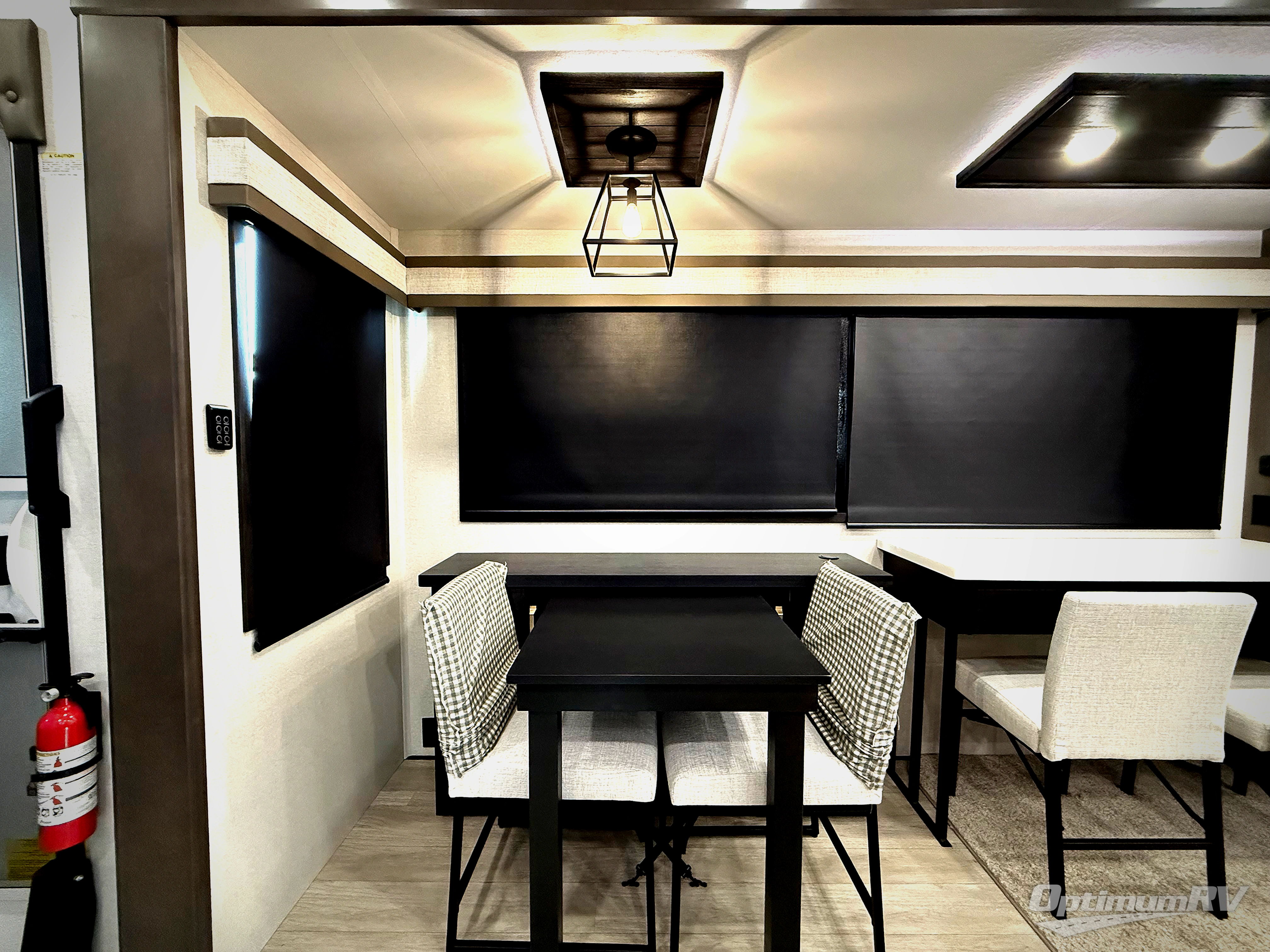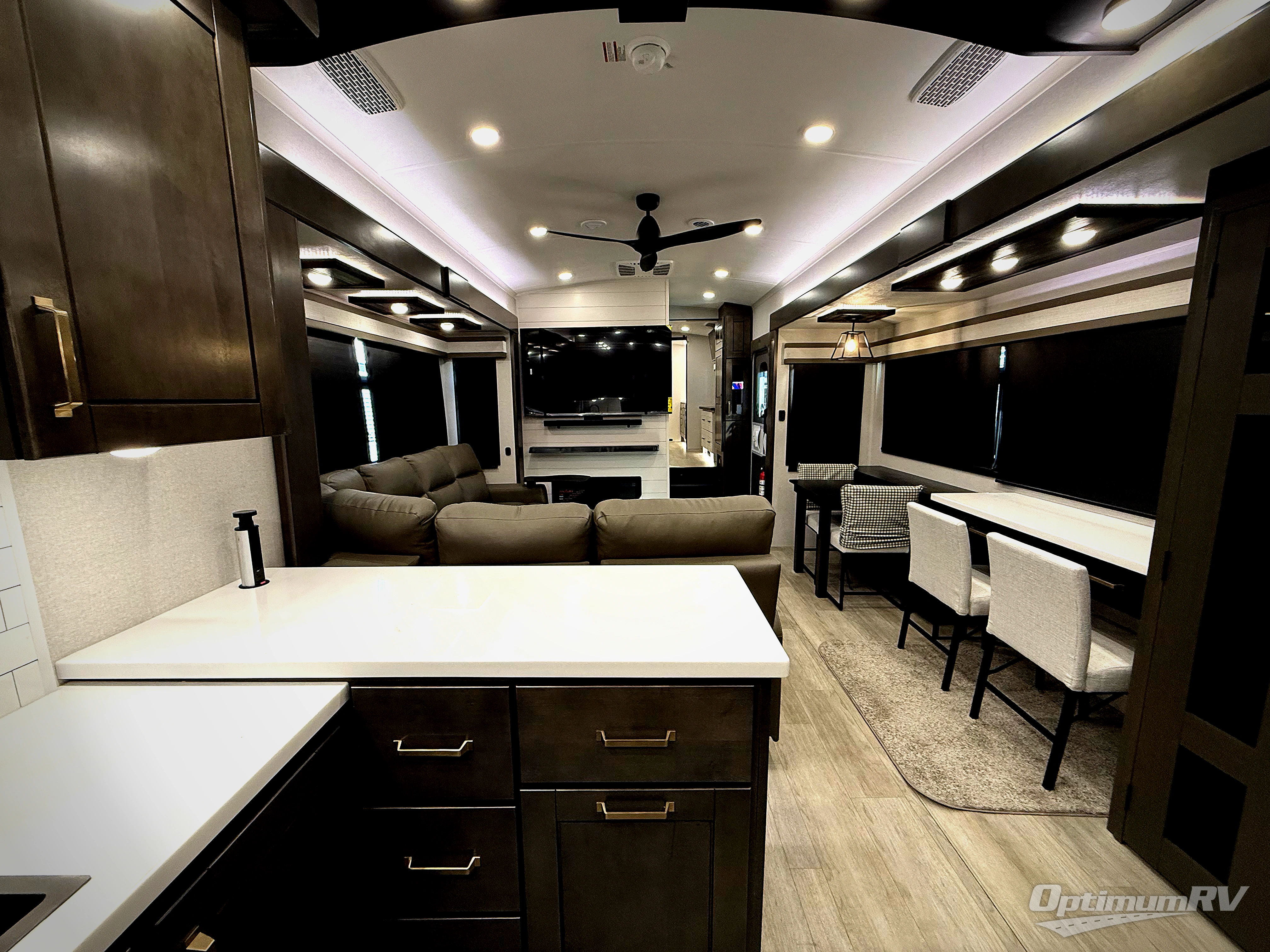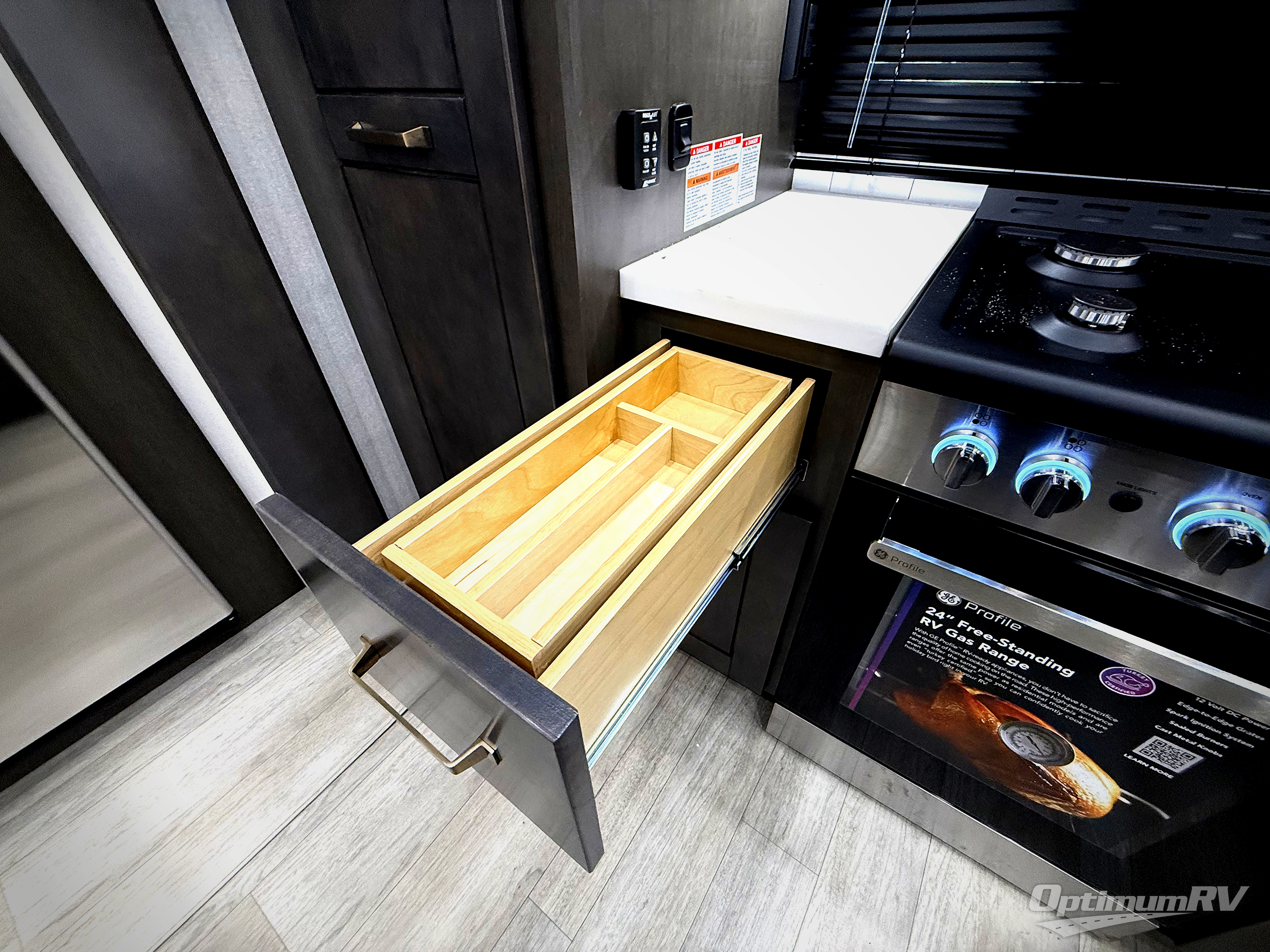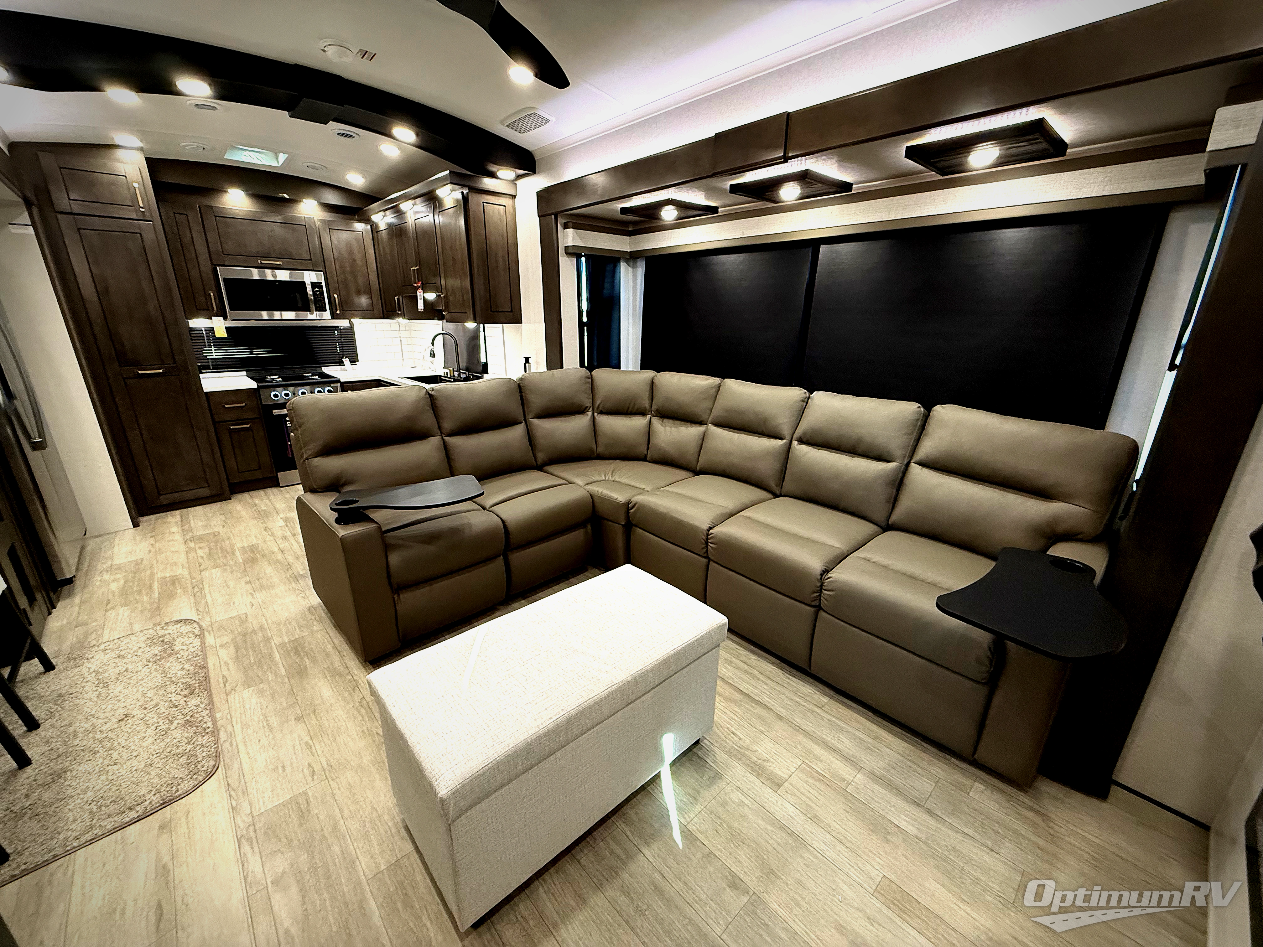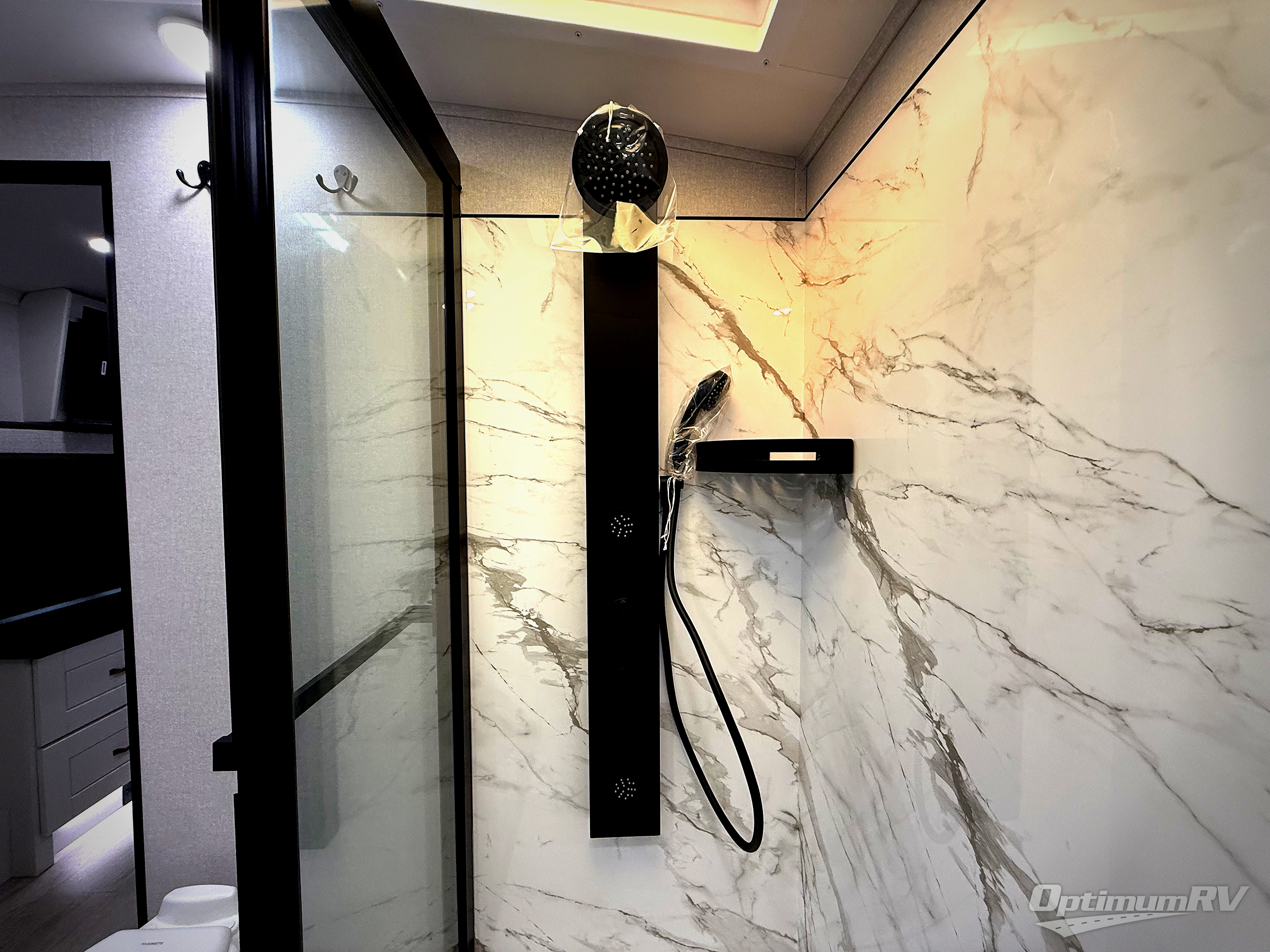 Starting from the back, this impressive 39RK features a rear kitchen designed in a convenient U-shape for easy accessibility and efficient meal prep. The kitchen is fully equipped with plenty of overhead cabinets, a convection microwave with an air fryer, a 24" range, and a pull-out pantry, perfect for the chef on the trip to cook in comfort. Across the kitchen, the large slide-out houses a 21-cu. ft. refrigerator and a second pantry with shelves, providing even more space to store groceries, snacks, and coffee essentials. The nearby desk/coffee bar and roll-out table create an inviting area to enjoy meals or unwind with a cup of coffee. The living area offers a spacious 100" L-shaped sofa and a theater seat facing the TV and fireplace, making it an ideal spot for relaxing or hosting movie nights. Moving forward, you’ll find a convenient half bathroom with linen shelves for added storage and accessibility. At the front, the private bedroom features a 72" x 80" king bed in a slide-out with a dresser across for ample storage. Finally, the full bathroom at the very front includes a 30" x 61" shower with a seat for comfort, a large sink, and a walk-in closet that provides generous space for all your clothing and gear.