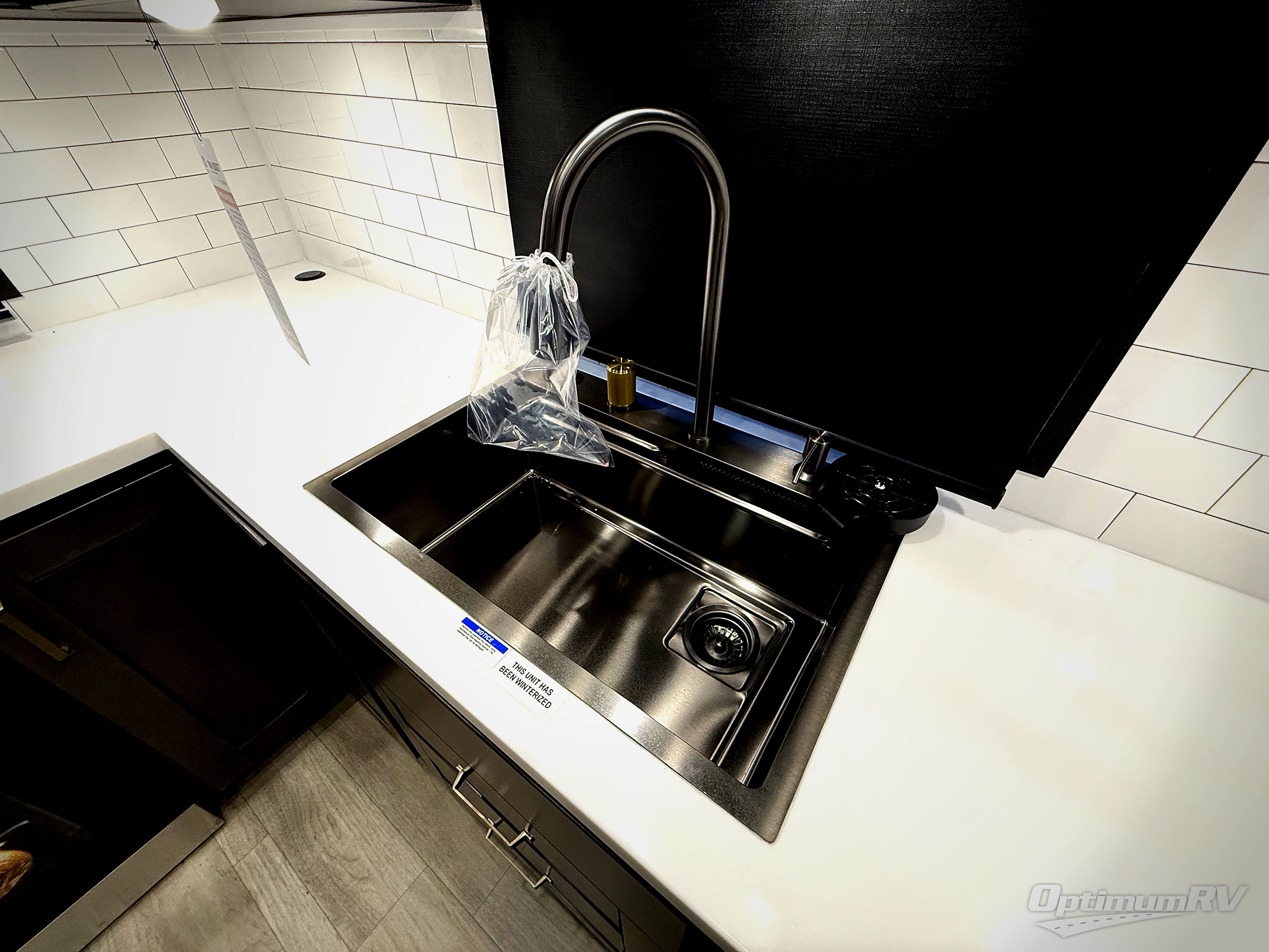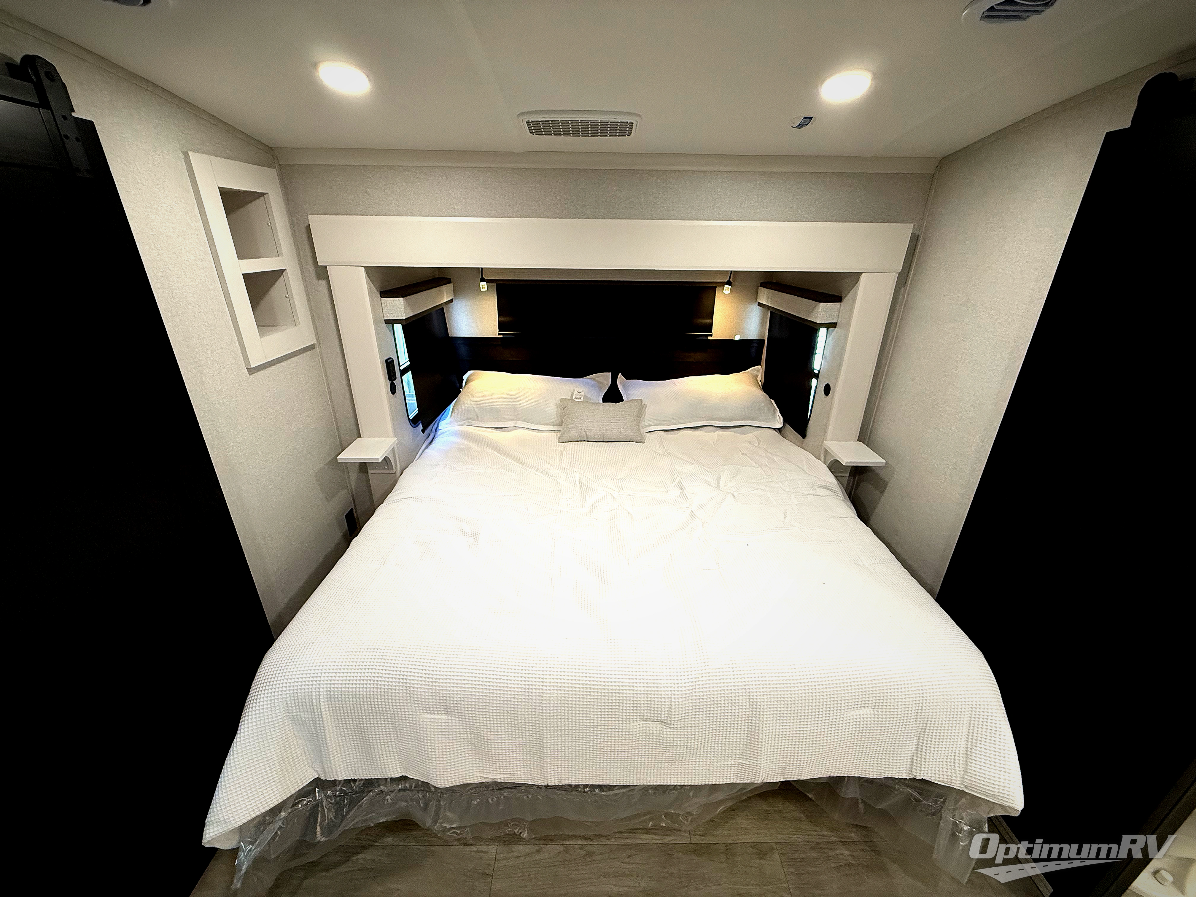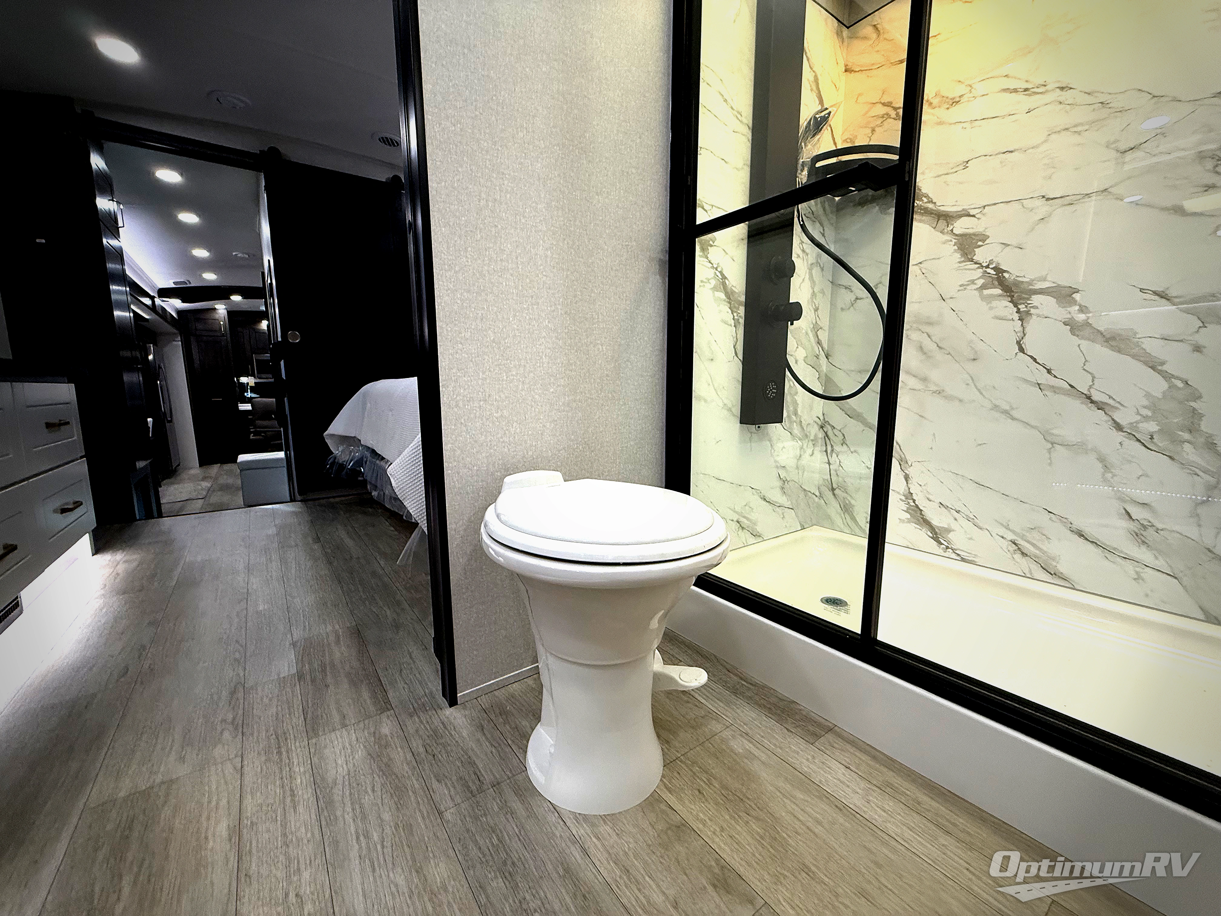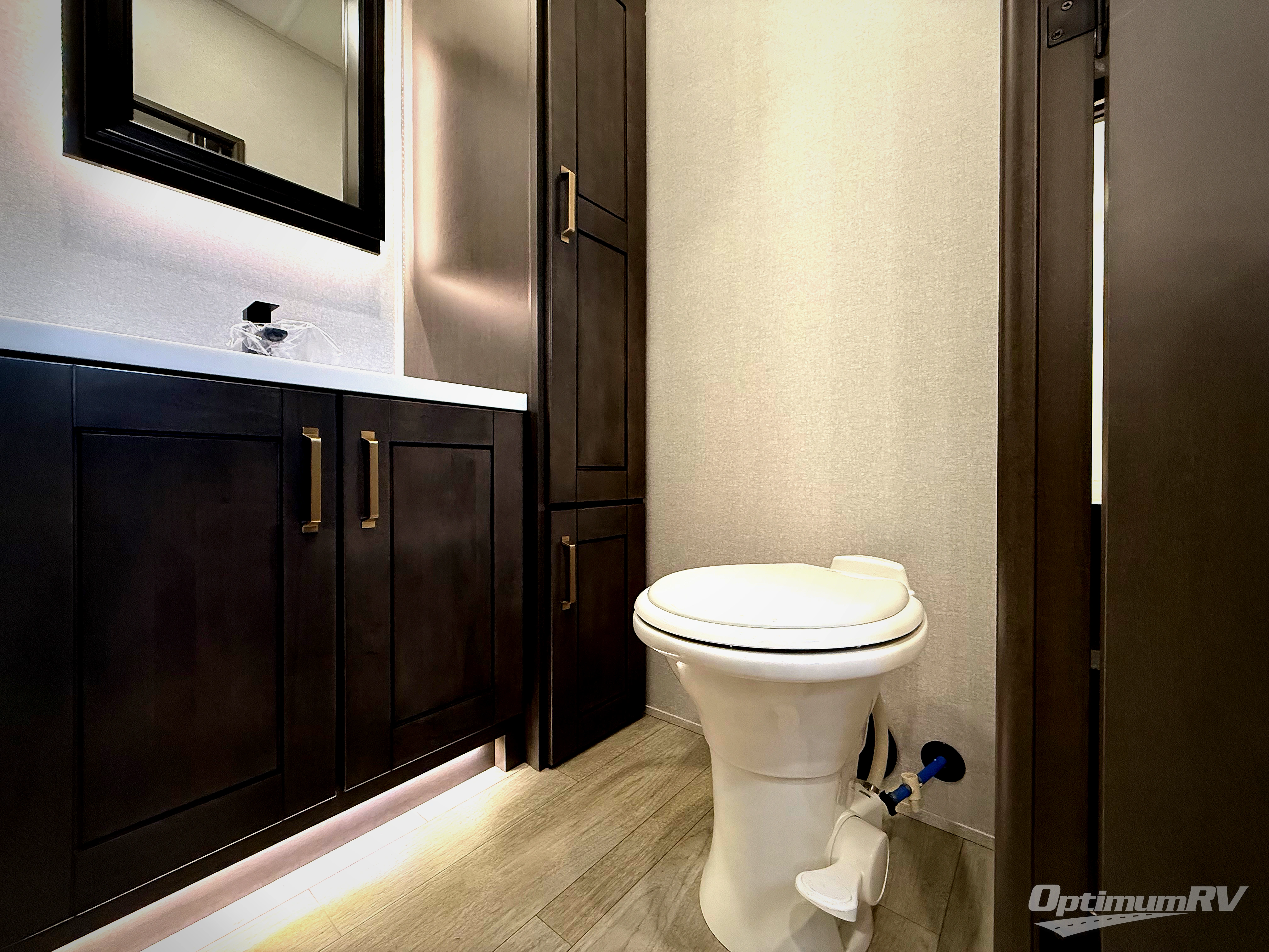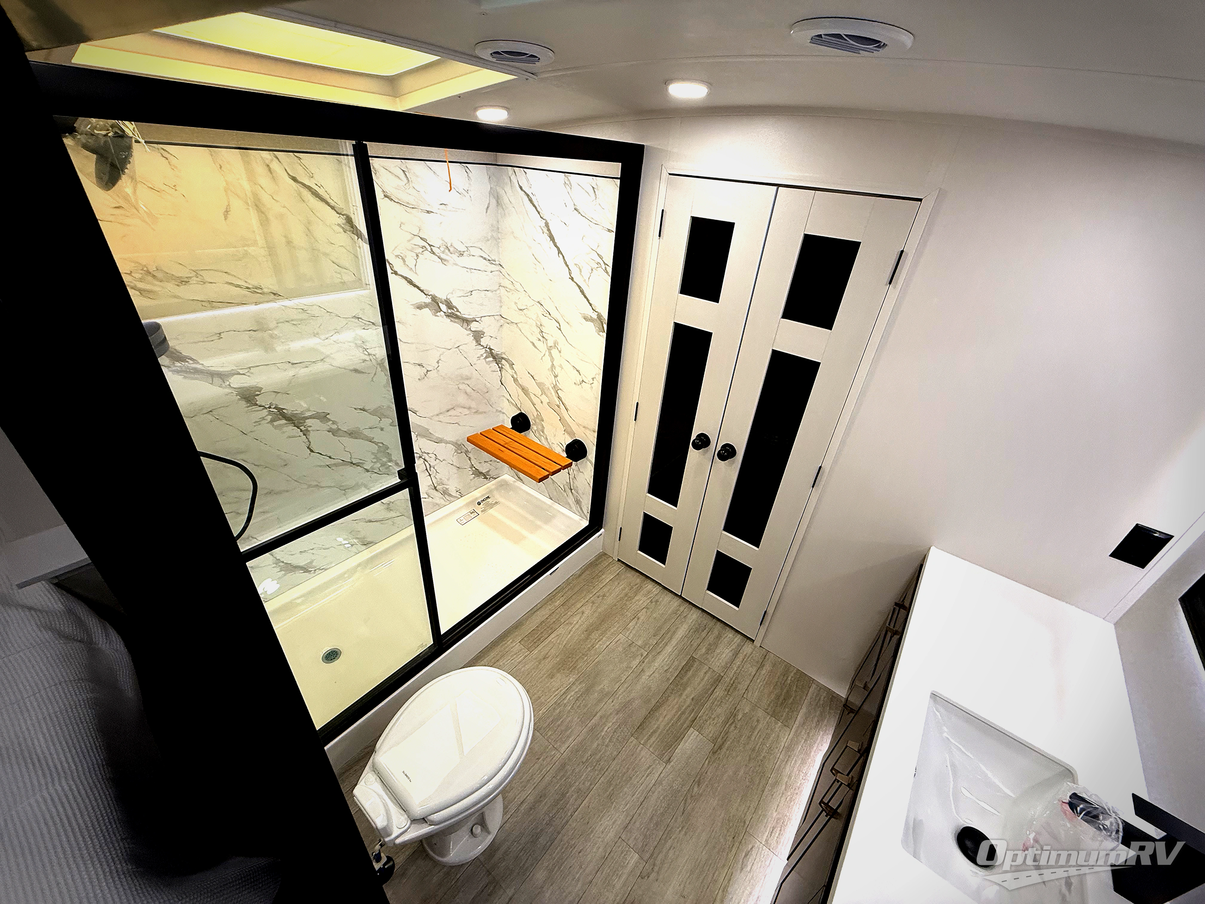 Starting from the back, this impressive 39RK features a rear kitchen designed in a convenient U-shape for easy accessibility and efficient meal prep. The kitchen is fully equipped with plenty of overhead cabinets, a convection microwave with an air fryer, a 24" range, and a pull-out pantry, perfect for the chef on the trip to cook in comfort. Across the kitchen, the large slide-out houses a 21-cu. ft. refrigerator and a second pantry with shelves, providing even more space to store groceries, snacks, and coffee essentials. The nearby desk/coffee bar and roll-out table create an inviting area to enjoy meals or unwind with a cup of coffee. The living area offers a spacious 100" L-shaped sofa and a theater seat facing the TV and fireplace, making it an ideal spot for relaxing or hosting movie nights. Moving forward, you’ll find a convenient half bathroom with linen shelves for added storage and accessibility. At the front, the private bedroom features a 72" x 80" king bed in a slide-out with a dresser across for ample storage. Finally, the full bathroom at the very front includes a 30" x 61" shower with a seat for comfort, a large sink, and a walk-in closet that provides generous space for all your clothing and gear.