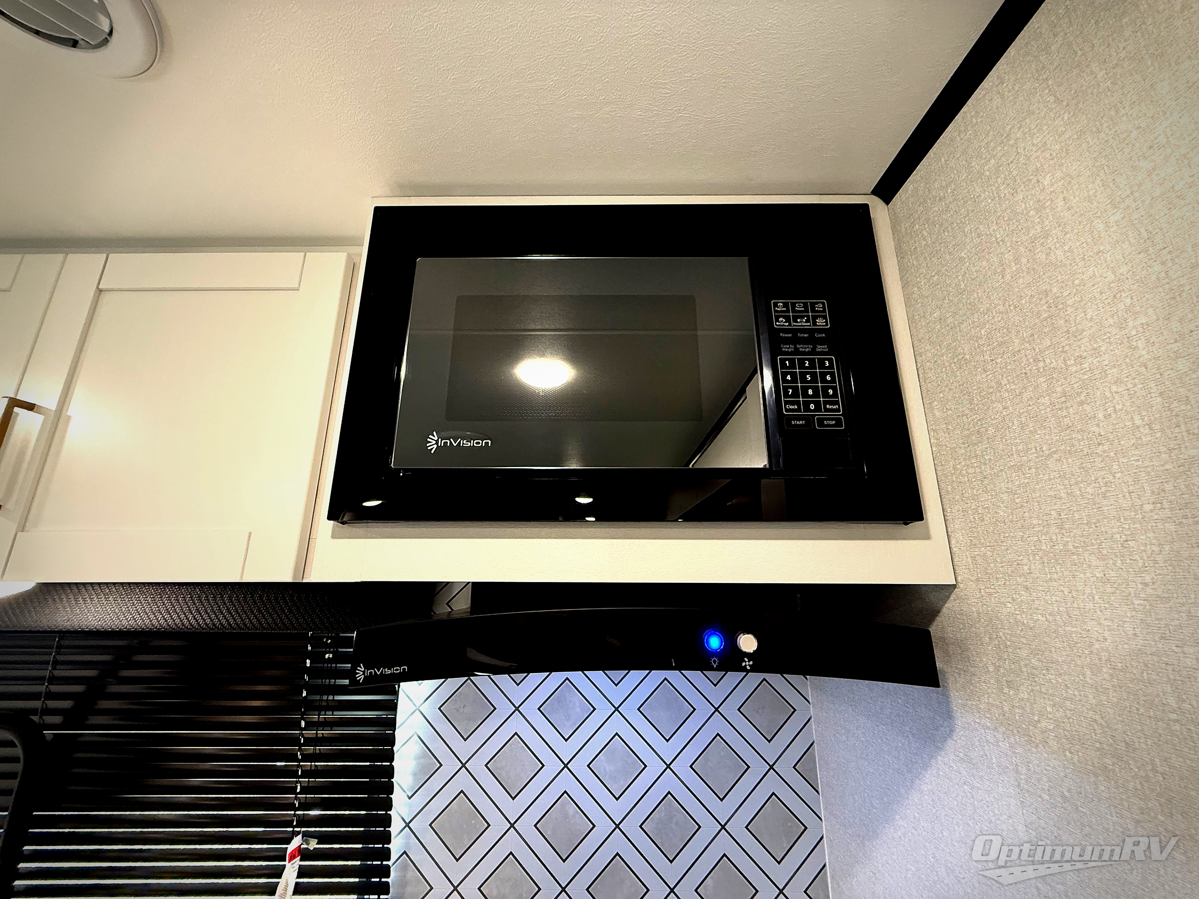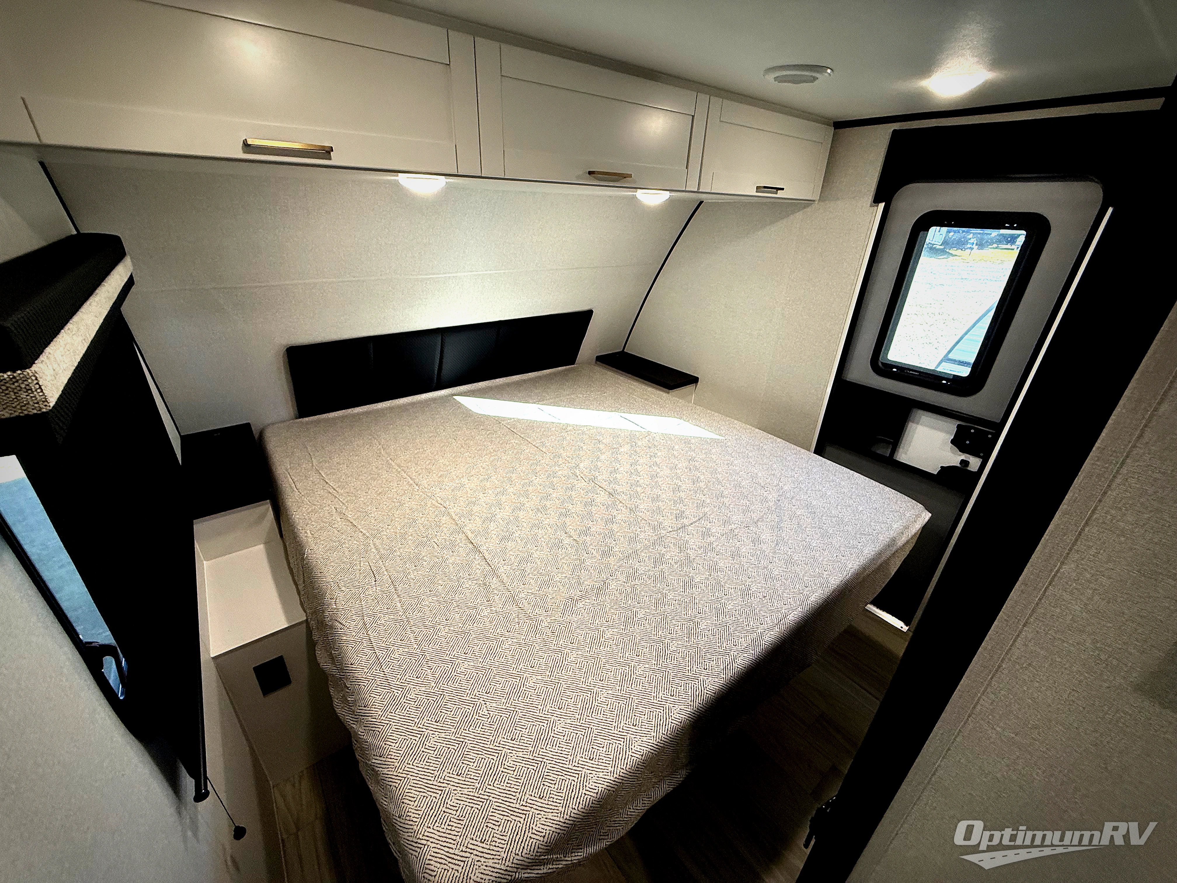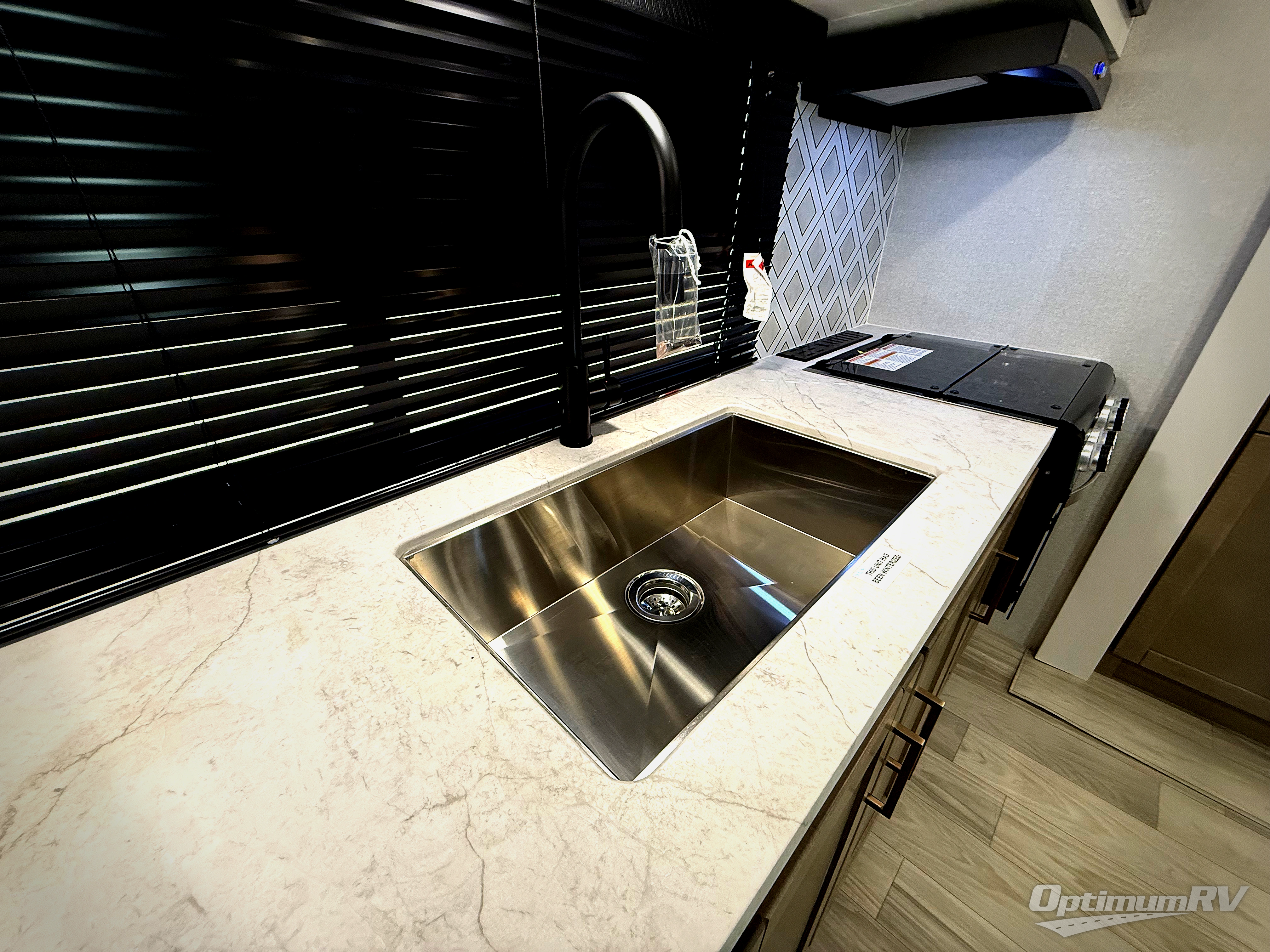 At the front of this travel trailer, you'll find a private bedroom featuring a spacious 60" x 80" queen bed, complete with pull-out nightstands and wardrobes on each side for convenient storage of clothes and essentials. One of the two entry doors is located here, providing added privacy and easy access. Moving down the hall, the full bathroom offers a 30" x 36" shower, a porcelain foot-flush toilet, and a linen cabinet to keep towels and hygiene items neatly organized. In the main living area, you can enjoy meals or game nights at the 38" x 68" booth dinette, while the 60" theater seat in the slide-out provides a cozy spot to relax. At the rear, the kitchen spans the full width of the trailer and includes a stainless-steel single-basin sink with a high-rise pullout faucet and butcher block cutting board, a three-burner range, and generous seamless countertops. Also, in the slide-out are a pantry and an 11-cu. ft. refrigerator, giving you plenty of room to store food, snacks, and leftovers for the whole trip. The second entry door is located in between the kitchen and dinette for your convenience.