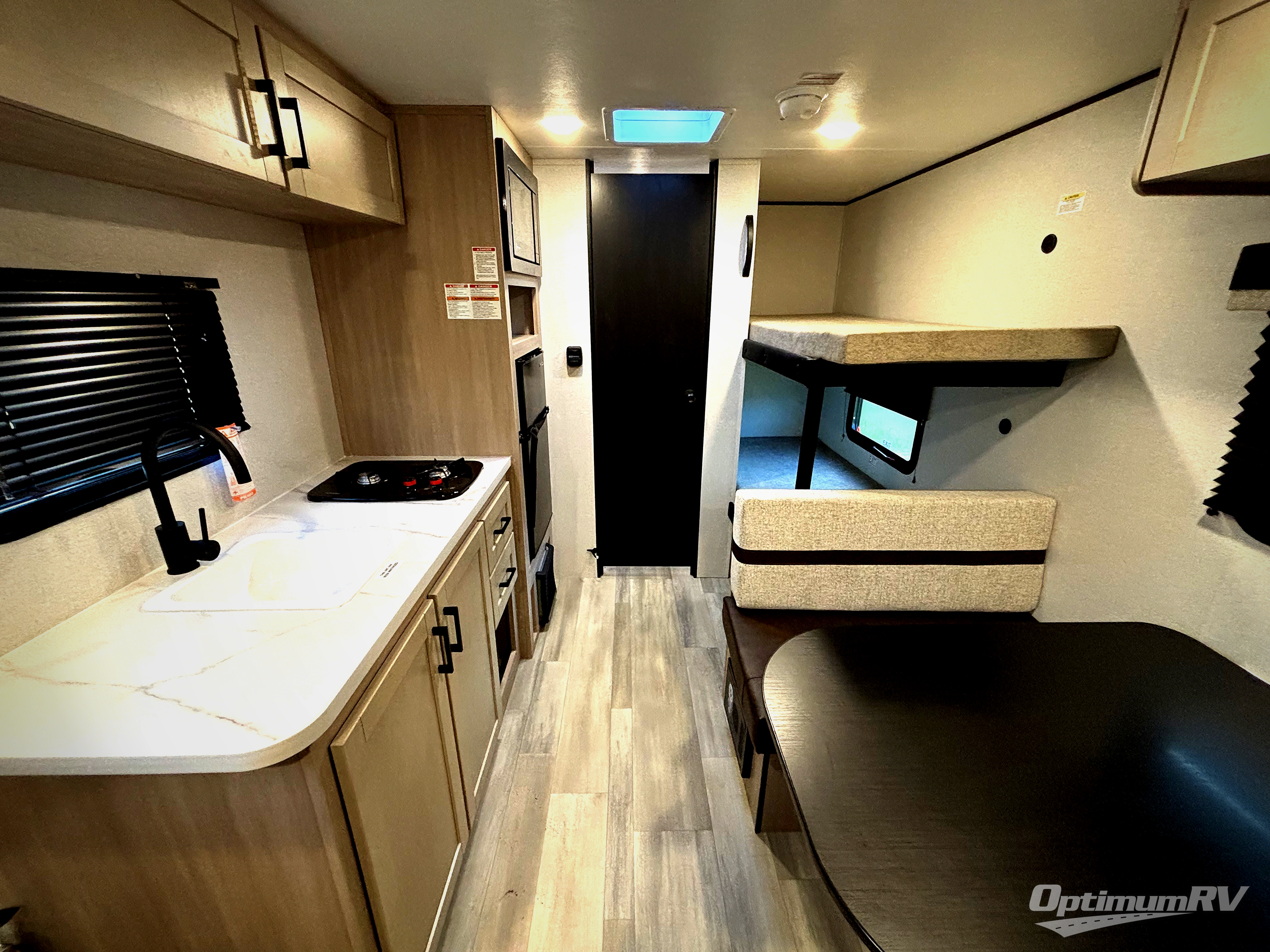 Camping trips are made easy in this Lynx Edition travel trailer with bunk beds for guests or little ones. You'll find the front queen bed for a great night's rest, along with a nightstand and wardrobe to keep your things tidy. The rear corner private bath includes a foot-flush toilet and a 24" x 36" shower, so you won't have to leave the camper in the middle of the night. A two-burner cooktop and microwave oven will let you make meals each day, and a 12V refrigerator will keep your food fresh!