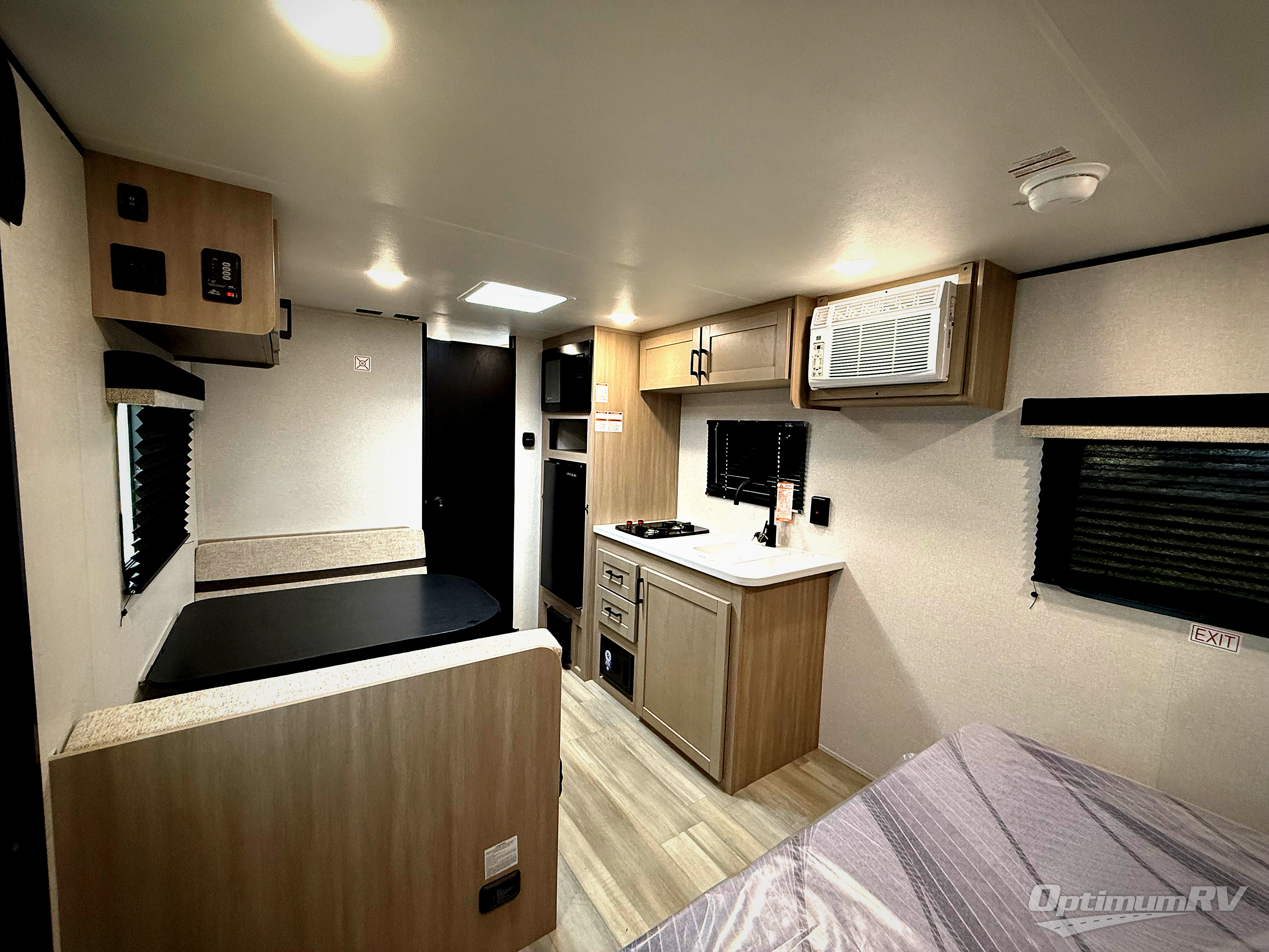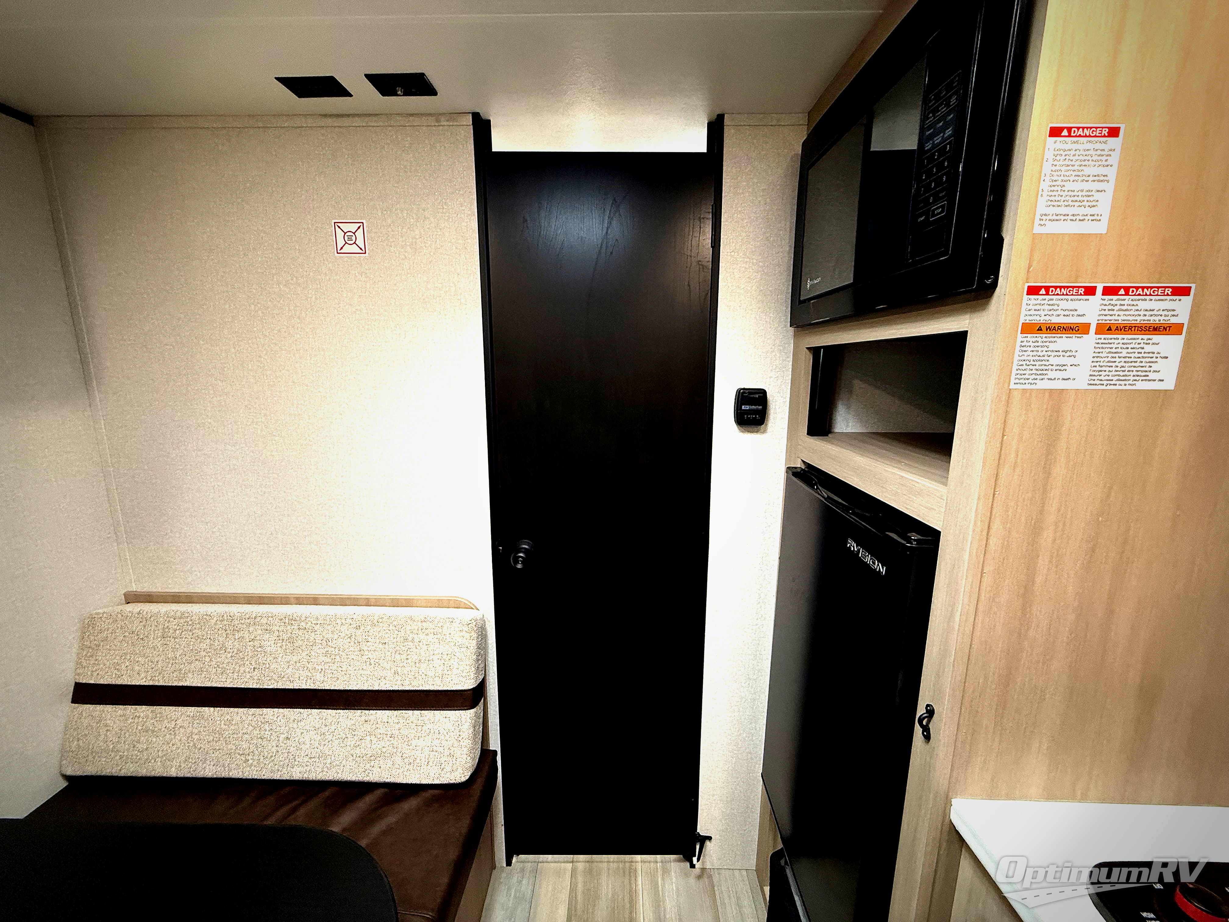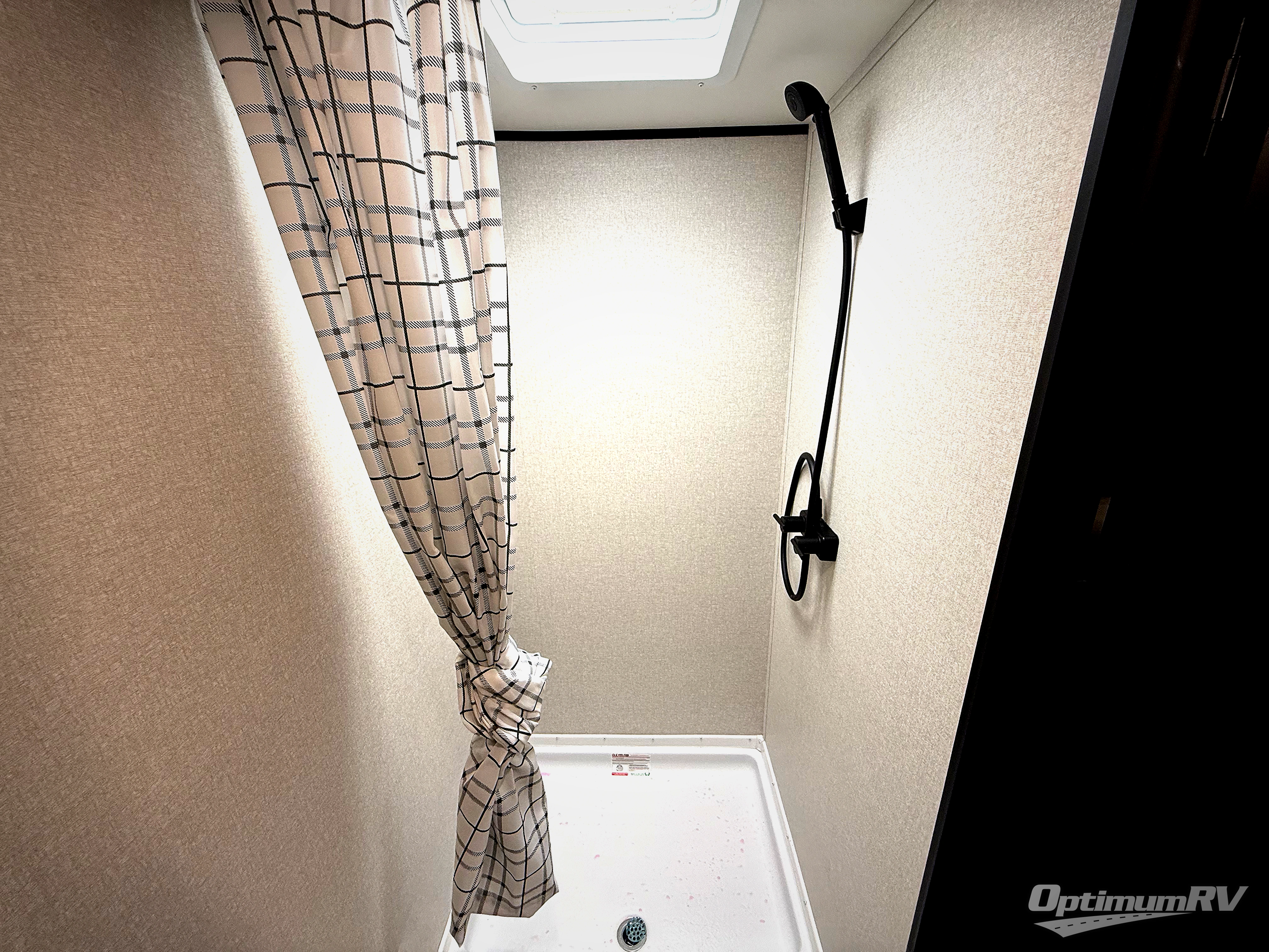 This travel trailer provides you with a little more privacy thanks to the rear bath, which also includes a bath linen closet and shelves for extra storage. The front bedroom includes a walk-around RV queen bed to make it easier to make the bed, and you'll find an overhead shelf for books or games. Once you've made lunch on the two-burner cooktop or in the microwave oven, you can dine at the booth dinette or take your plate outdoors to sit under the 10' power awning.