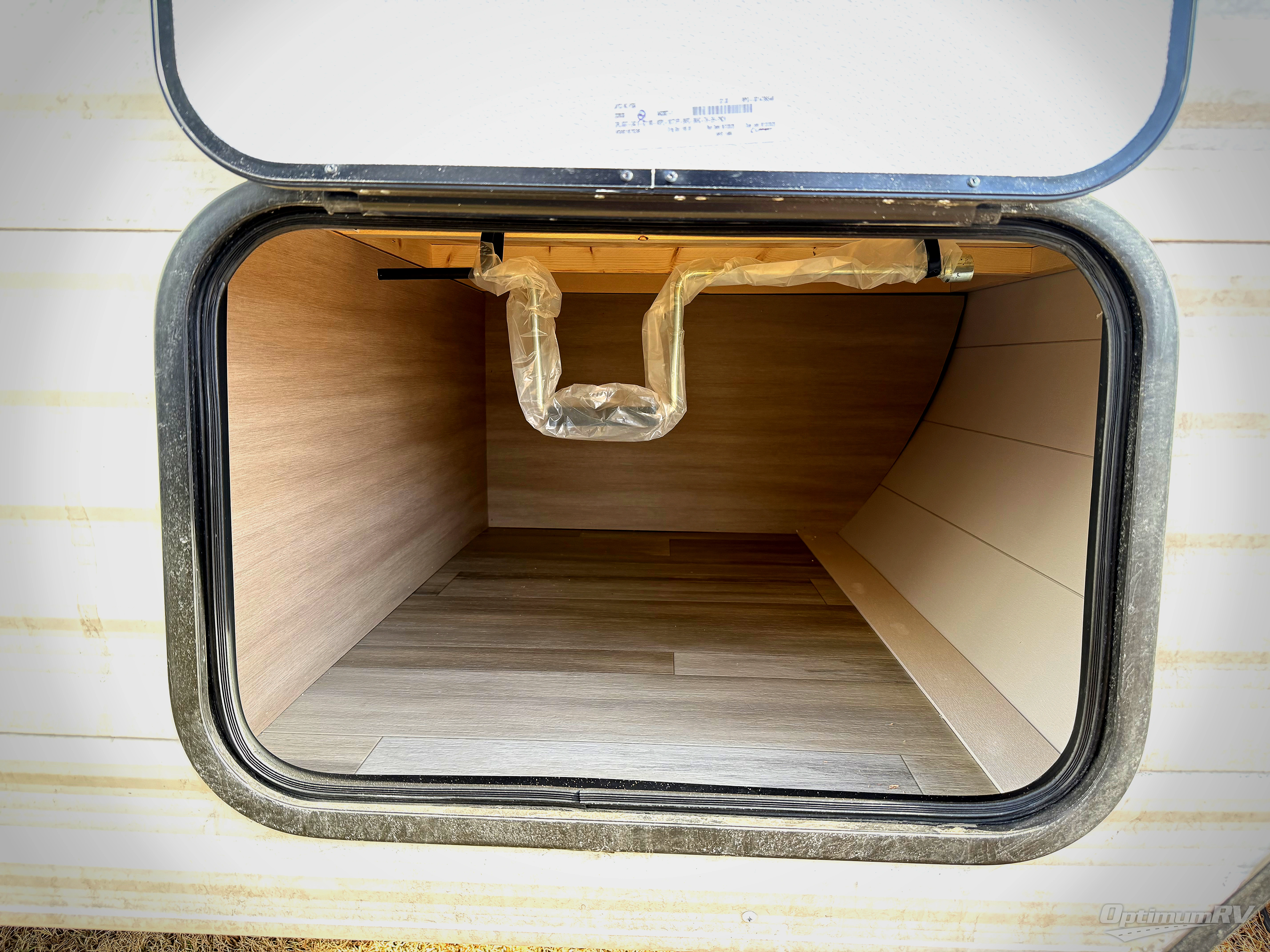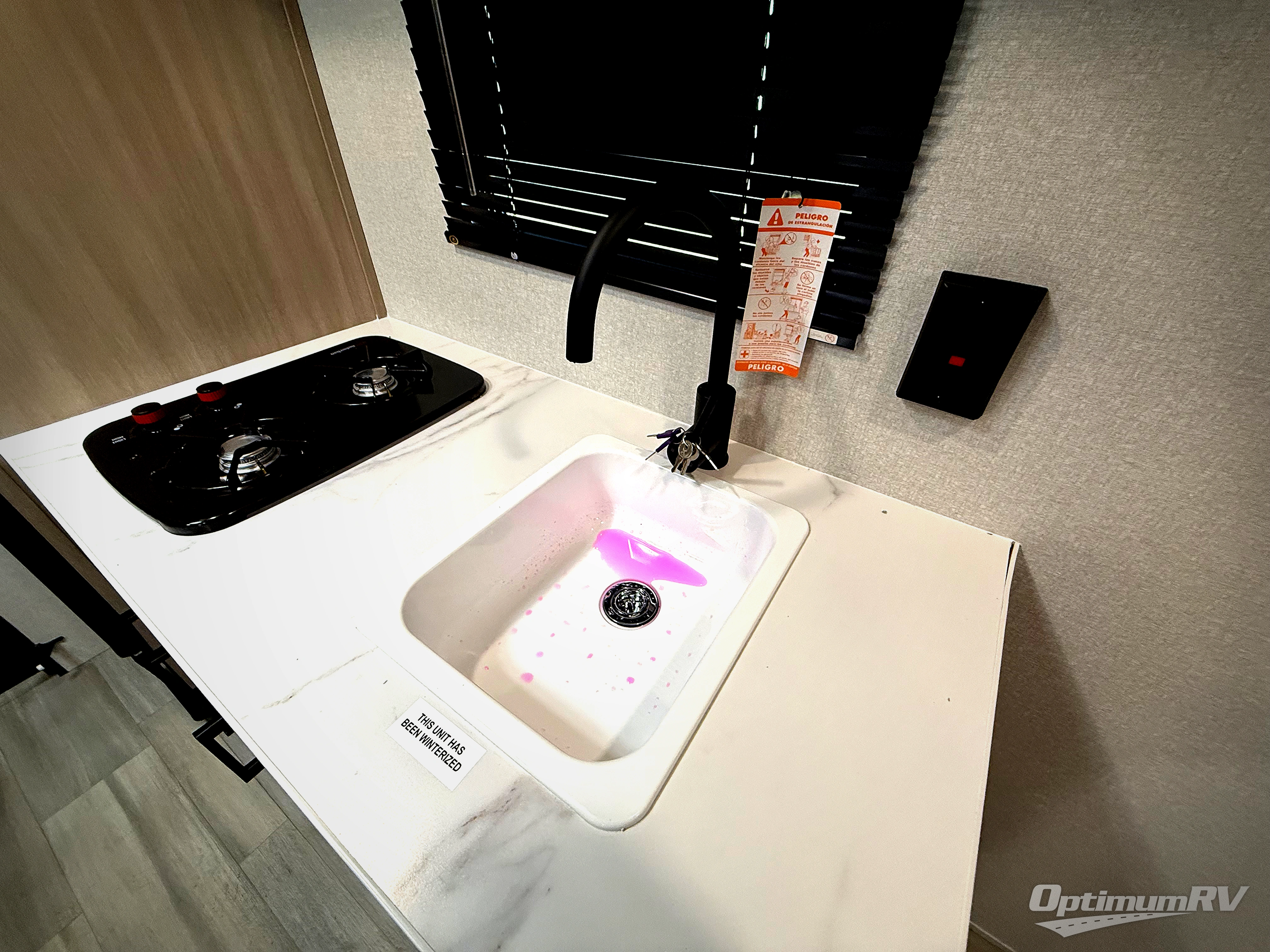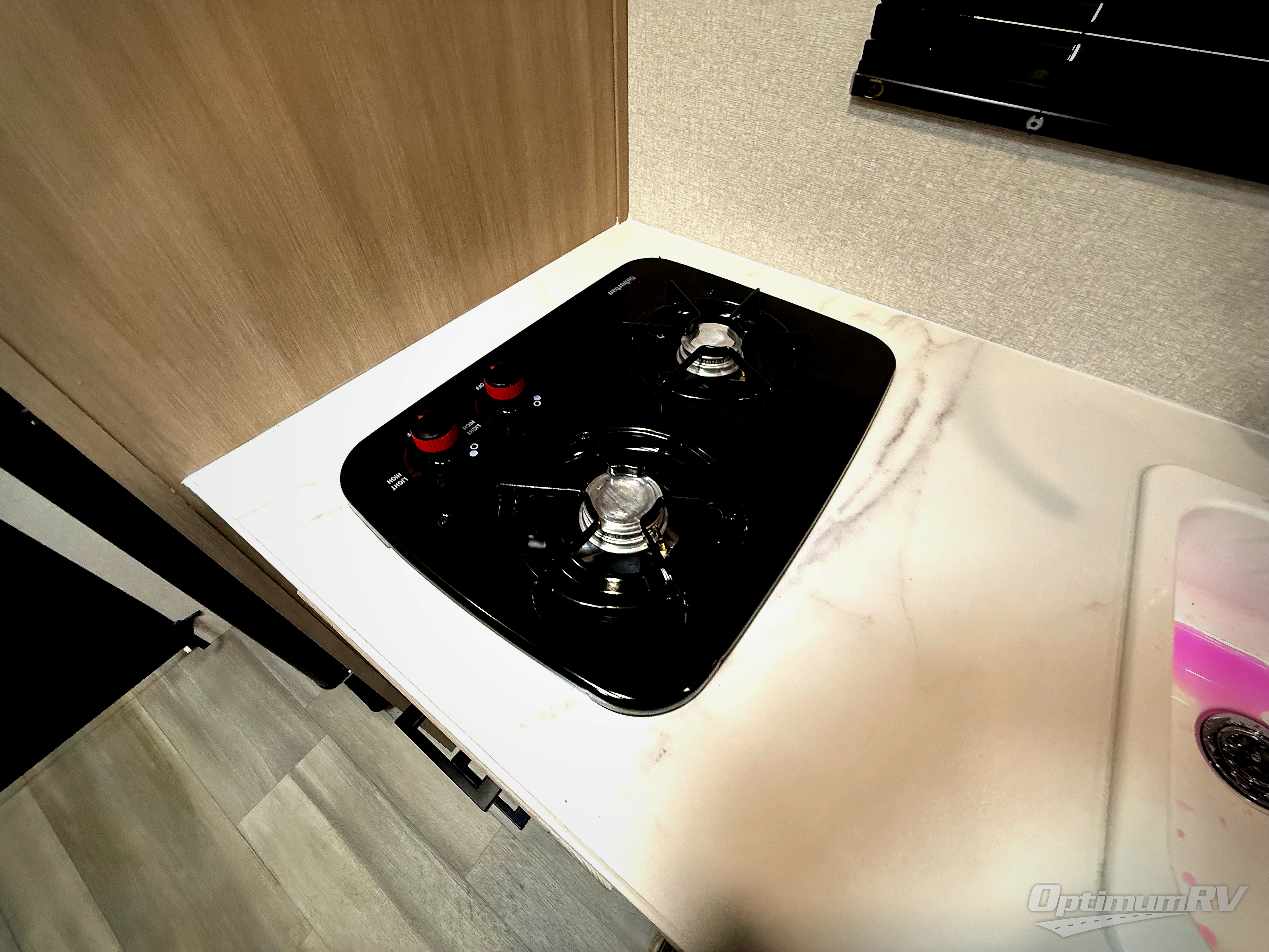 This travel trailer provides you with a little more privacy thanks to the rear bath, which also includes a bath linen closet and shelves for extra storage. The front bedroom includes a walk-around RV queen bed to make it easier to make the bed, and you'll find an overhead shelf for books or games. Once you've made lunch on the two-burner cooktop or in the microwave oven, you can dine at the booth dinette or take your plate outdoors to sit under the 10' power awning.