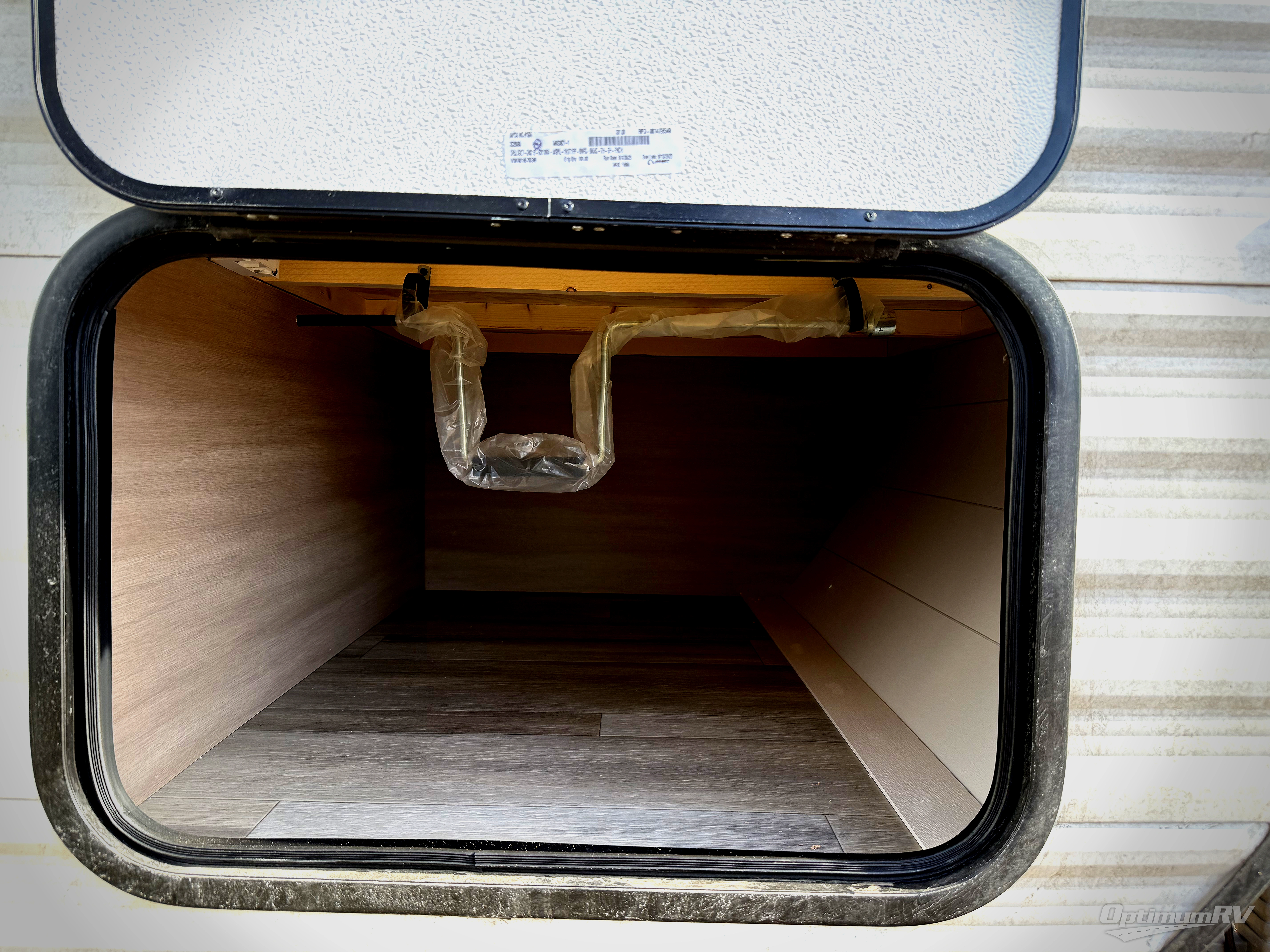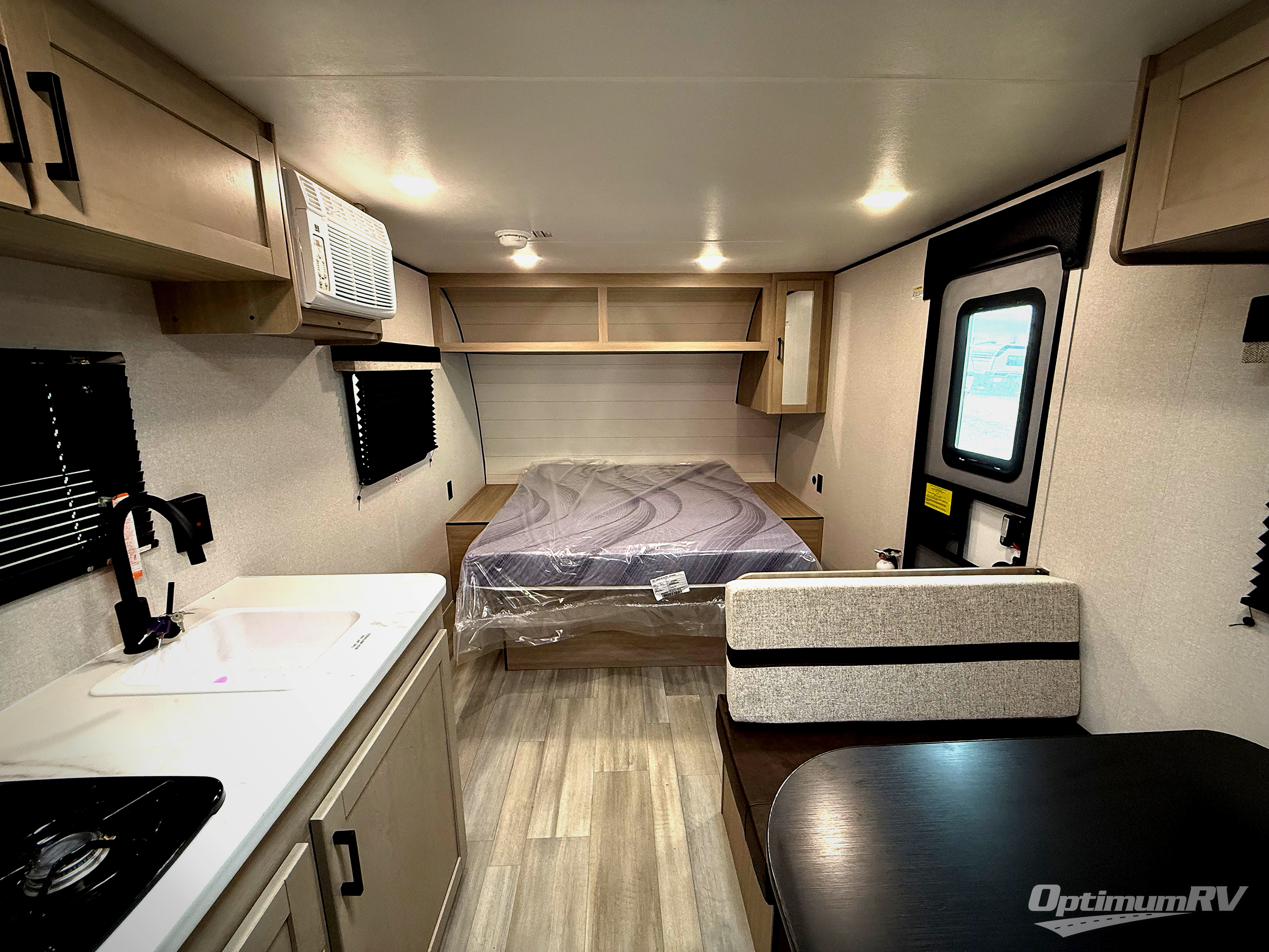 This travel trailer provides you with a little more privacy thanks to the rear bath, which also includes a bath linen closet and shelves for extra storage. The front bedroom includes a walk-around RV queen bed to make it easier to make the bed, and you'll find an overhead shelf for books or games. Once you've made lunch on the two-burner cooktop or in the microwave oven, you can dine at the booth dinette or take your plate outdoors to sit under the 10' power awning.