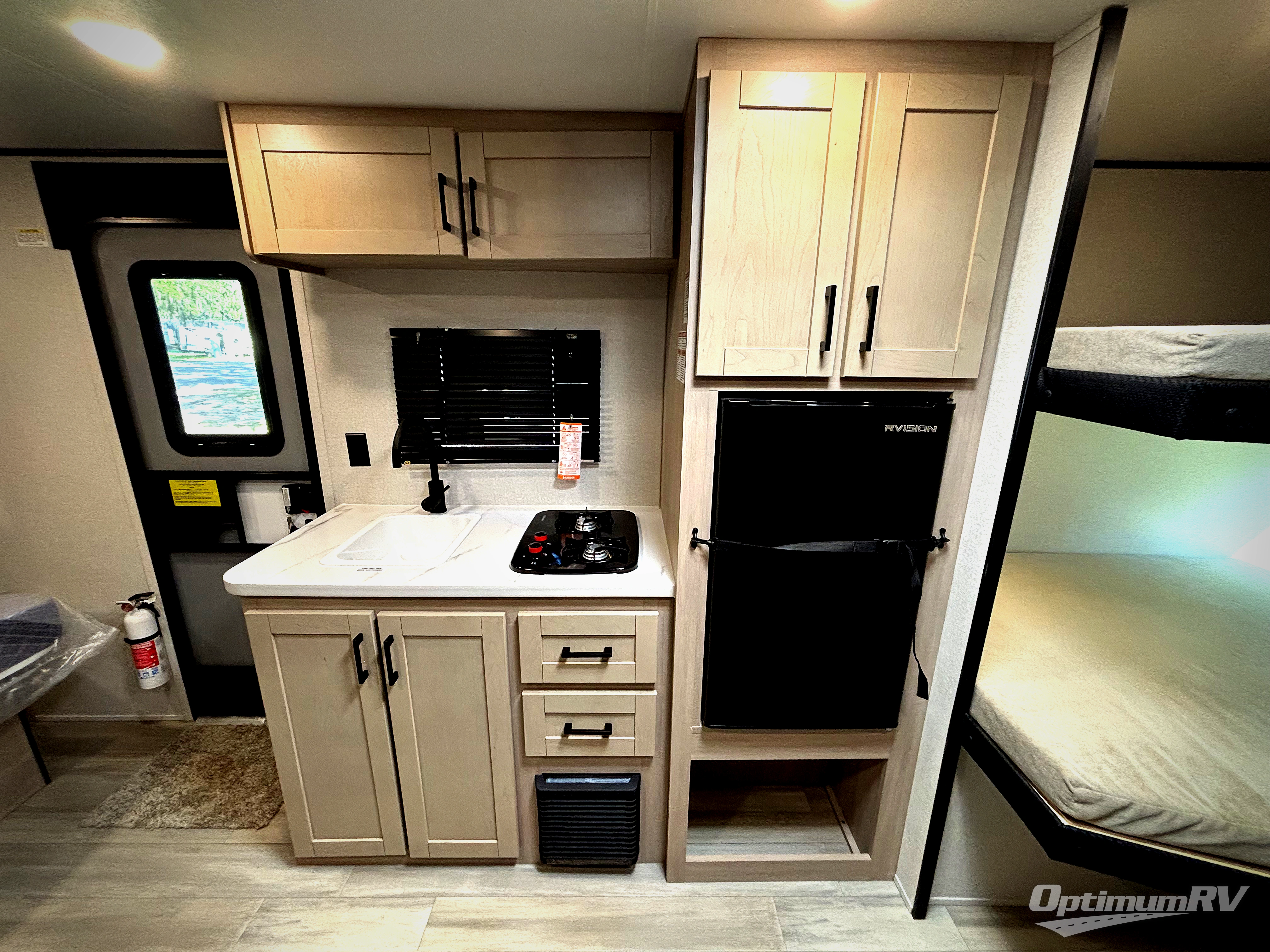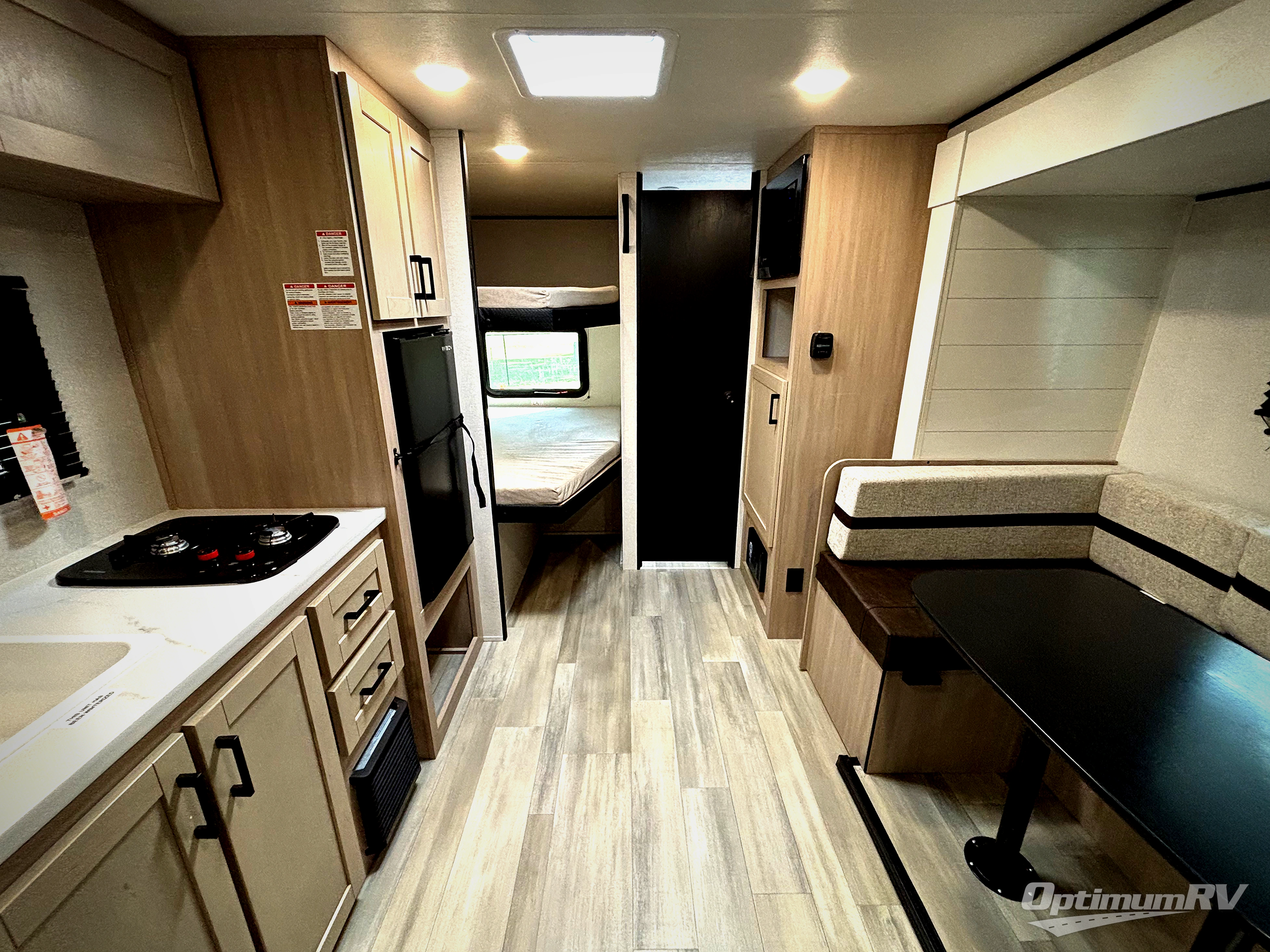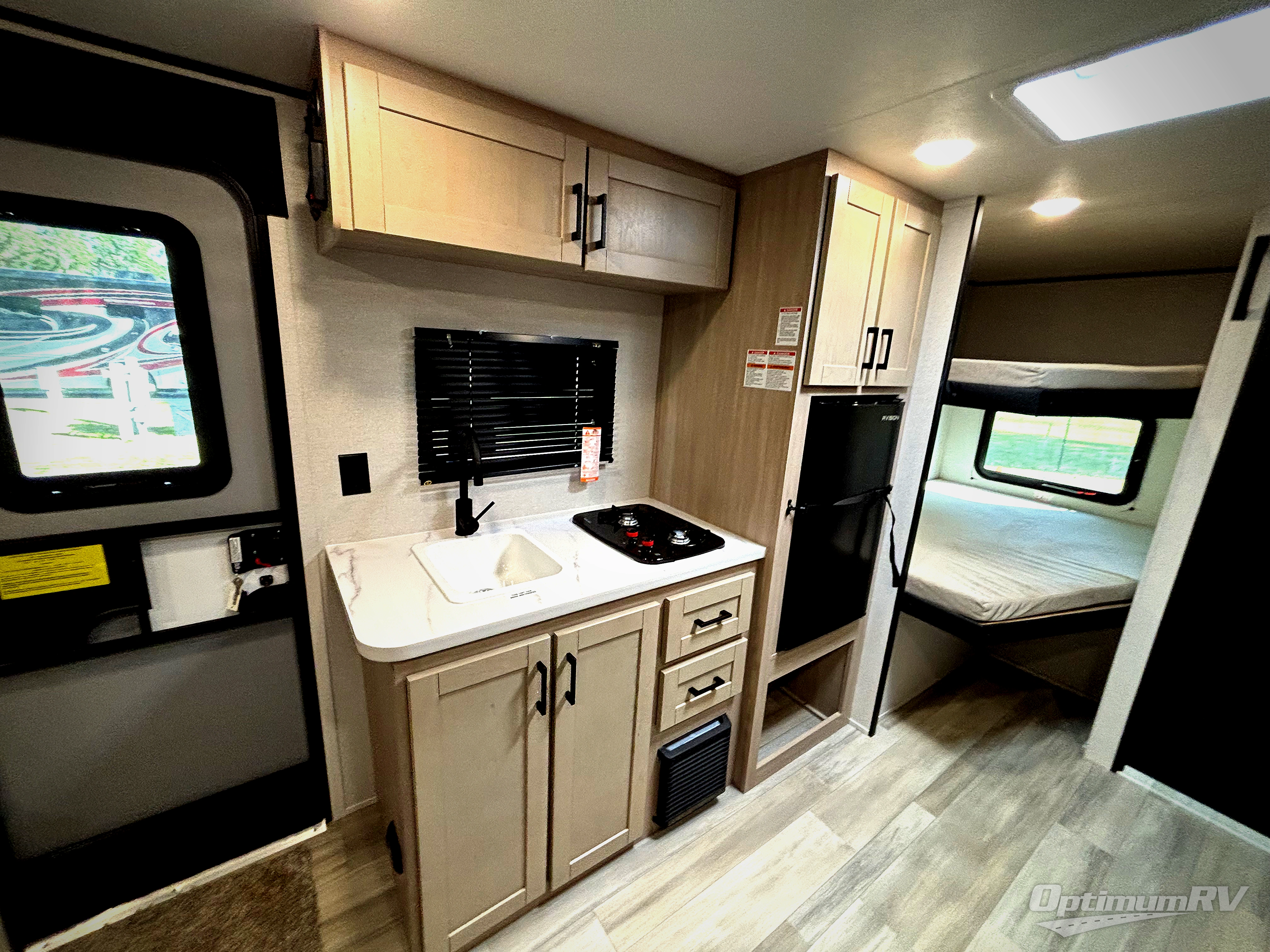 Camping trips are made easy in this Lynx Edition travel trailer with double-size bunk beds for guests or little ones. You'll find the front queen bed for a great night's rest, along with an overhead shelf and a wardrobe to keep your things tidy. The rear corner private bath includes a foot-flush toilet and a 24" x 40" shower, so you won't have to leave the camper in the middle of the night. A two-burner cooktop and microwave oven will let you make meals each day, and you can dine around the U-shaped dinette, which is also within a slide out for more space!