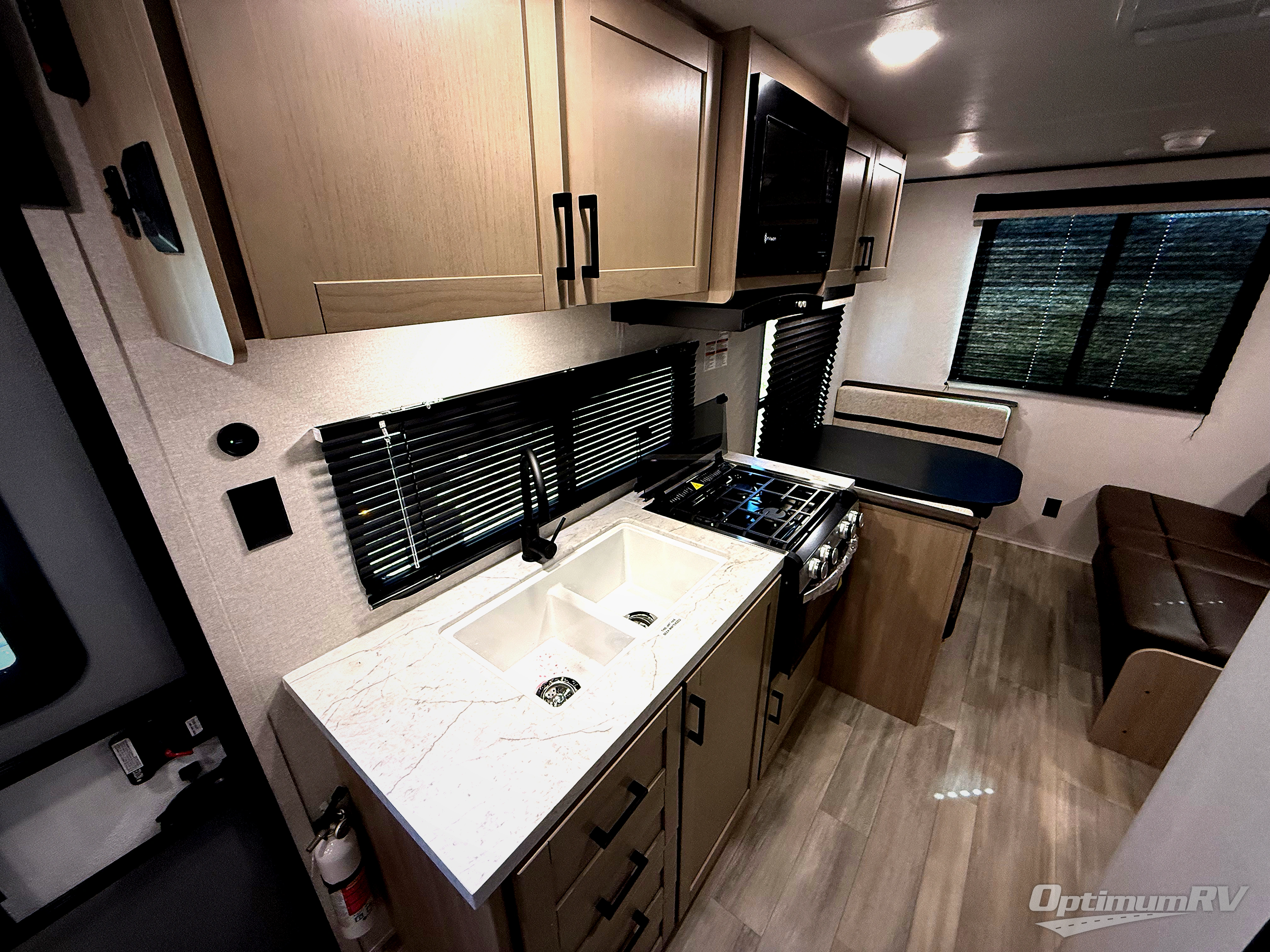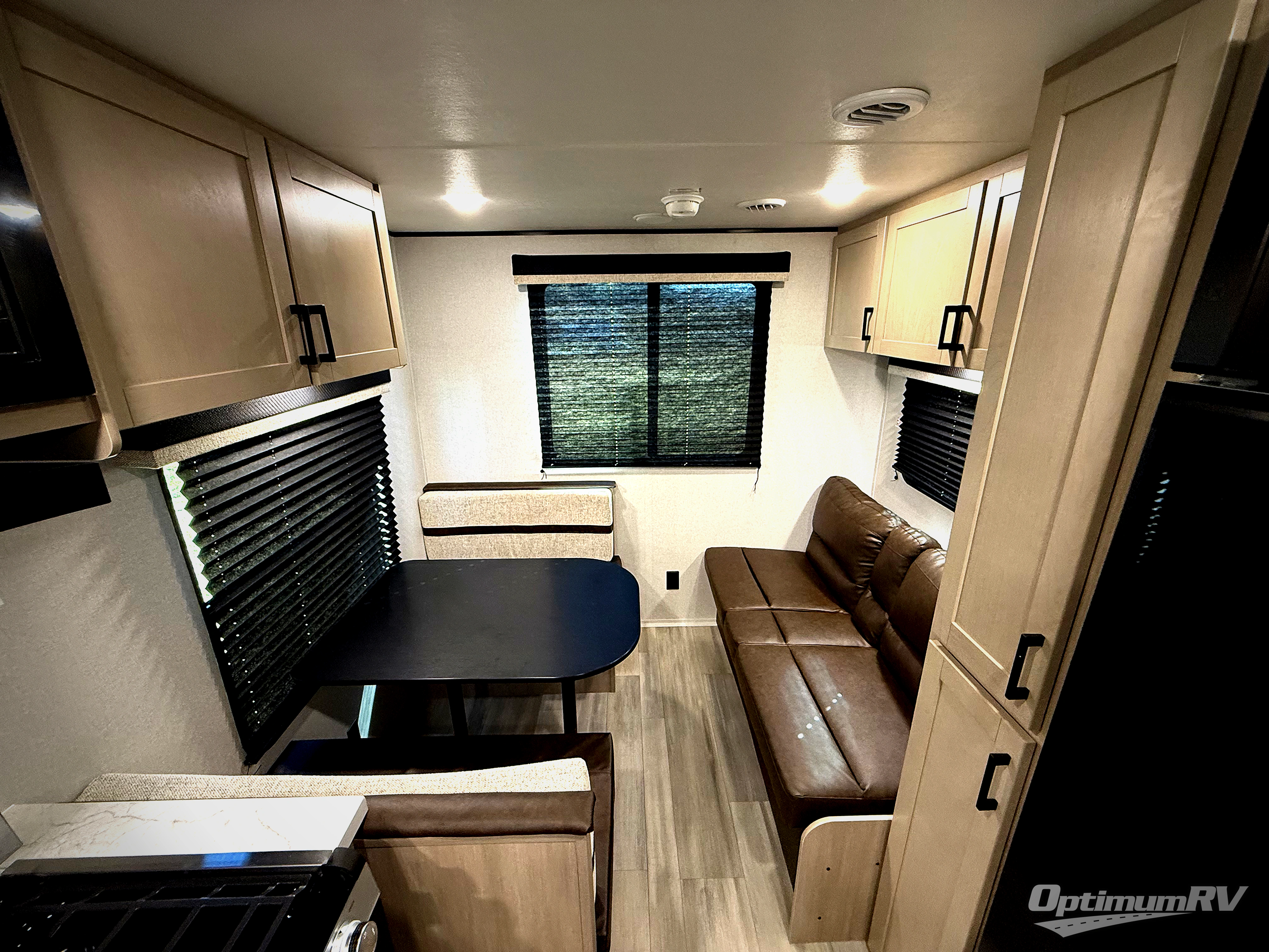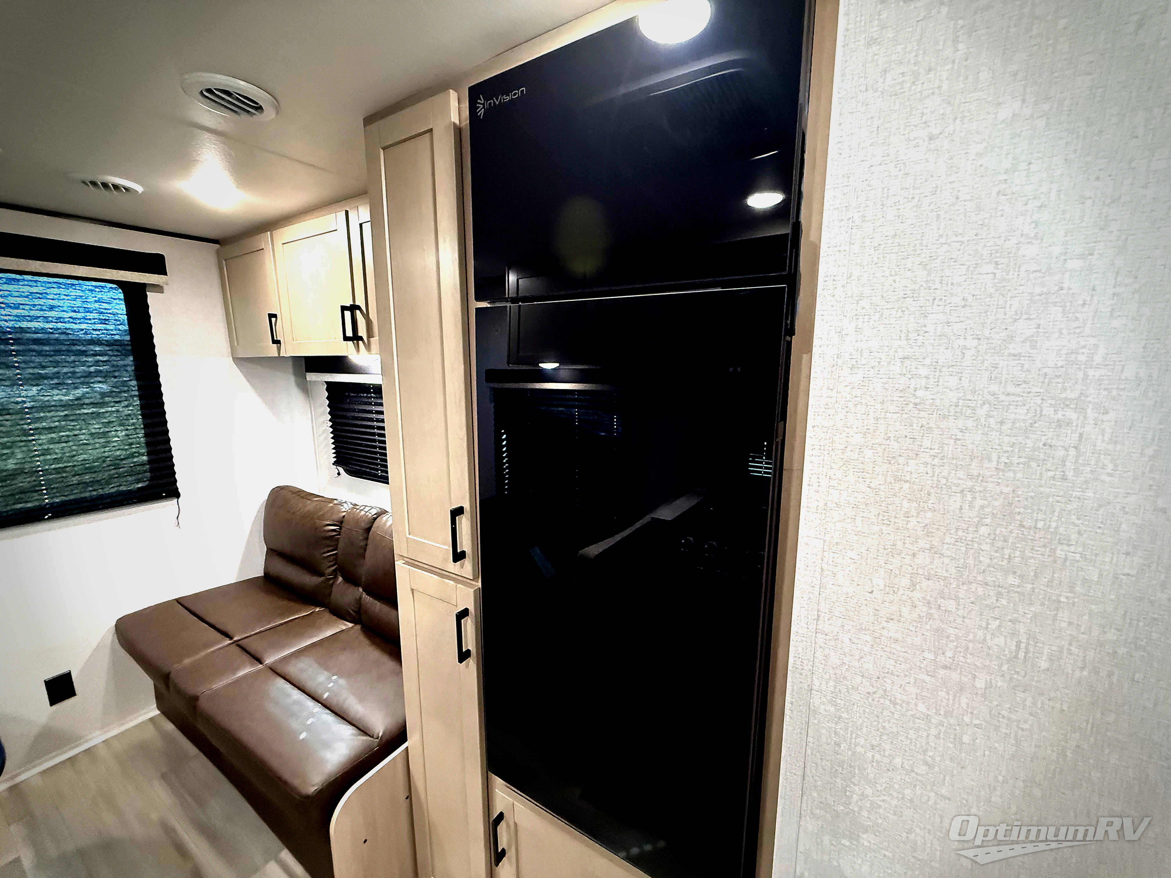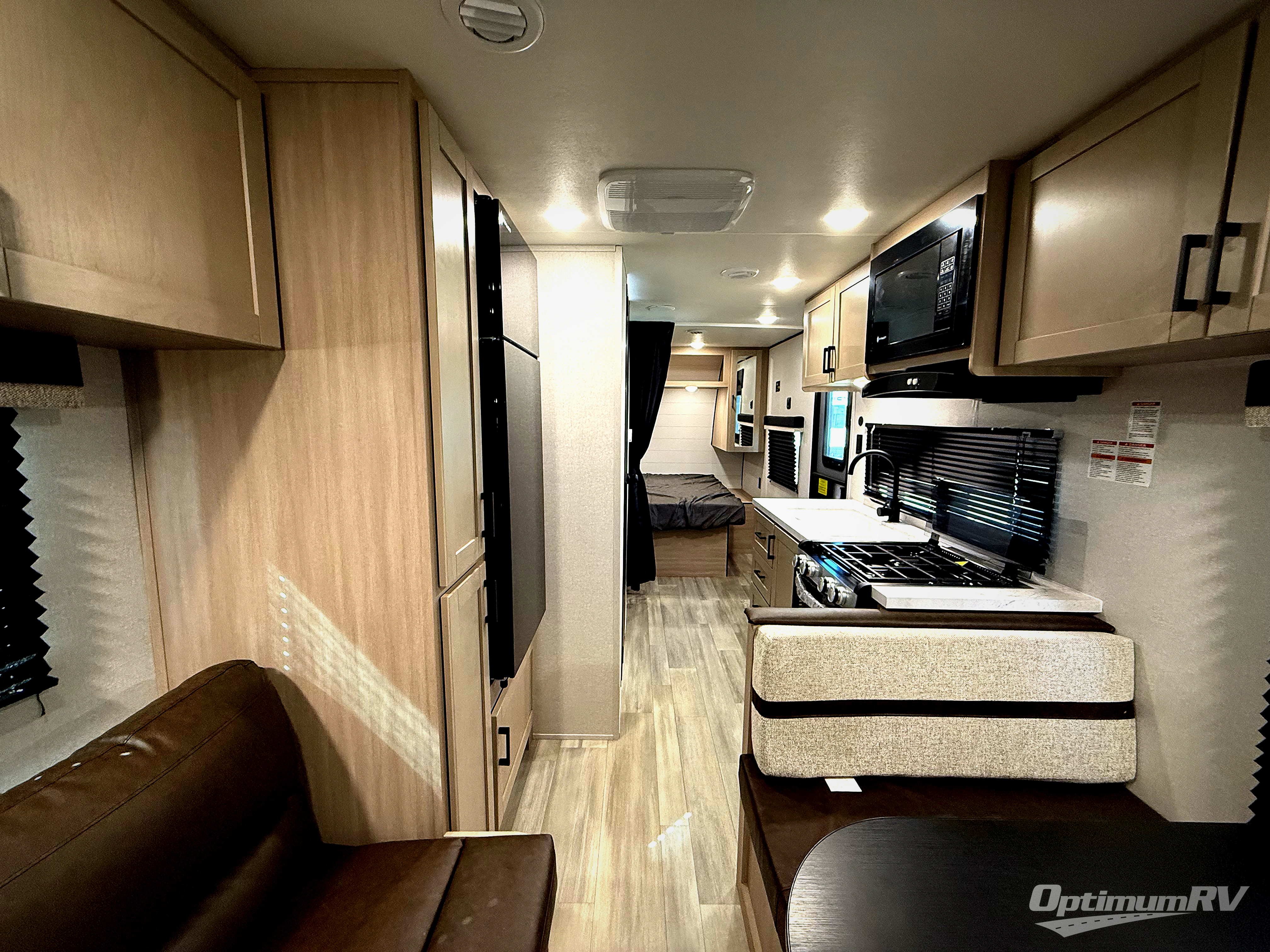 Weekend trips to the campground will be made unforgettable in this travel trailer for five to six. You will enjoy your own space in the front bedroom with a privacy curtain, RV queen bed and dual bedside wardrobes to keep your things tidy. If you have any guests staying over, then can convert the jack knife sofa and booth dinette back into seating spaces for breakfast in the morning. Speaking of breakfast, you'll have a three-burner cooktop and microwave oven to cook eggs and bacon, plus an 8-cu. ft. 12V refrigerator and pantry for food storage.