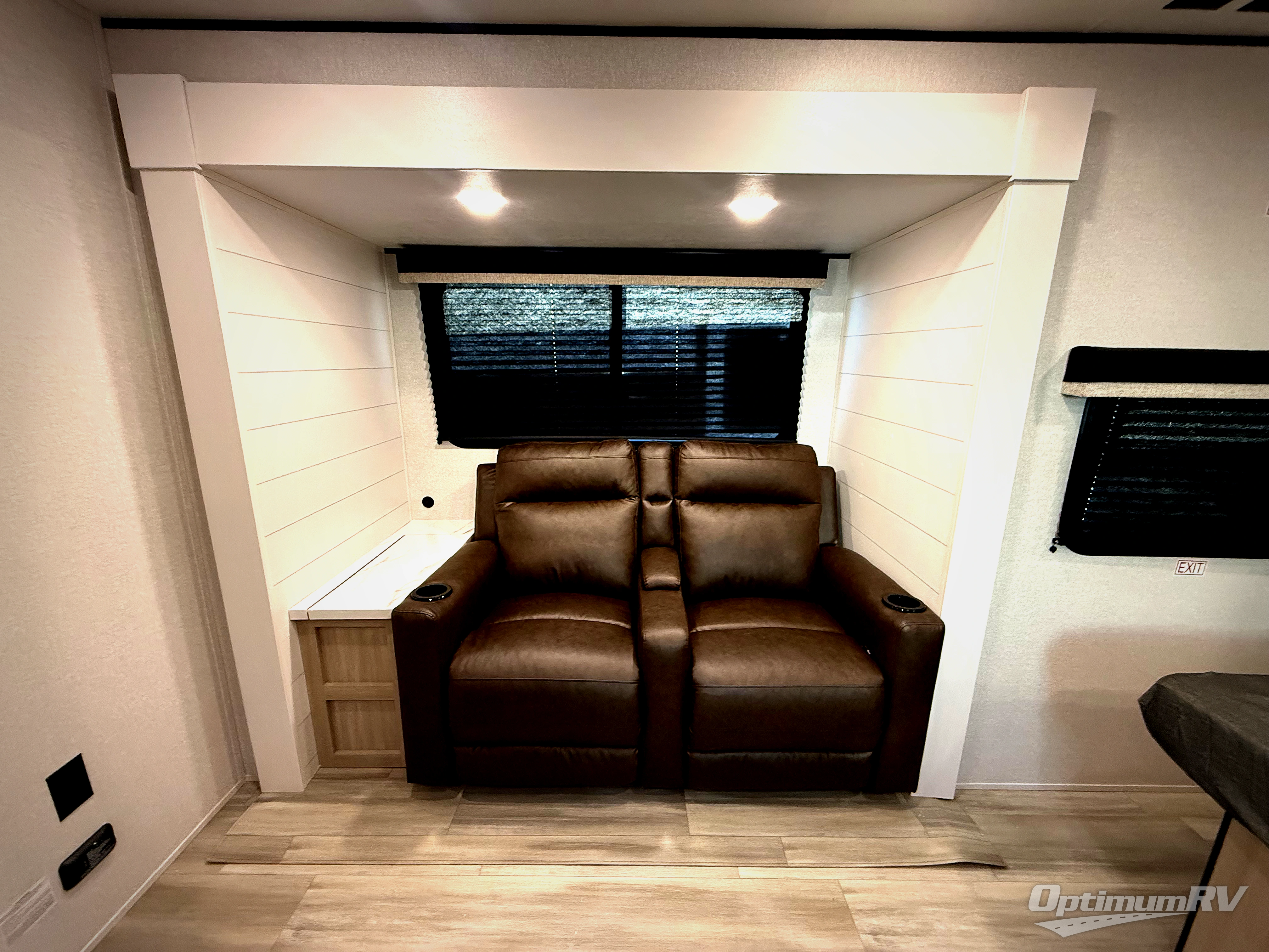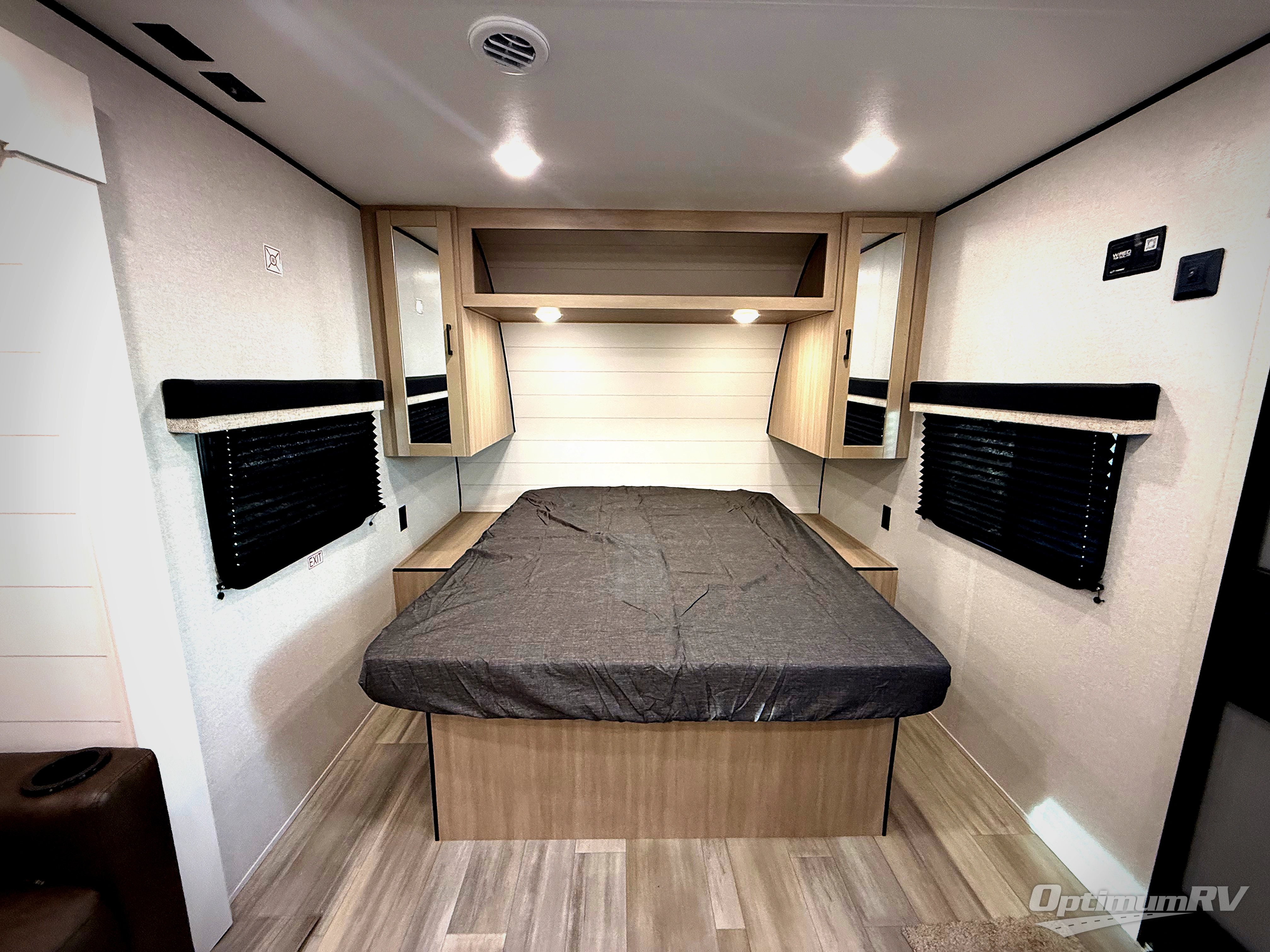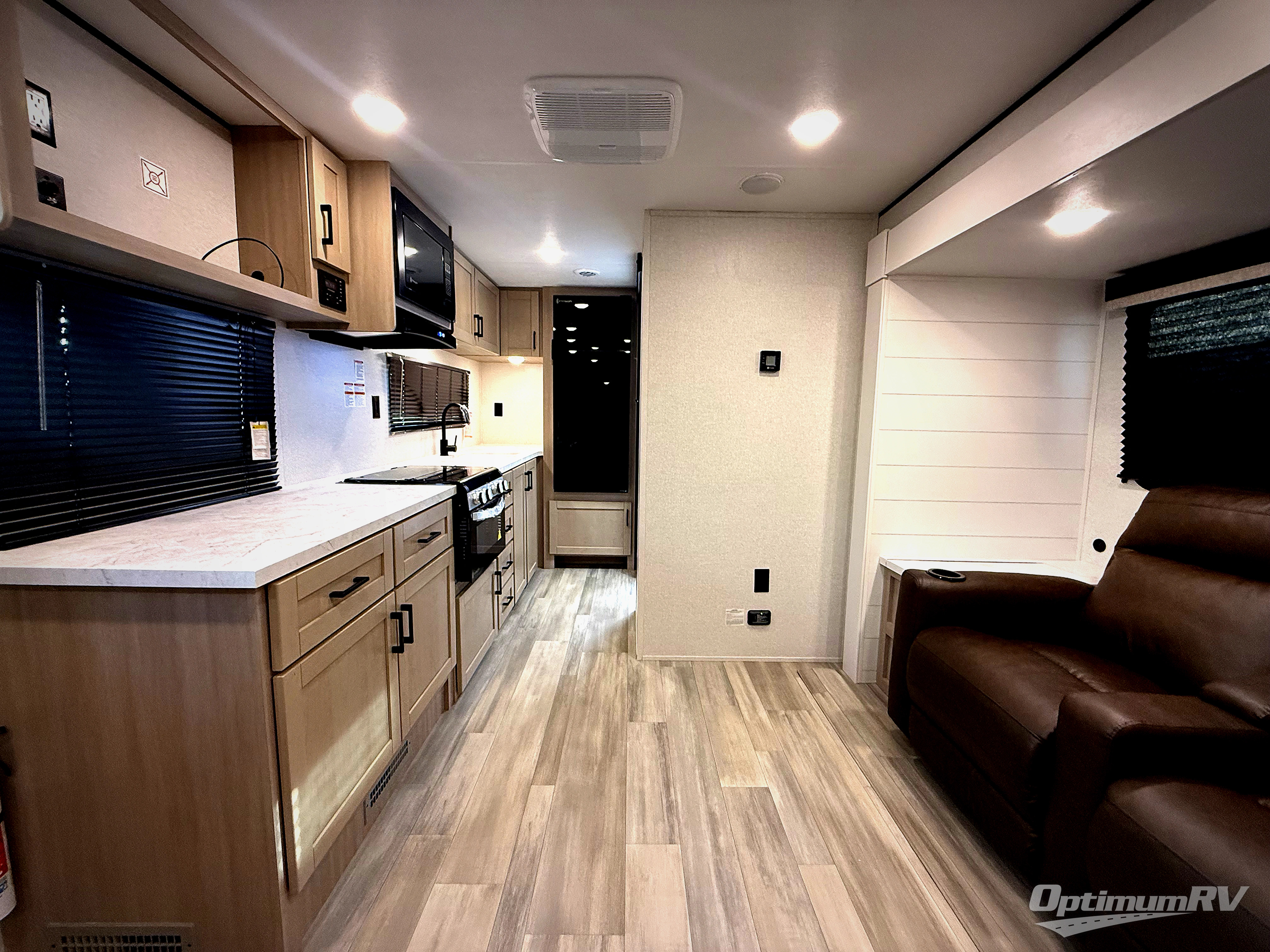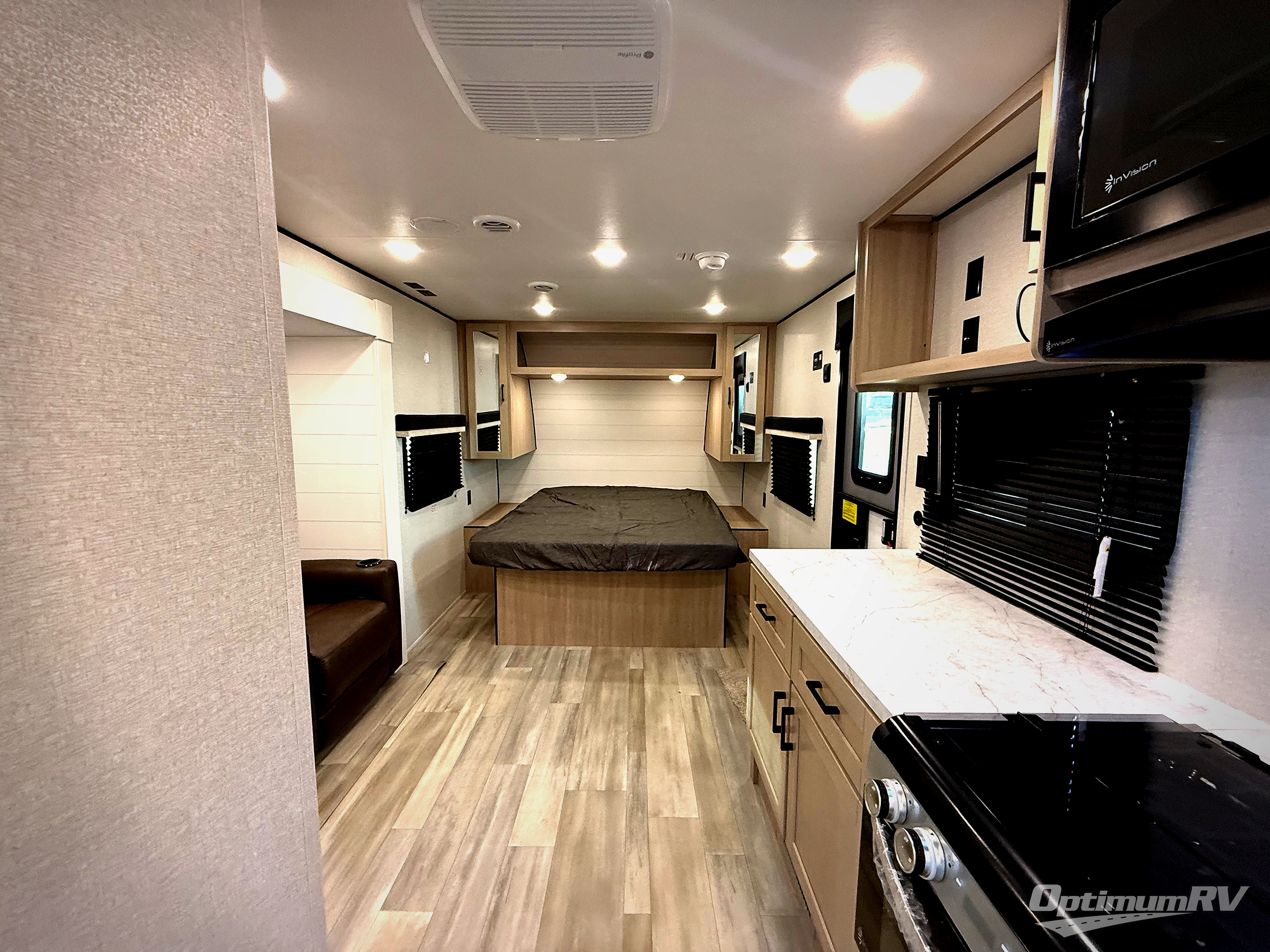 This is the perfect couple's trailer to take to the woods or lake! You can wake up each morning on the front queen bed, which also includes dual bedside wardrobes and overhead storage for your things. The rear corner kitchen includes a three-burner cooktop and microwave oven to make breakfast, and you can relax on the theater seating slide with cup holders and your coffee. And the full bath with a foot-flush toilet, sink, and 30" x 36" shower will let you clean up daily!