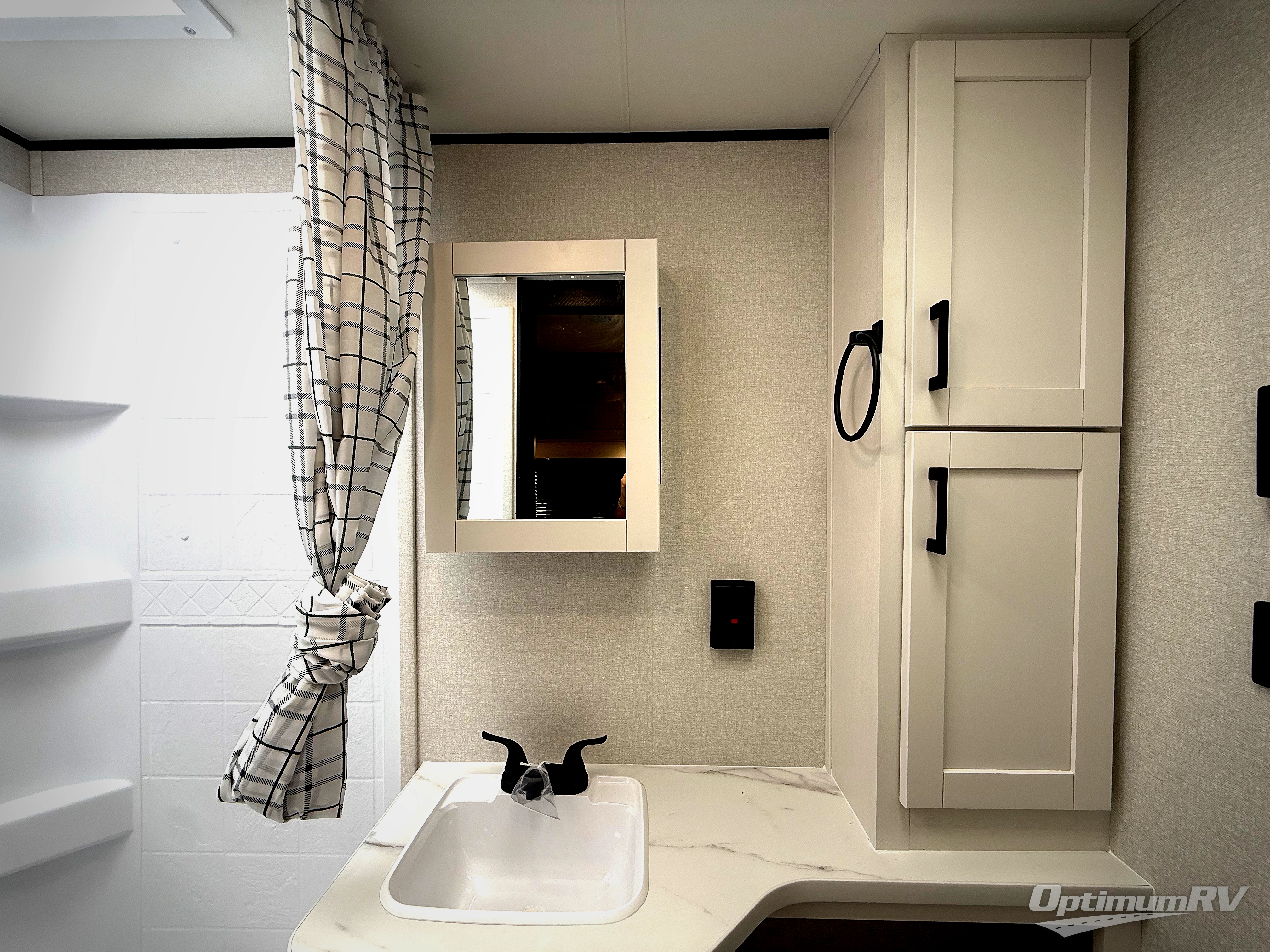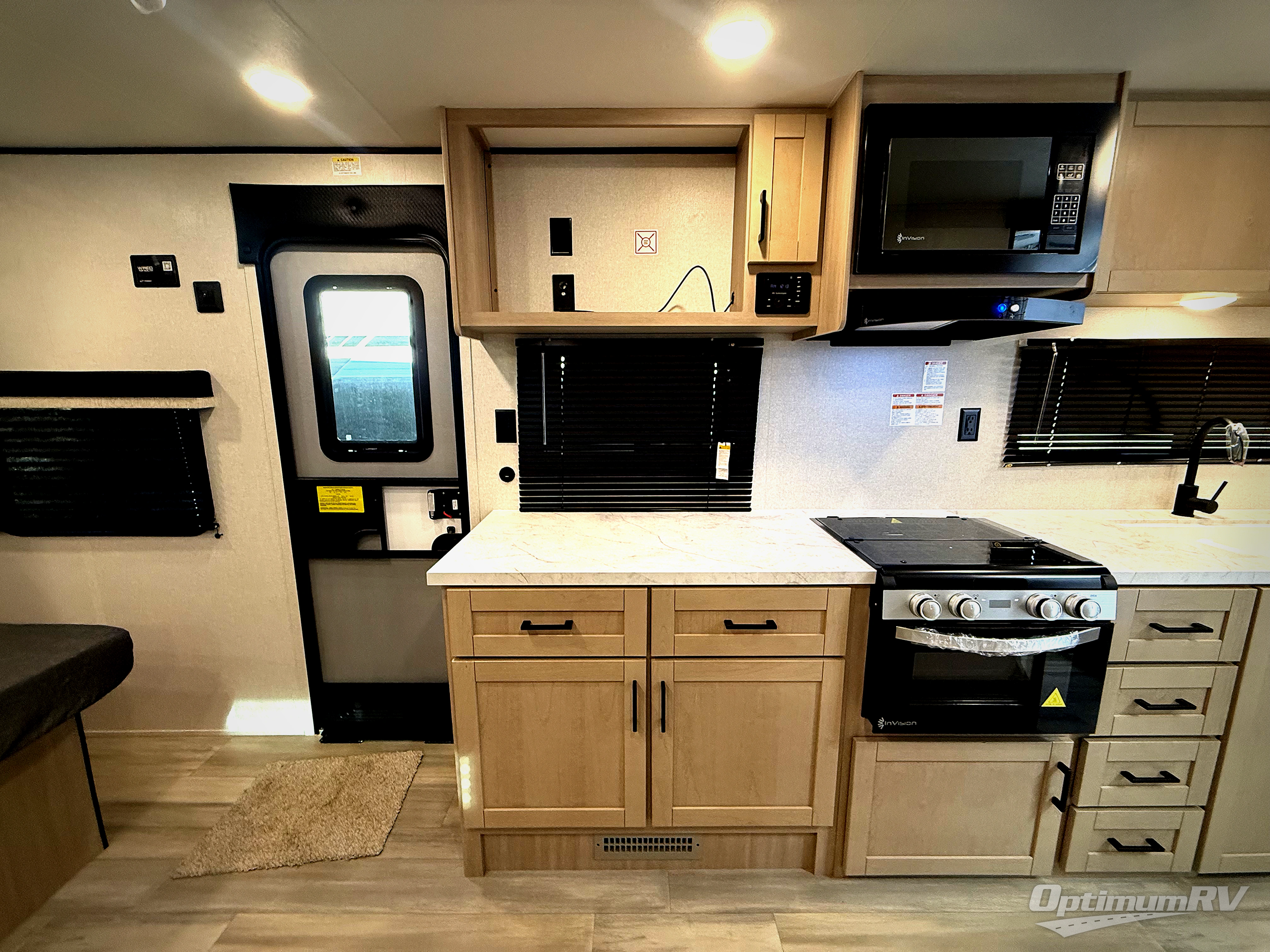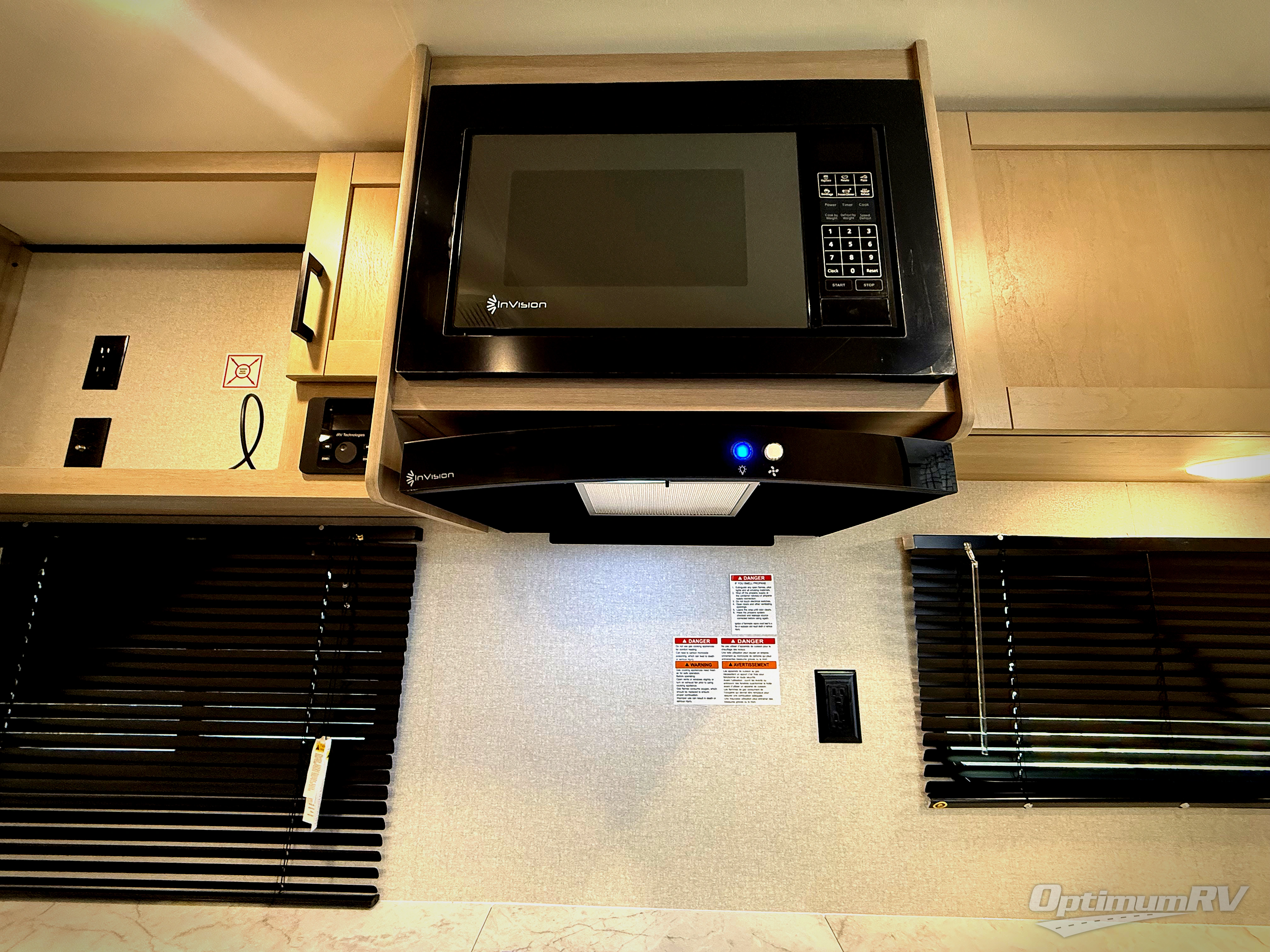 This is the perfect couple's trailer to take to the woods or lake! You can wake up each morning on the front queen bed, which also includes dual bedside wardrobes and overhead storage for your things. The rear corner kitchen includes a three-burner cooktop and microwave oven to make breakfast, and you can relax on the theater seating slide with cup holders and your coffee. And the full bath with a foot-flush toilet, sink, and 30" x 36" shower will let you clean up daily!