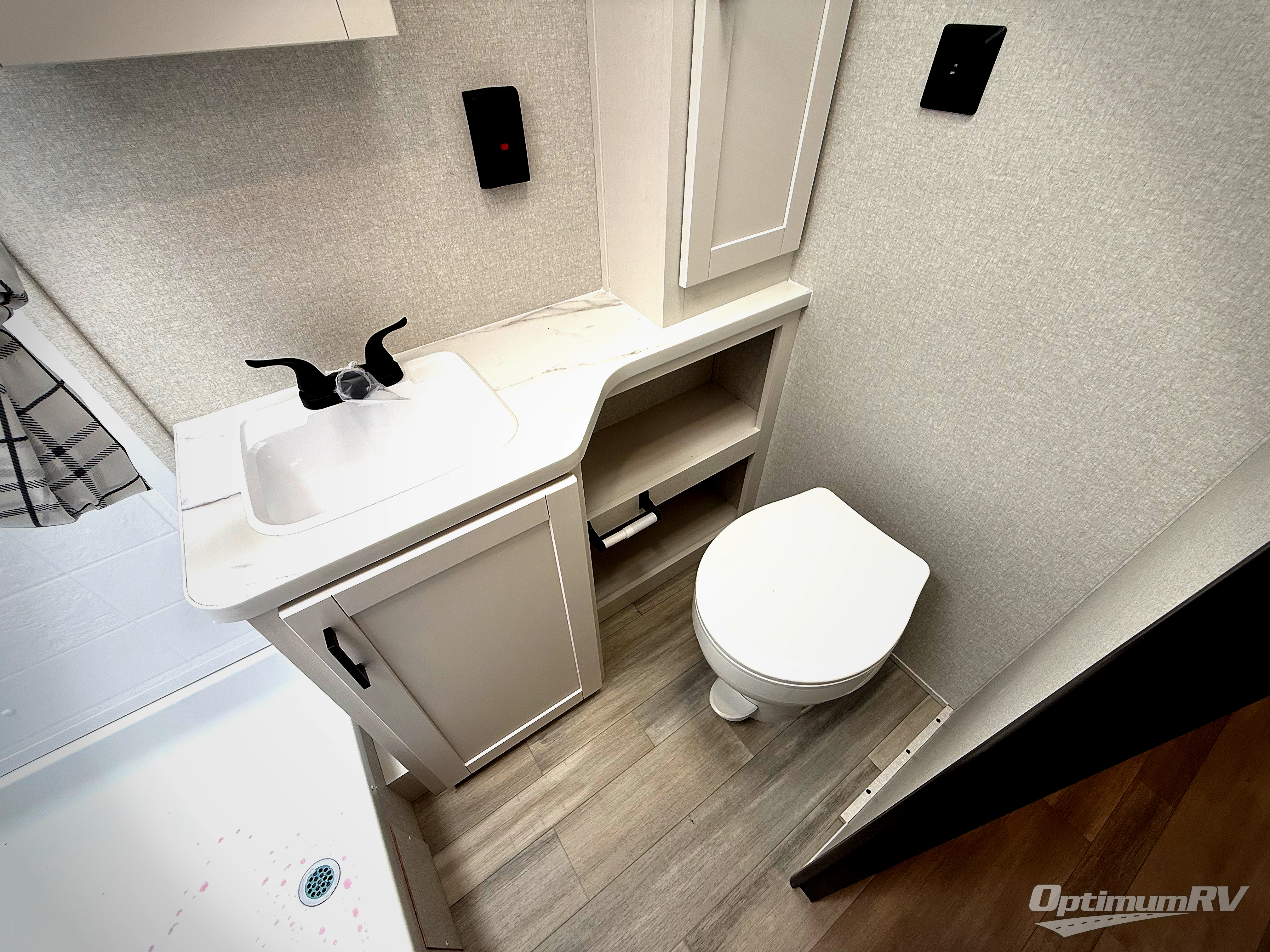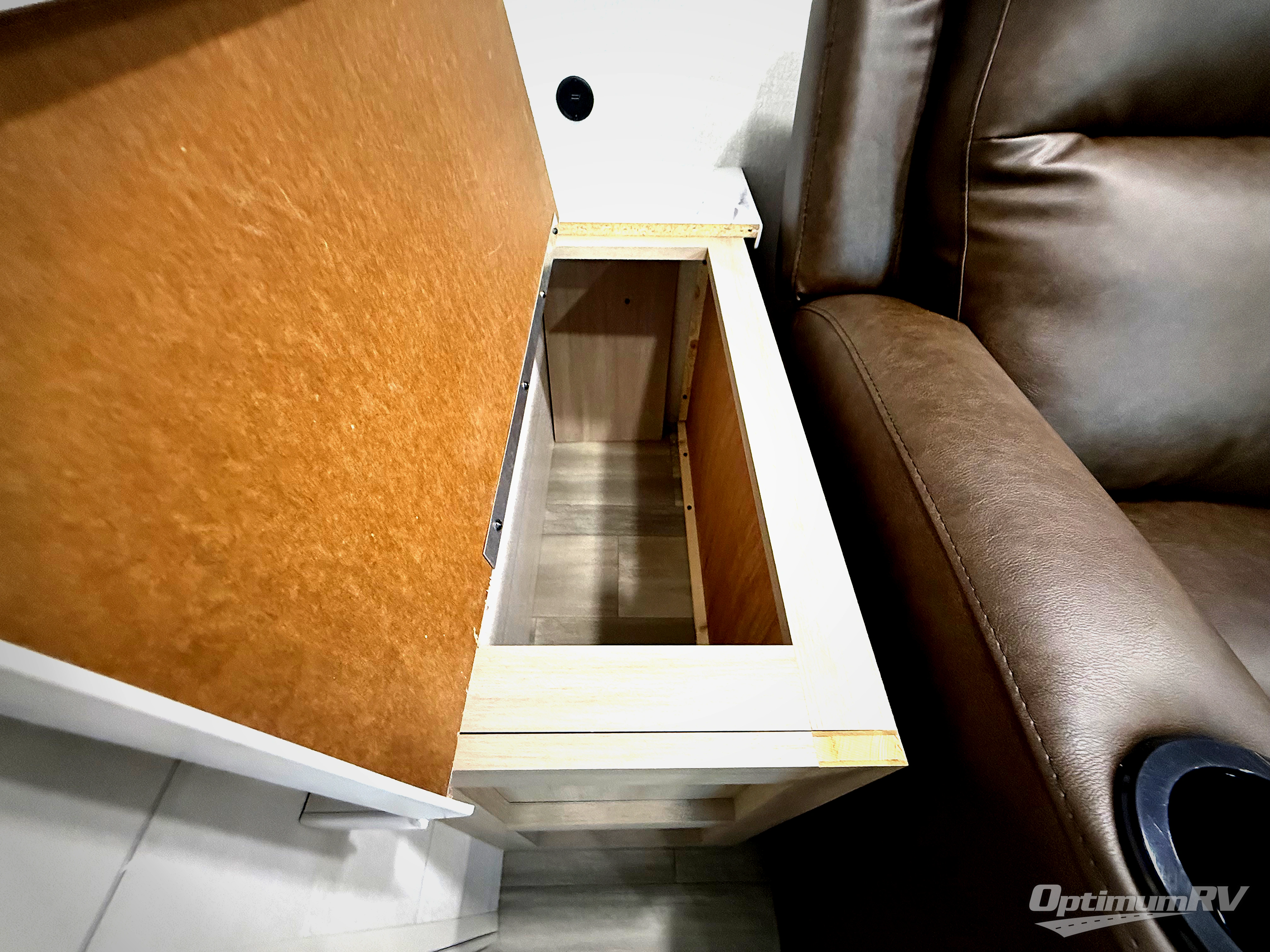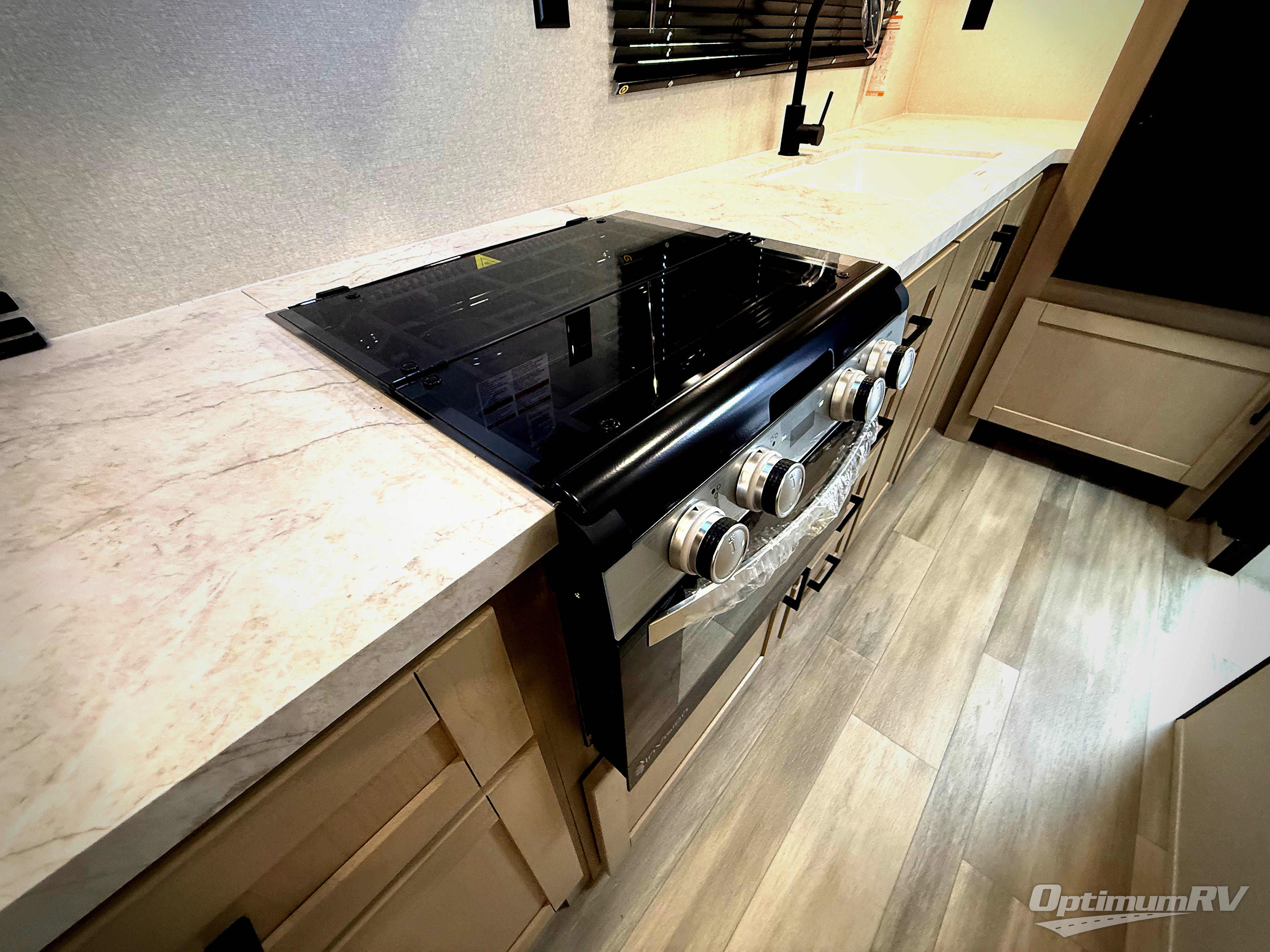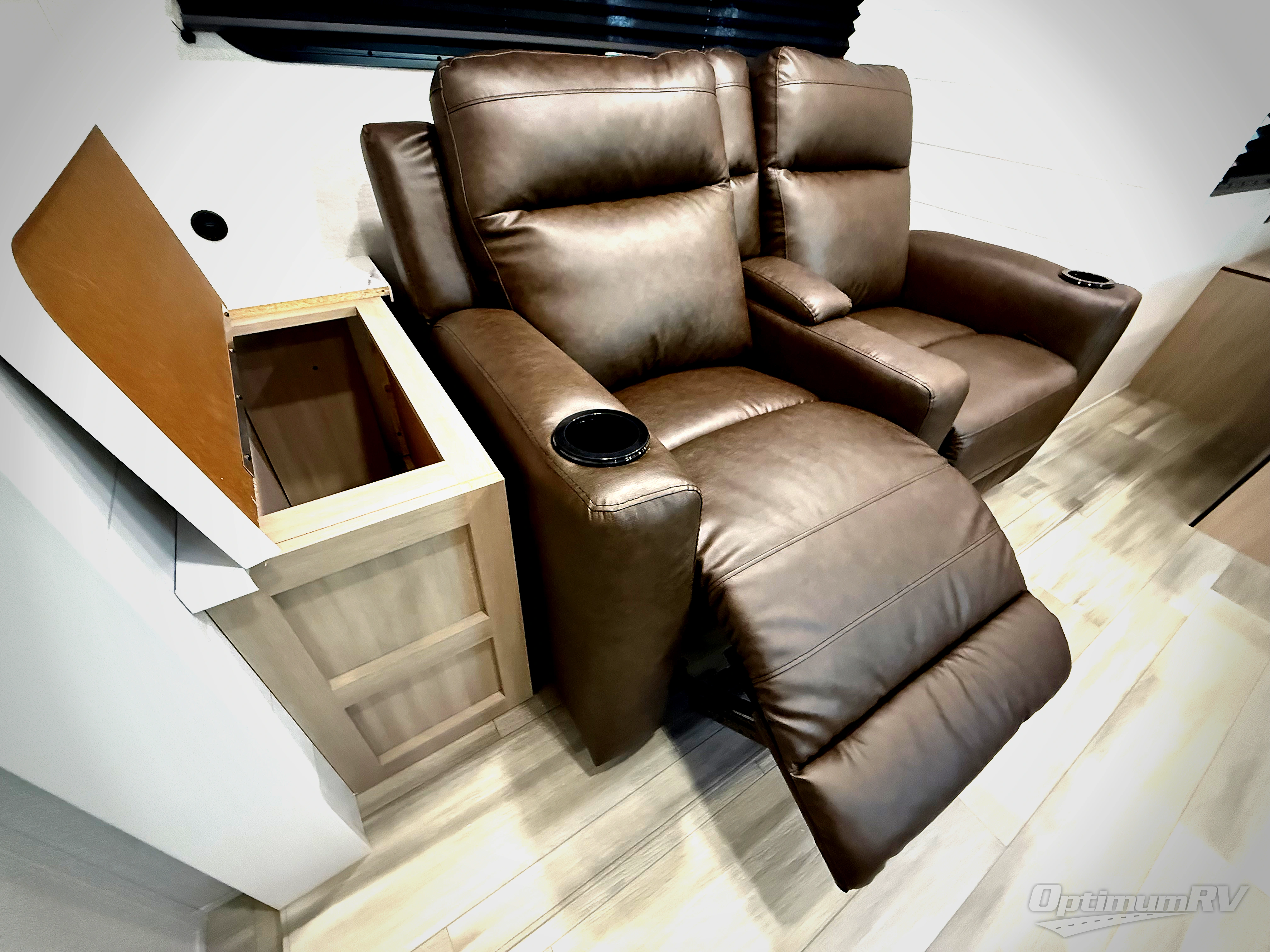 This is the perfect couple's trailer to take to the woods or lake! You can wake up each morning on the front queen bed, which also includes dual bedside wardrobes and overhead storage for your things. The rear corner kitchen includes a three-burner cooktop and microwave oven to make breakfast, and you can relax on the theater seating slide with cup holders and your coffee. And the full bath with a foot-flush toilet, sink, and 30" x 36" shower will let you clean up daily!