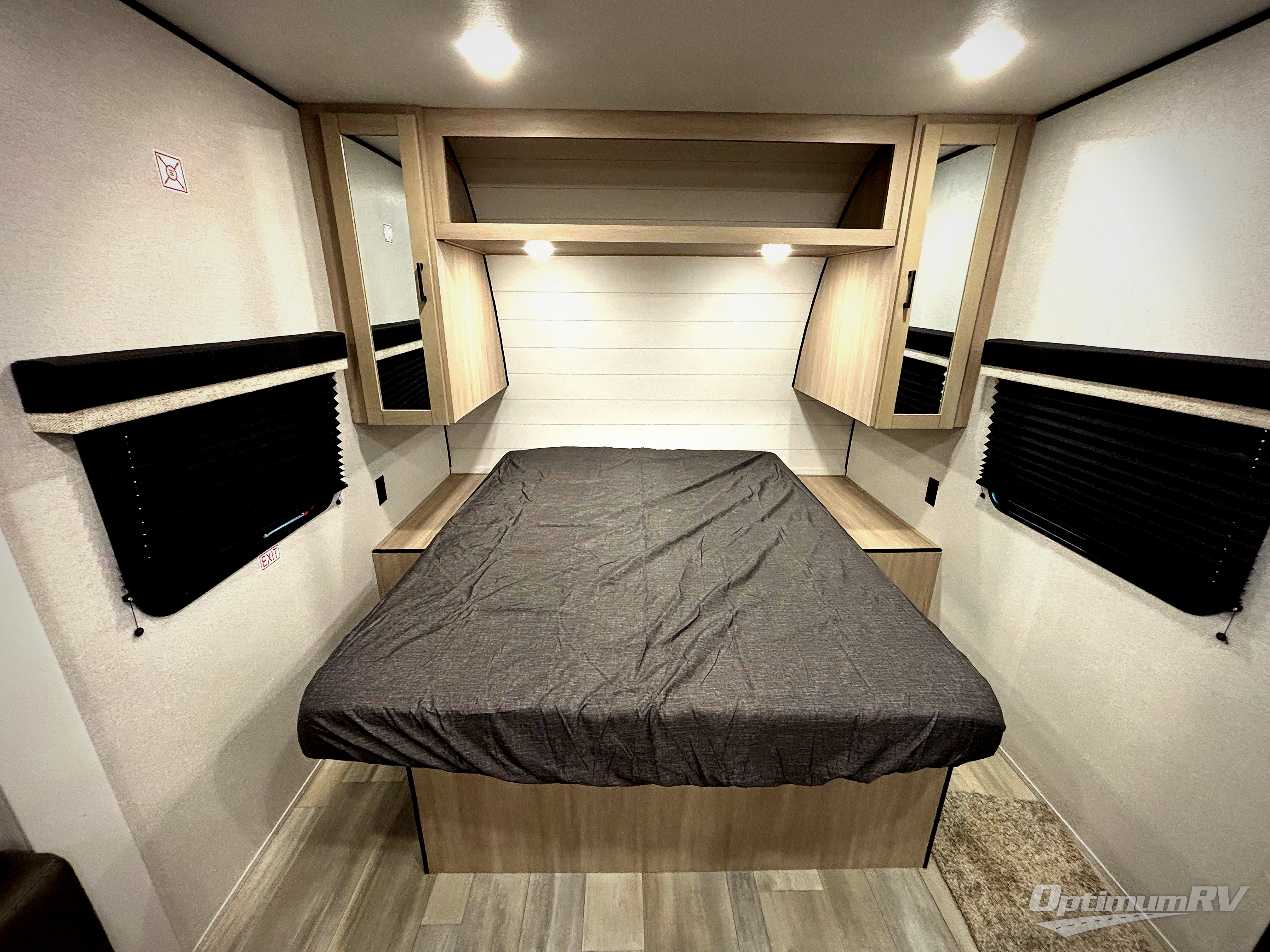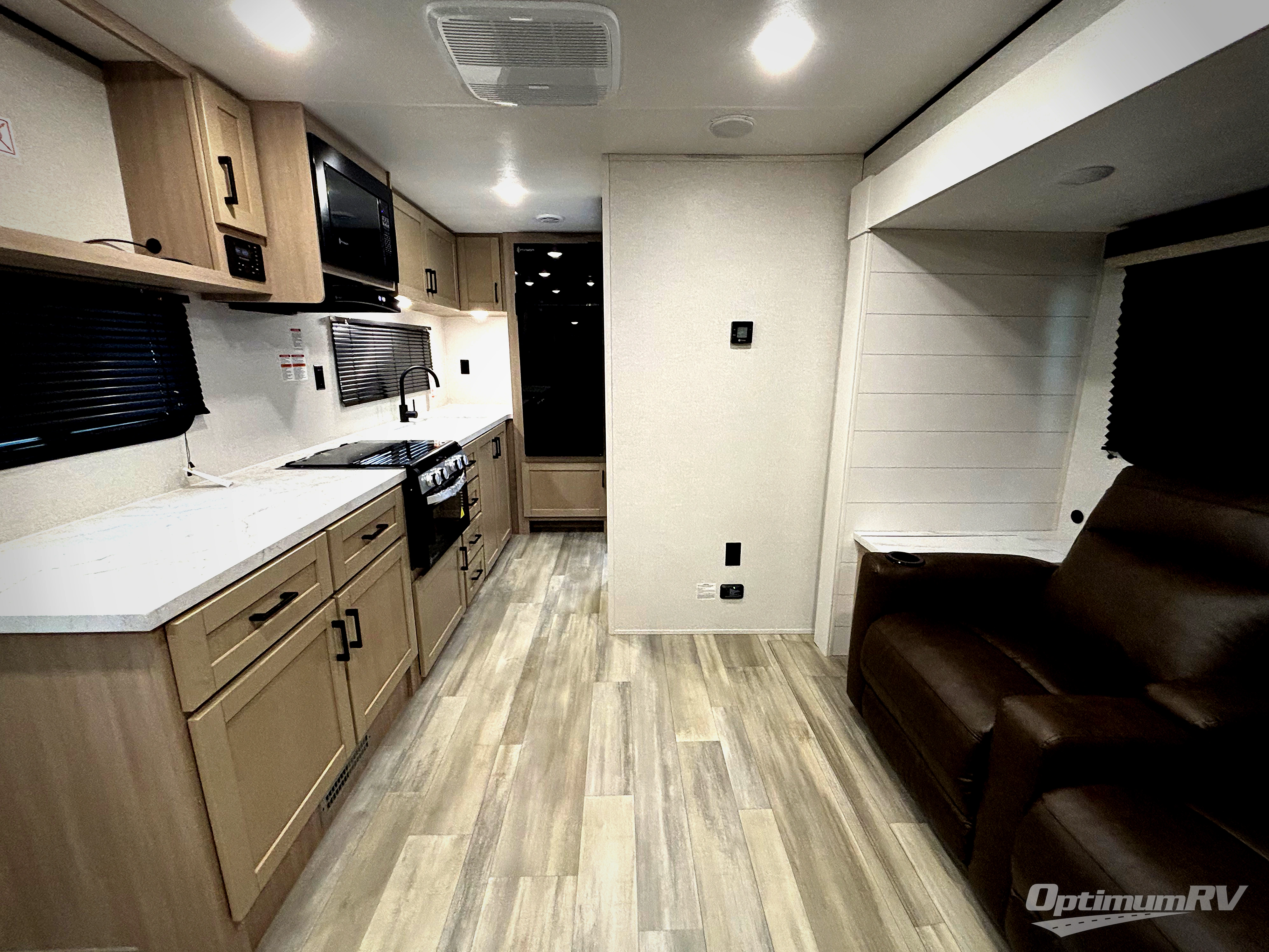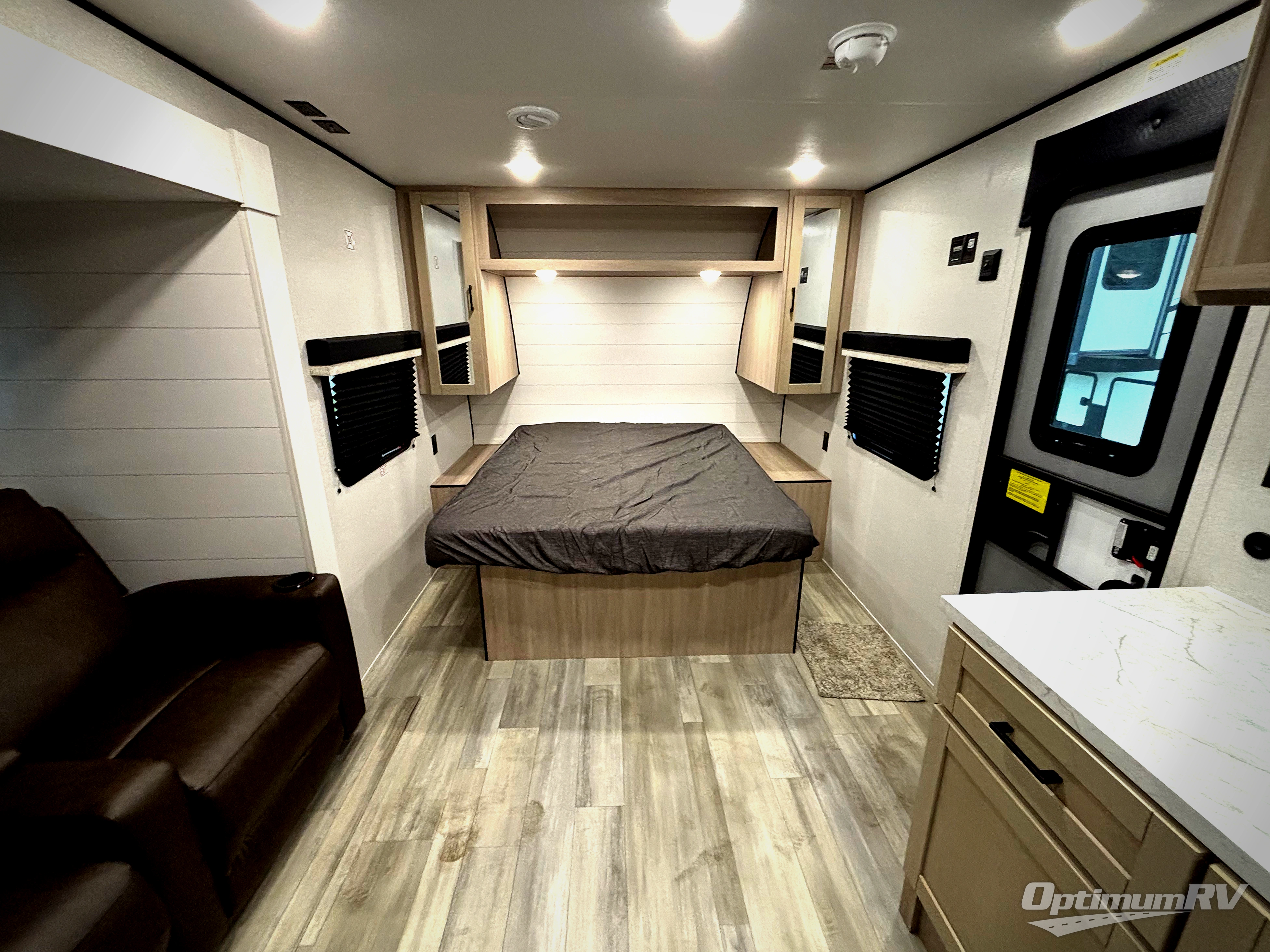 This is the perfect couple's trailer to take to the woods or lake! You can wake up each morning on the front queen bed, which also includes dual bedside wardrobes and overhead storage for your things. The rear corner kitchen includes a three-burner cooktop and microwave oven to make breakfast, and you can relax on the theater seating slide with cup holders and your coffee. And the full bath with a foot-flush toilet, sink, and 30" x 36" shower will let you clean up daily!