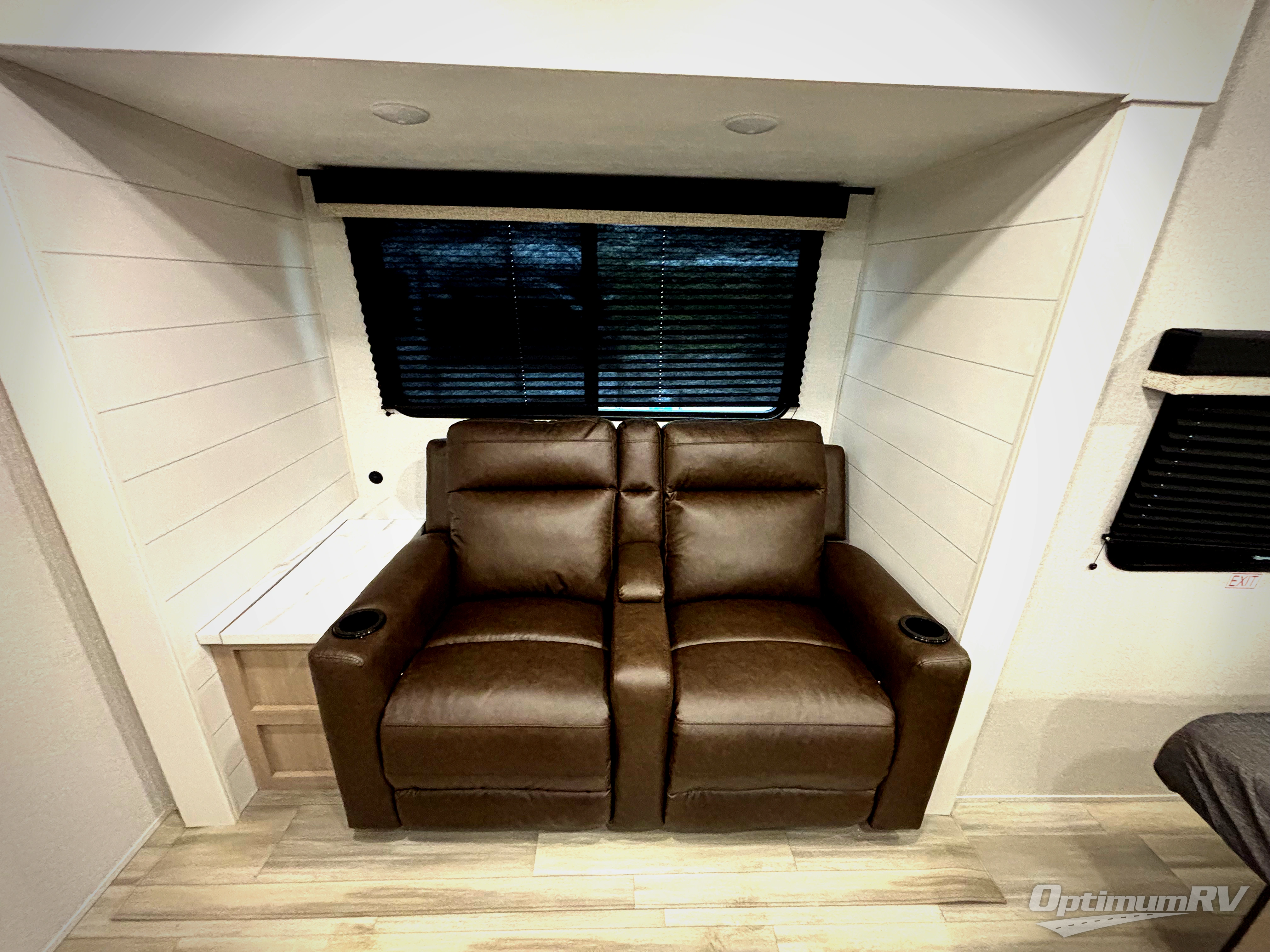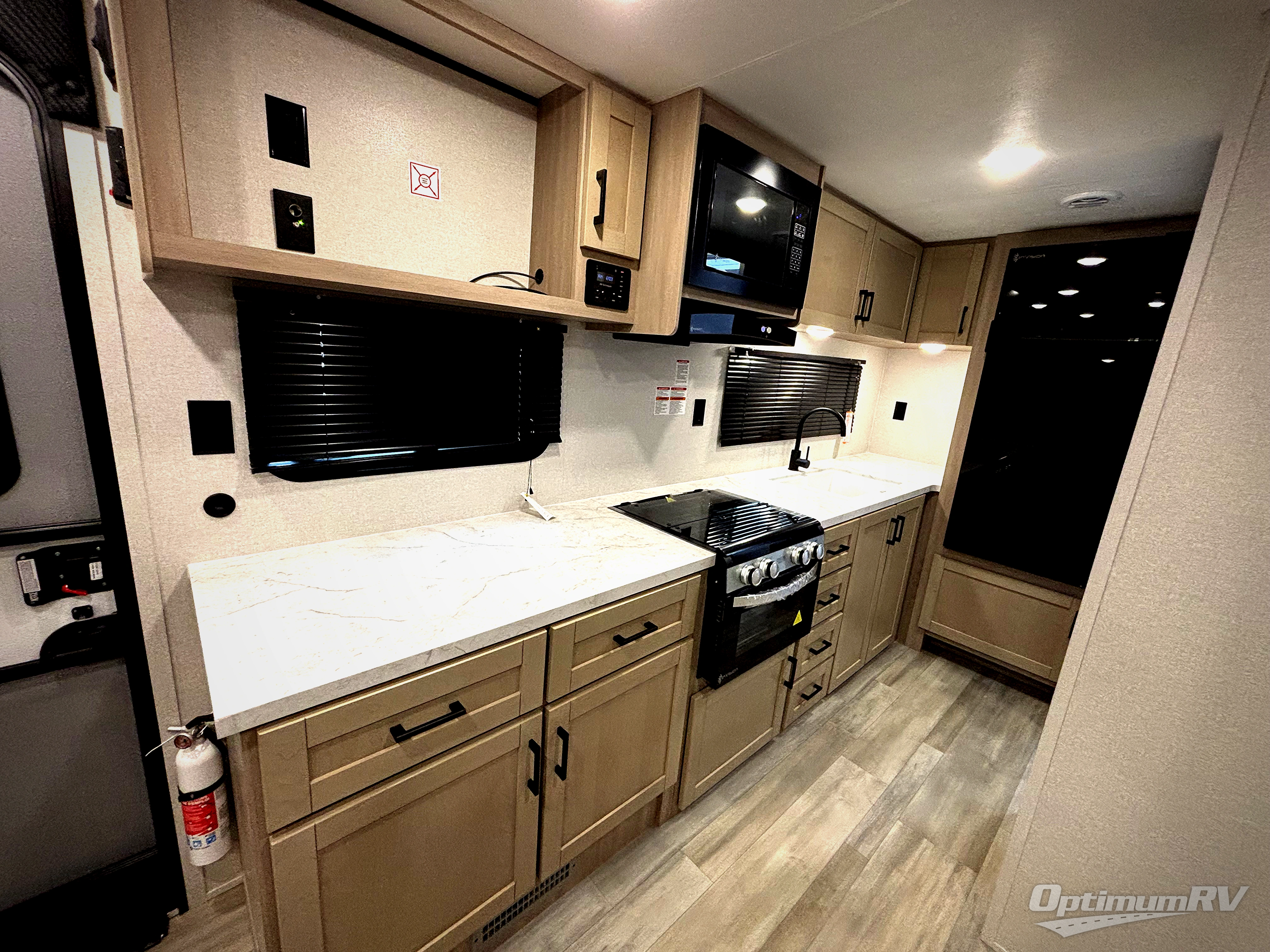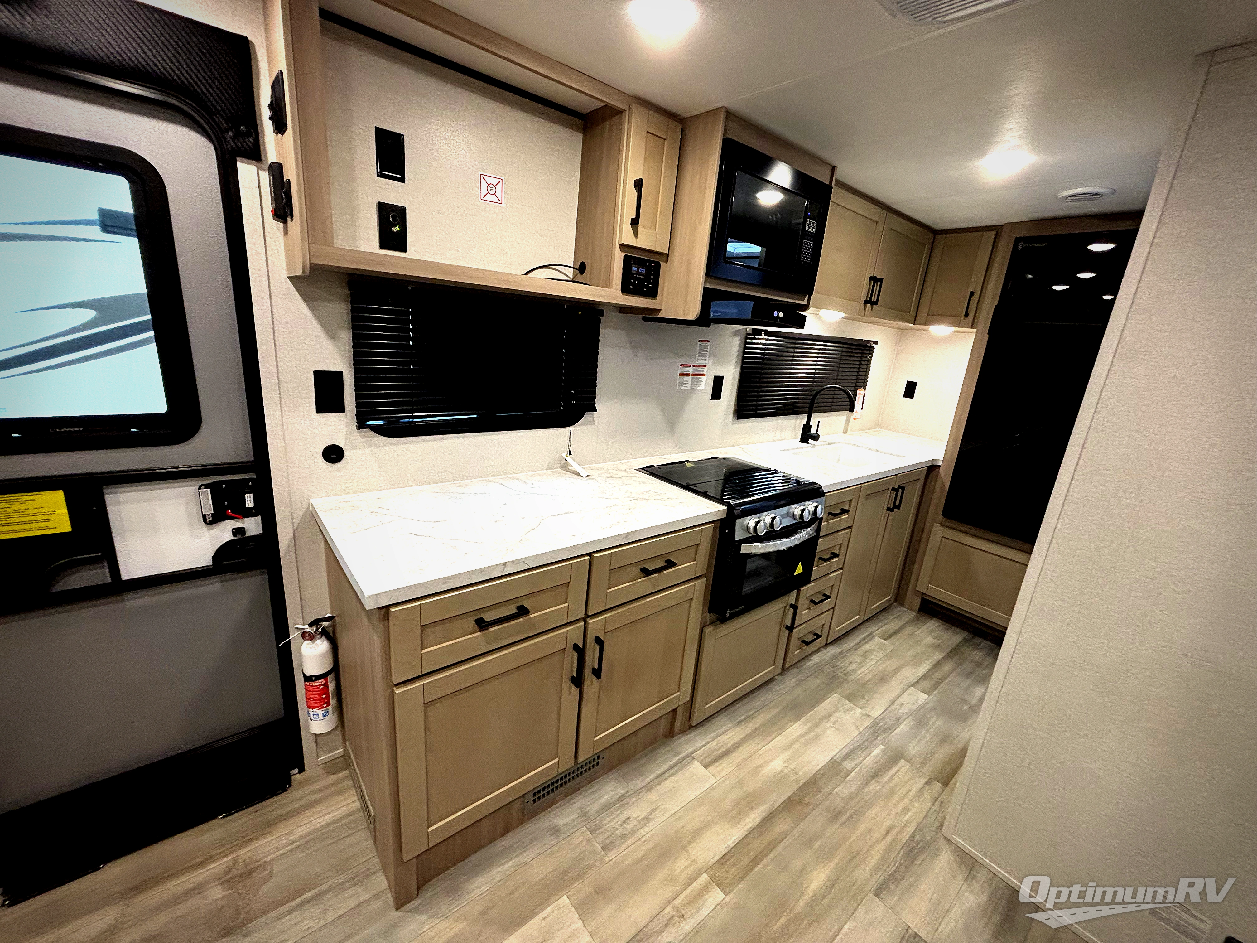 This is the perfect couple's trailer to take to the woods or lake! You can wake up each morning on the front queen bed, which also includes dual bedside wardrobes and overhead storage for your things. The rear corner kitchen includes a three-burner cooktop and microwave oven to make breakfast, and you can relax on the theater seating slide with cup holders and your coffee. And the full bath with a foot-flush toilet, sink, and 30" x 36" shower will let you clean up daily!