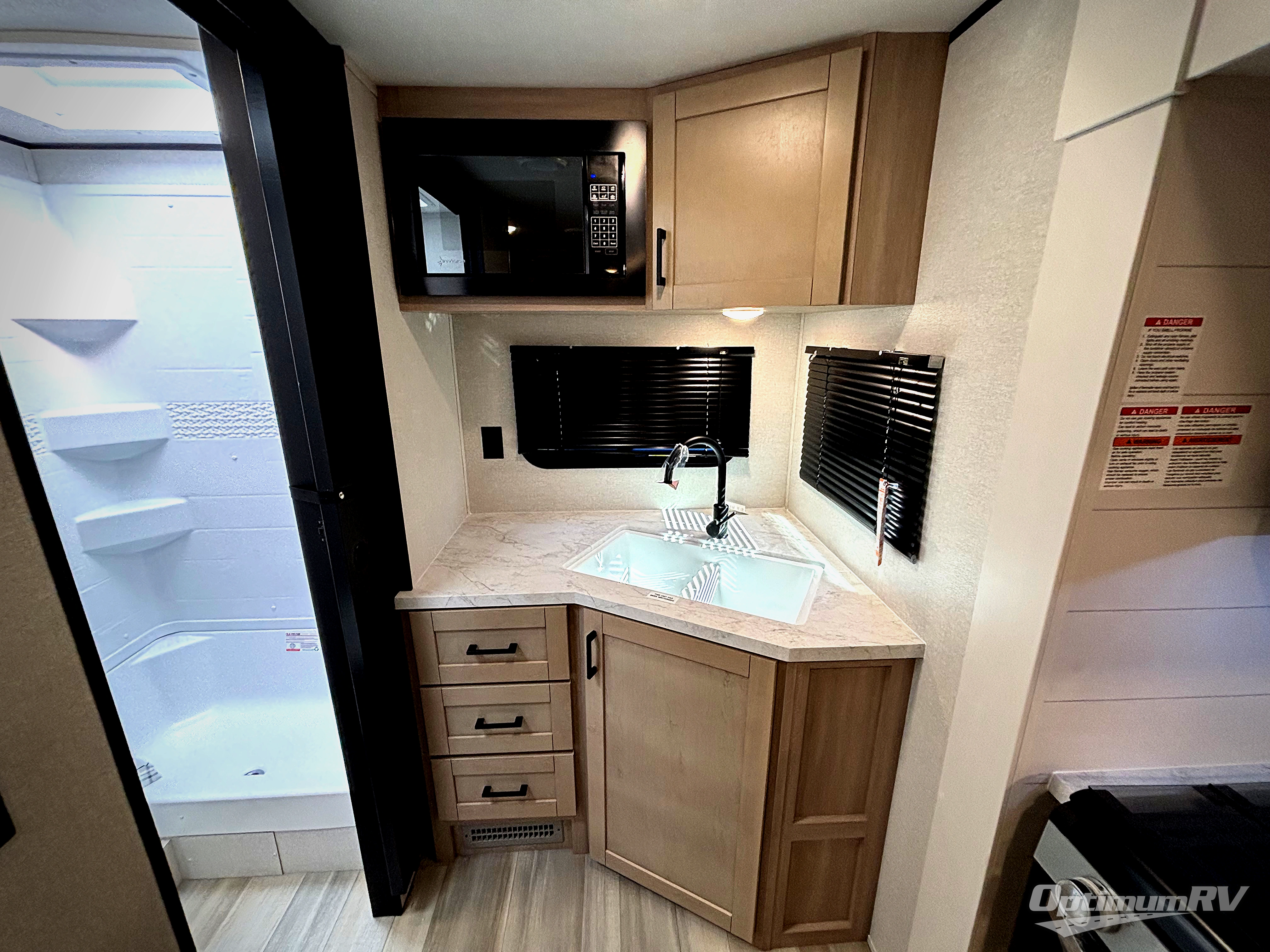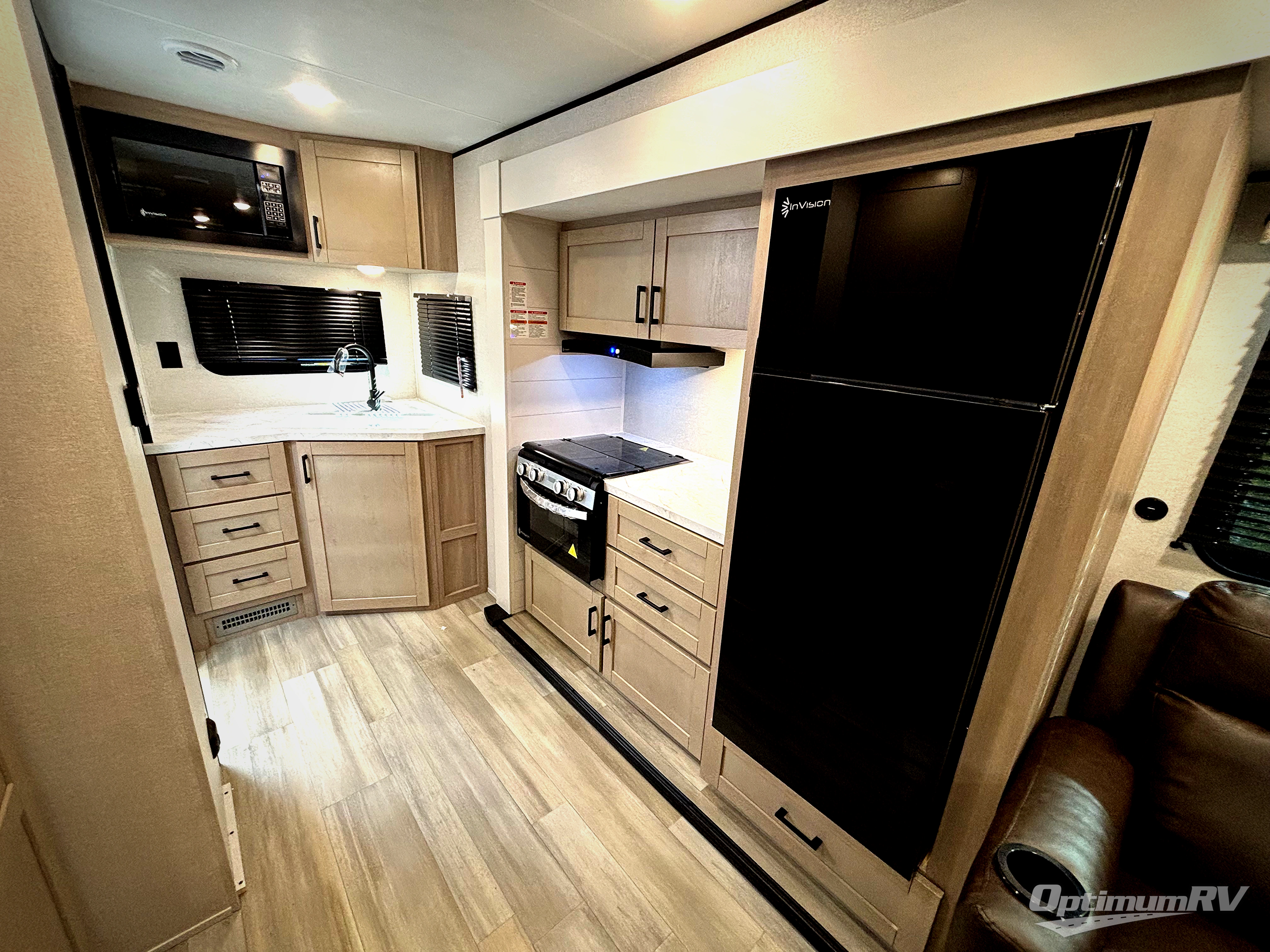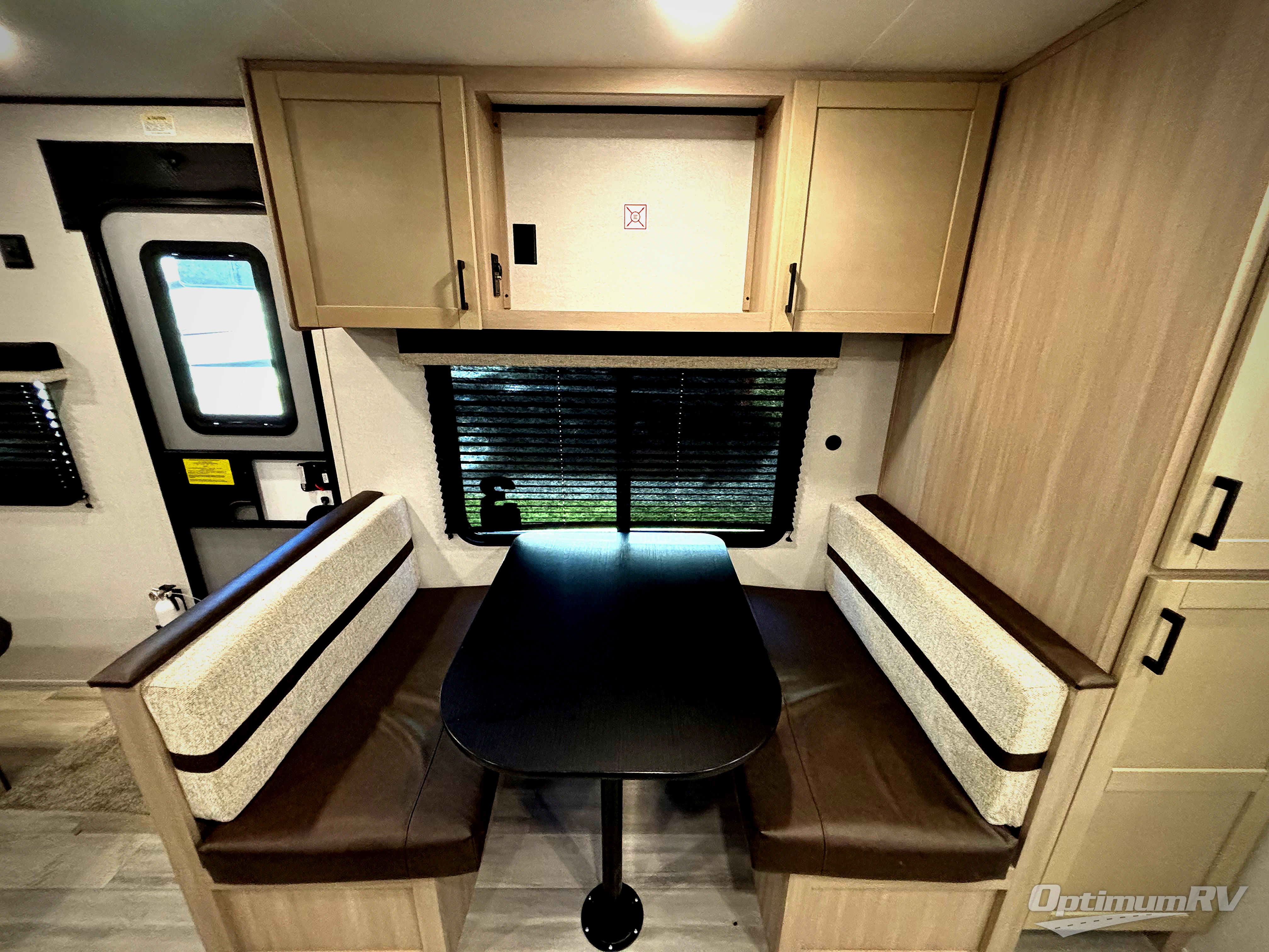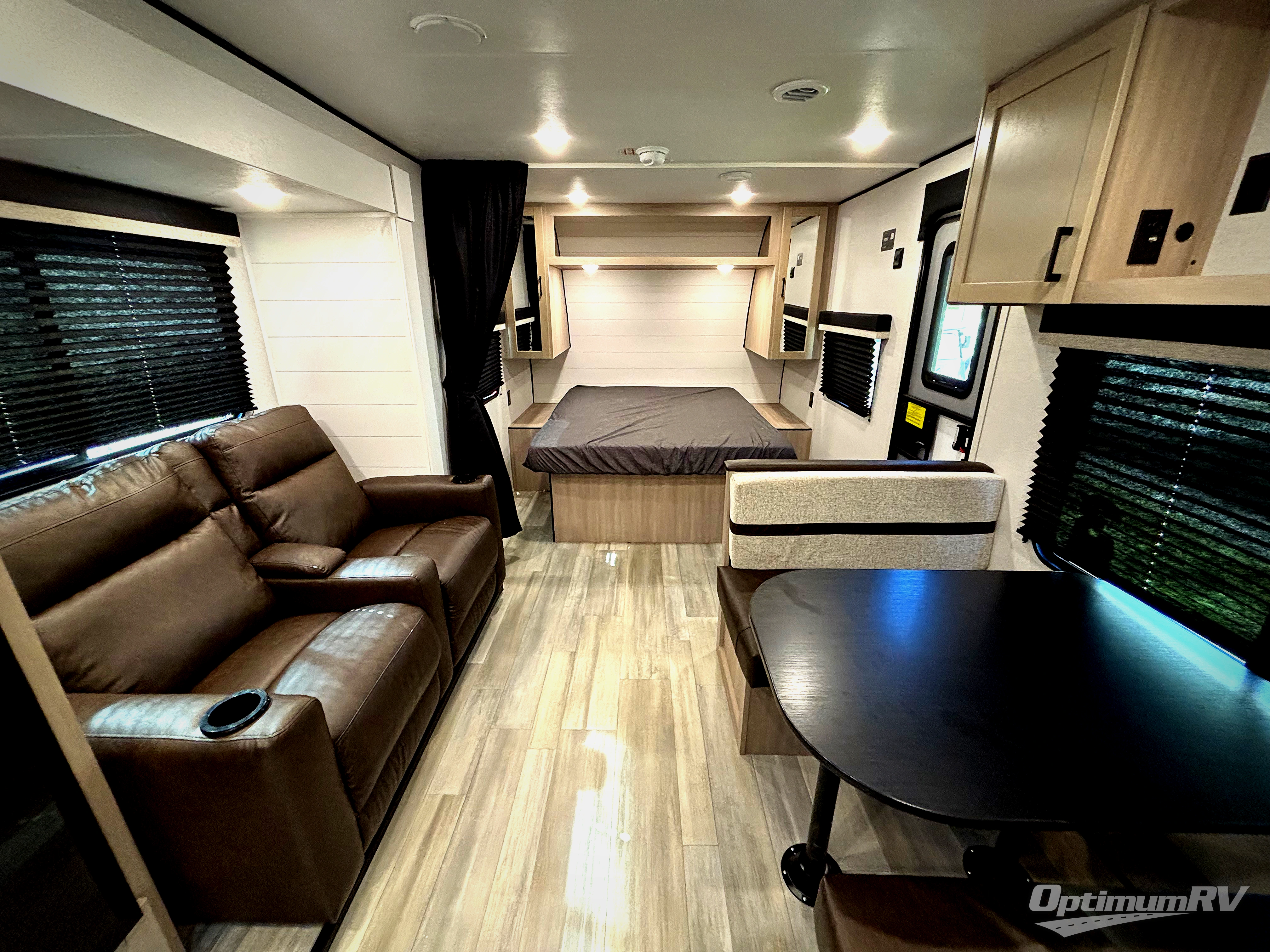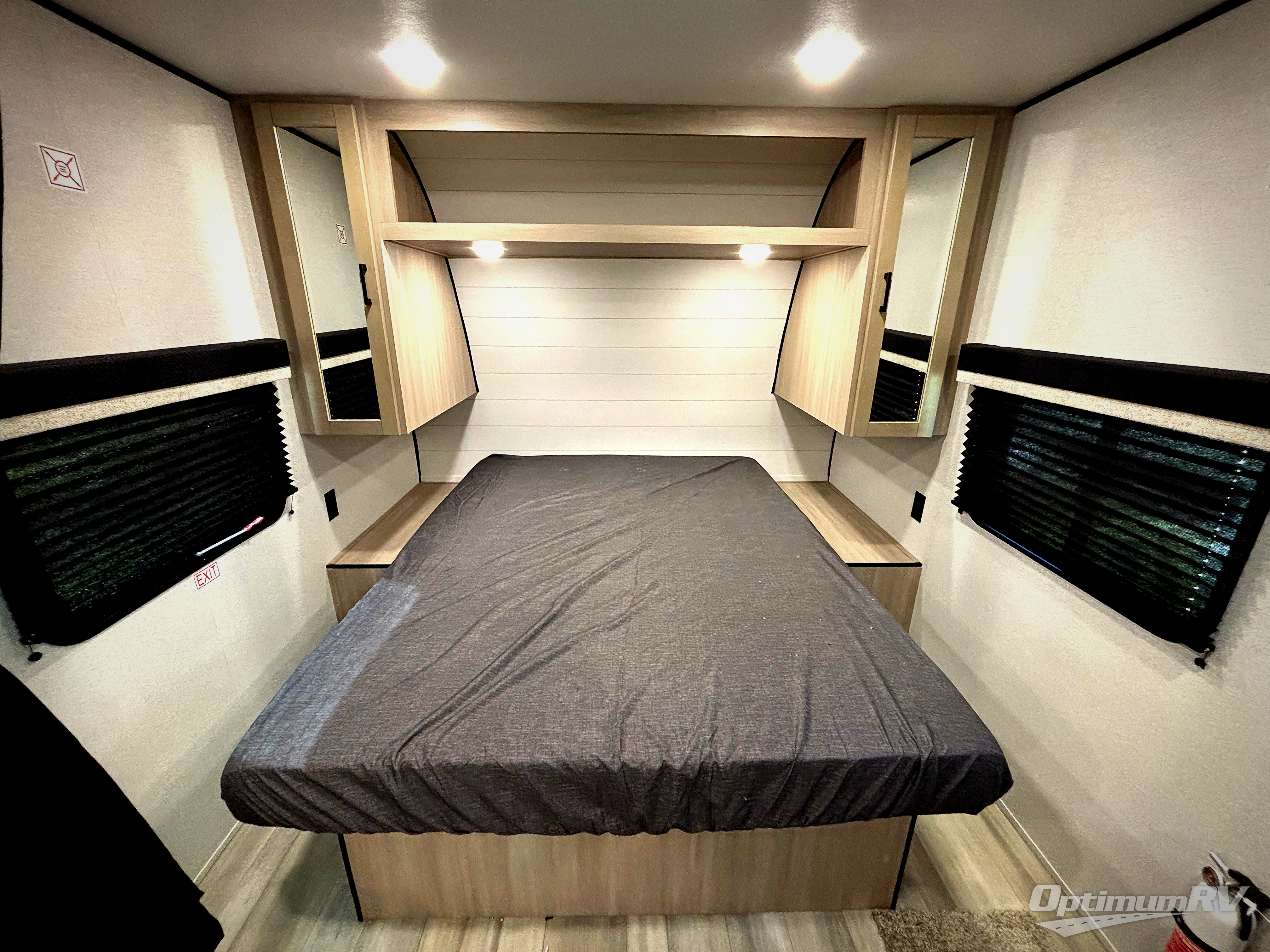 You'll love having your own space in this travel trailer thanks to the front bedroom with a queen bed, dual bedside wardrobes, and privacy curtain. A large slide out provides more space to move about, and there is theater seating here to relax in the evenings. You can make meals on the three-burner cooktop or in the microwave oven, and you can dine at the booth dinette. This unit also includes a 12V refrigerator and pantry for food storge plus ample overhead cabinets for your personal belongings.