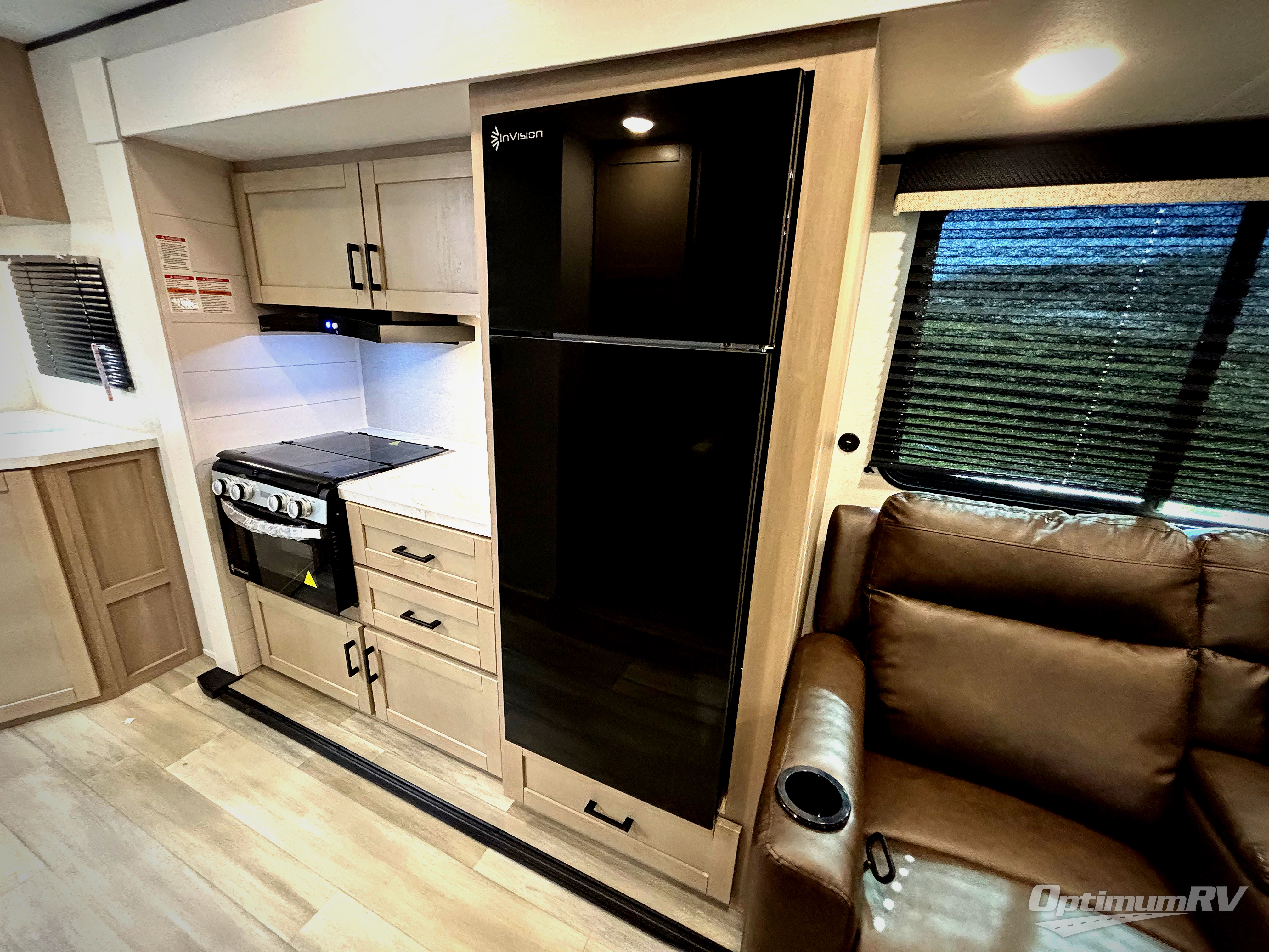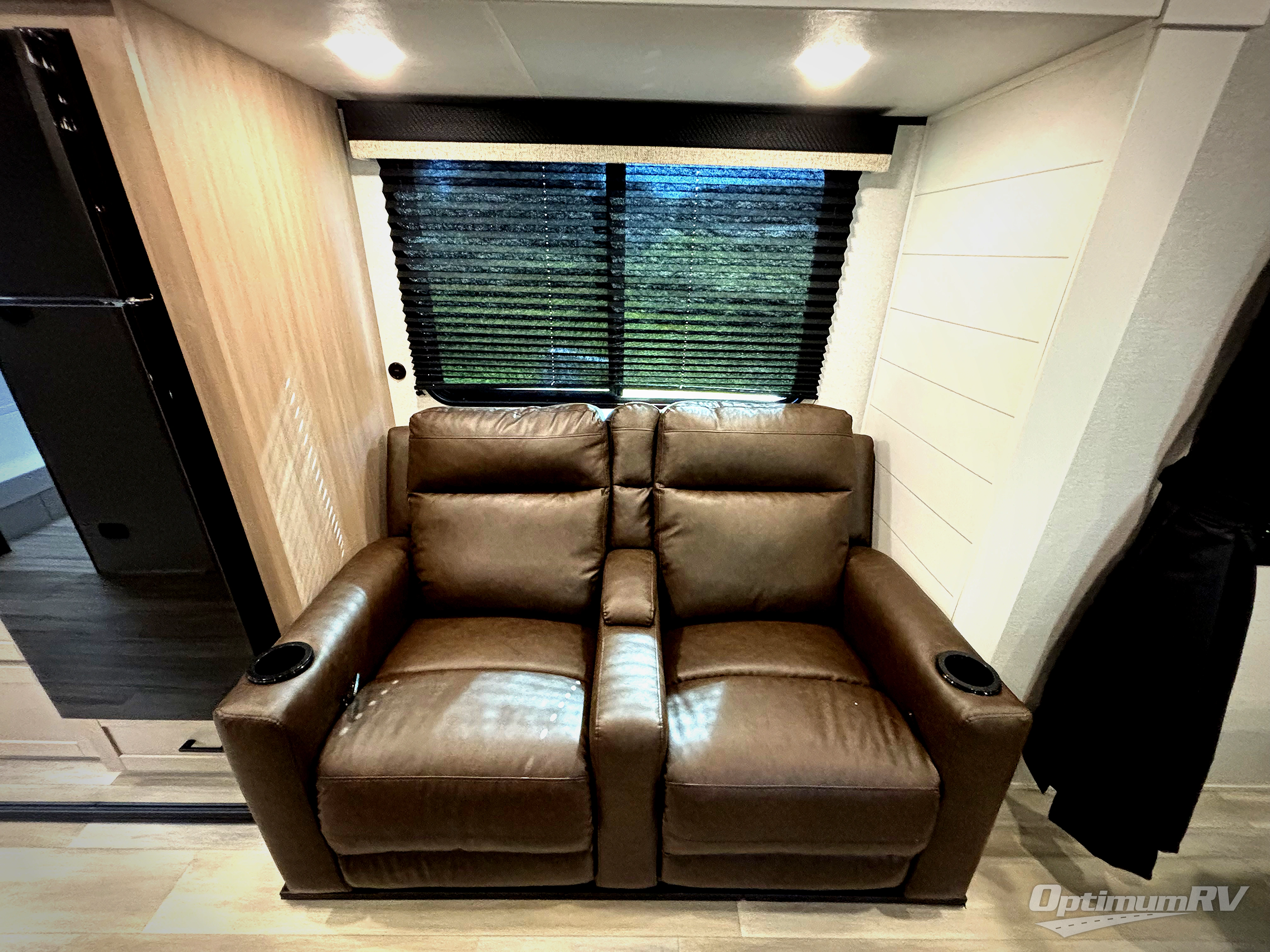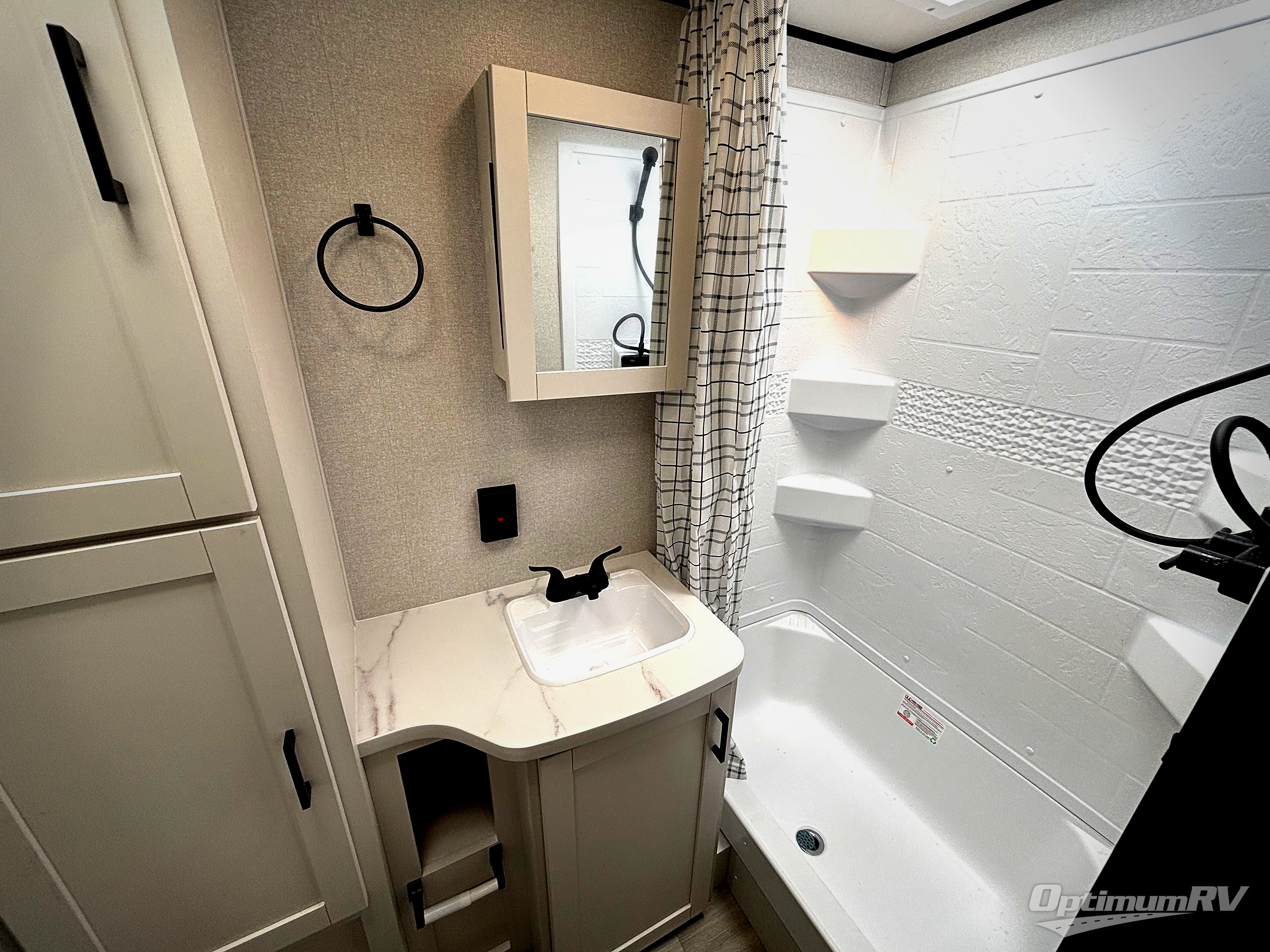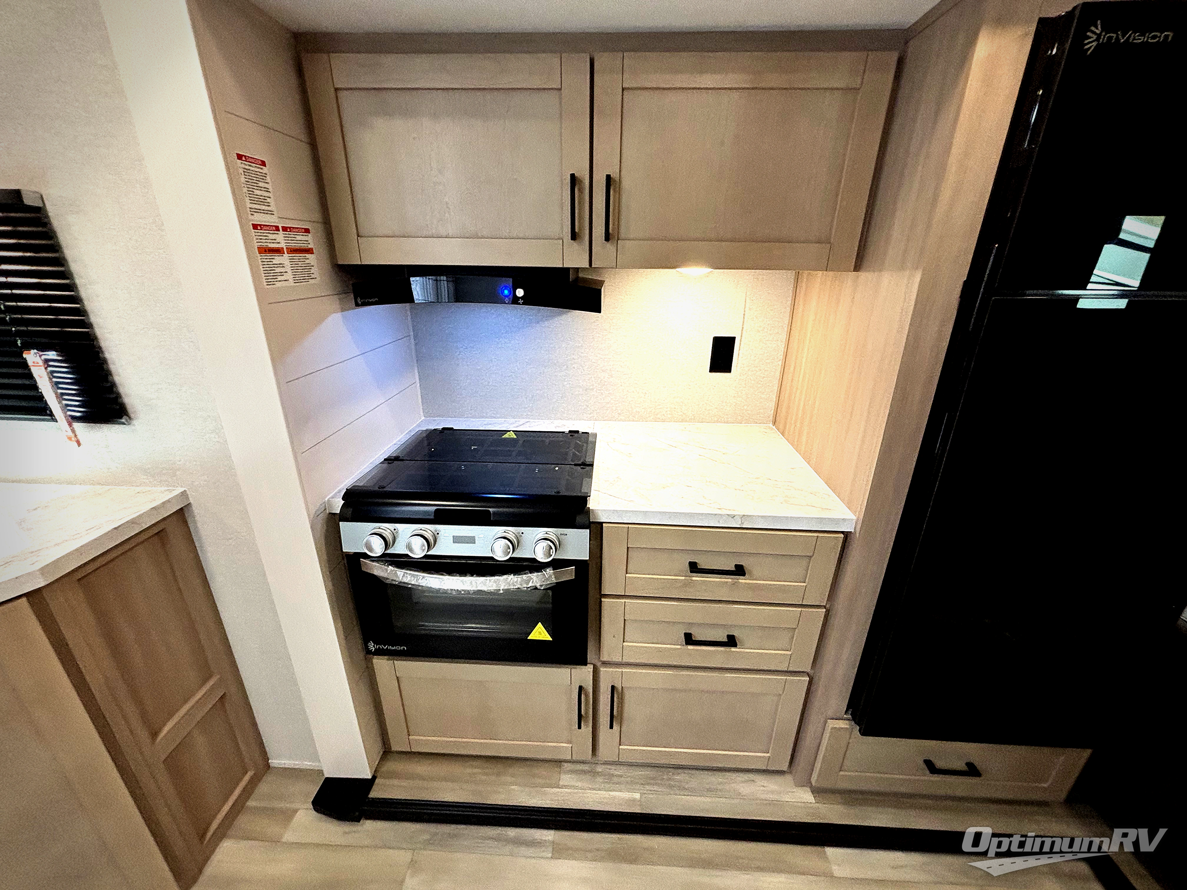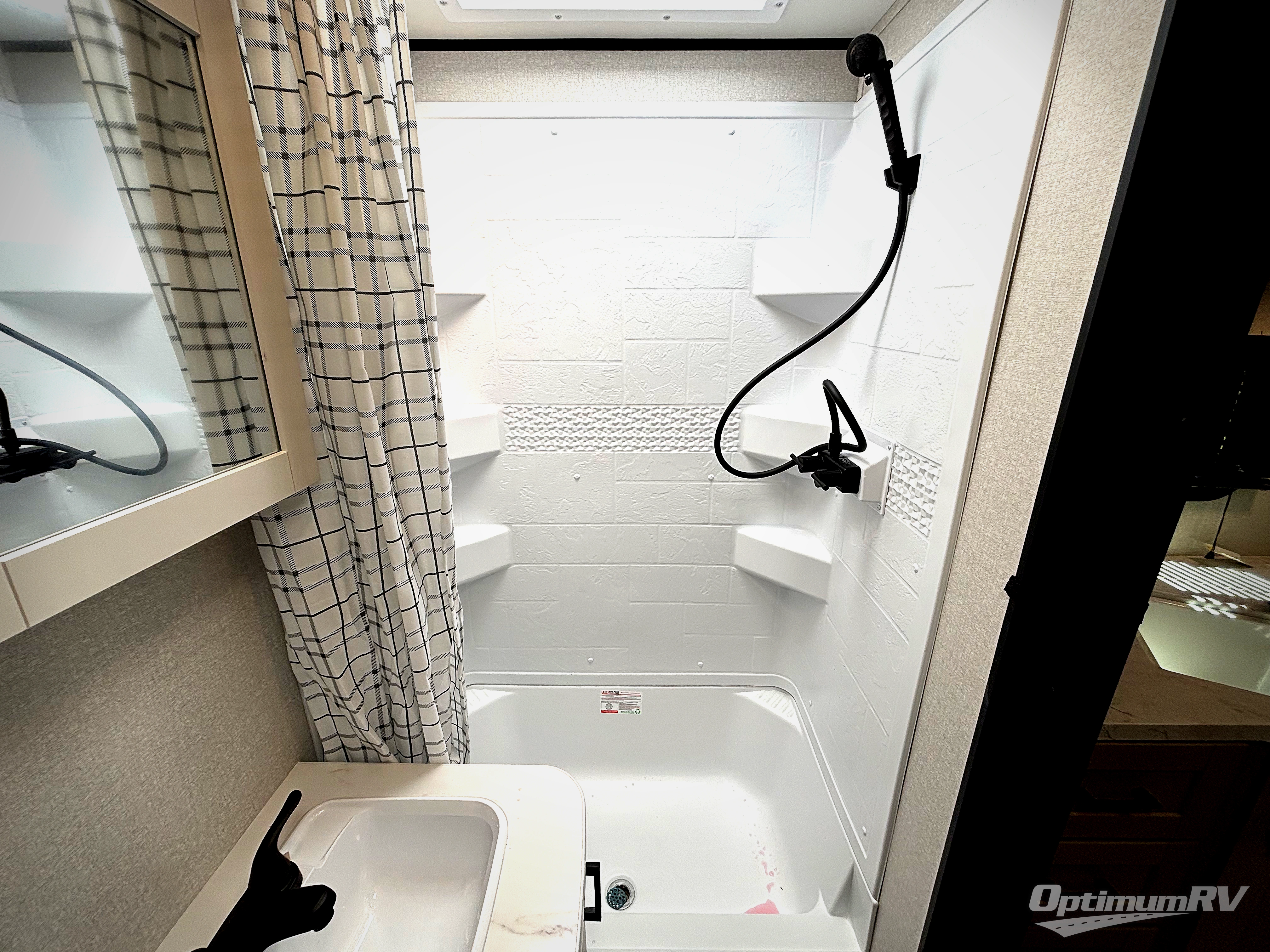 You'll love having your own space in this travel trailer thanks to the front bedroom with a queen bed, dual bedside wardrobes, and privacy curtain. A large slide out provides more space to move about, and there is theater seating here to relax in the evenings. You can make meals on the three-burner cooktop or in the microwave oven, and you can dine at the booth dinette. This unit also includes a 12V refrigerator and pantry for food storge plus ample overhead cabinets for your personal belongings.