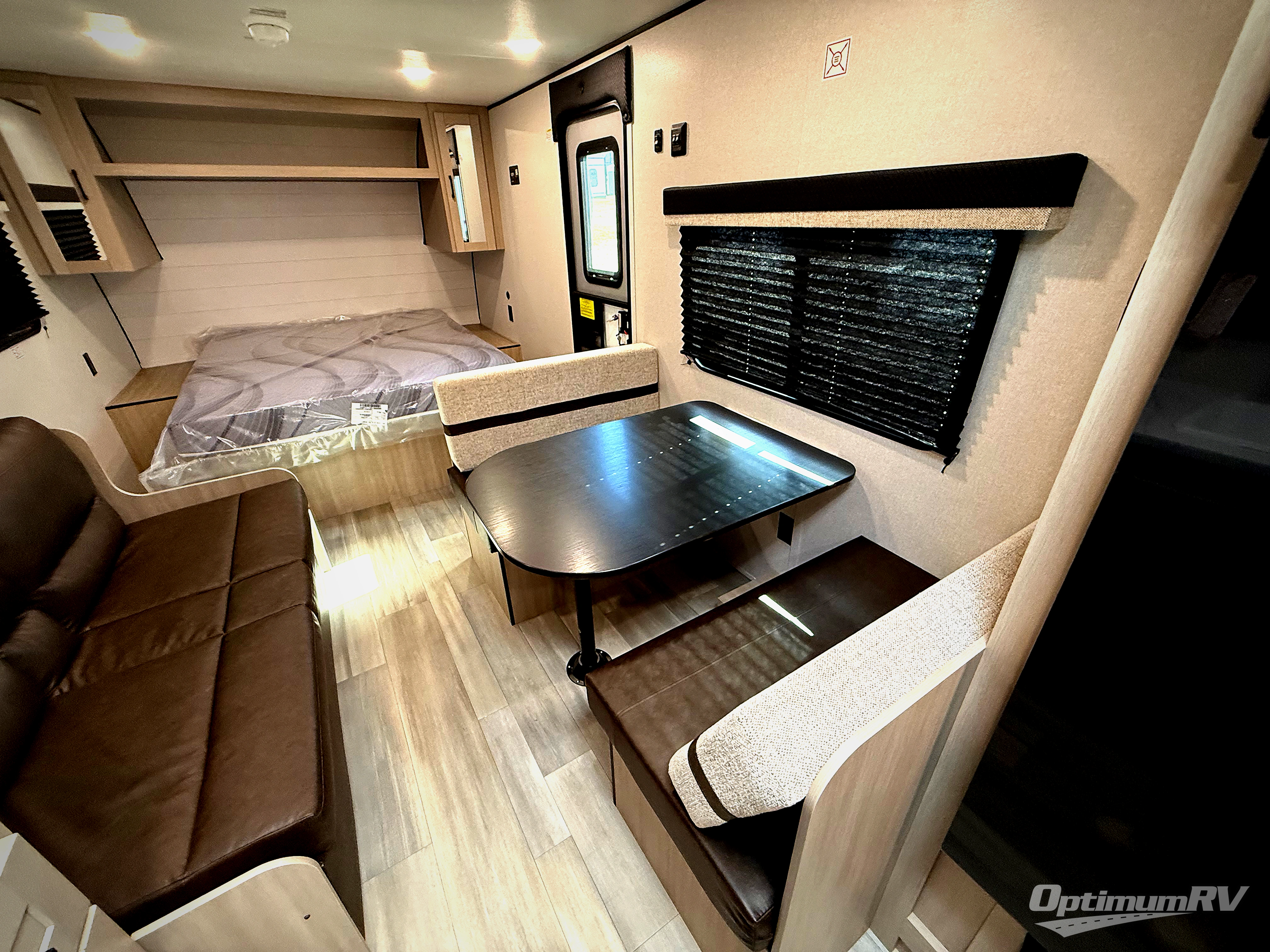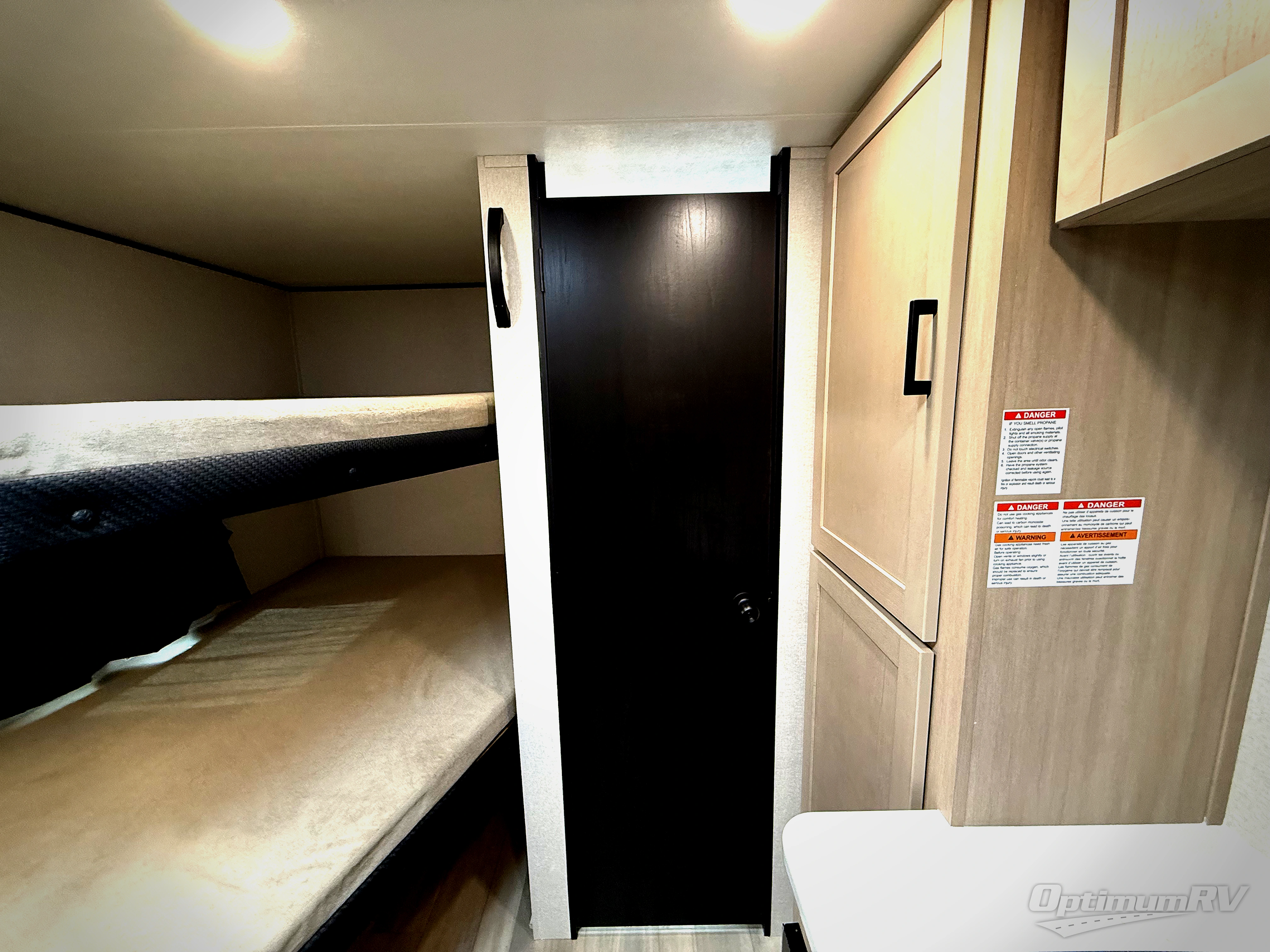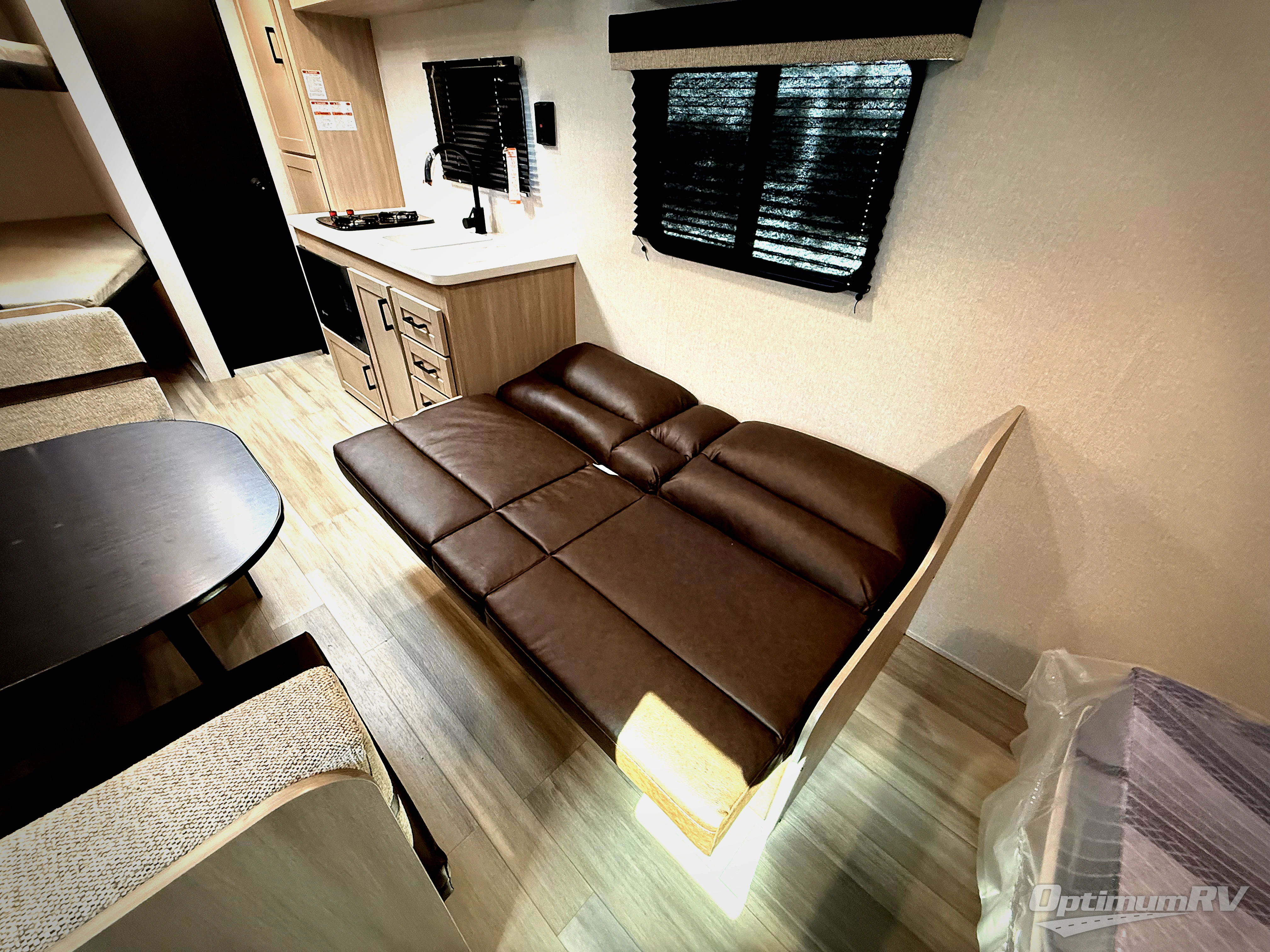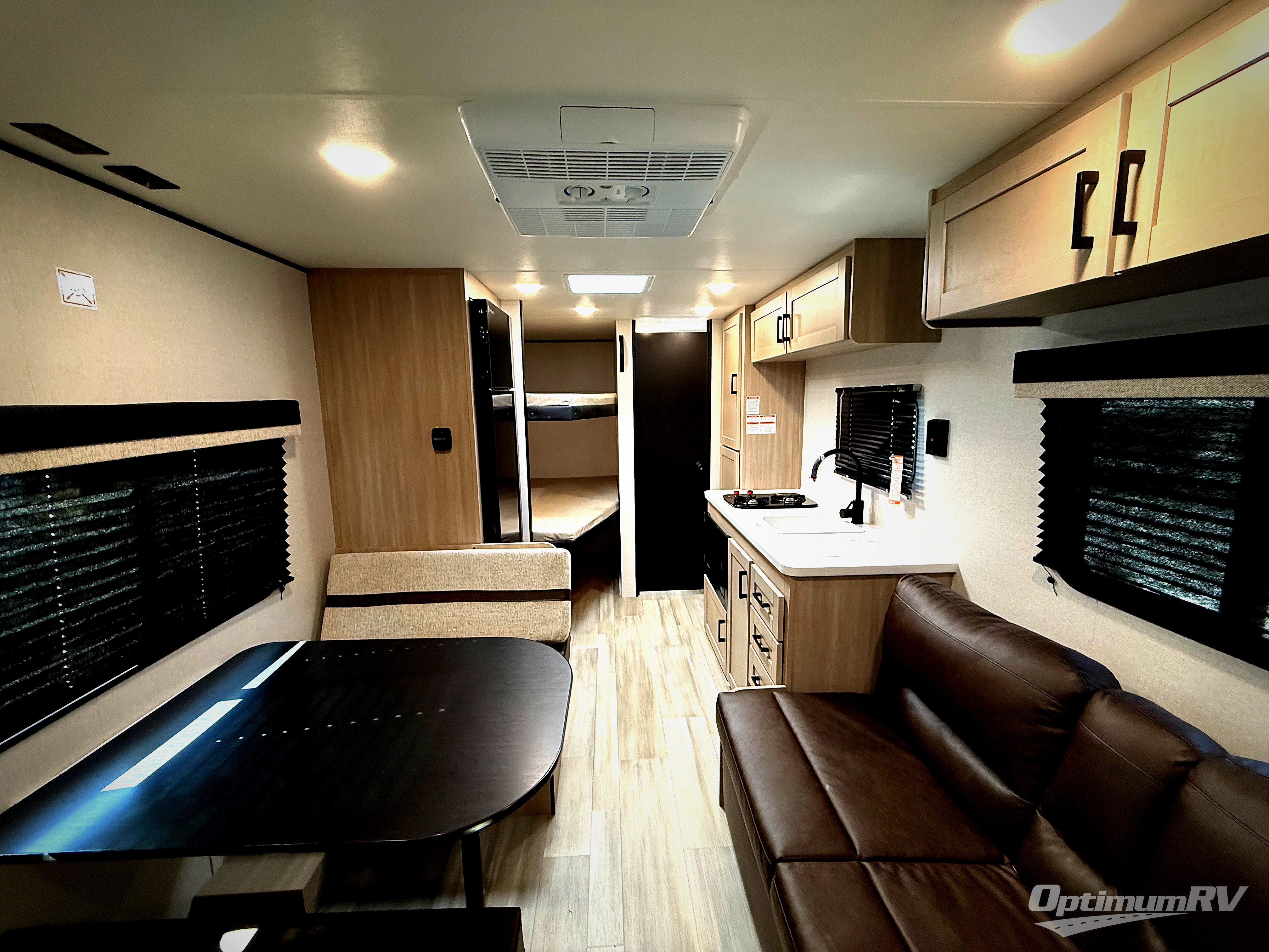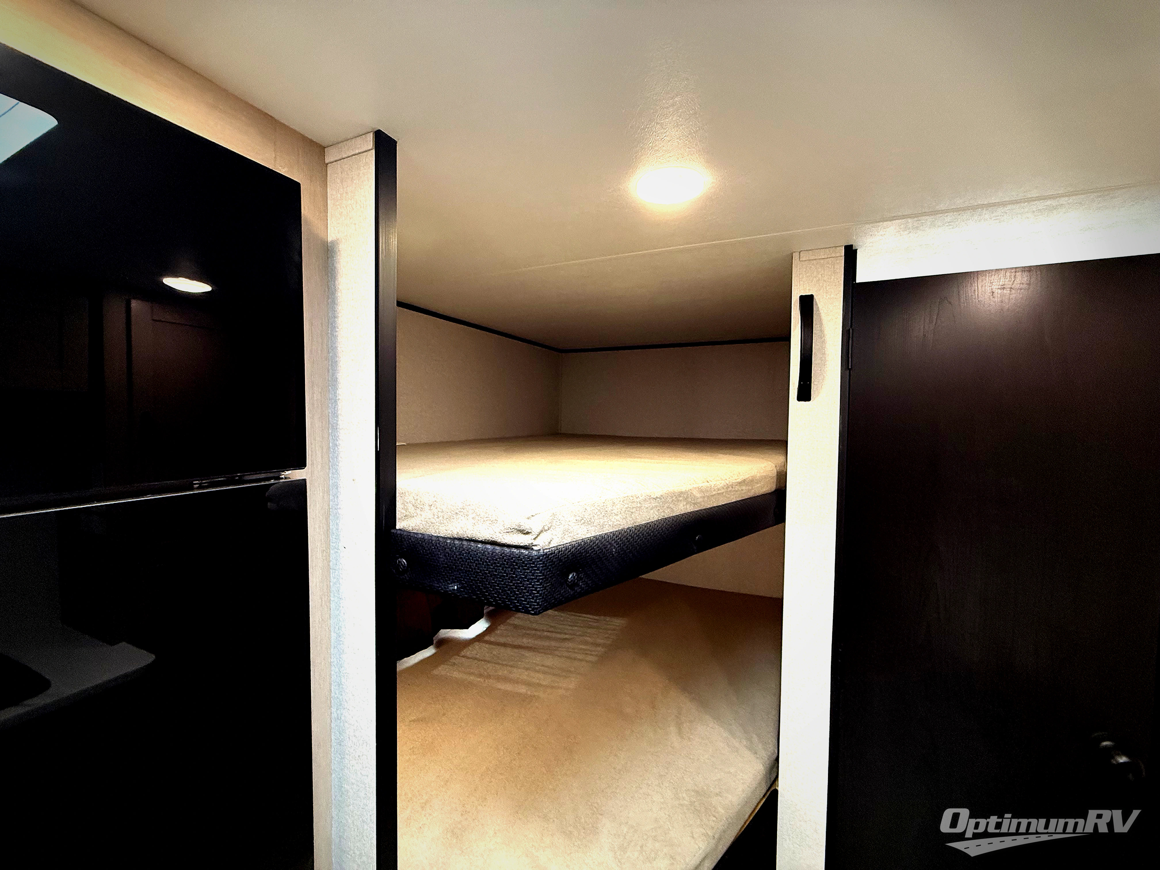 Camping trips are made easy in this Lynx Edition travel trailer with double-size bunk beds for guests or little ones. You'll find a front walk-around queen bed for a great night's rest, along with dual bedside wardrobes to keep your things tidy. The rear corner private bath includes a foot-flush toilet and a 40" shower, so you won't have to leave the camper in the middle of the night. A two-burner cooktop and microwave oven will let you make meals each day, and you'll find seating spaces at the booth dinette or on the sofa!