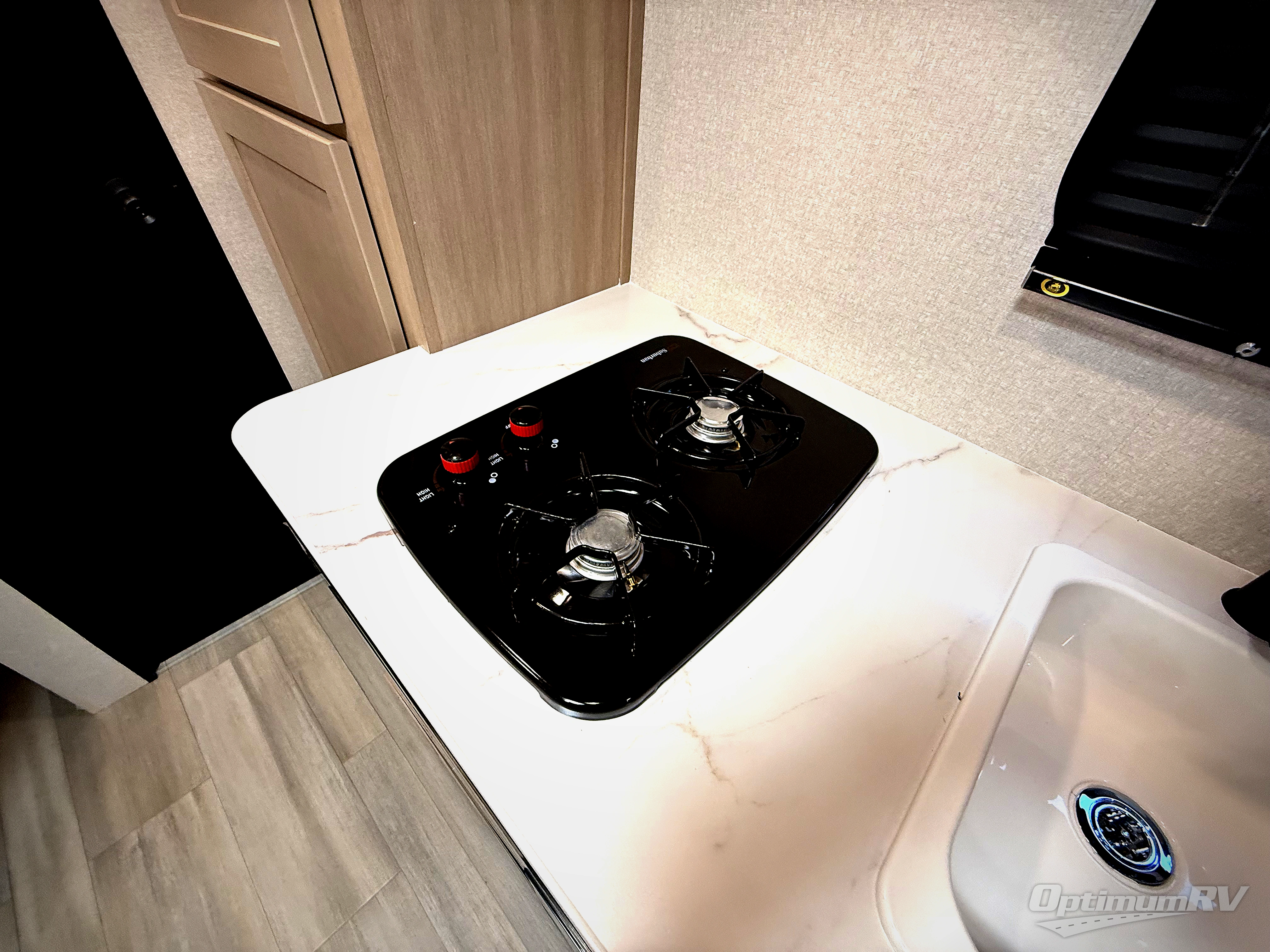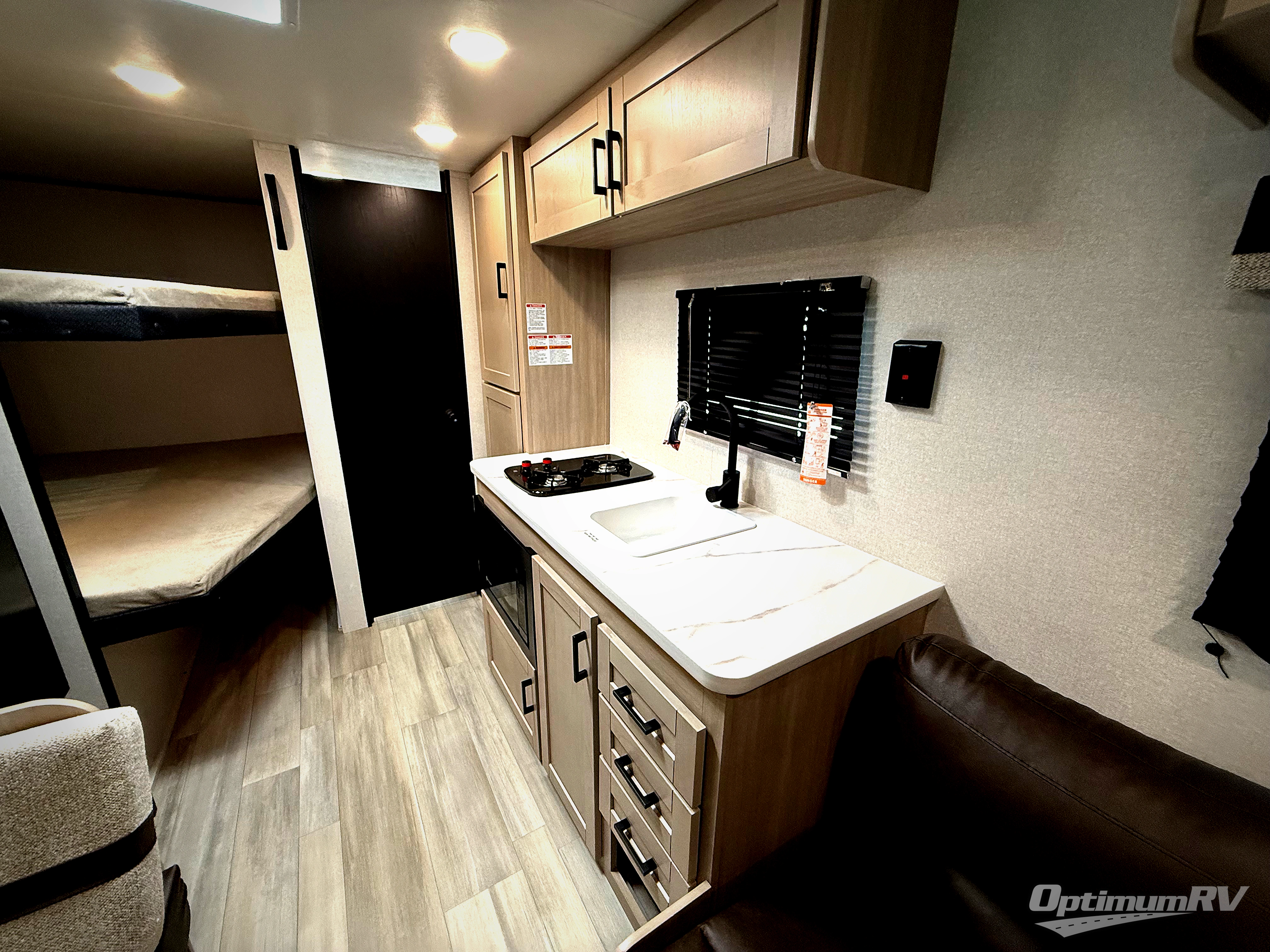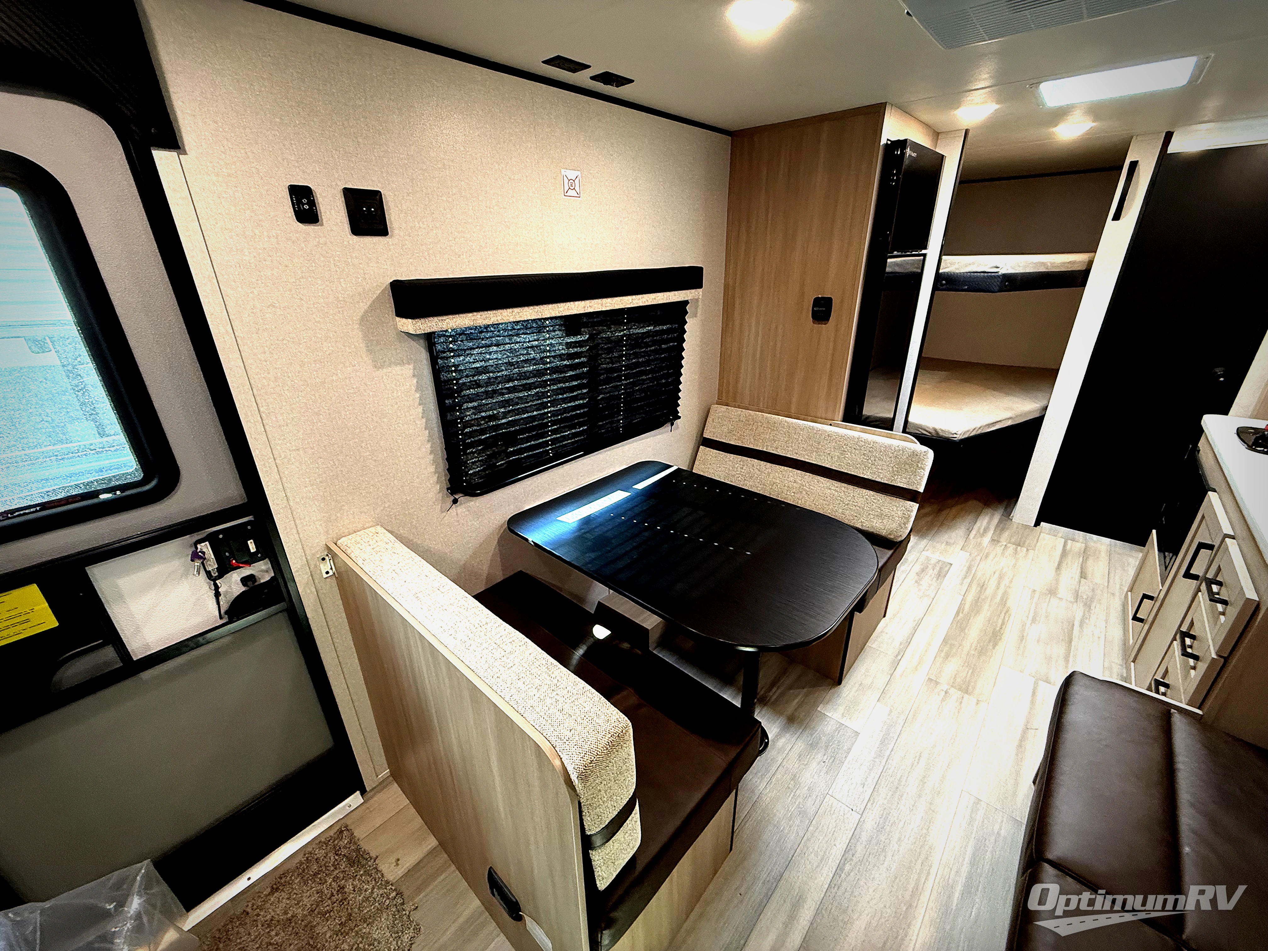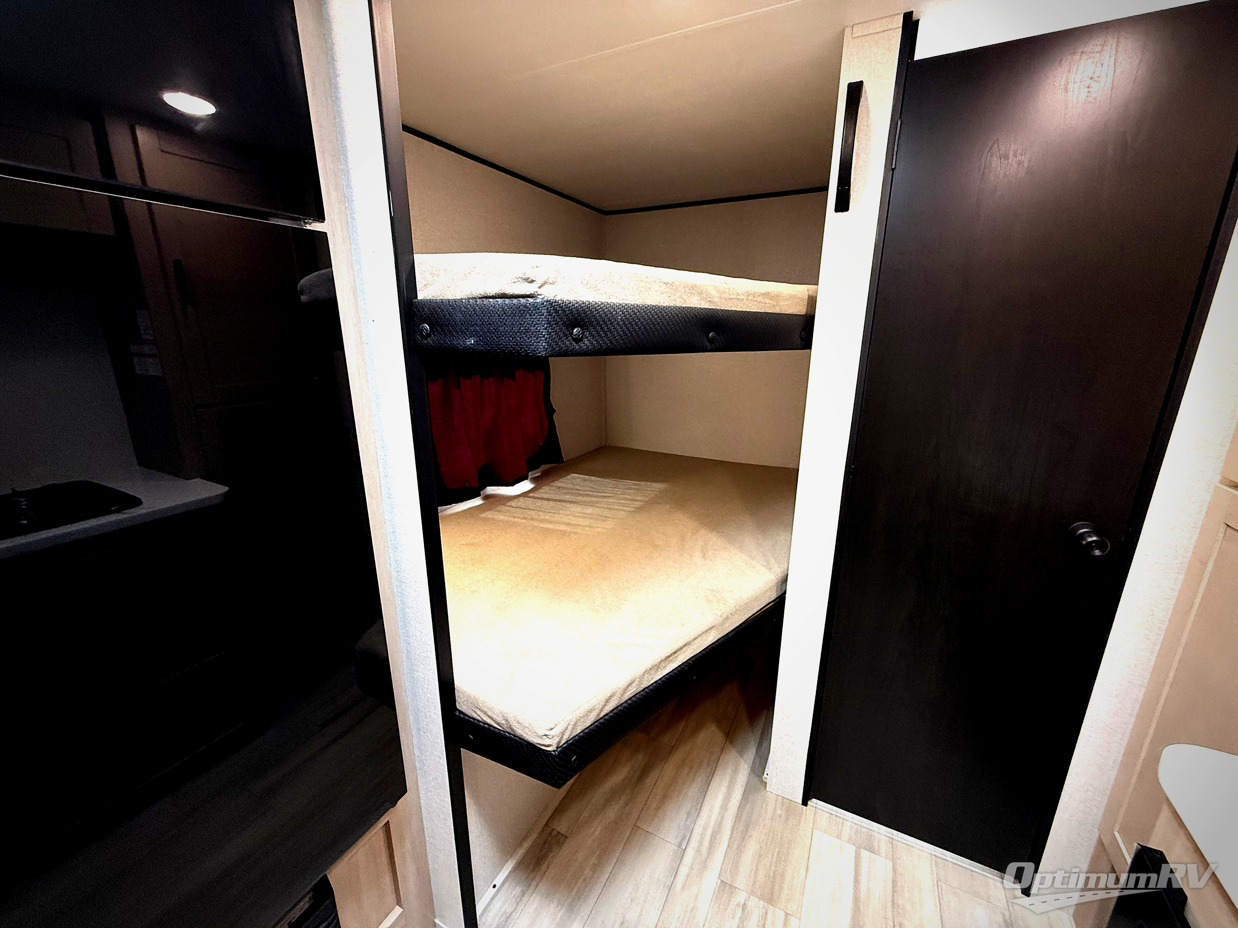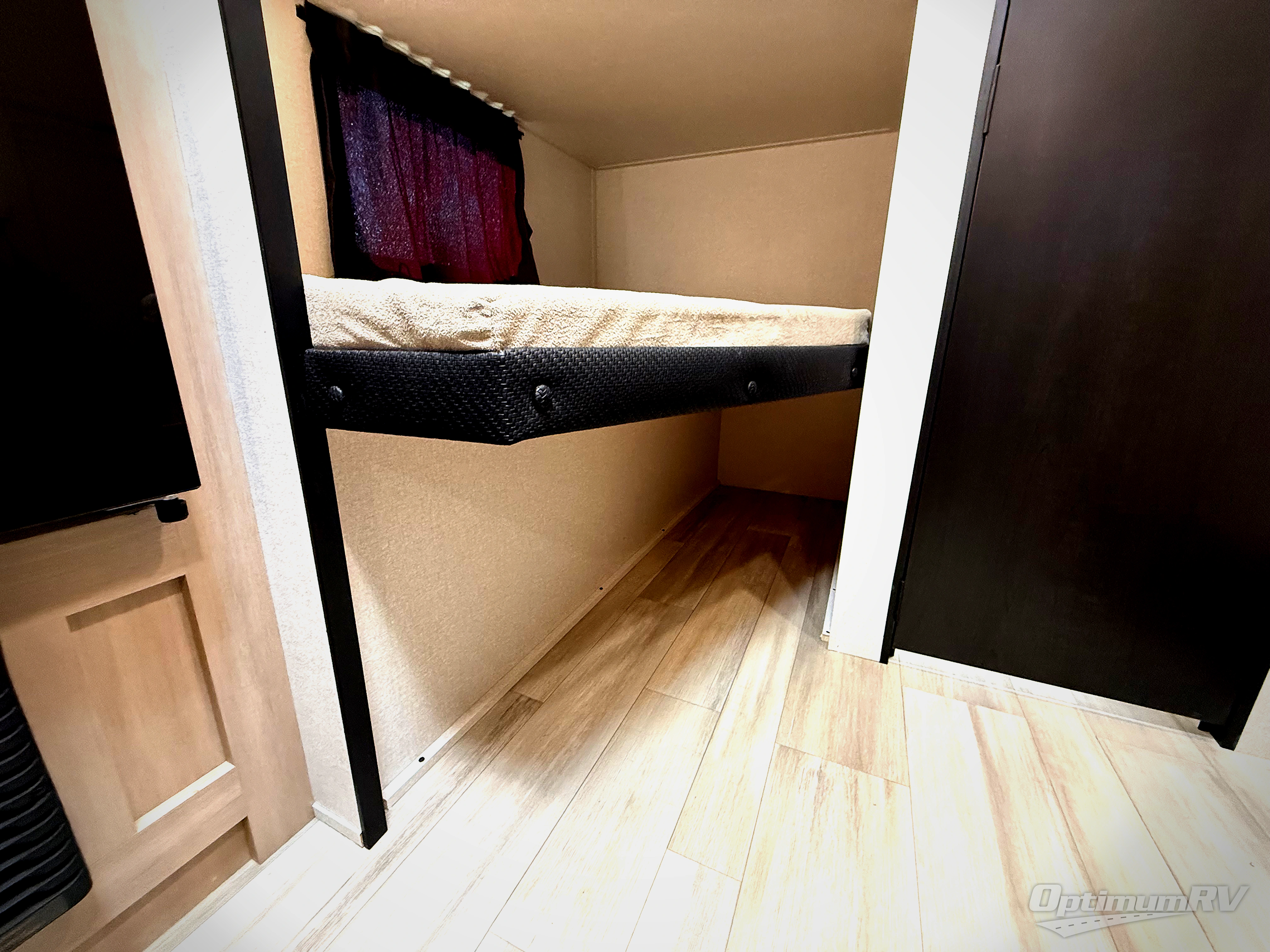Camping trips are made easy in this Lynx Edition travel trailer with double-size bunk beds for guests or little ones. You'll find a front walk-around queen bed for a great night's rest, along with dual bedside wardrobes to keep your things tidy. The rear corner private bath includes a foot-flush toilet and a 40" shower, so you won't have to leave the camper in the middle of the night. A two-burner cooktop and microwave oven will let you make meals each day, and you'll find seating spaces at the booth dinette or on the sofa!