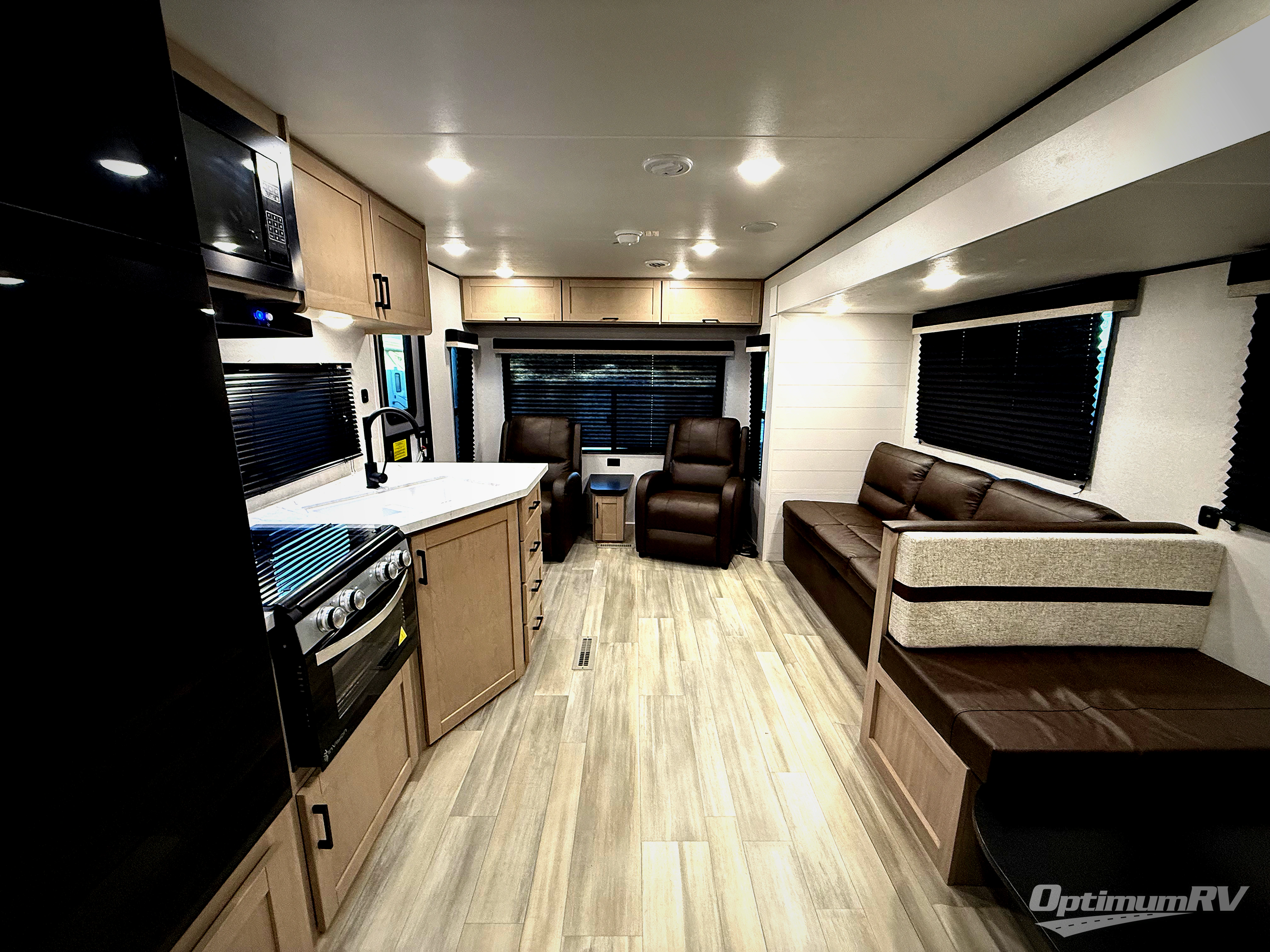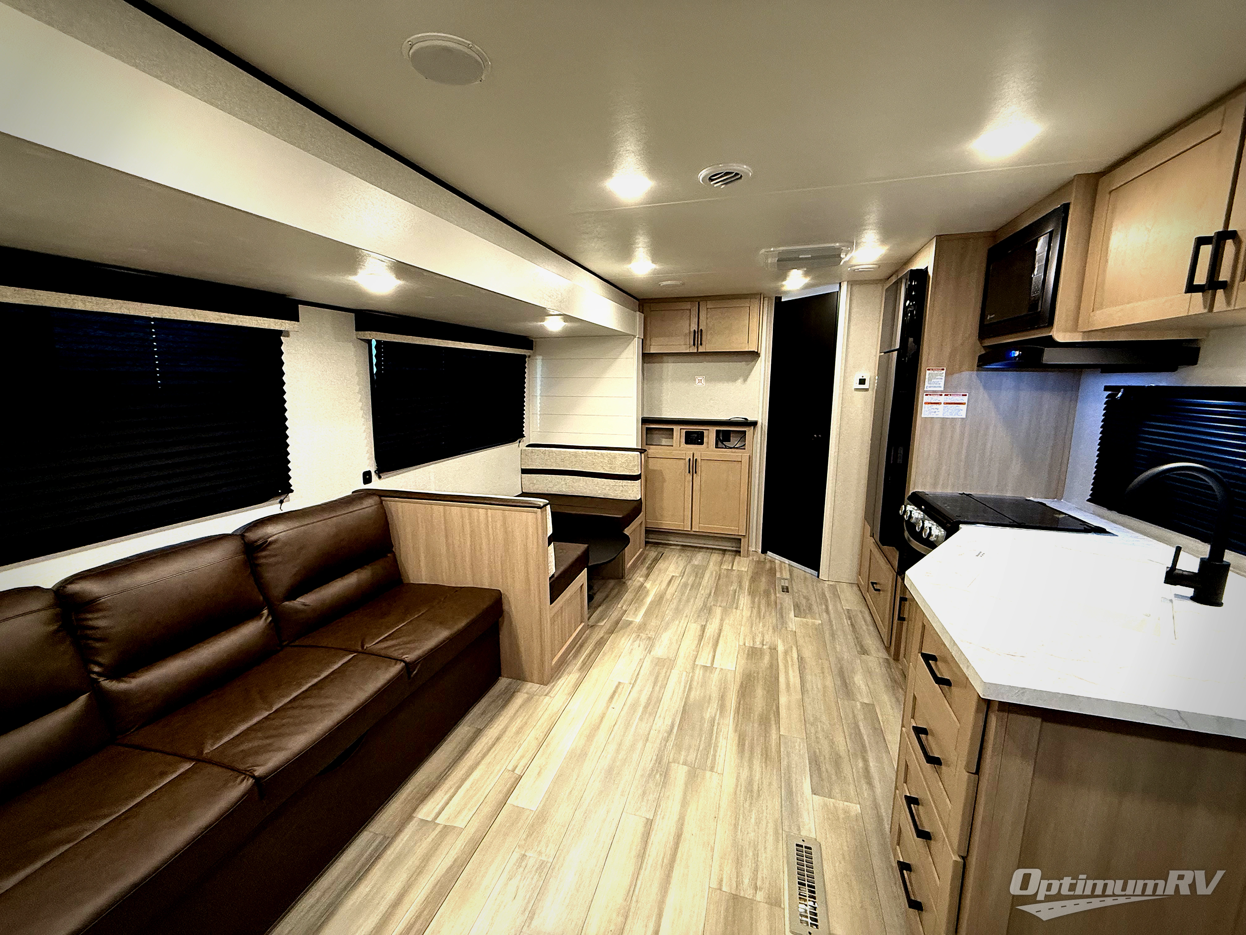 Time spent in this spacious travel trailer will be time well spent! Once you arrive at your campsite, you can put out the 18' power awning and relax in your camp chairs. The dual entry doors will allow you to enter in through the rear living room with dual lounge chairs, or the front private bedroom with an RV queen bed! The chef of your group can make lunch on the three-burner cooktop or in the microwave oven, and there is a booth dinette where you can dine together. Your guests can convert the dinette to sleeping space at night, along with the jack-knife sofa!