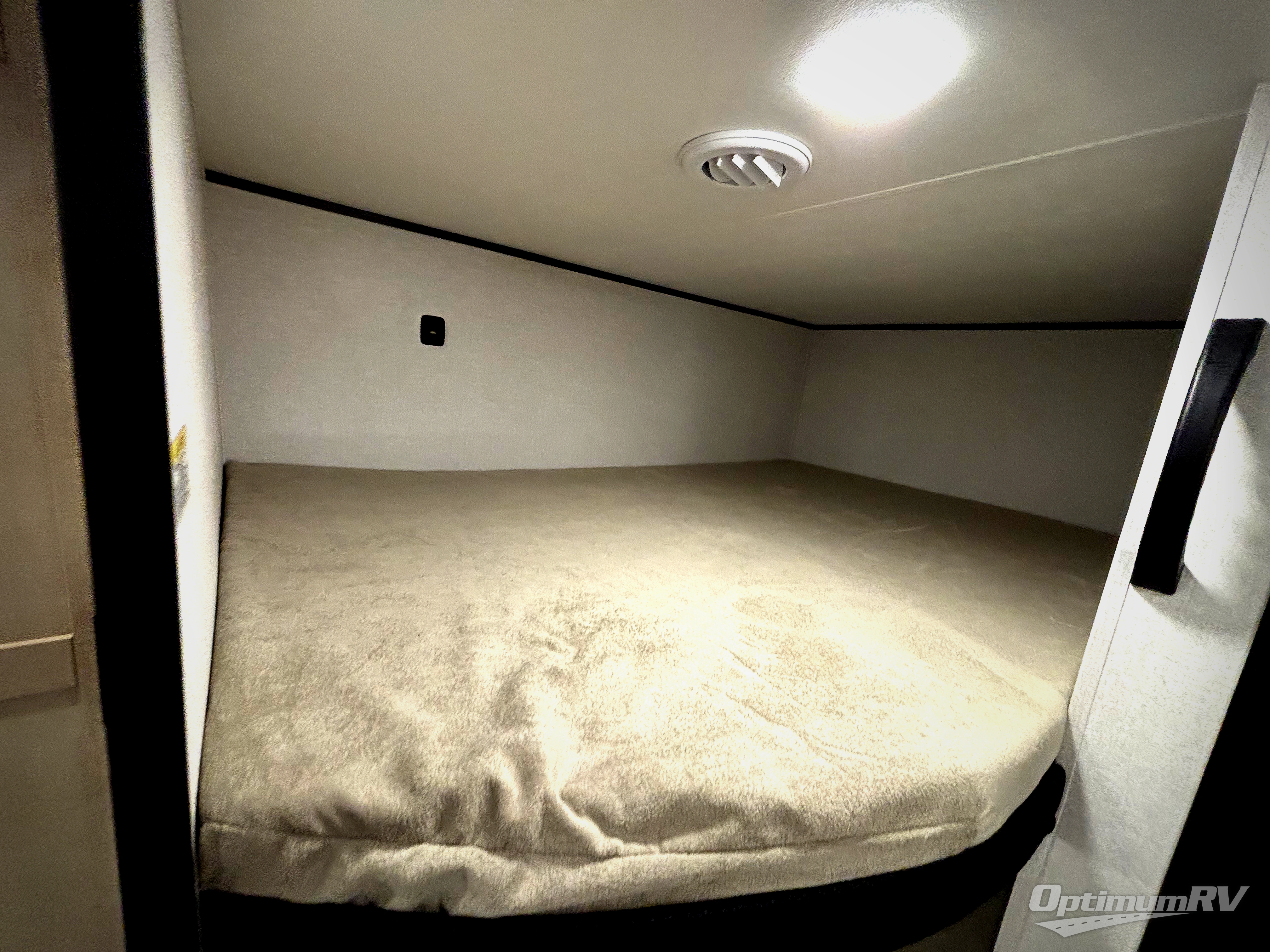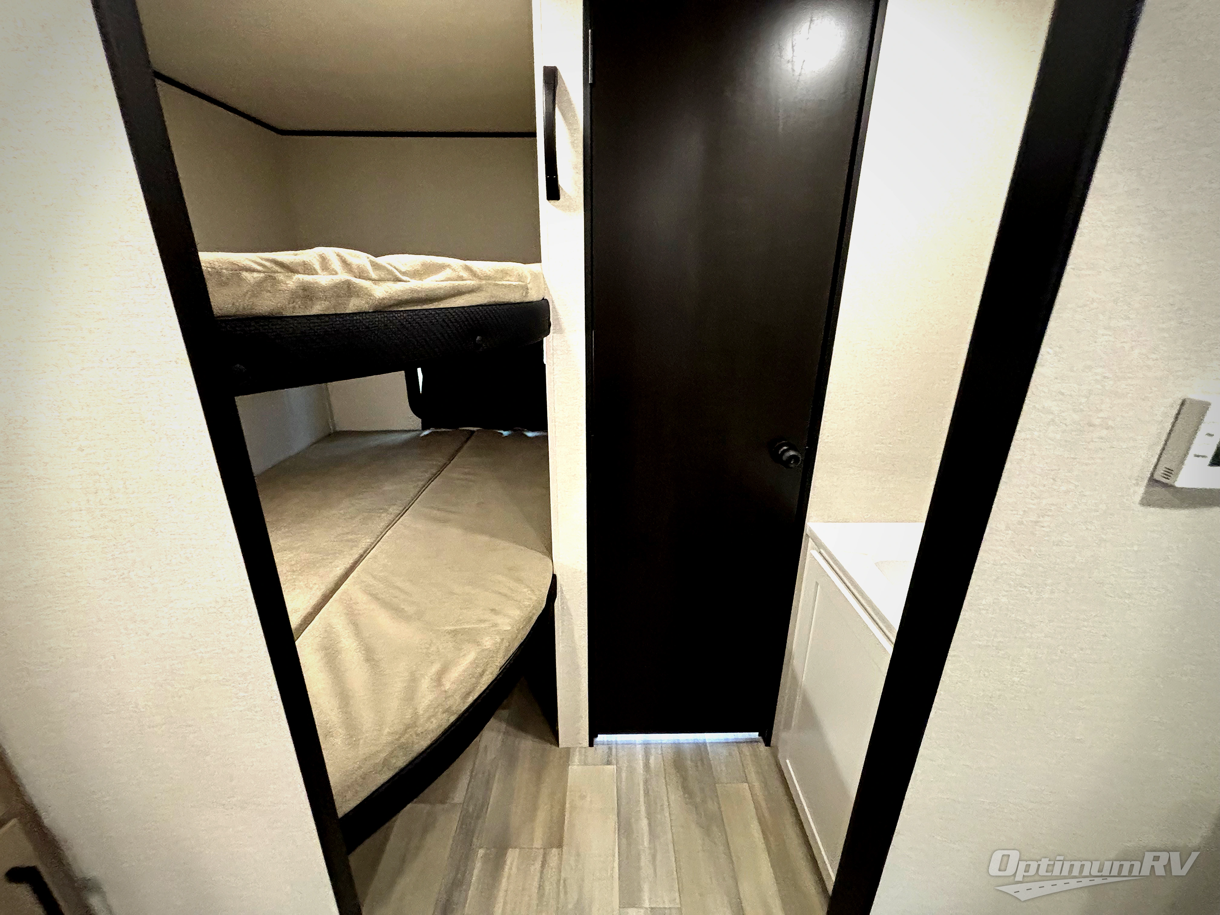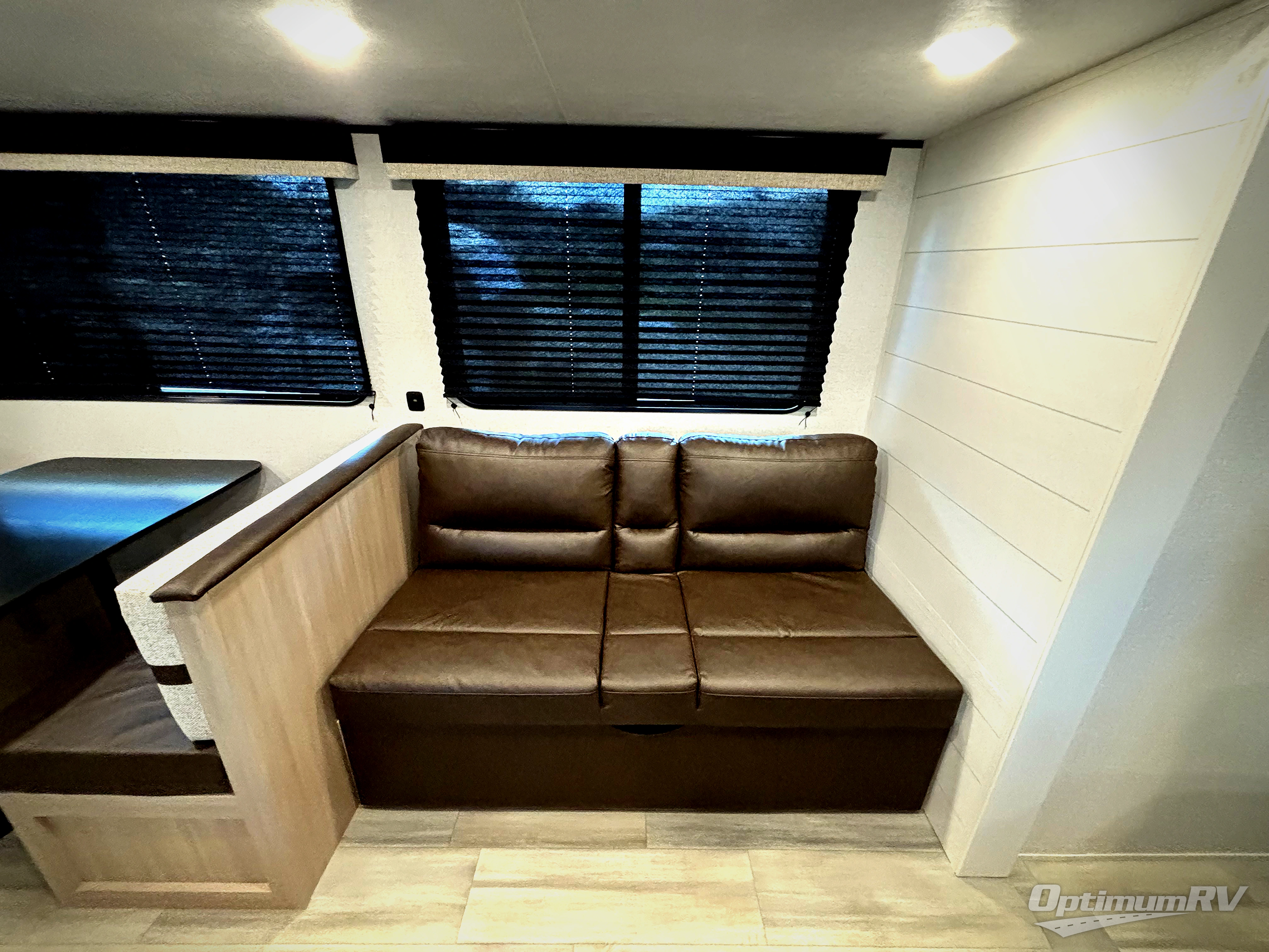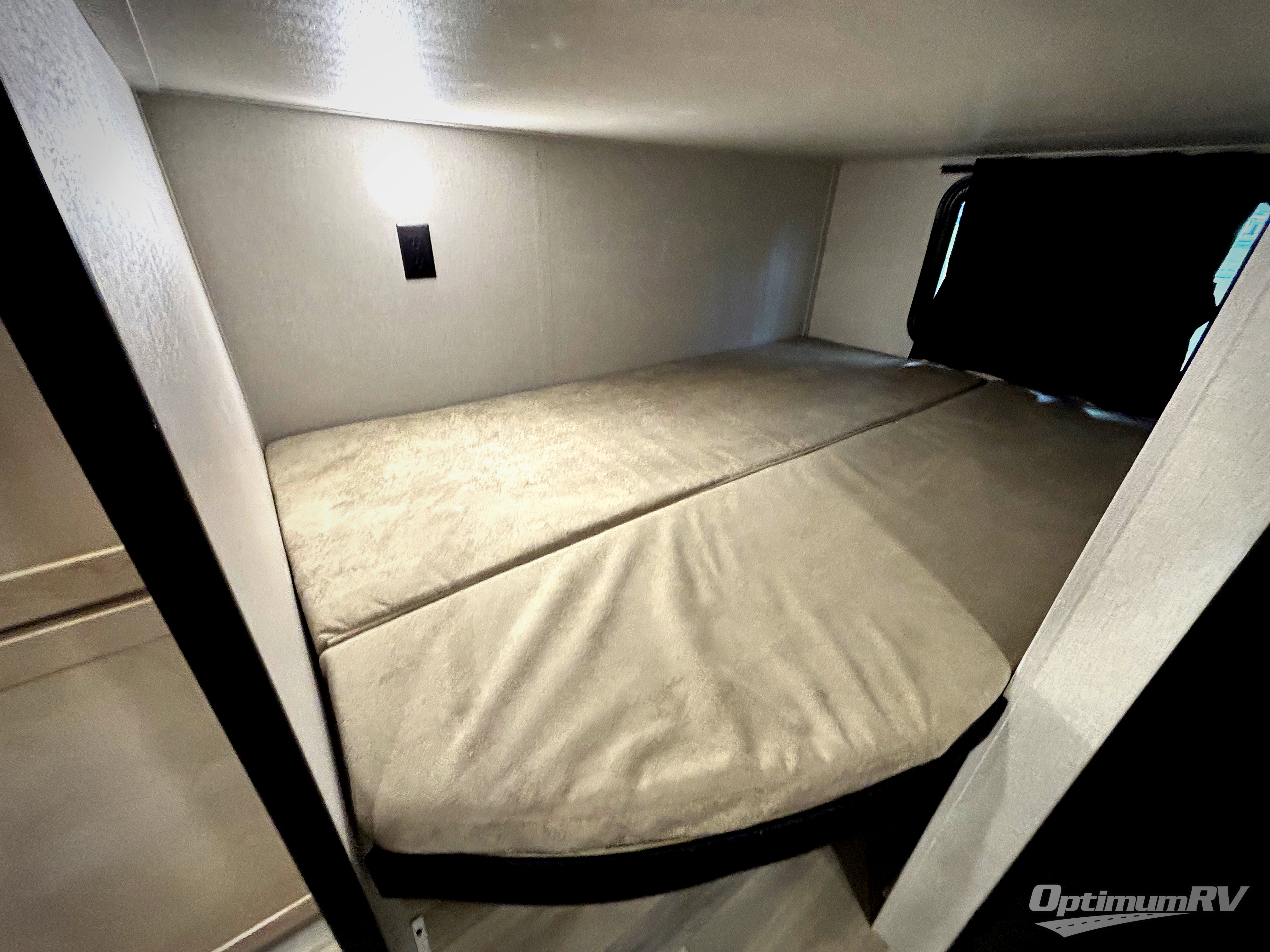 The whole gang will love weekends in the woods with this travel trailer in tow! There is a large slide out for added space, and here you'll find the jack-knife sofa and booth dinette. You can claim the front private bedroom to yourselves, while your guests or little ones take the double-size bunks. A full kitchen is complete with a three-burner cooktop and microwave oven to make meals each day, plus a 12V refrigerator and pantry for food storage. This unit also includes an outdoor kitchen with a refrigerator to keep cold drinks ready to enjoy!