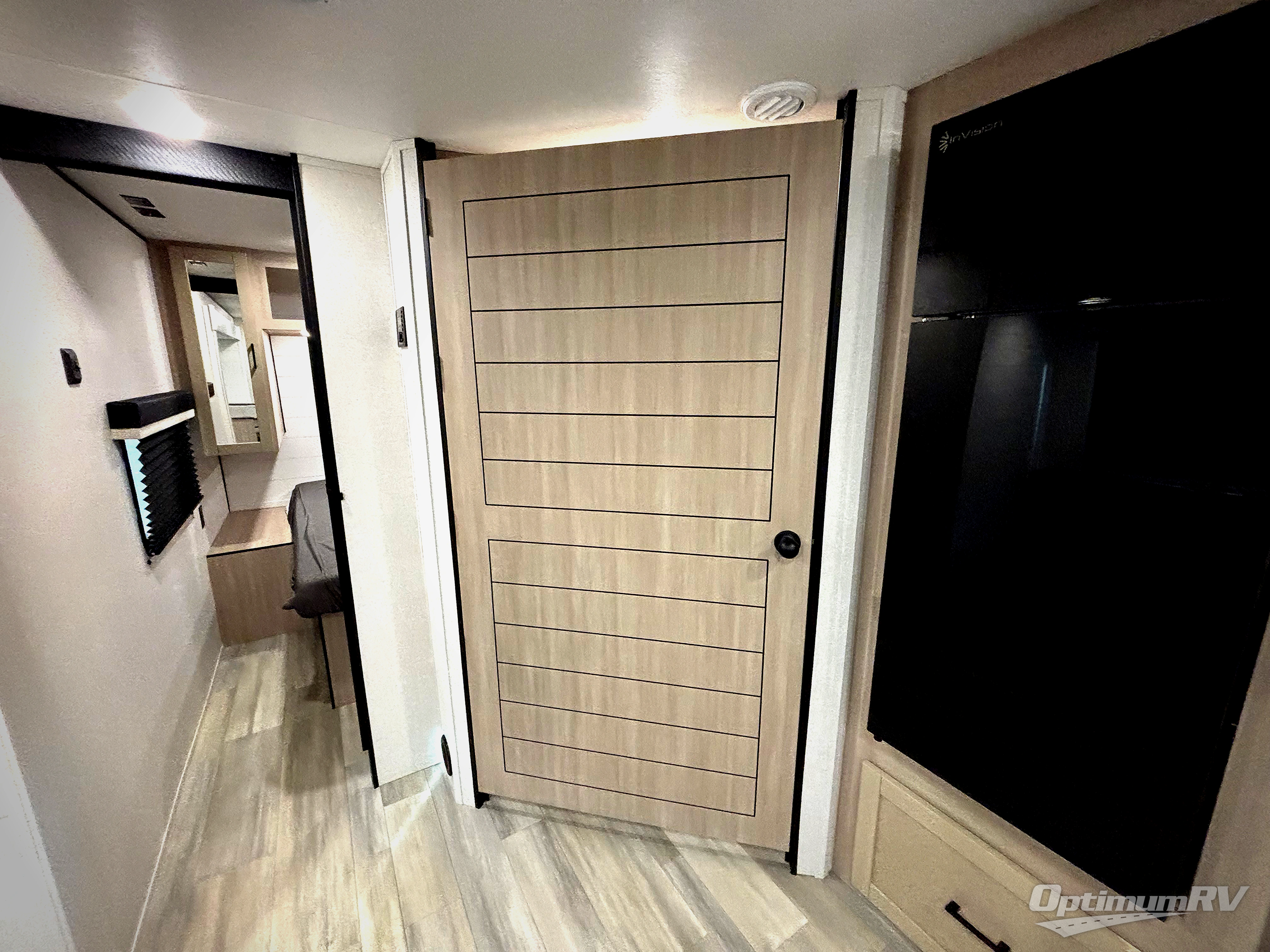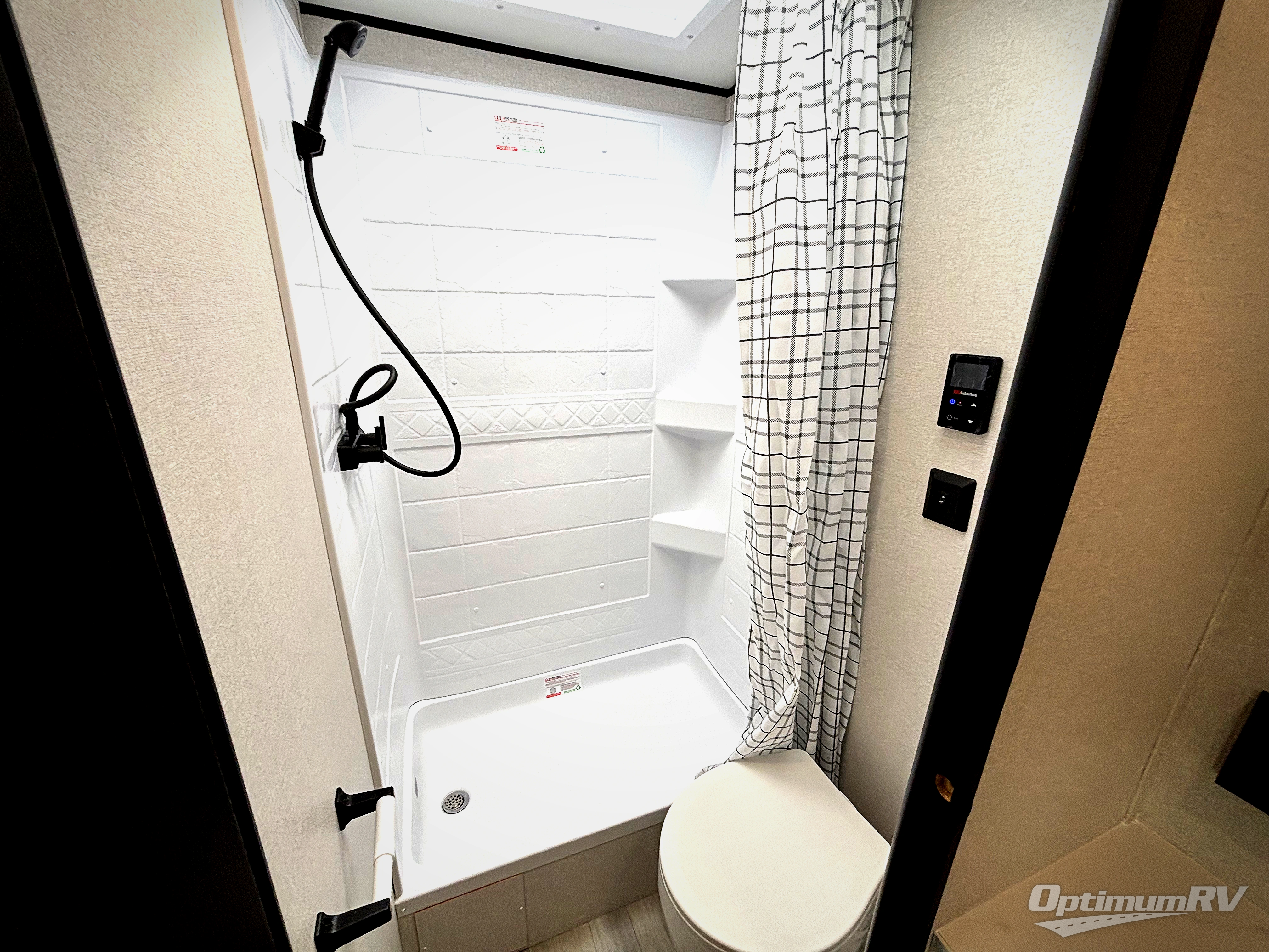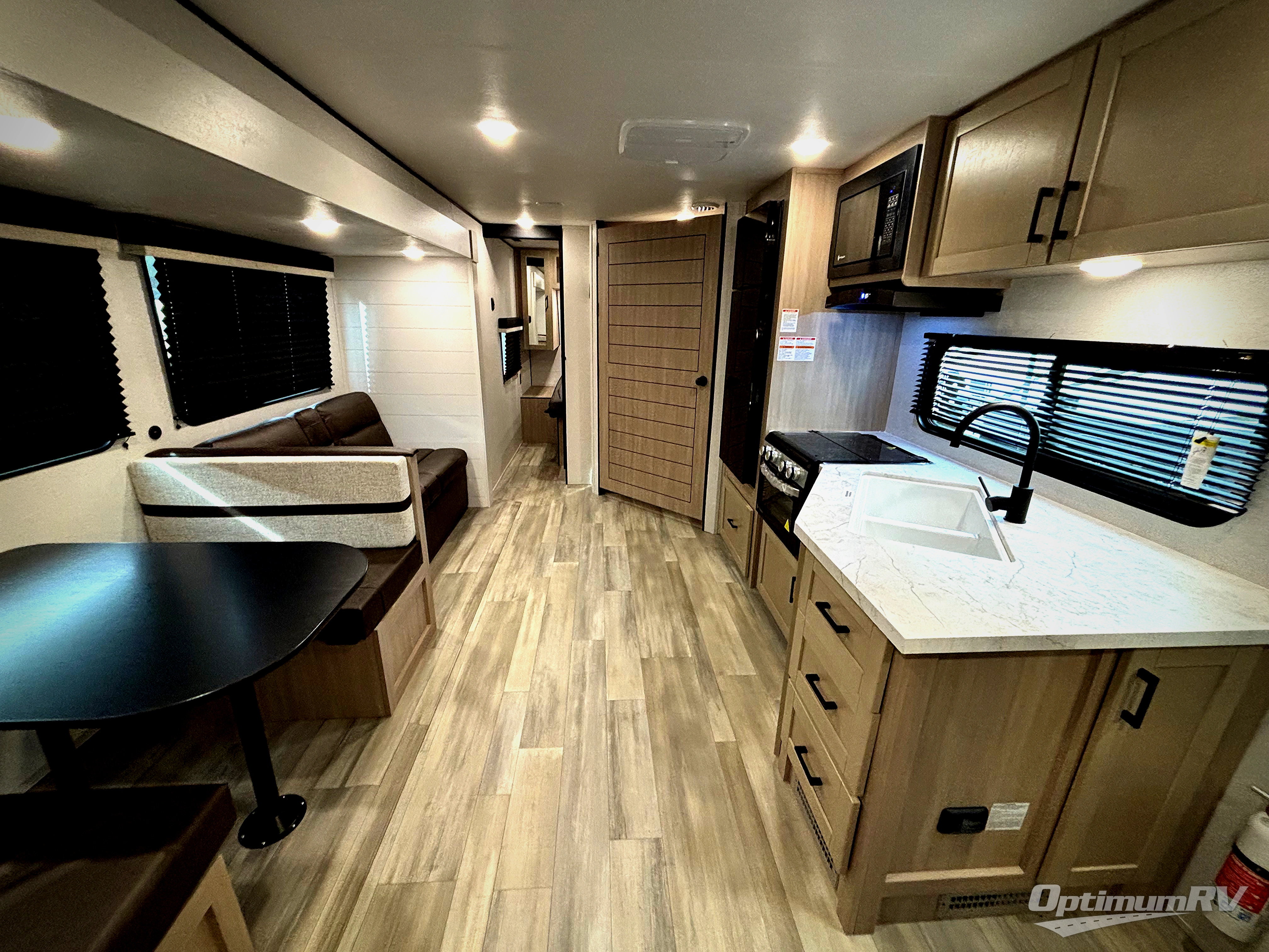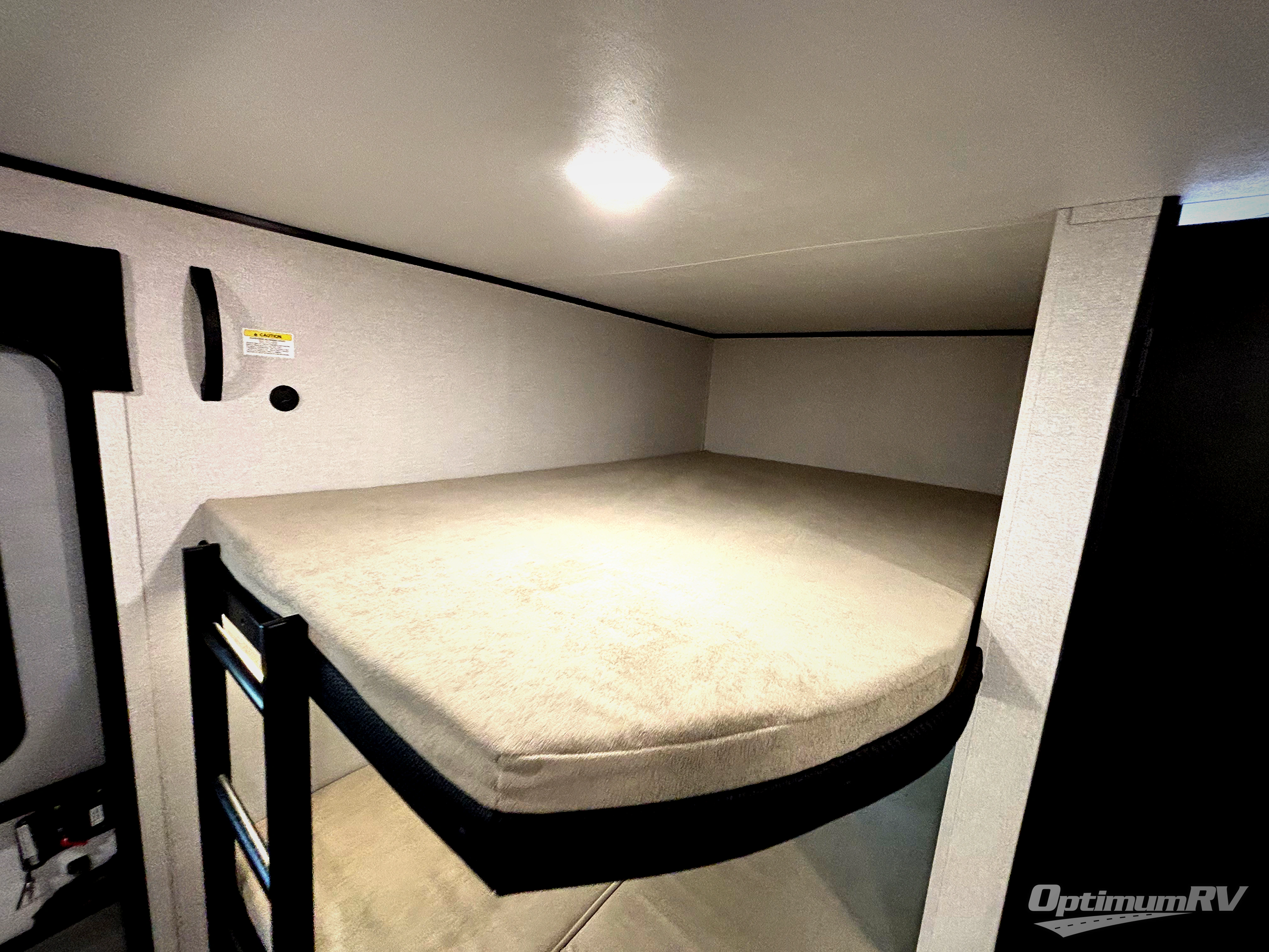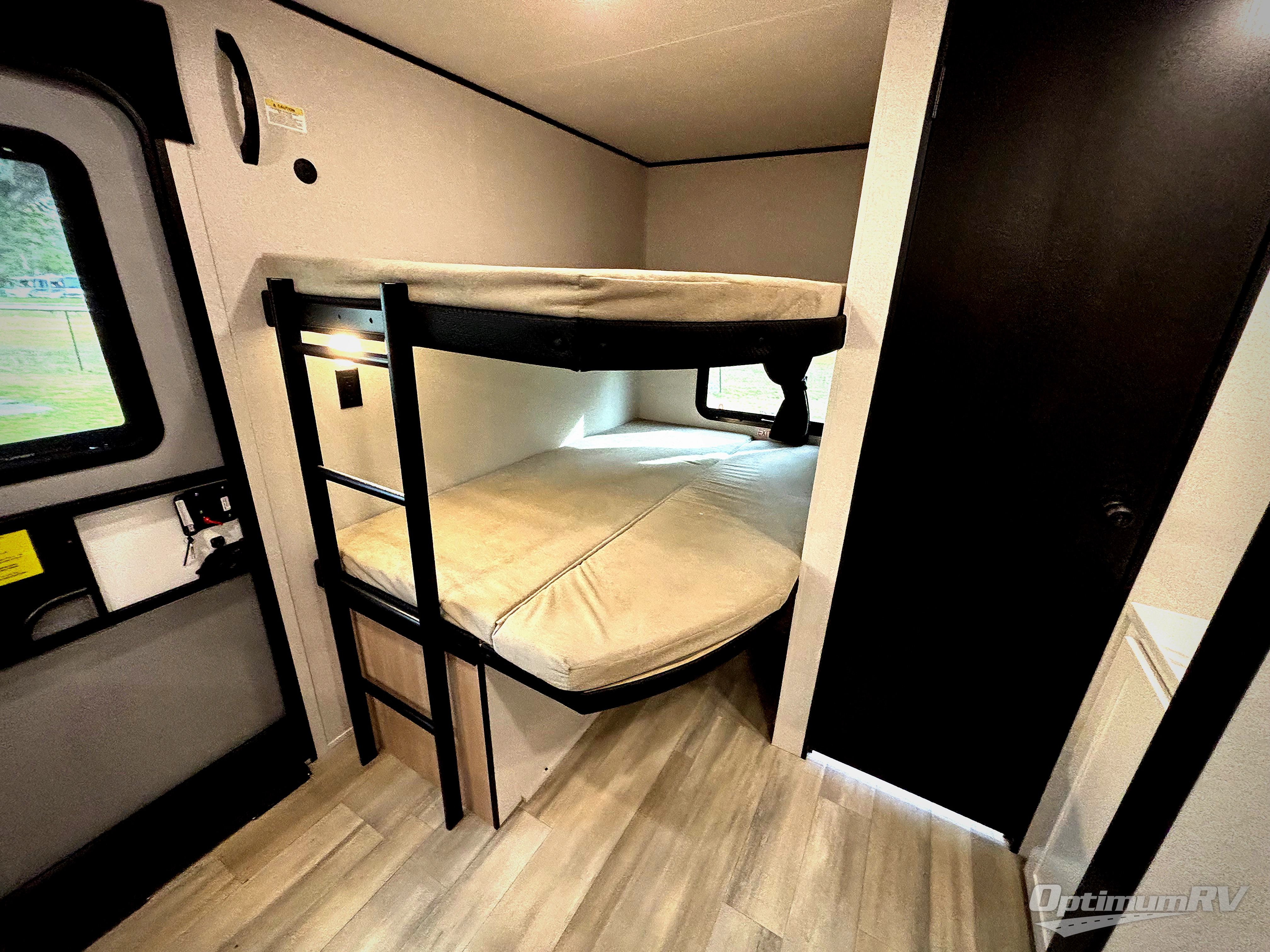 The whole gang will love weekends in the woods with this travel trailer in tow! There is a large slide out for added space, and here you'll find the jack-knife sofa and booth dinette. There is also an entertainment center with a fireplace with a hidden pantry behind, along with storage shelves for snacks, board games and more! You can claim the front private bedroom to yourselves, while your guests or little ones take the double-size bunks. A full kitchen is complete with a three-burner cooktop and microwave oven to make meals each day, plus a 12V refrigerator and pantry for food storage. This unit also includes an outdoor kitchen with a refrigerator to keep cold drinks ready to enjoy!