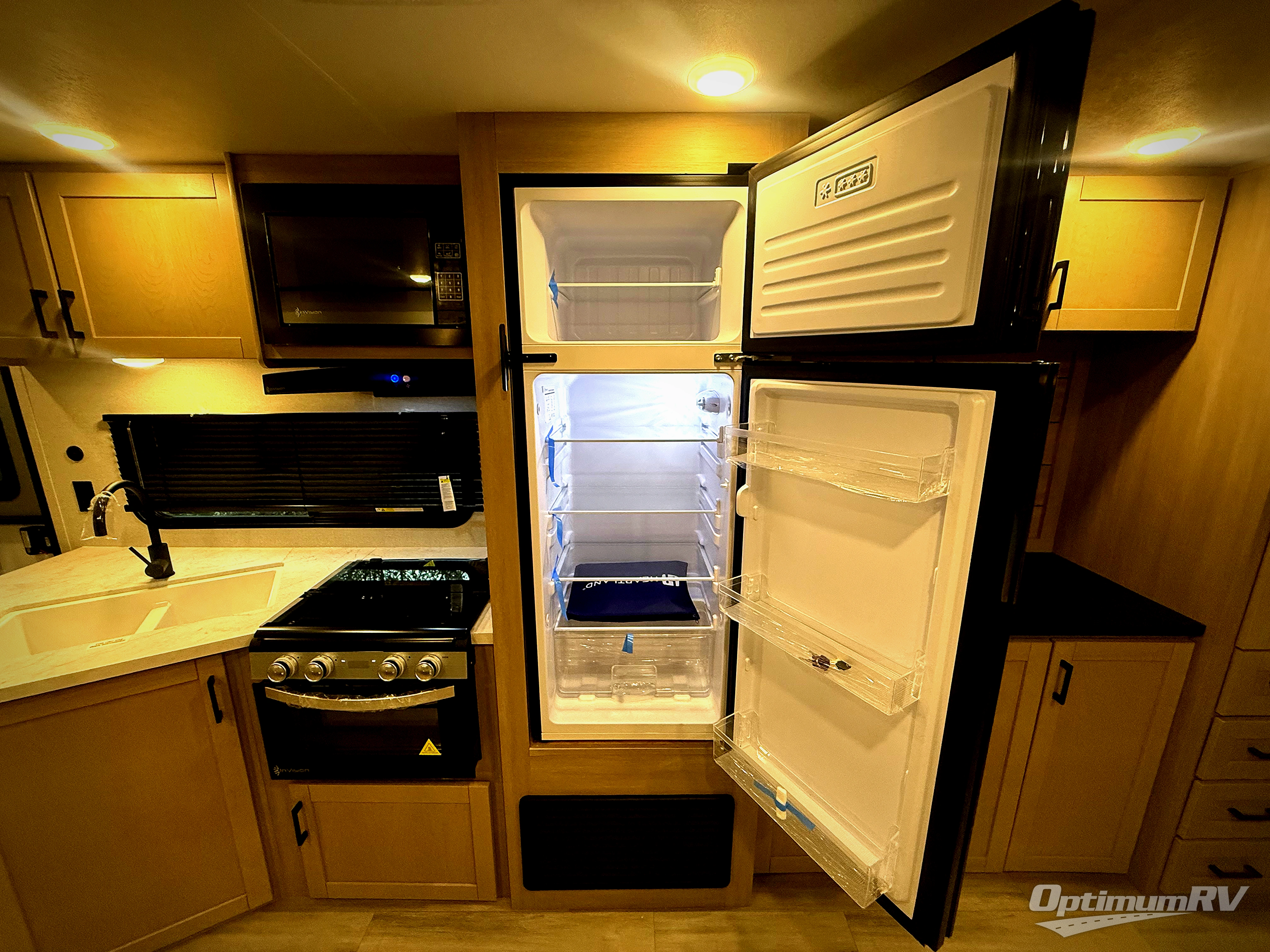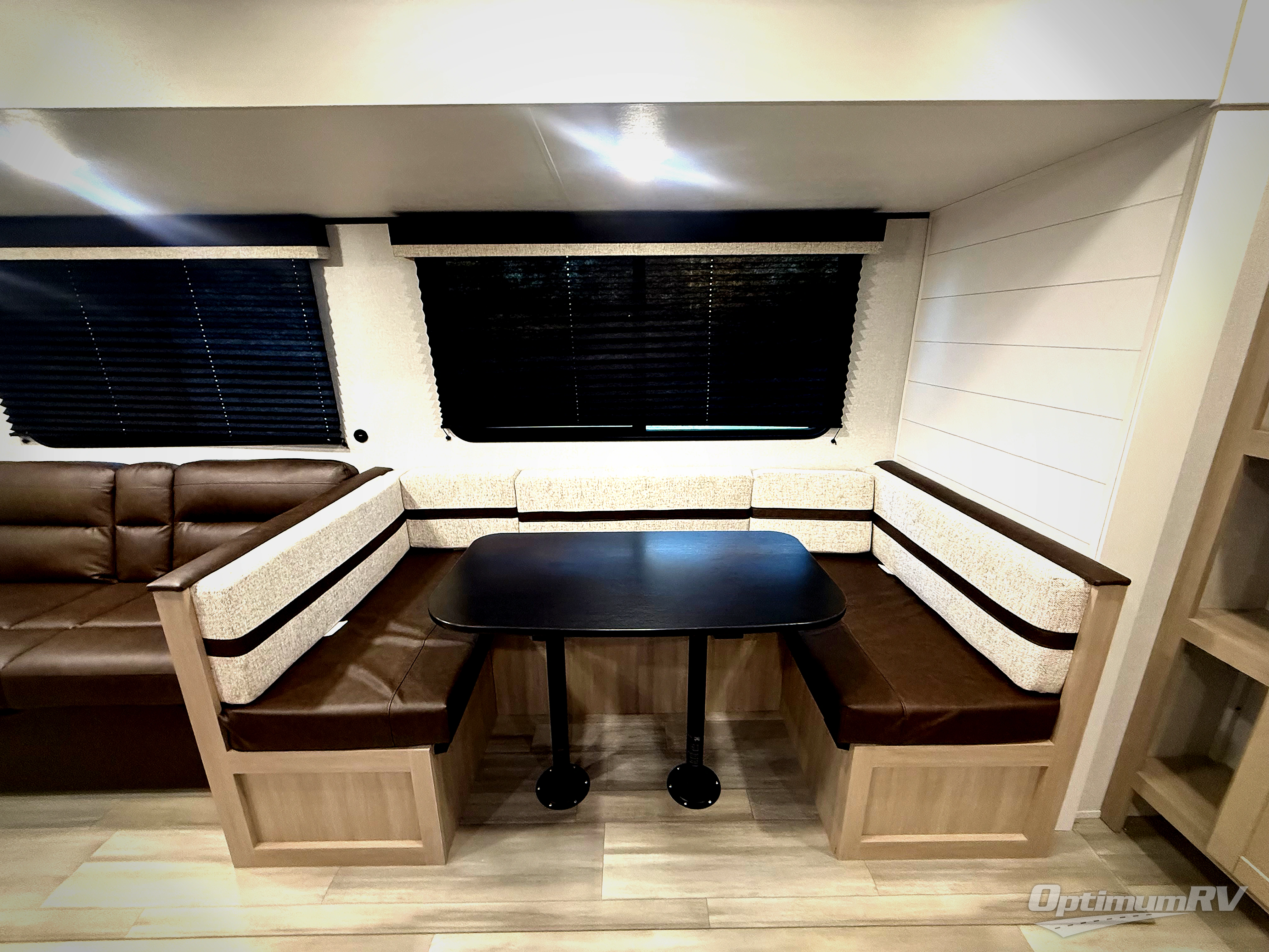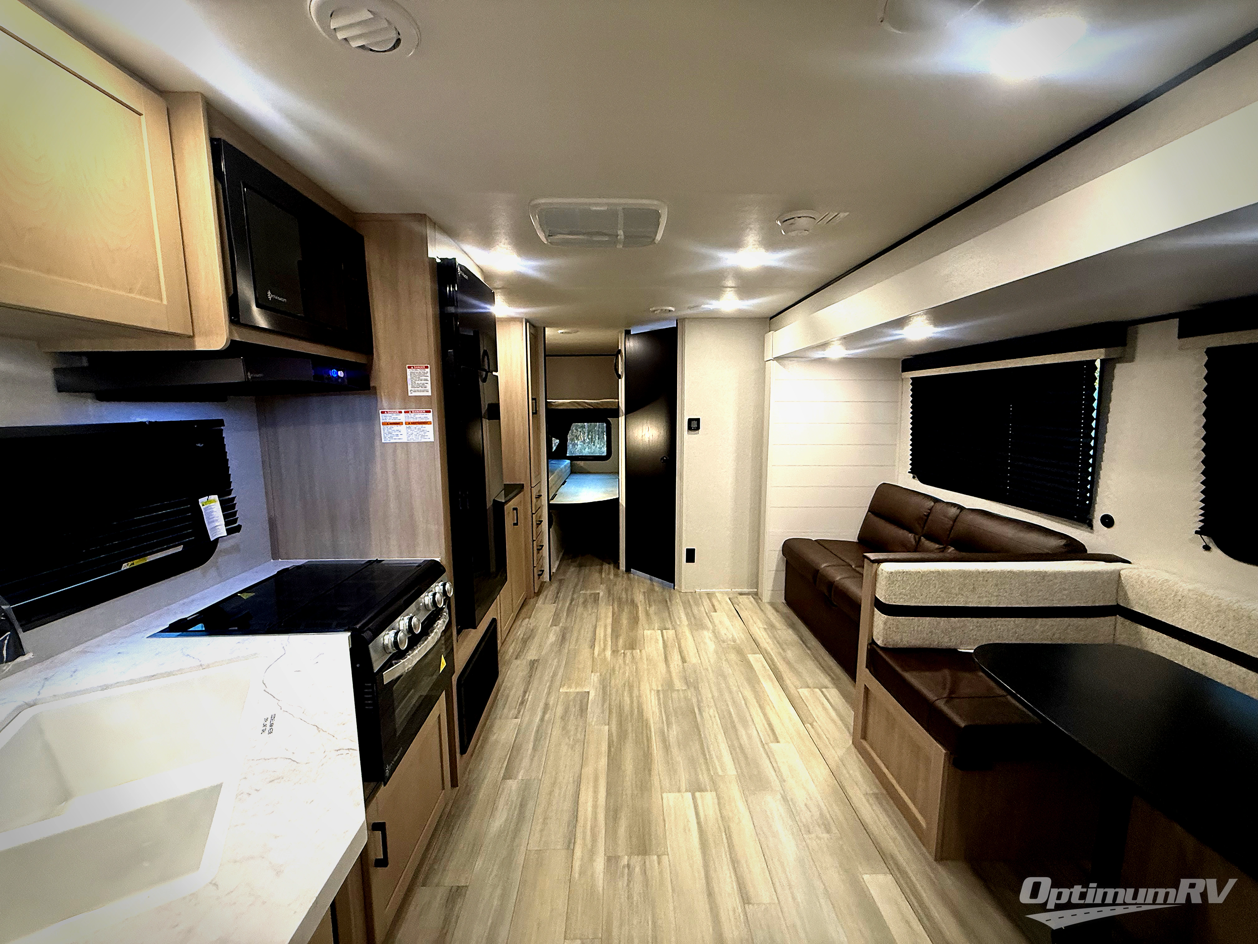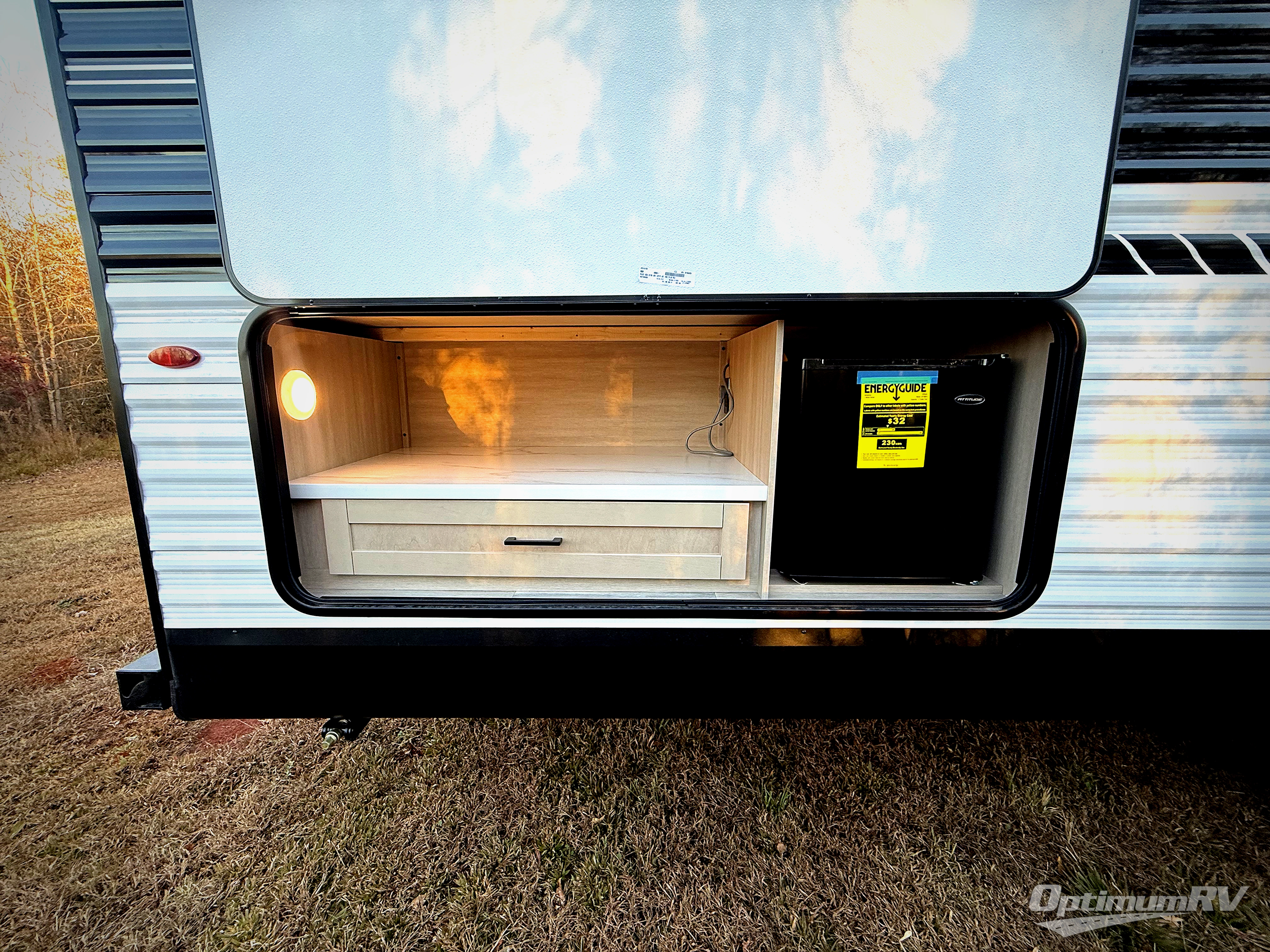 The whole gang will love weekends in the woods with this travel trailer in tow! There is a large slide out for added space, and here you'll find the jack-knife sofa and U-shaped dinette. There is also an entertainment center with a fireplace for cozy evenings indoors, and you'll appreciate the storage cabinet and shelves for board games, movies and more! You can claim the front private bedroom to yourselves, while your guests or little ones take the double-size bunks. A full kitchen is complete with a three-burner cooktop and microwave oven to make meals each day, plus a 12V refrigerator for food storage. This unit also includes an outdoor kitchen with a refrigerator to keep cold drinks ready to enjoy!