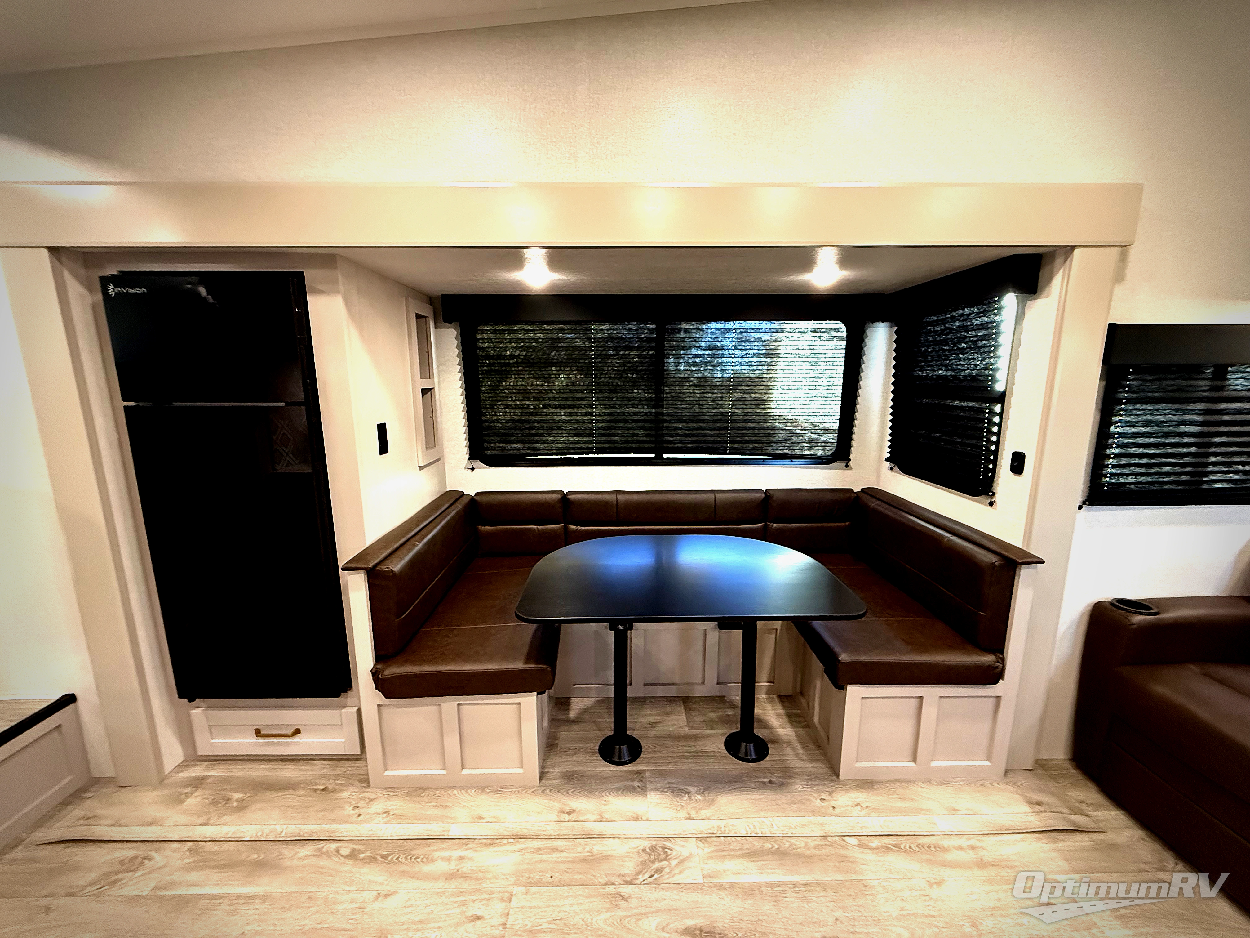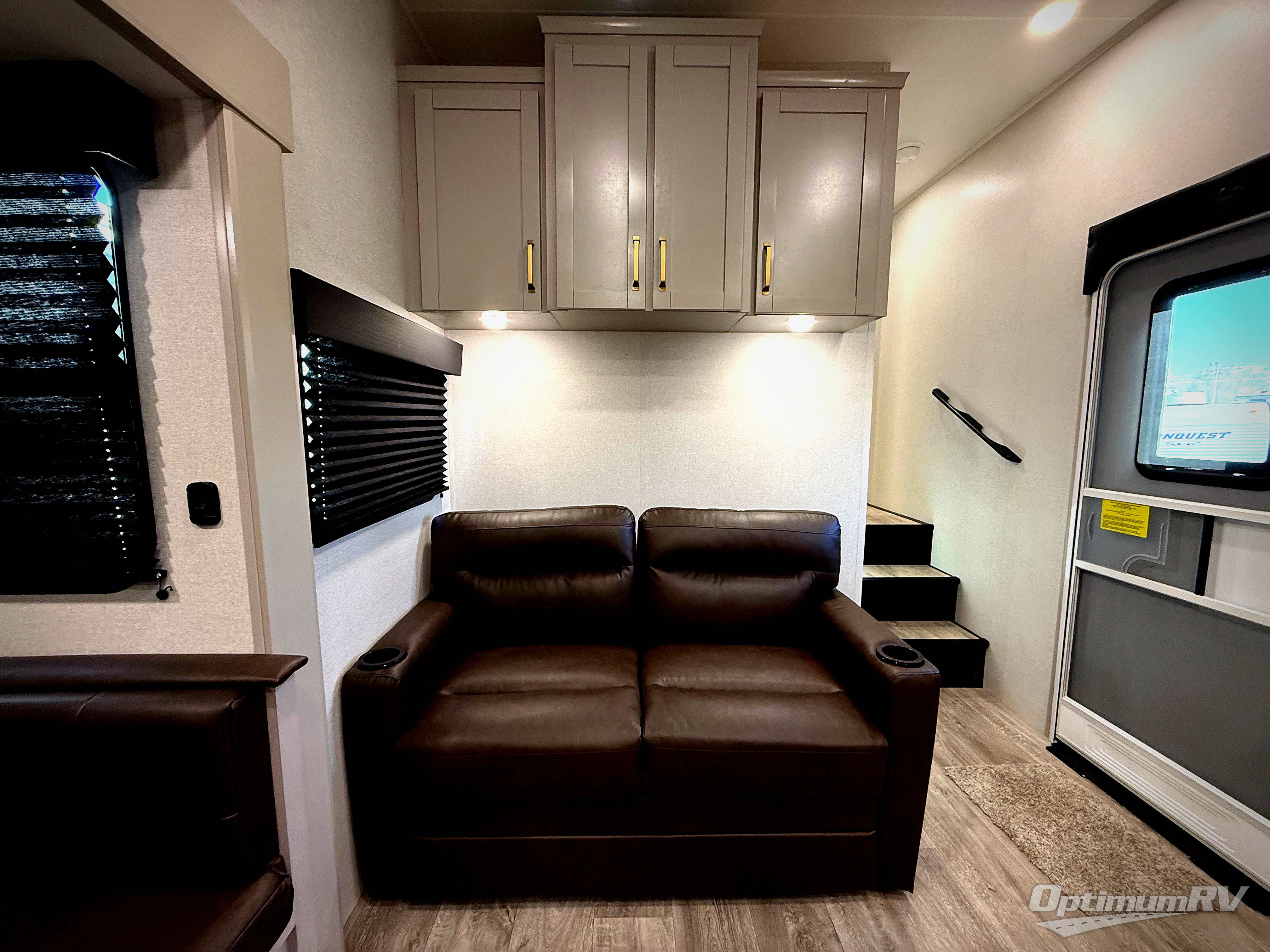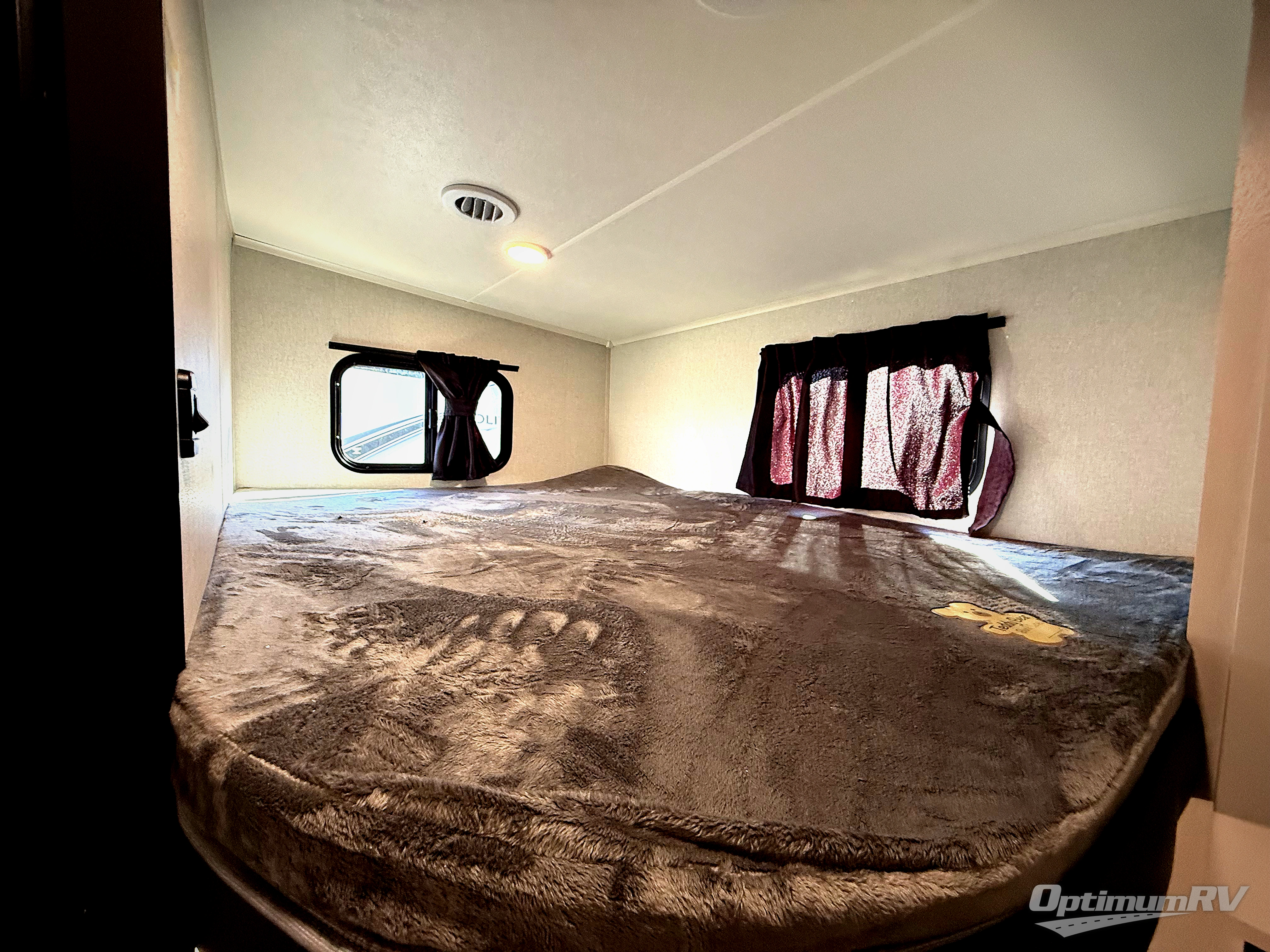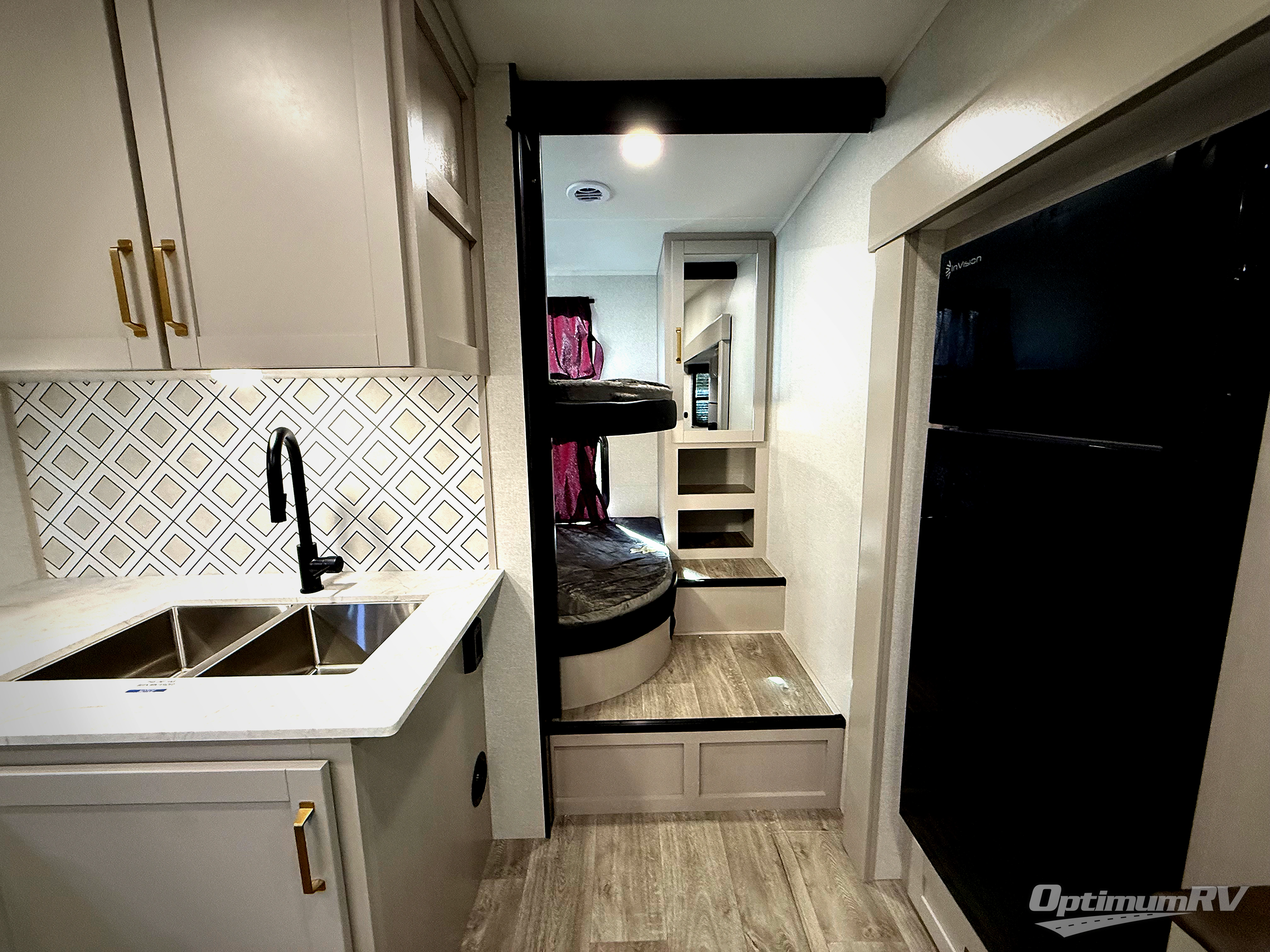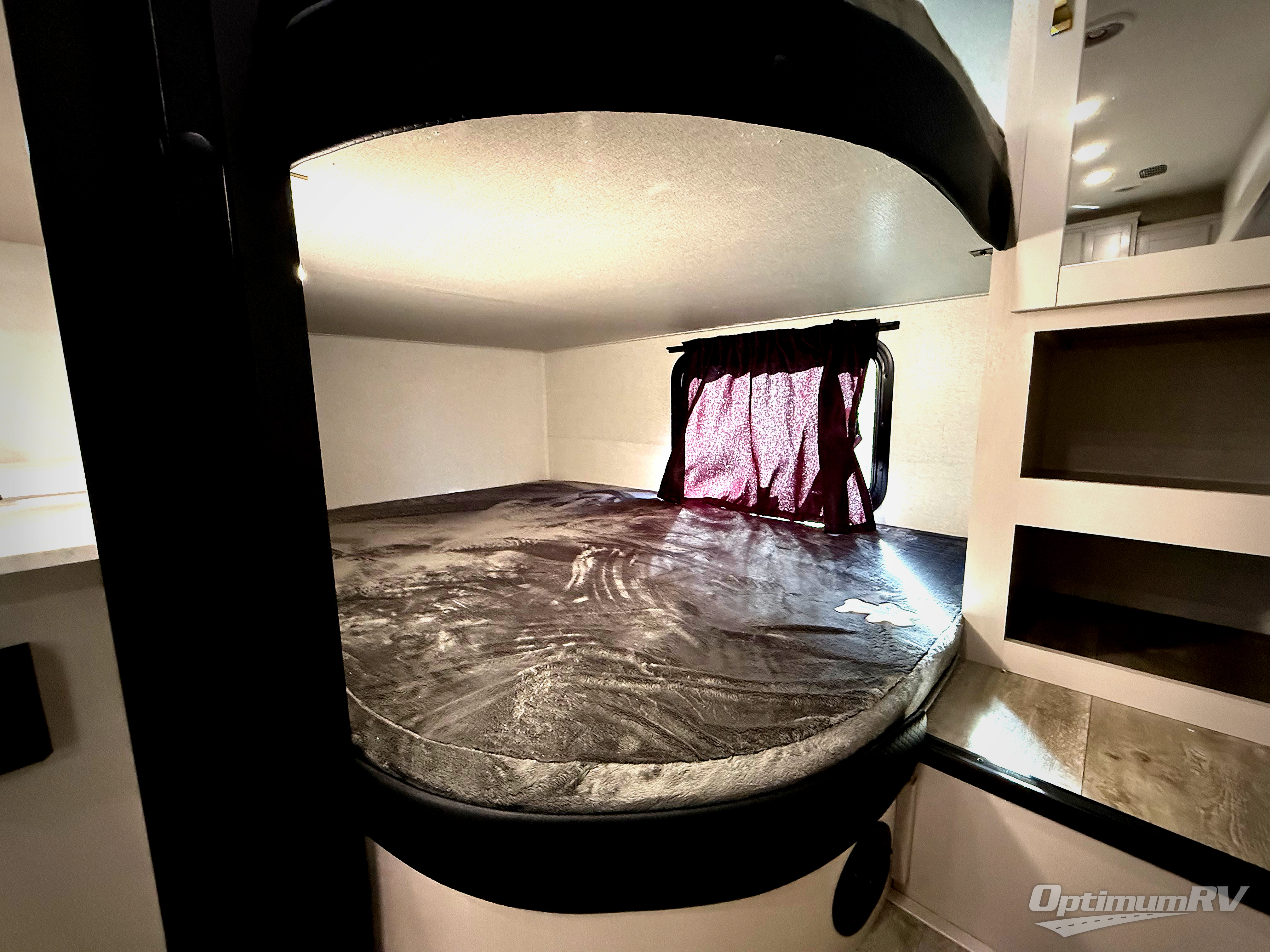 This fifth wheel's spacious interior boasts double-sized bunk beds designed for kids or guests, providing a comfortable sleeping space. A U-shaped dinette that offers ample seating and dining space for meals or even more sleeping space, as well as the 60” tri-fold sofa, which provides additional seating and can be converted into a comfortable sleeping area. In the kitchen area, you will find many amenities to cook delicious meals, such as a microwave, refrigerator, and overhead cabinets that will allow you to keep everything organized. The front bed is spacious, featuring a queen bed ideal for sleeping tight, and the full bath will complete the at-home experience since you will be able to take a refreshing shower on hot days!