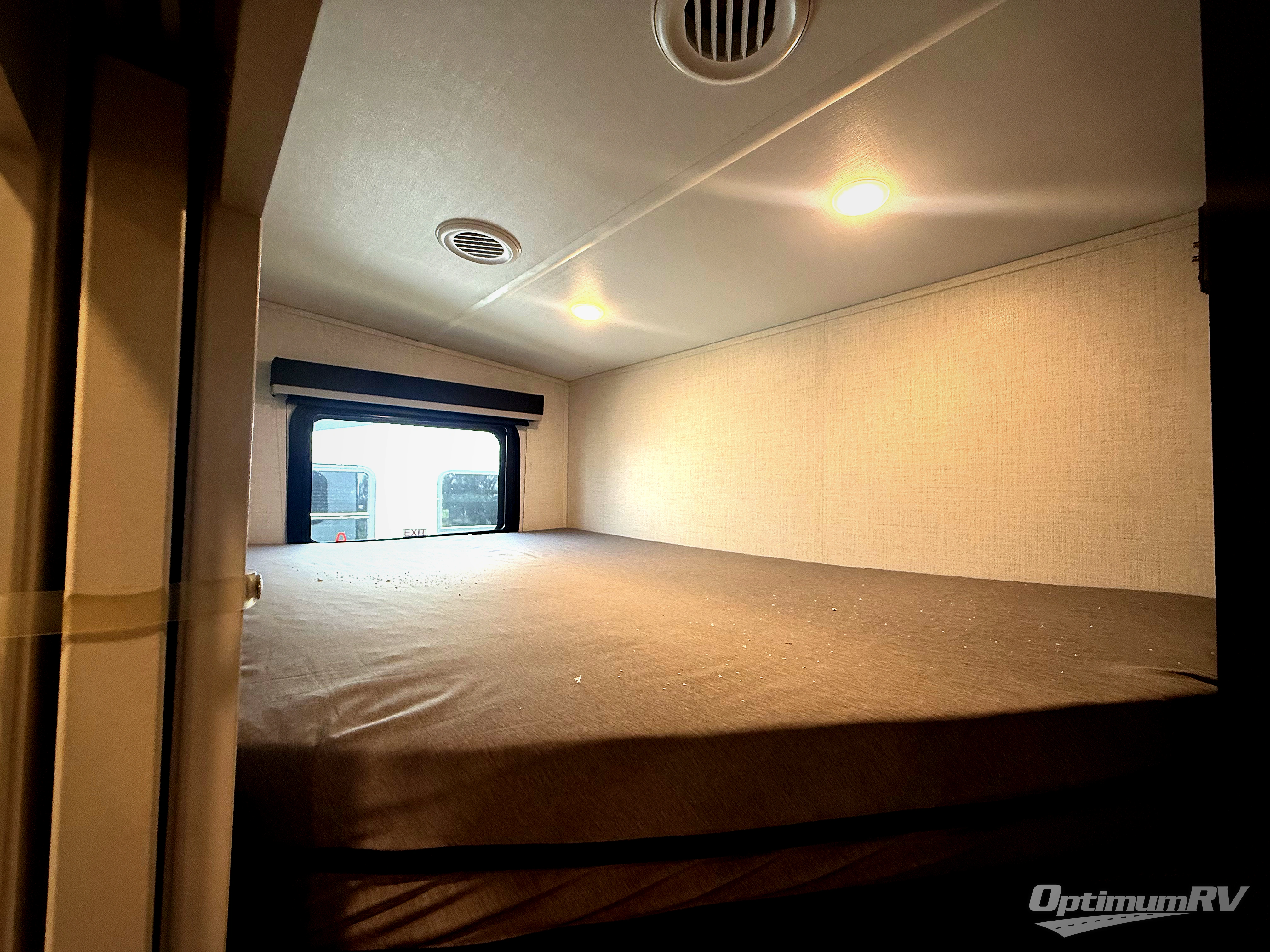 This fifth wheel with an open concept kitchen and living area is sure to feel just like home! You can relax with friends and family around the U-shaped dinette or on the tri-fold sleeper sofa, and there is a TV/radio in this space for entertainment. The rear private bunkhouse includes double-size triple bunks and a wardrobe for your guests' things, and you'll have your own wardrobes up front in the private bedroom. There is also a queen bed here and dual nightstands to keep your phone and glasses close by. And don't overlook the exterior with its 20' electric awning and LCI Solid Steps!