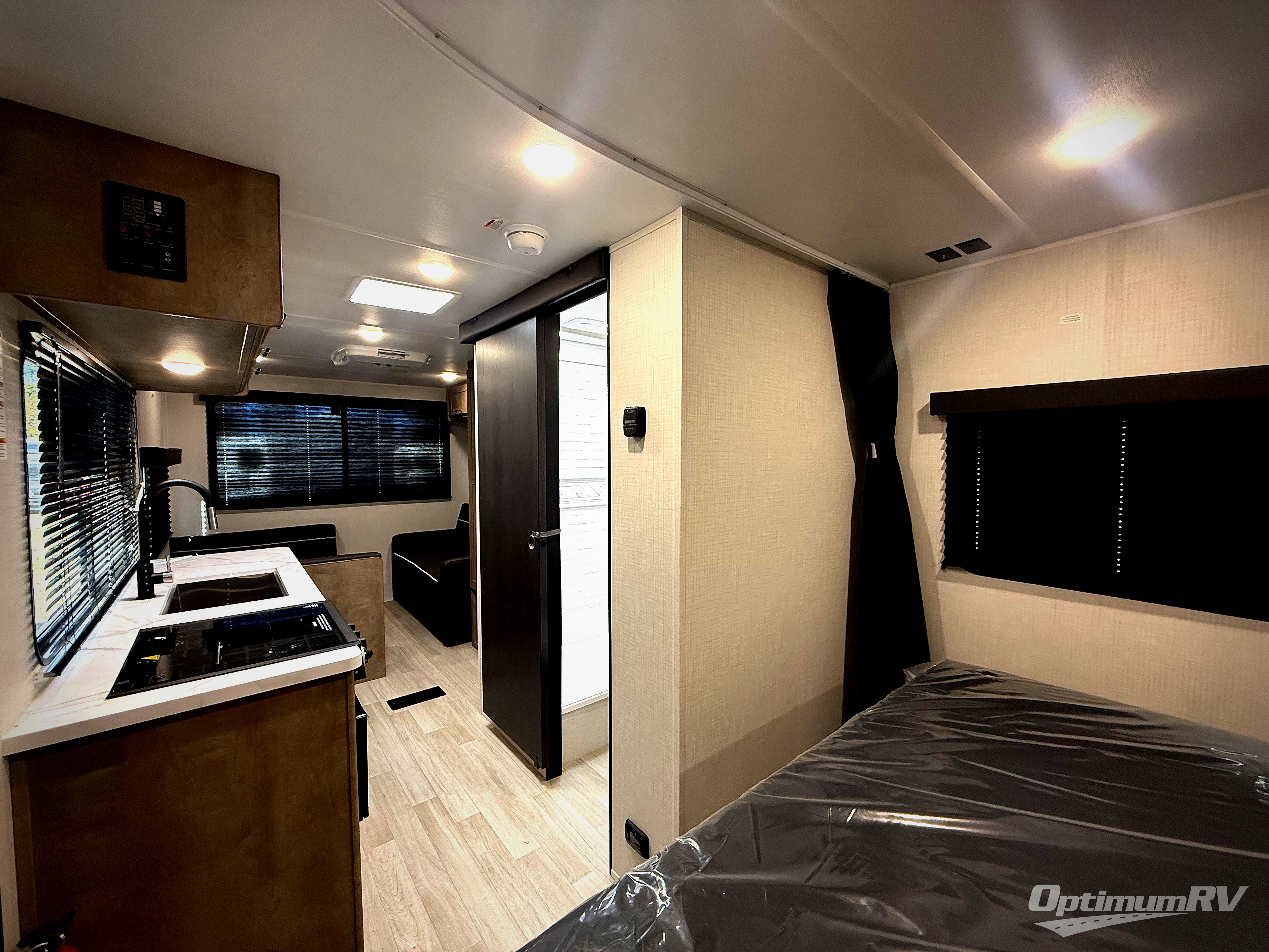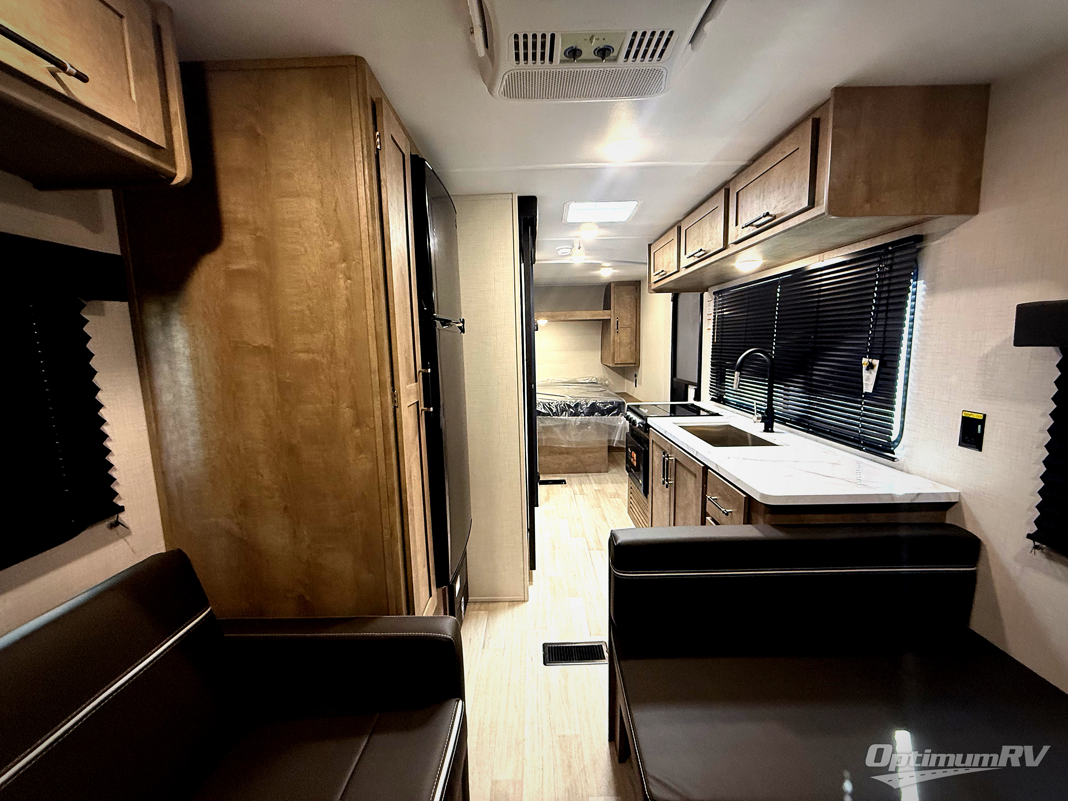 This trailer is perfect for your crew of four to six. There is a queen bed in the front bedroom, along with dual closets and nightstands to keep your things tidy. You can dine each day on the booth dinette, relax on the sofa, and house additional guests here at night. The kitchen includes everything you need to prepare meals each day, including a gas range, microwave, and a 10-cu. ft. 12V refrigerator for cold items. And the full bath on board lets you stay clean throughout each camping trip!