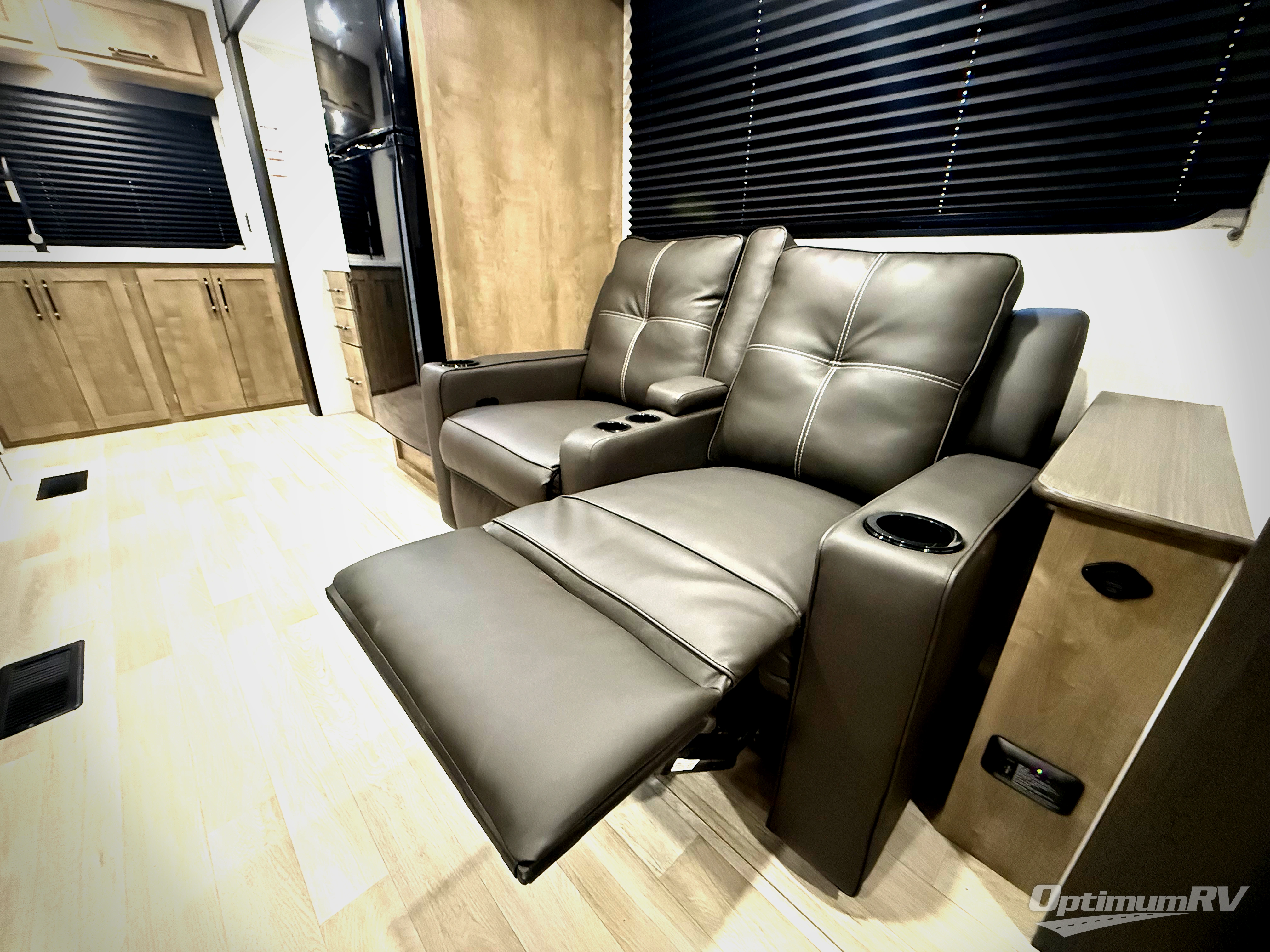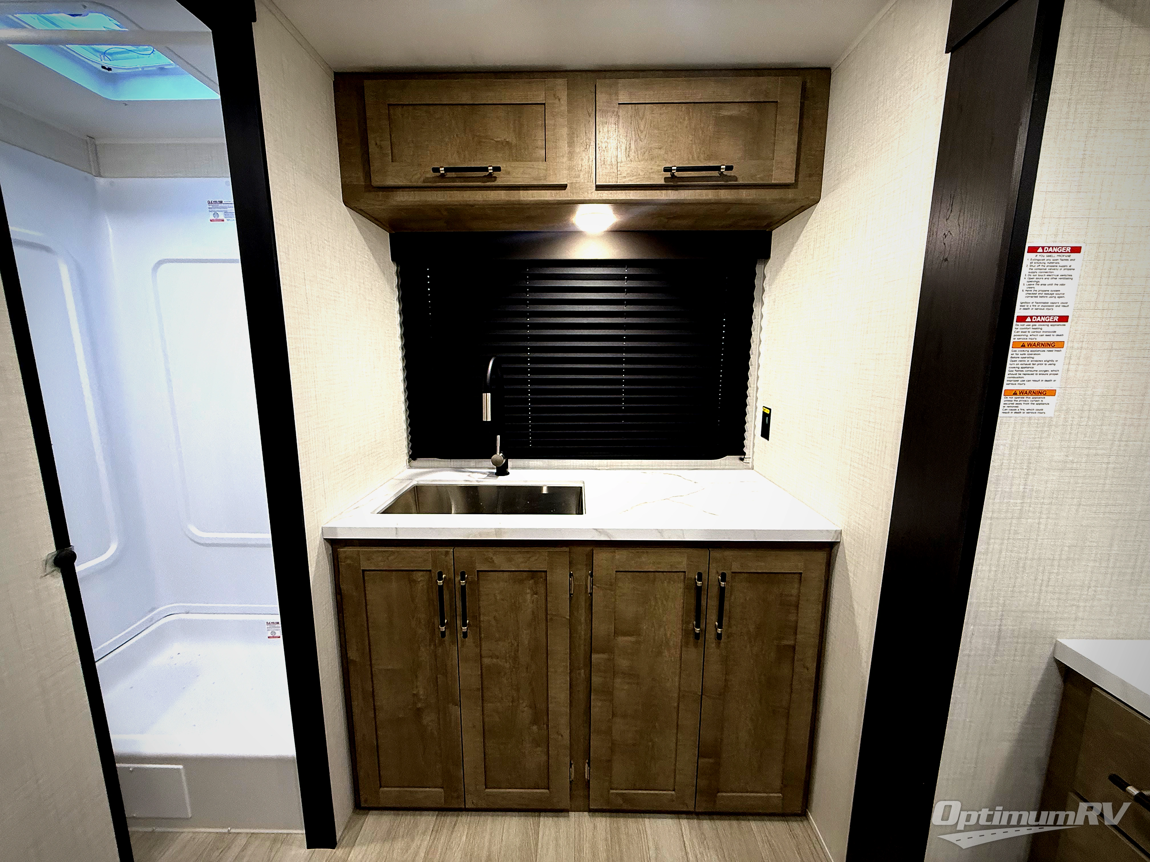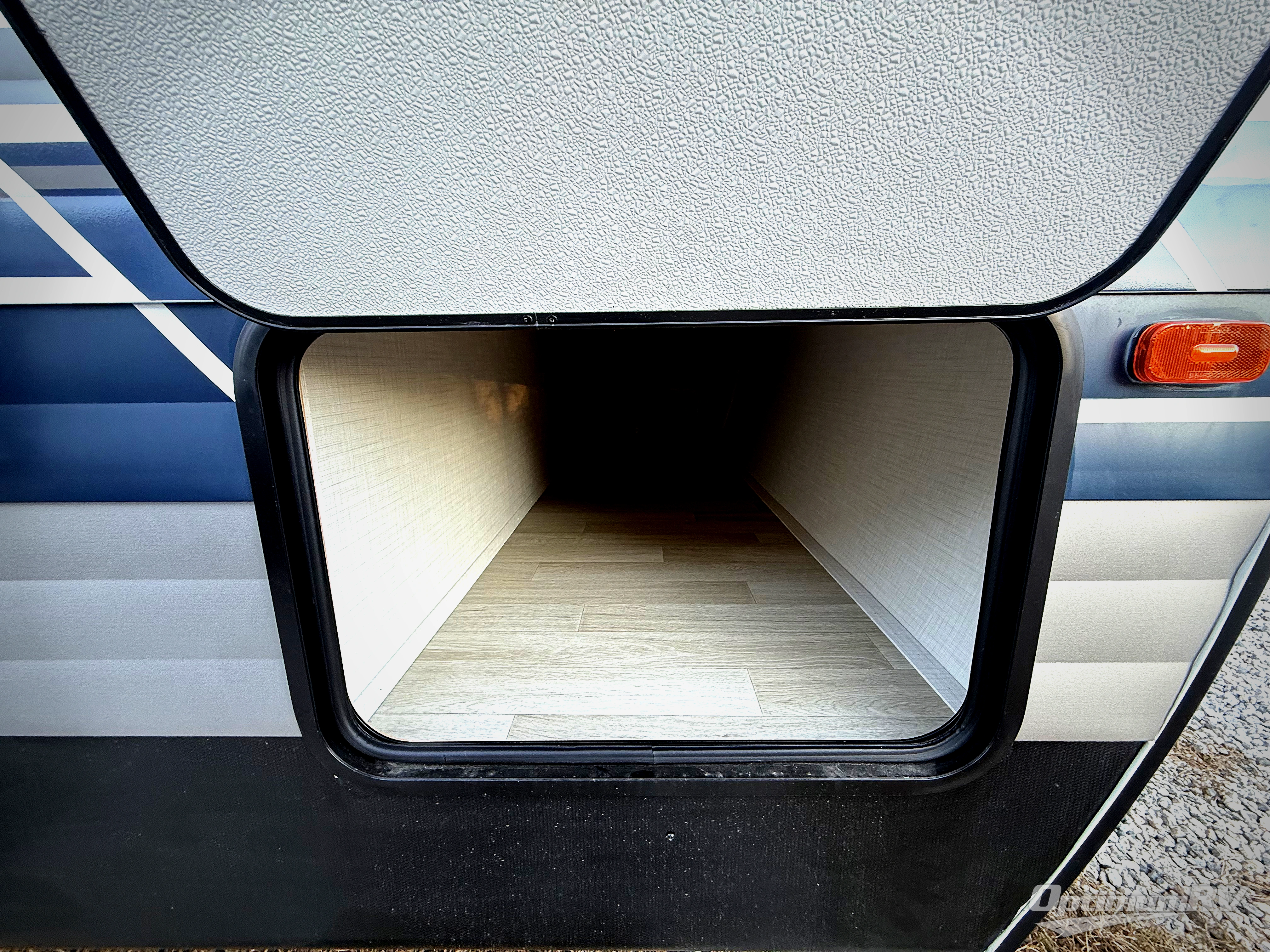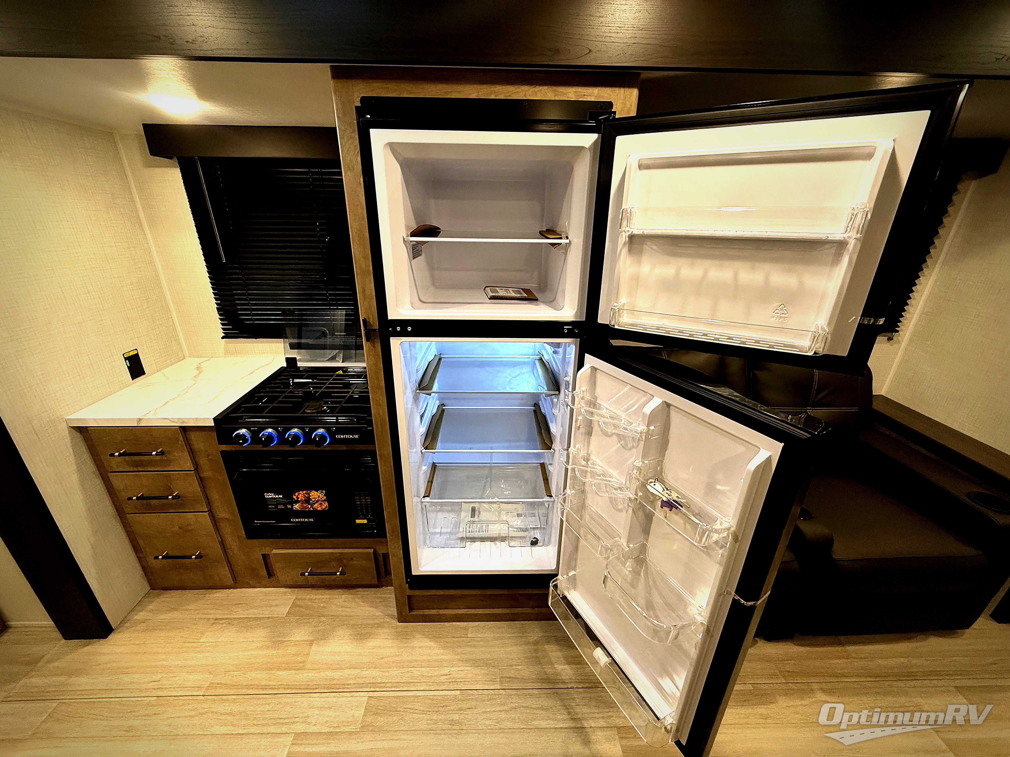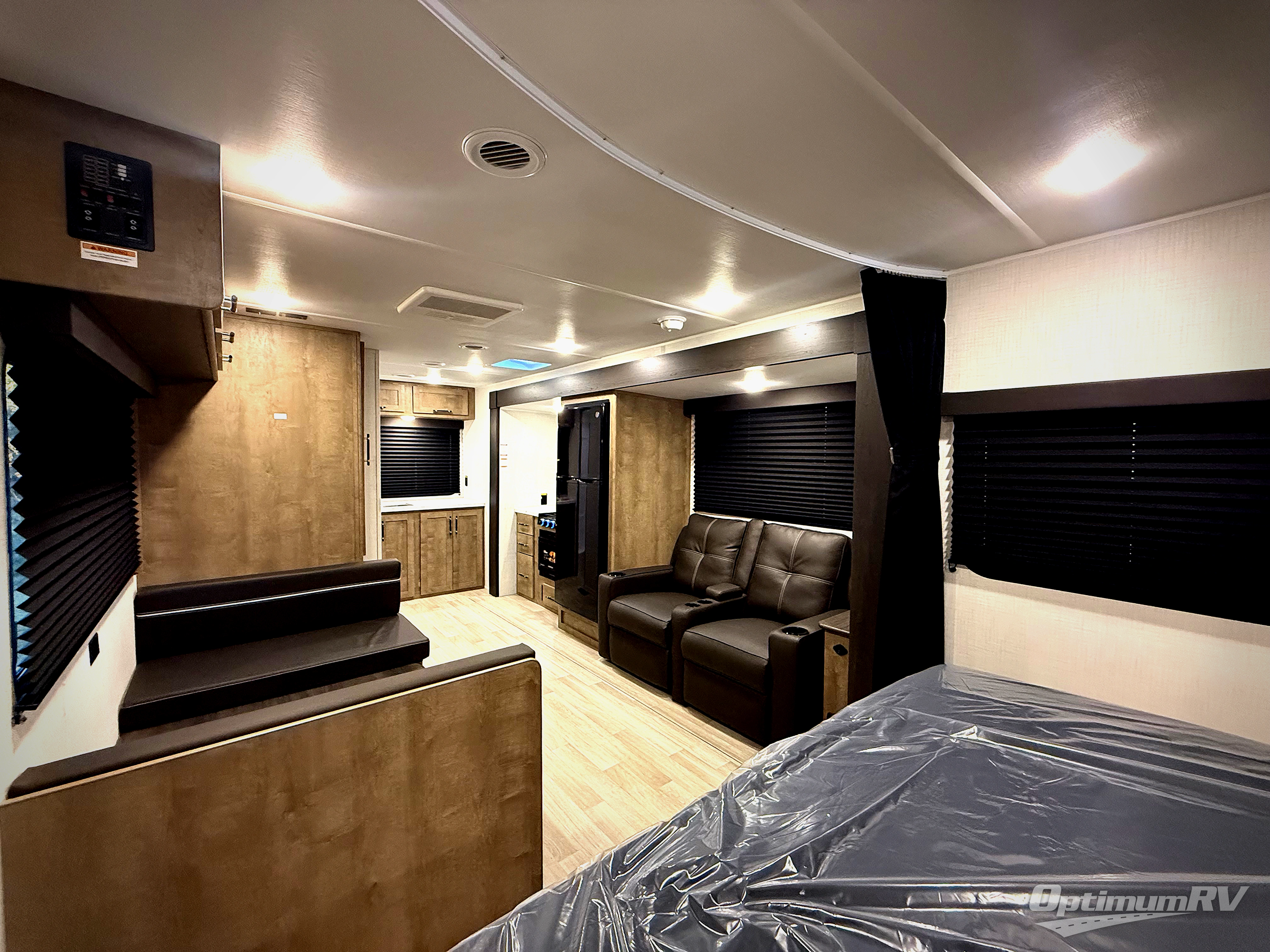 You'll love the added space in this travel trailer thanks to the large slide out. Here, you'll find the sofa with an end table, plus the 12V refrigerator and three burner gas range. There is kitchen counter space in the rear corner, and you'll find the full bath in the other rear corner for easy use. The front queen bed includes a privacy curtain for when you have guests staying over on the sofa and booth dinette, plus there are dual bedside closets and nightstands for your things!