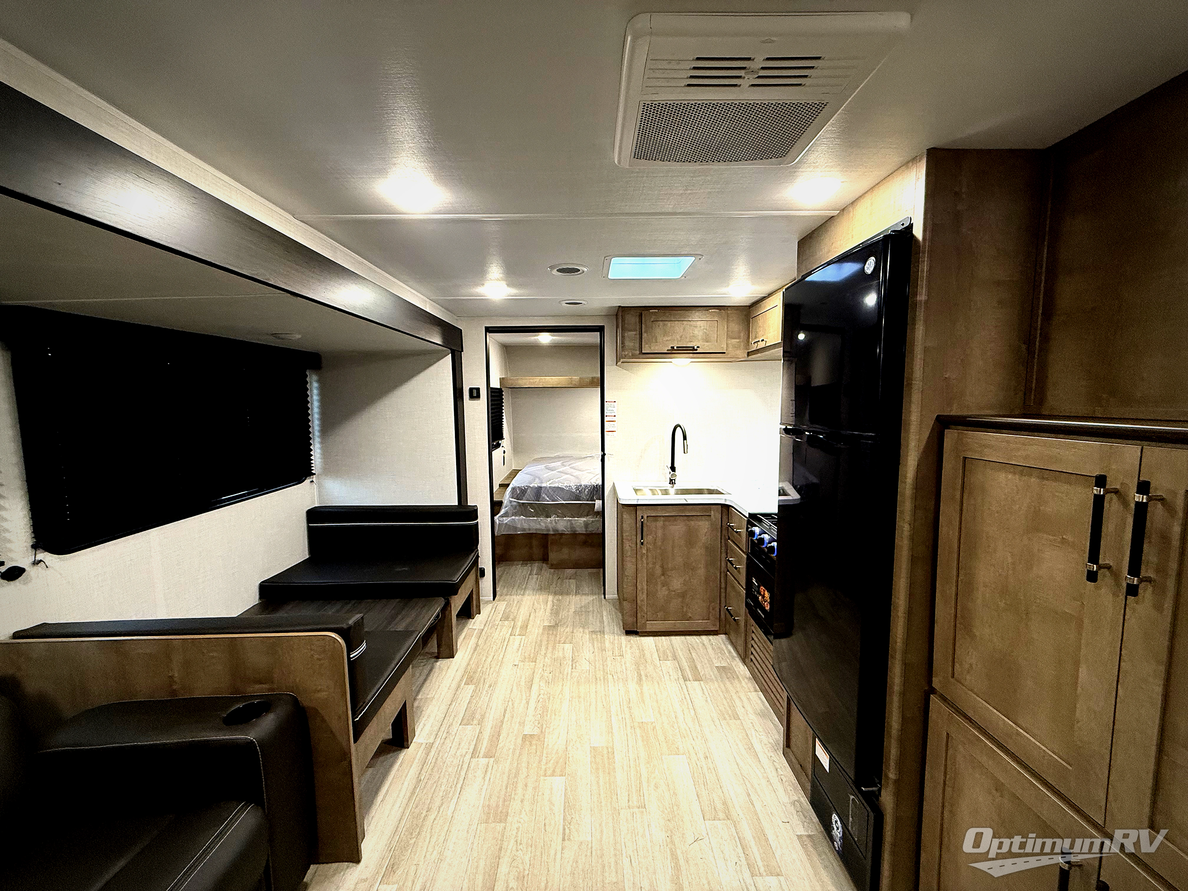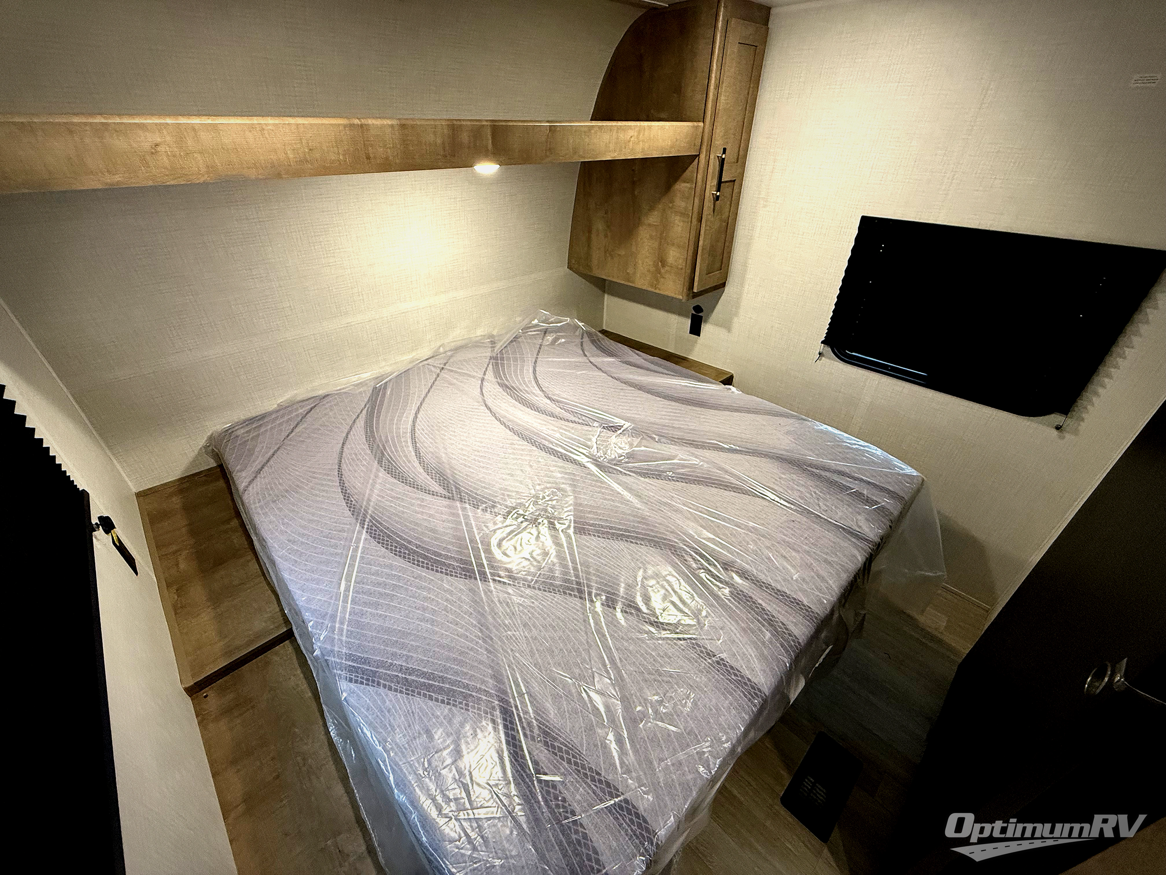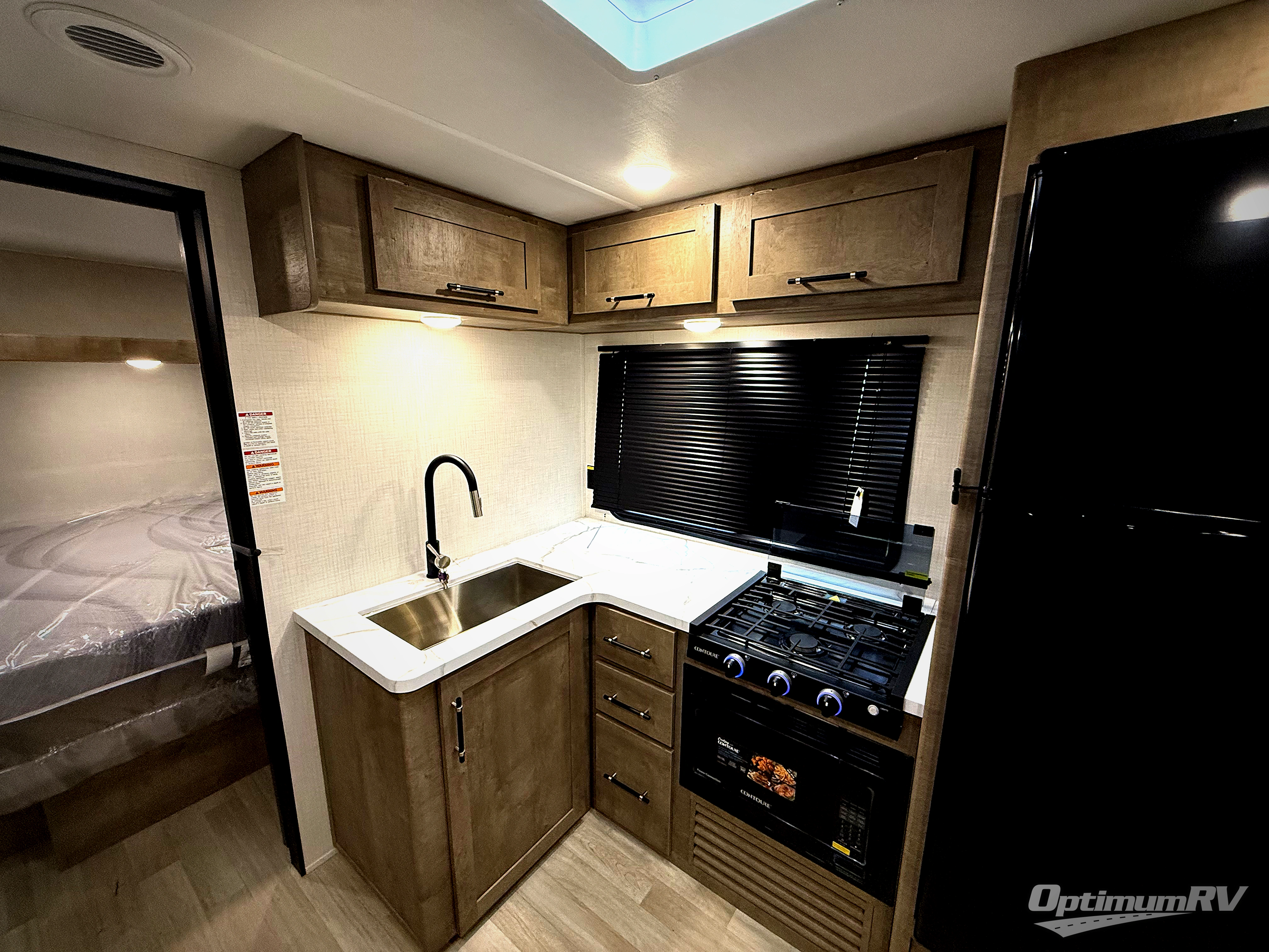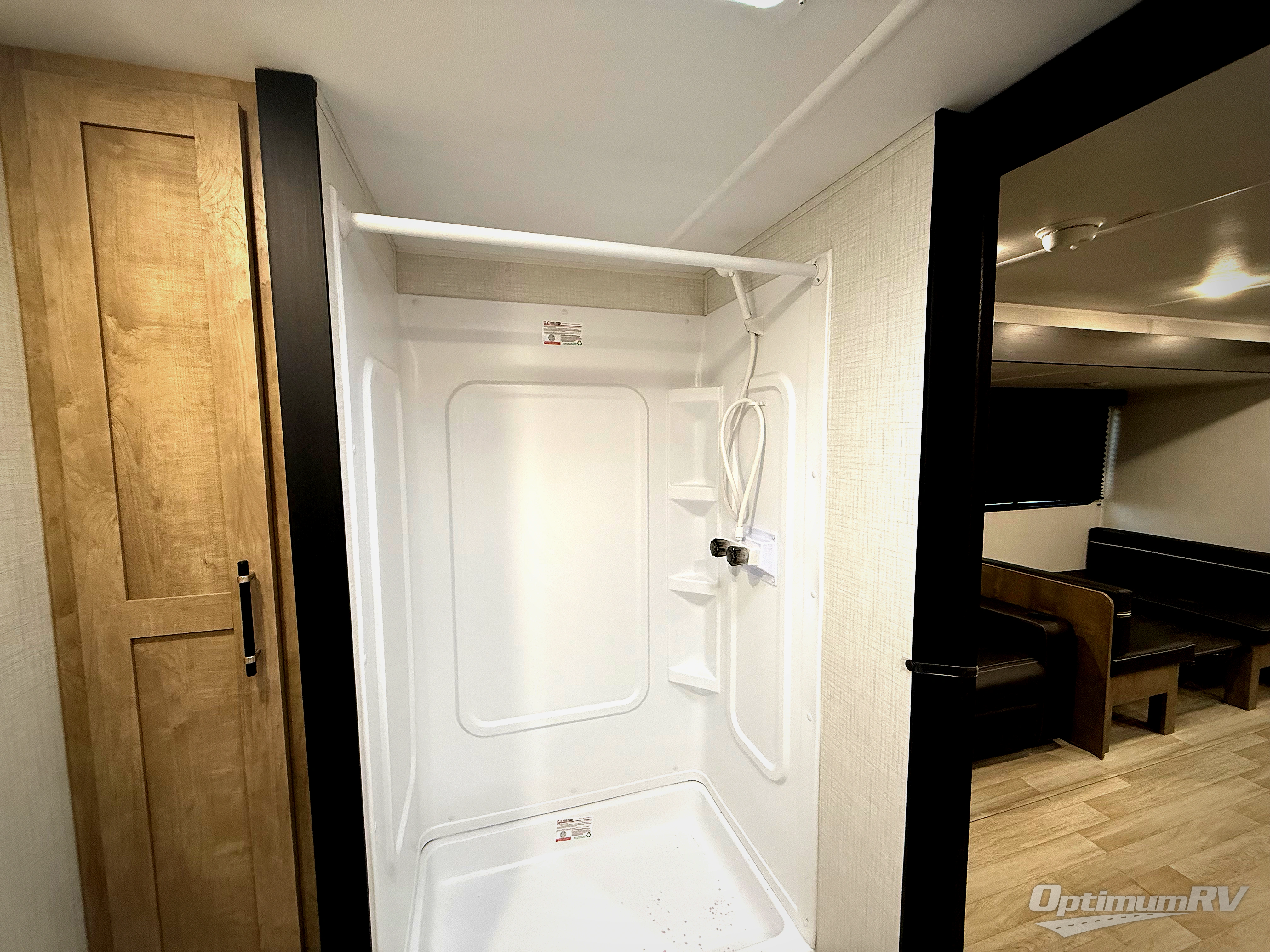 You'll feel right at home wherever you decide to camp in this travel trailer. The large slide out in the combined kitchen and living area gives your crew plenty of space to move about, plus there is a booth dinette and sofa for comfy seating and sleeping spaces. A full kitchen, compete with three burner cooktop and 10 cu. ft. 12V refrigerator will let you cook and store food for the whole week. Head to the full rear bath that includes a spacious vanity, a shower, toilet, and linen closet for clean towels. And when you're ready to catch some zzz's, the queen bed in the front private bedroom is sure to bring comfort!